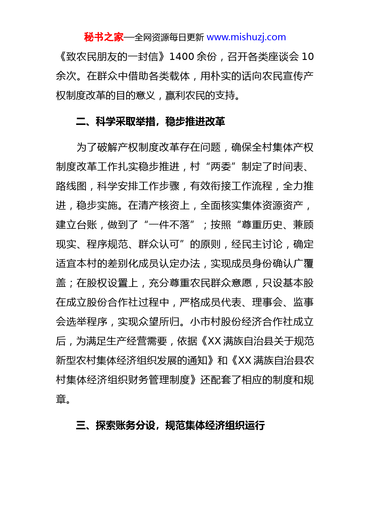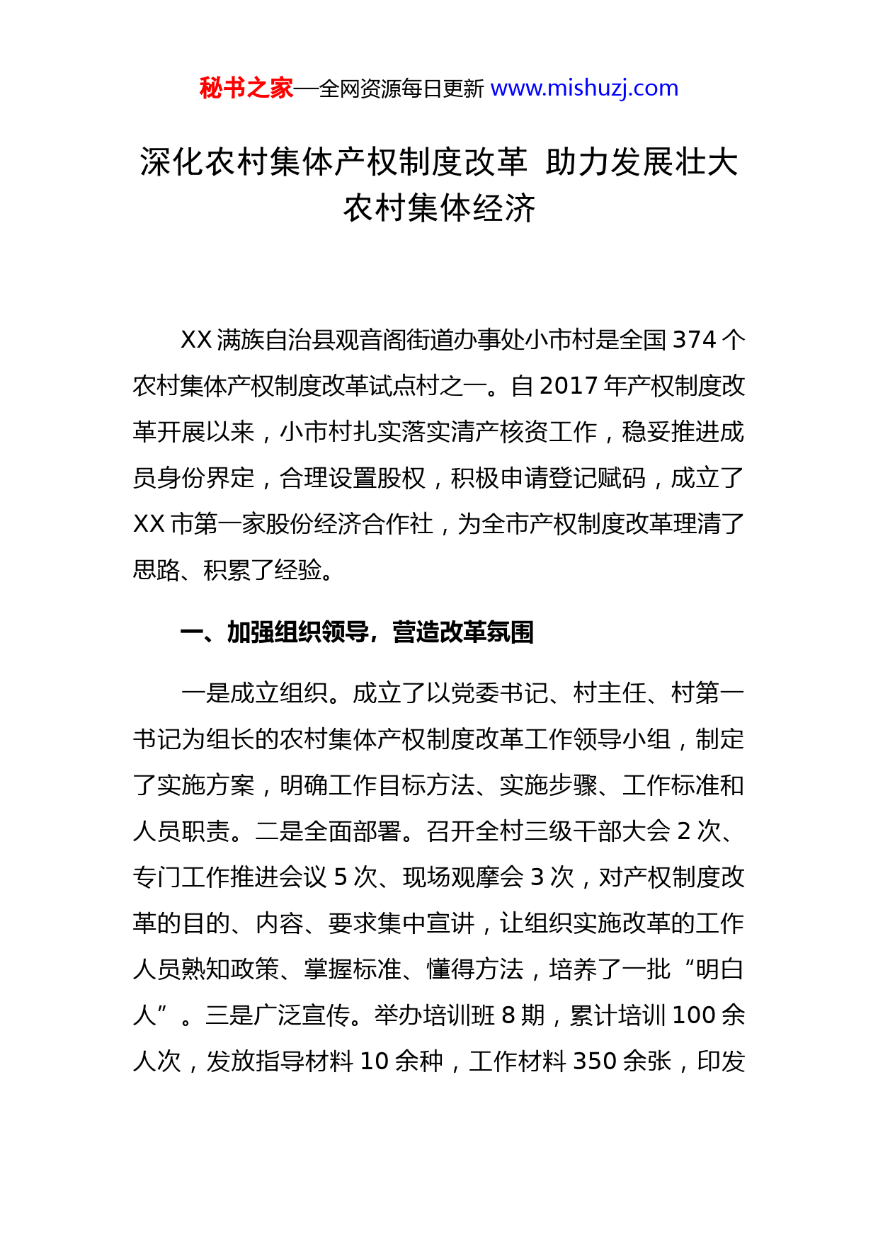 秘书之家—全网资源每日更新www.mishuzj.com深化农村集体产权制度改革助力发展壮大农村集体经济XX满族自治县观音阁街道办事处小市村是全国374个农村集体产权制度改革试点村之一。自2017年产权制度改革开展以来,小市村扎实落实清产核资工作,稳妥推进成员身份界定,合理设置股权,积极申请登记赋码,成立了XX市第一家股份经济合作社,为全市产权制度改革理清了思路、积累了经验。一、加强组织领导,营造改革氛围一是成立组织。成立了以党委书记、村主任、村第一书记为组长的农村集体产权制度改革工作领导小组,制定了实施方案,明确工作目标方法、实施步骤、工作标准和人员职责。二是全面部署。召开全村三级干部大会2次、专门工作推进会议5次、现场观摩会3次,对产权制度改革的目的、内容、要求集中宣讲,让组织实施改革的工作人员熟知政策、掌握标准、懂得方法,培养了一批“明白人”。三是广泛宣传。举办培训班8期,累计培训100余人次,发放指导材料10余种,工作材料350余张,印发秘书之家—全网资源每日更新www.mishuzj.com《致农民朋友的一封信》1400余份,召开各类座谈会10余次。在群众中借助各类载体,用朴实的话向农民宣传产权制度改革的目的意义,赢利农民的支持。二、科学采取举措,稳步推进改革为了破解产权制度改革存在问题,确保全村集体产权制度改革工作扎实稳步推进,村“两委”制定了时间表、路线图,科学安排工作步骤,有效衔接工作流程,全力推进,稳步实施。在清产核资上,全面核实集体资源资产,建立台账,做到了“一件不落”;按照“尊重历史、兼顾现实、程序规范、群众认可”的原则,经民主讨论,确定适宜本村的差别化成员认定办法,实现成员身份确认广覆盖;在股权设置上,充分尊重农民群众意愿,只设基本股在成立股份合作社过程中,严格成员代表、理事会、监事会选举程序,实现众望所归。小市村股份经济合作社成立后,为满足生产经营需要,依据《XX满族自治县关于规范新型农村集体经济组织发展的通知》和《XX满族自治县农村集体经济组织财务管理制度》还配套了相应的制度和规章。三、探索账务分设,规范集体经济组织运行秘书之家—全网资源每日更新www.mishuzj.com新成立的村集体经济组织在农村信用社开立了基本账户,与村委会账目分开,独立建账核算。除财政转移支付及各级政府部门用于村级公益事业拨款、村党组织运行经费等与日常公共事务管理职能相关活动的财务核算外,其他经营活动都纳入股份经济合作社账内核算,对集体经营活动中发生的收入、支出、资产、负债、所有者权益进行独立核算。实行严格的财务公开制度,发挥监事会的监督管理作用,保障村集体经济成员进行民主管理、民主决策民主监督。四、拓展增收渠道,分享改革红利通过产权制度改革,村经营性资产总额为4.769.019.41元,每股资产为1225.02元。2019年9月,3893名成员以集体经营性资产量化股金入股,折合每人1225.02元,相当于每人获得1225.02元的原始股。整合近3000平方米门市房资源并入餐饮商业圈,发展壮大规模化餐饮业“小市羊汤一条街”项目。目前,该项目年增加村集体收益60万元,带动村民就业235人。同时,股份经济合作社不断整合各类资金,吸引外来投资,发展林下种植项目,村民从事林下参种植、到羊汤馆打工,每人每天至少赚100元,有经营能力的村民通过承包经营林下参种植和羊汤馆赚得更多。2019年,在集体产权制度改秘书之家—全网资源每日更新www.mishuzj.com革的推动下,全村人均收入达到1.8万元,26户贫困户、49名贫困人口全部脱贫。在保持经营性资产收益的同时,联合社大力为村民开展公益性服务,修路、修水、维护照明设施、清理卫生环境等,村集体经济组织今年为每人补助交纳合作医疗200元,共计78万元。