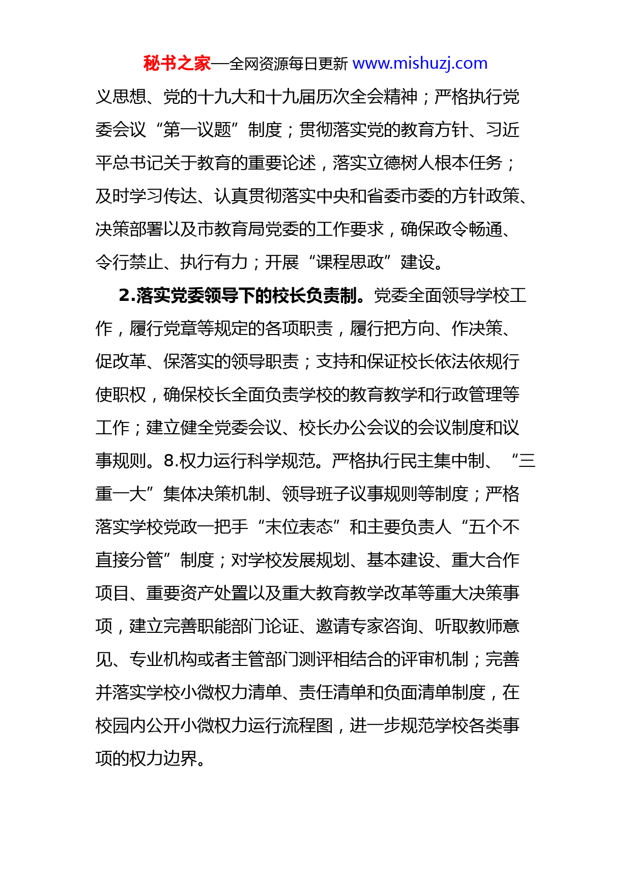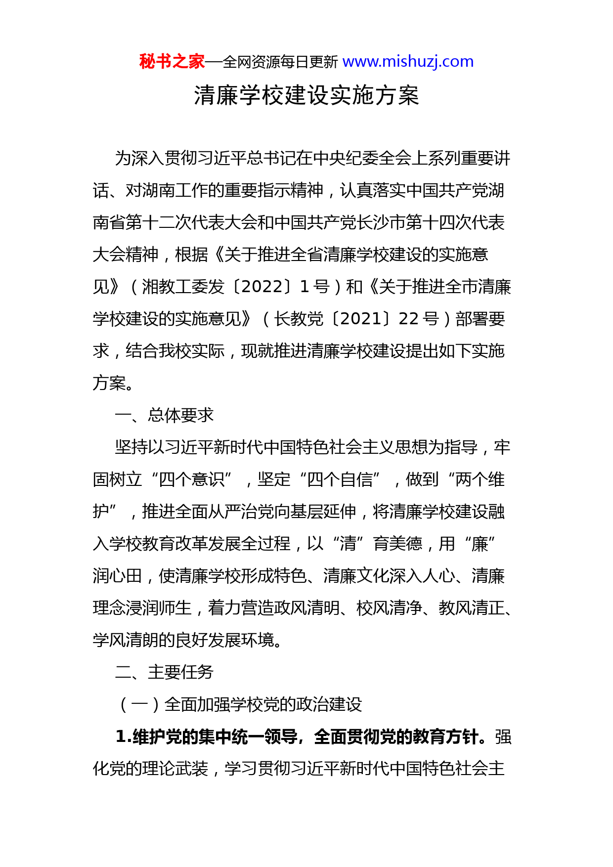 秘书之家—全网资源每日更新www.mishuzj.com清廉学校建设实施方案为深入贯彻习近平总书记在中央纪委全会上系列重要讲话、对湖南工作的重要指示精神,认真落实中国共产党湖南省第十二次代表大会和中国共产党长沙市第十四次代表大会精神,根据《关于推进全省清廉学校建设的实施意见》(湘教工委发〔2022〕1号)和《关于推进全市清廉学校建设的实施意见》(长教党〔2021〕22号)部署要求,结合我校实际,现就推进清廉学校建设提出如下实施方案。一、总体要求坚持以习近平新时代中国特色社会主义思想为指导,牢固树立“四个意识”,坚定“四个自信”,做到“两个维护”,推进全面从严治党向基层延伸,将清廉学校建设融入学校教育改革发展全过程,以“清”育美德,用“廉”润心田,使清廉学校形成特色、清廉文化深入人心、清廉理念浸润师生,着力营造政风清明、校风清净、教风清正、学风清朗的良好发展环境。二、主要任务(一)全面加强学校党的政治建设1.维护党的集中统一领导,全面贯彻党的教育方针。强化党的理论武装,学习贯彻习近平新时代中国特色社会主秘书之家—全网资源每日更新www.mishuzj.com义思想、党的十九大和十九届历次全会精神;严格执行党委会议“第一议题”制度;贯彻落实党的教育方针、习近平总书记关于教育的重要论述,落实立德树人根本任务;及时学习传达、认真贯彻落实中央和省委市委的方针政策、决策部署以及市教育局党委的工作要求,确保政令畅通、令行禁止、执行有力;开展“课程思政”建设。2.落实党委领导下的校长负责制。党委全面领导学校工作,履行党章等规定的各项职责,履行把方向、作决策、促改革、保落实的领导职责;支持和保证校长依法依规行使职权,确保校长全面负责学校的教育教学和行政管理等工作;建立健全党委会议、校长办公会议的会议制度和议事规则。8.权力运行科学规范。严格执行民主集中制、“三重一大”集体决策机制、领导班子议事规则等制度;严格落实学校党政一把手“末位表态”和主要负责人“五个不直接分管”制度;对学校发展规划、基本建设、重大合作项目、重要资产处置以及重大教育教学改革等重大决策事项,建立完善职能部门论证、邀请专家咨询、听取教师意见、专业机构或者主管部门测评相结合的评审机制;完善并落实学校小微权力清单、责任清单和负面清单制度,在校园内公开小微权力运行流程图,进一步规范学校各类事项的权力边界。秘书之家—全网资源每日更新www.mishuzj.com3.加强基层党组织建设。切实强化学校基层党组织建设,推进党支部“五化”建设提质增效;严格规范党内组织生活,促进党员增强党风党纪意识,争当清廉模范。(二)全面加强学校作风建设和纪律建设4.加强干部队伍建设。坚持党管干部原则和好干部标准,树立正确的选人用人导向;完善选人用人机制;落实《党政领导干部选拔任用工作条例》,严格执行干部选任工作规定和程序;强化任前把关,切实防止带病提拔、突击提拔、违规提拔等问题;严格执行领导干部请示报告、兼职管理、档案审核、因私出国(境)、个人事项报告、经商办企业等干部监督管理工作要求。5.强化廉洁教育宣传。组织教职员工重点学习《党章》《中国共产党廉洁自律准则》《中国共产党纪律处分条例》等条例法规;开展廉政主题教育活动;面向教职员工特别是党员干部的亲属开展廉洁家风建设,加强家庭助廉警示教育,强化廉洁家风监督。6.持续正风肃纪反腐。严格贯彻执行中央八项规定,严格执行省委“约法三章”和市委“15条禁令”;坚决破除形式主义、官僚主义,坚决纠正隐形变异、改头换面的“四风”新问题新表现;严肃查处违规收送礼品礼金,公款吃喝,公款旅游,滥发津补贴,违规购置和发放有价证券购物卡电子礼券,办公用房超标,违规配备使用公务用秘书之家—全网资源每日更新www.mishuzj.com车,接待、会务、培训费超标等易发多发问题;正确运用监督执纪“四种形态”,营造反腐倡廉、遵规守纪的浓厚氛围;严格按照《中国共产党纪律检查机关监督执纪工作规则》要求,规范问题线索处理并及时上报。(三)全面加强学校制度建设7.内部管理制度健全。加强学校内控制度建设,科学制定职称评聘、评优评先、干部选拔、岗位聘用、招生考试、教辅资料、经费使用、物品采购、基建后勤、食堂等重点领域和关键环节的规章制度和程序办法,确保公开公平、公正规范。9.廉政风险防控到位。围绕学籍管理、后勤基建、物资采购、资产处置、资金使用、项目评审、学生资助、人才引进、职称评定、招生入学、教辅征订等重点,加强廉洁风险排查;落实“风险定到岗,制度建到位,责任落到人”的要求,对查找出来的风险点进行逐一分析,制定防控措施和关键环节流程图;完善并严格执行审计制度及审计发现问题整改挂账销号制度;以廉政谈话为主要手段,加强对重点人群和关键少数的廉洁教育。10.监督力量多方参与。健全教职工代表大会制度,落实教职工代表大会对教职工利益直接相关事项的讨论通过权,对学校章程、学校发展规划及其他重大改革和重大问题解决方案的意见建议权,对学校领导干部的评议权以及秘书之家—全网资源每日更新www.mishuzj.com对学校章程、规章制度和决策落实情况的监督权;完善校务公开制度,