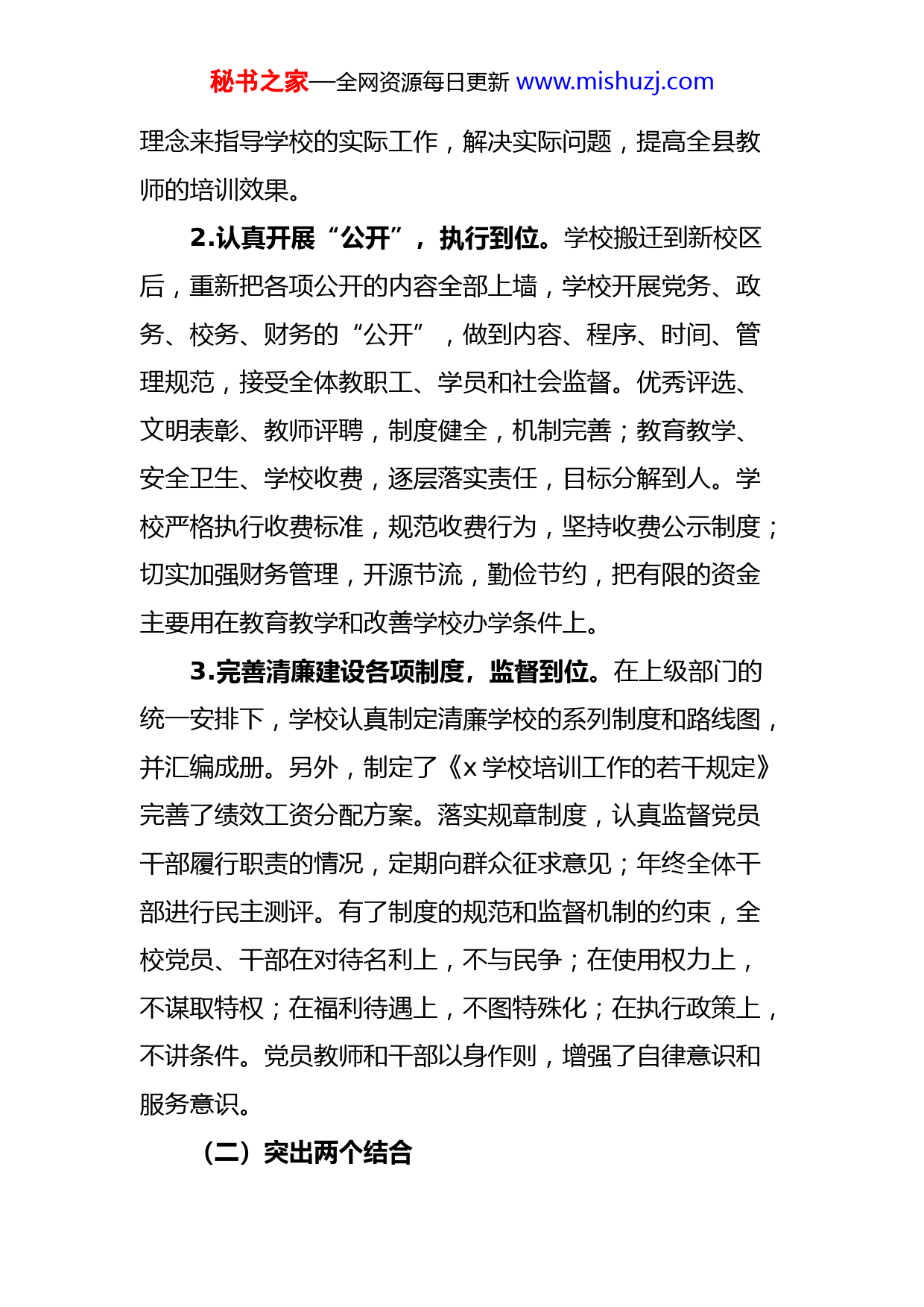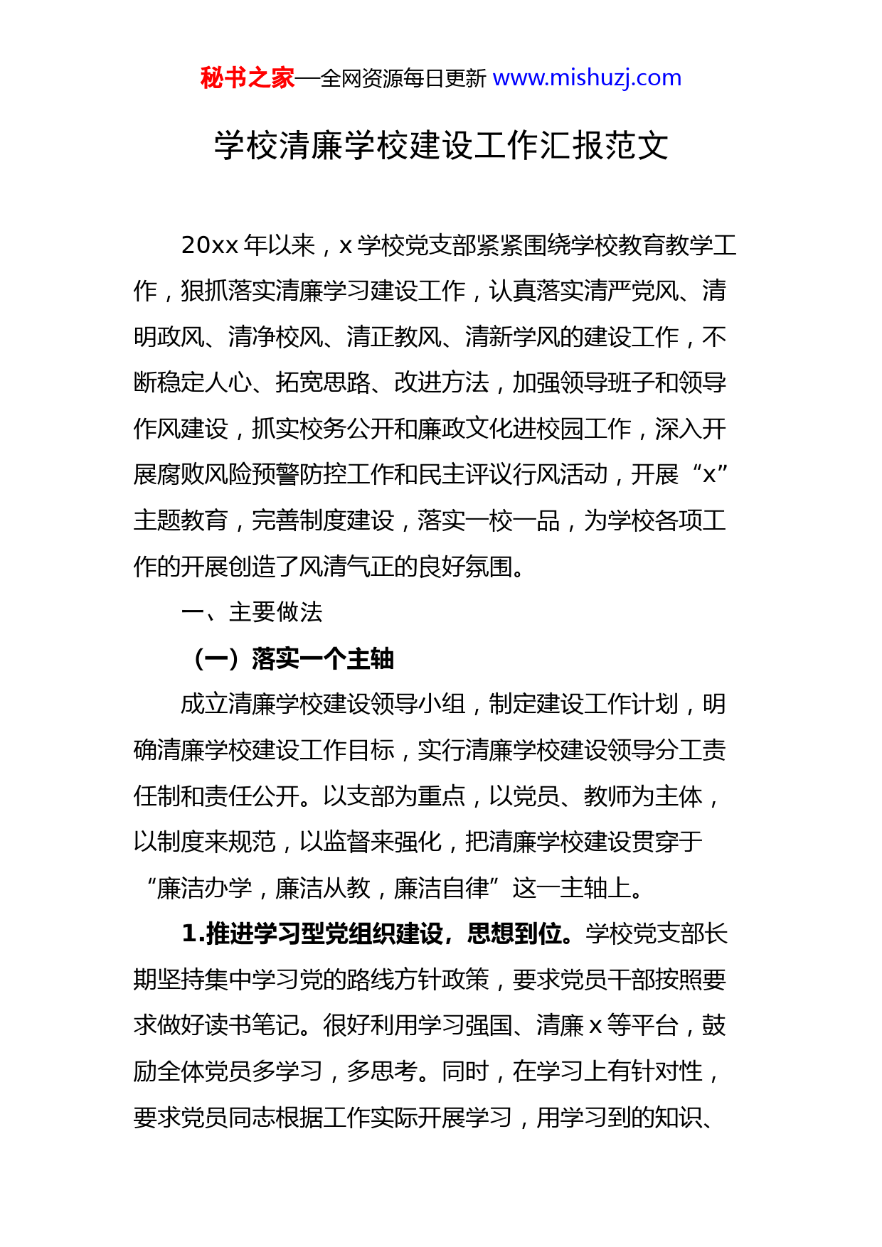 秘书之家—全网资源每日更新www.mishuzj.com学校清廉学校建设工作汇报范文20xx年以来,x学校党支部紧紧围绕学校教育教学工作,狠抓落实清廉学习建设工作,认真落实清严党风、清明政风、清净校风、清正教风、清新学风的建设工作,不断稳定人心、拓宽思路、改进方法,加强领导班子和领导作风建设,抓实校务公开和廉政文化进校园工作,深入开展腐败风险预警防控工作和民主评议行风活动,开展“x”主题教育,完善制度建设,落实一校一品,为学校各项工作的开展创造了风清气正的良好氛围。一、主要做法(一)落实一个主轴成立清廉学校建设领导小组,制定建设工作计划,明确清廉学校建设工作目标,实行清廉学校建设领导分工责任制和责任公开。以支部为重点,以党员、教师为主体,以制度来规范,以监督来强化,把清廉学校建设贯穿于“廉洁办学,廉洁从教,廉洁自律”这一主轴上。1.推进学习型党组织建设,思想到位。学校党支部长期坚持集中学习党的路线方针政策,要求党员干部按照要求做好读书笔记。很好利用学习强国、清廉x等平台,鼓励全体党员多学习,多思考。同时,在学习上有针对性,要求党员同志根据工作实际开展学习,用学习到的知识、秘书之家—全网资源每日更新www.mishuzj.com理念来指导学校的实际工作,解决实际问题,提高全县教师的培训效果。2.认真开展“公开”,执行到位。学校搬迁到新校区后,重新把各项公开的内容全部上墙,学校开展党务、政务、校务、财务的“公开”,做到内容、程序、时间、管理规范,接受全体教职工、学员和社会监督。优秀评选、文明表彰、教师评聘,制度健全,机制完善;教育教学、安全卫生、学校收费,逐层落实责任,目标分解到人。学校严格执行收费标准,规范收费行为,坚持收费公示制度;切实加强财务管理,开源节流,勤俭节约,把有限的资金主要用在教育教学和改善学校办学条件上。3.完善清廉建设各项制度,监督到位。在上级部门的统一安排下,学校认真制定清廉学校的系列制度和路线图,并汇编成册。另外,制定了《x学校培训工作的若干规定》完善了绩效工资分配方案。落实规章制度,认真监督党员干部履行职责的情况,定期向群众征求意见;年终全体干部进行民主测评。有了制度的规范和监督机制的约束,全校党员、干部在对待名利上,不与民争;在使用权力上,不谋取特权;在福利待遇上,不图特殊化;在执行政策上,不讲条件。党员教师和干部以身作则,增强了自律意识和服务意识。(二)突出两个结合秘书之家—全网资源每日更新www.mishuzj.com1.把清廉学校工作建设与教育教学管理结合起来。自从学校幼师专业剥离后学校全部的日常工作变成了对全县教师的培训工作。学校抓常规教学管理,深入开展调研活动。学校党支部以德育队伍建设为依托,以校园文化建设为载体,以全县教师心理健康教育为途径,形成良好的培训工作氛围。教师爱岗敬业,廉洁自律意识增强,治学有“学德”,执教有“师德”。2.把抓清廉学校建设与师资队伍建设结合起来。学校党支部在教职工和党员干部中开展“四职”(职业道德、职业责任、职业纪律、职业技能)教育,签订师德承诺书,坚决抵制教师中的有偿家教、以教谋私、赌博打牌等不良行为。通过组织党员干部专题学习和讨论,用先进典型事迹激励党员干部,用规范的管理条例检查考核师德行为,党员干部进一步明确了教师的职业道德在教育教学中的重要作用及影响。(三)开展三项活动1.认真开展各项主题教育活动。按照局党委部署,学校党支部认真开展“两学一做”、“不忘初心、牢记使命”主题教育、党史学习教育,以及“思想再解放”为主题的党风廉政建设宣传教育活动。主题教育工作严格按照上级的部署,不折不扣地认真开展,每个主题教育都夯实学习理论、交流谈心、自我剖析、总结提高等各个环节。秘书之家—全网资源每日更新www.mishuzj.com通过一系列主题教育活动,党支部的凝聚力、战斗力得以进一步加强,党的向心力进一步凸显。2.切实做好腐败风险预警防控工作。学校认真落实八项规定,严肃财经纪律,落实收支两条线。腐败风险查找、预防、控制环环相扣,动态管理,突出长效性和指导性。学校以廉政促勤政,以廉政促教风、学风,增强了凝聚力、向心力,推动了学校各项工作持续、健康发展。3.认真开展组织生活活动。学校高度重视党员组织生活活动,明确任务,落实责任,召开动员大会,做好工作部署;学校党支部坚持“三会一课”,主题党日活动,党风廉政建设分析会。定期召开组织生活会,分析、查摆党性、党风问题,谋划学校科学发展。采取多种形式进行宣传教育,以转变工作作风、提高师资队伍素质和树立服务观念为重点,认真开展做到思想认识领先、整改行动领先,确保学校各项工作再上新台阶。二、下一步工作安排(一)强化党的政治引领,构建党风优良的教育生态。通过采取校党支部班子定期学、干部教育培训和教职工政治理论学习跟进学、党支部“三会一课”常态学、思政课全面深入学、第二课堂灵活学等方式,不断强化教师队伍政治思想建设。制定我校“小微权力”清单和办学行为负面清单,规范我校在基本建设、后勤管理、项目投资、资秘书之家—全网资源每日更新www.mishuzj.com产处置、招标采购、招生入学、人事招聘、职称评审、评先评优等工作