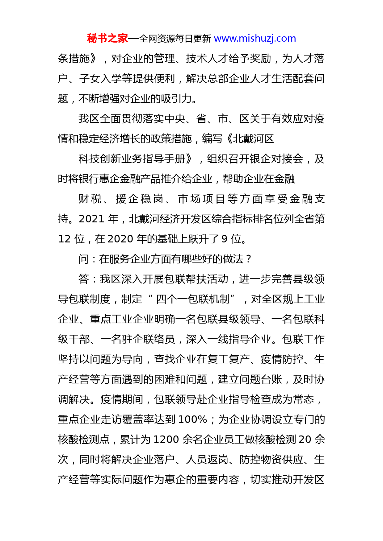 秘书之家—全网资源每日更新www.mishuzj.com激发惠企服务新效能助推经济高质量发展——北戴河经济开发区就惠企政策答记者问作为全国知名旅游度假胜地,北戴河具有良好的自然资源、人文资源。北戴河经济开发区坚持“上水平、聚产业”,不断革新服务理念、创新服务手段、做优营商环境,着力打造全省最快最优服务品牌,推动区域经济高质量发展。近日,北戴河经济开发区相关负责人接受本报记者采访,就如何落实惠企政策、加强服务企业等方面工作进行了详细解读。问:北戴河经济开发区对企业有什么扶持发展政策?答:我区紧紧围绕区委、区政府“三三四五”工作思路,注重宣传引导,让政策直达基层,出台《北戴河区关于加强招商引资工作的十条措施》,成立康养产业、文化旅游产业、总部经济、数字经济和现代服务业、都市农业五大招商专班,制定招商引资路线图,汇编专班招商政策,大力实施专班和产业链招商,并压实县级领导和区直部门招商引资责任制,全力、全员、全方位推进招商。同时,设立产业引导资金,出台《北戴河区企业人才(管理、技术)奖励办法》《北戴河区支持总部企业发展的十秘书之家—全网资源每日更新www.mishuzj.com条措施》,对企业的管理、技术人才给予奖励,为人才落户、子女入学等提供便利,解决总部企业人才生活配套问题,不断增强对企业的吸引力。我区全面贯彻落实中央、省、市、区关于有效应对疫情和稳定经济增长的政策措施,编写《北戴河区科技创新业务指导手册》,组织召开银企对接会,及时将银行惠企金融产品推介给企业,帮助企业在金融财税、援企稳岗、市场项目等方面享受金融支持。2021年,北戴河经济开发区综合指标排名位列全省第12位,在2020年的基础上跃升了9位。问:在服务企业方面有哪些好的做法?答:我区深入开展包联帮扶活动,进一步完善县级领导包联制度,制定“四个一包联机制”,对全区规上工业企业、重点工业企业明确一名包联县级领导、一名包联科级干部、一名驻企联络员,深入一线指导企业。包联工作坚持以问题为导向,查找企业在复工复产、疫情防控、生产经营等方面遇到的困难和问题,建立问题台账,及时协调解决。疫情期间,包联领导赴企业指导检查成为常态,重点企业走访覆盖率达到100%;为企业协调设立专门的核酸检测点,累计为1200余名企业员工做核酸检测20余次,同时将解决企业落户、人员返岗、防控物资供应、生产经营等实际问题作为惠企的重要内容,切实推动开发区秘书之家—全网资源每日更新www.mishuzj.com企业发展。问:在招商引资方面有哪些创新的举措?答:我区为便于总部企业入驻,积极搭建招商引资载体,激发创新活力,整合区内资源,建成总部大厦核心区、海宁路94号、海宁路225号等总部基地,利用已收储的原有厂房,实施老旧楼宇升级改造,提升楼宇档次和品质,开展二次招商;以“中部产城融合”为切入点,启动联峰商务大厦、金港青年创意公社项目,重点围绕产城融合发展理念,发挥周边教育优势,建设商务写字楼,高标准打造大学生科创基地、科研孵化基地等,吸引企业建设毕业生实训基地。问:在审批流程方面,有什么便利措施和服务方式?答:我区对入驻企业实施全方位支持和帮扶,积极创新审批模式,通过实行政务服务网上办理,为企业注册提供便捷高效的“不见面审批”服务,进一步优化北戴河区营商环境。我们认真践行招商真心、服务耐心、做事细心、领办诚心、工作交心的“五心工作法”,实施专业化、低成本和管家式服务,建立审批办税绿色通道,全面实行项目领办代办制,叫响“一天办照”品牌,打造全省最快最优服务平台。