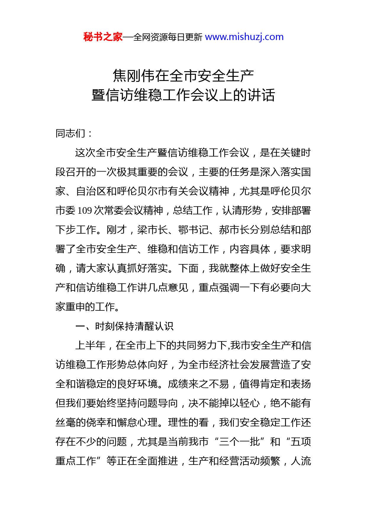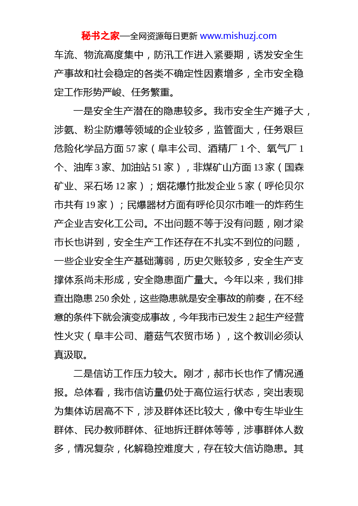 秘书之家—全网资源每日更新www.mishuzj.com焦刚伟在全市安全生产暨信访维稳工作会议上的讲话同志们:这次全市安全生产暨信访维稳工作会议,是在关键时段召开的一次极其重要的会议,主要的任务是深入落实国家、自治区和呼伦贝尔市有关会议精神,尤其是呼伦贝尔市委109次常委会议精神,总结工作,认清形势,安排部署下步工作。刚才,梁市长、鄂书记、郝市长分别总结和部署了全市安全生产、维稳和信访工作,内容具体,要求明确,请大家认真抓好落实。下面,我就整体上做好安全生产和信访维稳工作讲几点意见,重点强调一下有必要向大家重申的工作。一、时刻保持清醒认识上半年,在全市上下的共同努力下,我市安全生产和信访维稳工作形势总体向好,为全市经济社会发展营造了安全和谐稳定的良好环境。成绩来之不易,值得肯定和表扬但我们要始终坚持问题导向,决不能掉以轻心,绝不能有丝毫的侥幸和懈怠心理。理性的看,我们安全稳定工作还存在不少的问题,尤其是当前我市“三个一批”和“五项重点工作”等正在全面推进,生产和经营活动频繁,人流秘书之家—全网资源每日更新www.mishuzj.com车流、物流高度集中,防汛工作进入紧要期,诱发安全生产事故和社会稳定的各类不确定性因素增多,全市安全稳定工作形势严峻、任务繁重。一是安全生产潜在的隐患较多。我市安全生产摊子大,涉氨、粉尘防爆等领域的企业较多,监管面大,任务艰巨危险化学品方面57家(阜丰公司、酒精厂1个、氧气厂1个、油库3家、加油站51家),非煤矿山方面13家(国森矿业、采石场12家);烟花爆竹批发企业5家(呼伦贝尔市共有19家);民爆器材方面有呼伦贝尔市唯一的炸药生产企业吉安化工公司。不出问题不等于没有问题,刚才梁市长也讲到,安全生产工作还存在不扎实不到位的问题,一些企业安全生产基础薄弱,历史欠账较多,安全生产支撑体系尚未形成,安全隐患面广量大。今年以来,我们排查出隐患250余处,这些隐患就是安全事故的前奏,在不经意的条件下就会演变成事故,今年我市已发生2起生产经营性火灾(阜丰公司、蘑菇气农贸市场),这个教训必须认真汲取。二是信访工作压力较大。刚才,郝市长也作了情况通报。总体看,我市信访量仍处于高位运行状态,突出表现为集体访居高不下,涉及群体还比较大,像中专生毕业生群体、民办教师群体、征地拆迁群体等等,涉事群体人数多,情况复杂,化解稳控难度大,存在较大信访隐患。其秘书之家—全网资源每日更新www.mishuzj.com中我市民办教师群体达到了2632人,占呼伦贝尔八个地区和企业总量的50%。同时,信访积案化解进度缓慢。今年以来,上三级共交办给我市信访积案54件,已化解35件,化解率64.8%。一些信访积案,随着时间的推移,解决起来的难度越来越大。年底前完成化解率95%以上的要求还要进一步加大力度。此外,非访问题还存在。上半年,我市3名人员进京到天安门非访,受到了通报批评。信访工作压力较大,是案件积压导致的结果,同时,也反映出我们在处理信访工作主动性不强、责任落实不到位,一些领导干部在处理疑难信访问题时存在“拖、躲、捂、推”的情况不敢直面信访人化解矛盾,往往激化了矛盾,这种情况下还在找客观原因,不分析主观存在的问题。还有些基层干部对相关政策学习研究不深入,对复杂信访问题不会处理人为的把简单的事弄复杂了,把小事弄大了,导致了群众越级访。三是维稳工作任务较重。主要是平安建设存在一些薄弱的环节,社会管理创新方面办法不多,工作不扎实。舆论斗争及邪教和非法宗教活动等方面还有影响社会稳定的因素存在。一些执法部门依法办事的意识差、能力弱,引发了涉法涉诉案件(这也是2013年自治区党委巡视组巡视我市时指出的整改问题之一,5月15日市委常委会和6月14日书记办公会对这项问题作了进一步的安排部署)。秘书之家—全网资源每日更新www.mishuzj.com安全生产和信访工作事关社会稳定的大局。近年来,从中央到地方对安全生产和信访维稳工作的调度密度越来越大,要求也越来越高,已被全国上下提到前所未有的高度来加以重视。在国家层面:年初,习近平总书记在中央政治局常委会上,对加强安全生产工作提出5点要求。一是必须坚定不移保障安全发展,狠抓安全生产责任制落实,强化“党政同责、一岗双责、失职追责”。二是必须深化改革创新,加强和改进安全监管工作。三是必须强化依法治理,用法治思维和法治手段解决安全生产问题,着力提高安全生产法治化水平。四是必须坚决遏制重特大事故频发势头,对易发重特大事故的行业领域采取风险分级管控、隐患排查治理双重预防性工作机制,推动安全生产关口前移。五是必须加强基础建设,提升安全保障能力,坚决做好安全防范工作。近期,习近平总书记就信访工作又作出重要批示要求“下大气力处理好信访突出问题,把群众合理合法的利益诉求解决好”。在自治区层面:2月26日,全区信访局长会议要求(自治区副主席常军政出席并讲话),要按照“三到位、一处理”(对合理诉求解决到位、对无理诉求教育疏导到位、对生活困难帮扶到位,对违法行为依法处理)的信访工作总要求,以法治为统领,以改革为主线,以解决问题秘书之家—全网资源每日更新www.mishuzj.com为导向,深化“阳光信访、责任信访、法治信访”三项改革,进一步抓好“