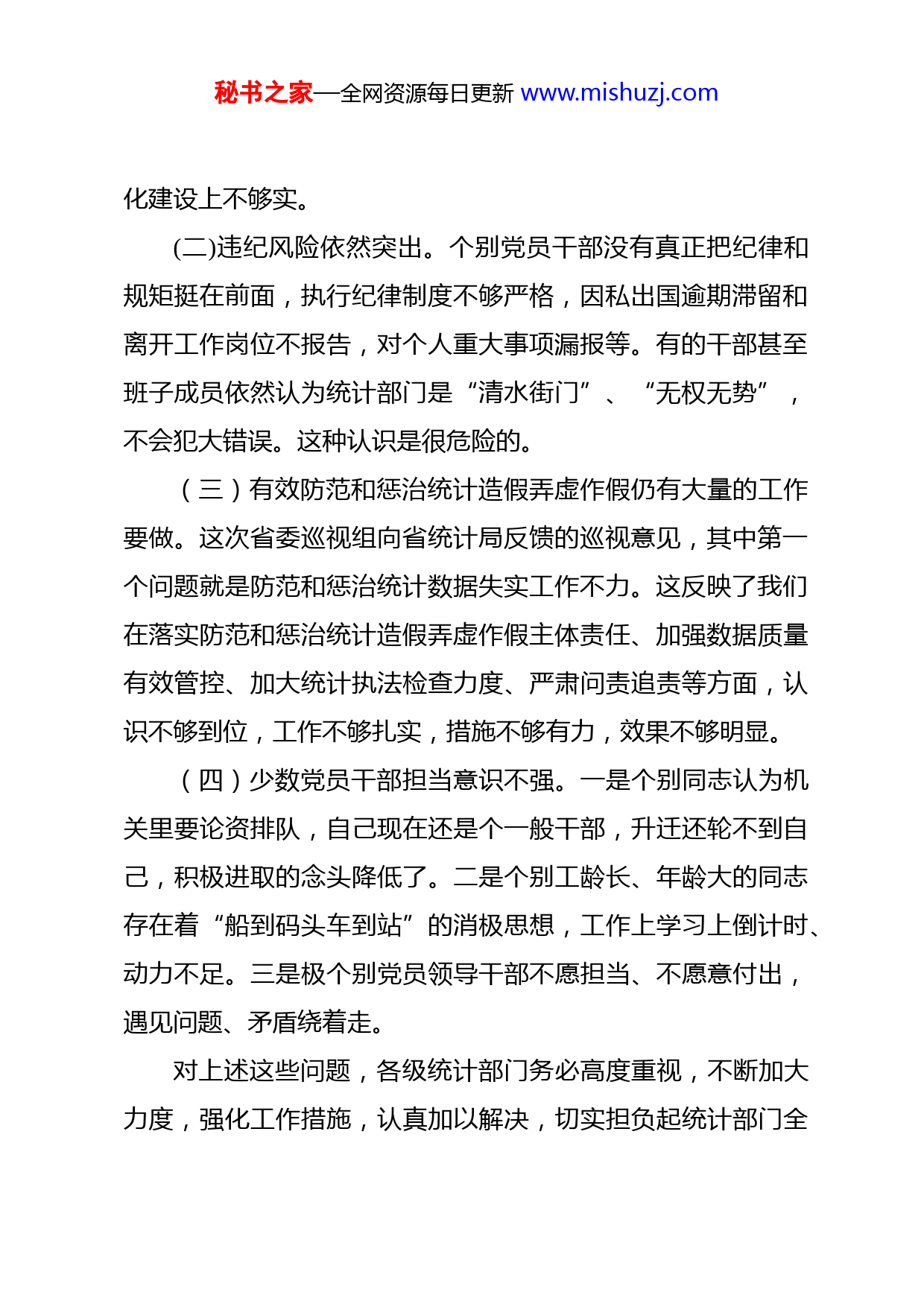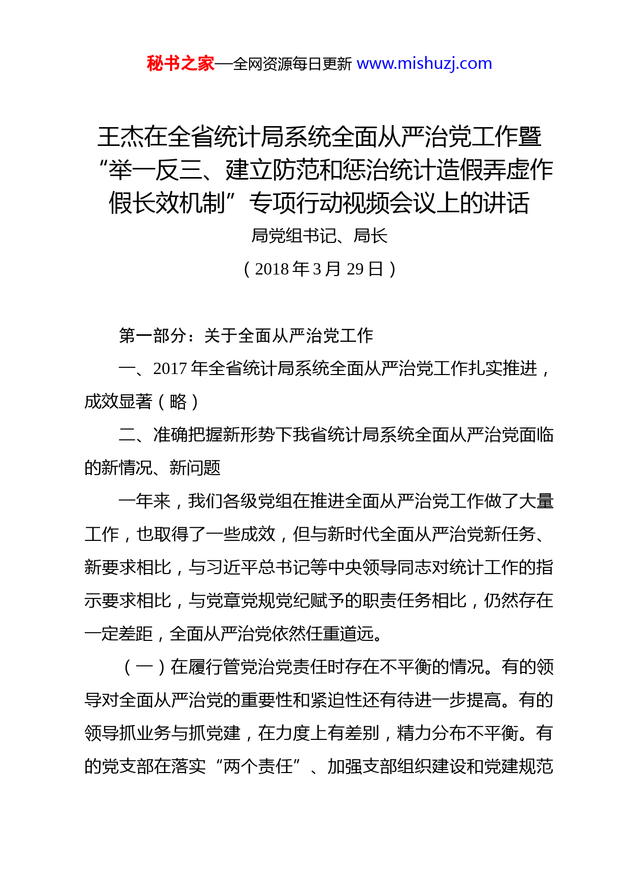 秘书之家—全网资源每日更新www.mishuzj.com王杰在全省统计局系统全面从严治党工作暨“举一反三、建立防范和惩治统计造假弄虚作假长效机制”专项行动视频会议上的讲话局党组书记、局长(2018年3月29日)第一部分:关于全面从严治党工作一、2017年全省统计局系统全面从严治党工作扎实推进,成效显著(略)二、准确把握新形势下我省统计局系统全面从严治党面临的新情况、新问题一年来,我们各级党组在推进全面从严治党工作做了大量工作,也取得了一些成效,但与新时代全面从严治党新任务、新要求相比,与习近平总书记等中央领导同志对统计工作的指示要求相比,与党章党规党纪赋予的职责任务相比,仍然存在一定差距,全面从严治党依然任重道远。(一)在履行管党治党责任时存在不平衡的情况。有的领导对全面从严治党的重要性和紧迫性还有待进一步提高。有的领导抓业务与抓党建,在力度上有差别,精力分布不平衡。有的党支部在落实“两个责任”、加强支部组织建设和党建规范秘书之家—全网资源每日更新www.mishuzj.com化建设上不够实。(二)违纪风险依然突出。个别党员干部没有真正把纪律和规矩挺在前面,执行纪律制度不够严格,因私出国逾期滞留和离开工作岗位不报告,对个人重大事项漏报等。有的干部甚至班子成员依然认为统计部门是“清水街门”、“无权无势”,不会犯大错误。这种认识是很危险的。(三)有效防范和惩治统计造假弄虚作假仍有大量的工作要做。这次省委巡视组向省统计局反馈的巡视意见,其中第一个问题就是防范和惩治统计数据失实工作不力。这反映了我们在落实防范和惩治统计造假弄虚作假主体责任、加强数据质量有效管控、加大统计执法检查力度、严肃问责追责等方面,认识不够到位,工作不够扎实,措施不够有力,效果不够明显。(四)少数党员干部担当意识不强。一是个别同志认为机关里要论资排队,自己现在还是个一般干部,升迁还轮不到自己,积极进取的念头降低了。二是个别工龄长、年龄大的同志存在着“船到码头车到站”的消极思想,工作上学习上倒计时、动力不足。三是极个别党员领导干部不愿担当、不愿意付出,遇见问题、矛盾绕着走。对上述这些问题,各级统计部门务必高度重视,不断加大力度,强化工作措施,认真加以解决,切实担负起统计部门全秘书之家—全网资源每日更新www.mishuzj.com面从严治党的责任。三、明确要求、落实举措,切实把全面从严治党要求落实到各个领域各个环节2018年,全省统计局系统要以习近平新时代中国特色社会主义思想为指导,深入贯彻党的十九大精神,按照省委十四届二次全会和省纪委二次全会的部署,坚持党要管党、全面从严治党,坚持抓早抓小、持之以恒正风肃纪,营造风清气正的良好政治生态,为全面深化统计改革创新提供坚强保证,为清廉浙江建设作出积极贡献。重点抓好以下六个方面的工作:(一)把加强党的政治建设放在首位。深入学习贯彻习近平新时代中国特色社会主义思想和党的十九大精神,不断增强“四个意识”,做到“四个服从”,把坚持党的全面领导、维护党中央权威和集中统一领导作为必须严格遵守的最根本的政治原则和最大的政治规矩,一以贯之地落实到实际工作中。(二)严格履行管党治党责任。把全面从严治党工作与日常业务工作同部署、同实施、同检查、同考核,切实防止压力层层递减,防止重业务轻党建,防止责任落实形式化、表面化。(三)持之以恒推进作风建设。深刻领会习近平总书记关于进一步纠正“四风”、加强作风建设的重要批示精神,认真秘书之家—全网资源每日更新www.mishuzj.com落实中央八项规定及实施细则和省委“36条办法”,认真贯彻落实局党组关于认真贯彻执行中央八项规定实施细则的办法。各级领导干部要坚持以上率下,以自身过硬的作风当标杆、作示范,充分发挥“头雁效应”,切实推动统计部门党风政风继续好转。(四)切实加强纪律建设。各级统计部门要突出纪律教育的针对性,把党章党规党纪作为党组理论学习中心组、干部培训的必修课,使党员干部知敬畏、存戒惧、守底线,习惯在受监督和约束的环境中工作和生活。要发挥好基层党组织直接教育、管理和监督党员的职责,把工作做在平时、体现在日常,以严的标准、严的措施约束党员干部,确保党员干部干成事、不出事。每名党员干部要切实增强“四个意识”,努力提高政治警觉性和政治鉴别力,在大是大非问题上始终保持政治定力,站稳立场,旗帜鲜明;要自觉抵制不当言论,不信谣、不传谣,不口无遮挡,坚决杜绝妄议中央的言论;要不折不扣贯彻执行中央、省委省政府的决策部署,切实在思想上政治上行动上同以习近平同志为核心书记的党中央保持高度一致,坚决维护党中央权威和集中统一领导。(五)坚决防范和惩治统计造假、弄虚作假。要深入学习贯彻习近平总书记等中央领导同志和车俊书记等省委省政府领秘书之家—全网资源每日更新www.mishuzj.com导同志关于统计工作的重要指示精神,学习贯彻系列重要统计改革文件和法规精神,深刻认识统计造假、弄虚作假是严肃的政治纪律问题和严重的腐败现象。进一步强化数据质量管控,加强对源头数据的查询审核、评估和核查。加大统计执法检查力度。大力加强统计职业道德教育,自觉践行统计核心价值观,在任何