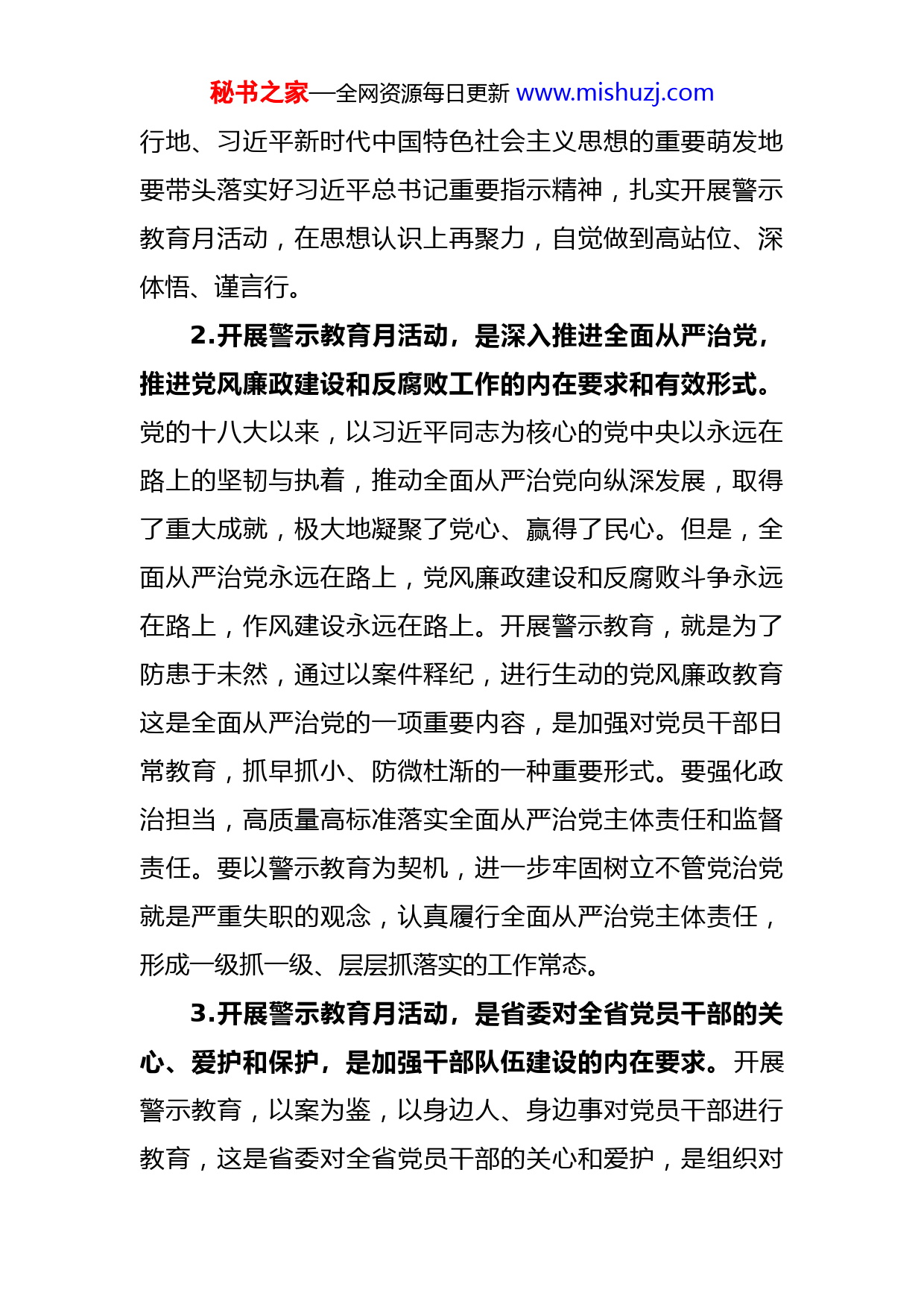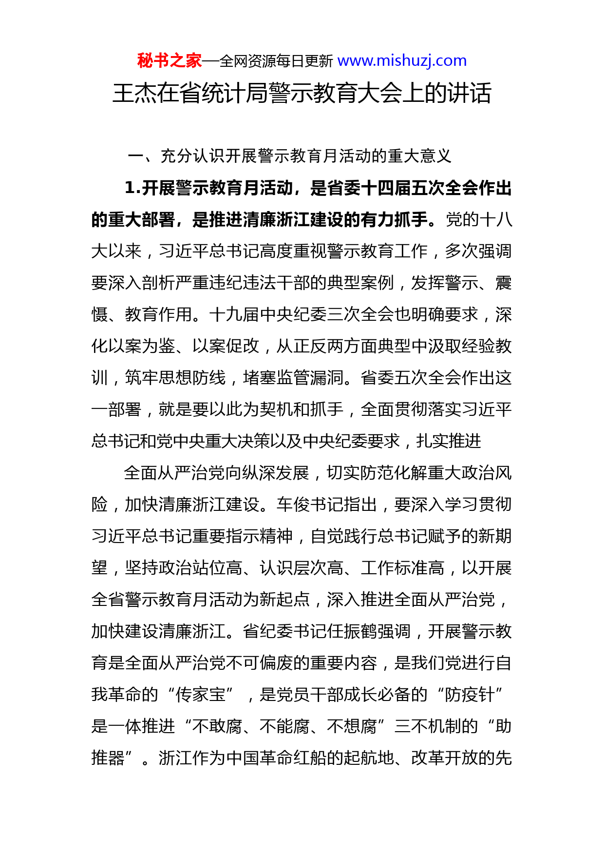秘书之家—全网资源每日更新www.mishuzj.com王杰在省统计局警示教育大会上的讲话一、充分认识开展警示教育月活动的重大意义1.开展警示教育月活动,是省委十四届五次全会作出的重大部署,是推进清廉浙江建设的有力抓手。党的十八大以来,习近平总书记高度重视警示教育工作,多次强调要深入剖析严重违纪违法干部的典型案例,发挥警示、震慑、教育作用。十九届中央纪委三次全会也明确要求,深化以案为鉴、以案促改,从正反两方面典型中汲取经验教训,筑牢思想防线,堵塞监管漏洞。省委五次全会作出这一部署,就是要以此为契机和抓手,全面贯彻落实习近平总书记和党中央重大决策以及中央纪委要求,扎实推进全面从严治党向纵深发展,切实防范化解重大政治风险,加快清廉浙江建设。车俊书记指出,要深入学习贯彻习近平总书记重要指示精神,自觉践行总书记赋予的新期望,坚持政治站位高、认识层次高、工作标准高,以开展全省警示教育月活动为新起点,深入推进全面从严治党,加快建设清廉浙江。省纪委书记任振鹤强调,开展警示教育是全面从严治党不可偏废的重要内容,是我们党进行自我革命的“传家宝”,是党员干部成长必备的“防疫针”是一体推进“不敢腐、不能腐、不想腐”三不机制的“助推器”。浙江作为中国革命红船的起航地、改革开放的先秘书之家—全网资源每日更新www.mishuzj.com行地、习近平新时代中国特色社会主义思想的重要萌发地要带头落实好习近平总书记重要指示精神,扎实开展警示教育月活动,在思想认识上再聚力,自觉做到高站位、深体悟、谨言行。2.开展警示教育月活动,是深入推进全面从严治党,推进党风廉政建设和反腐败工作的内在要求和有效形式。党的十八大以来,以习近平同志为核心的党中央以永远在路上的坚韧与执着,推动全面从严治党向纵深发展,取得了重大成就,极大地凝聚了党心、赢得了民心。但是,全面从严治党永远在路上,党风廉政建设和反腐败斗争永远在路上,作风建设永远在路上。开展警示教育,就是为了防患于未然,通过以案件释纪,进行生动的党风廉政教育这是全面从严治党的一项重要内容,是加强对党员干部日常教育,抓早抓小、防微杜渐的一种重要形式。要强化政治担当,高质量高标准落实全面从严治党主体责任和监督责任。要以警示教育为契机,进一步牢固树立不管党治党就是严重失职的观念,认真履行全面从严治党主体责任,形成一级抓一级、层层抓落实的工作常态。3.开展警示教育月活动,是省委对全省党员干部的关心、爱护和保护,是加强干部队伍建设的内在要求。开展警示教育,以案为鉴,以身边人、身边事对党员干部进行教育,这是省委对全省党员干部的关心和爱护,是组织对秘书之家—全网资源每日更新www.mishuzj.com我们的保护。在2004年7月15日举行的全省推进党风廉政建设电视电话会议上,时任省委书记习近平在会上脱稿讲话,给领导干部语重心长地算了“三笔账”,即经济账、法纪账和良心账。警示教育,就是要引导广大党员干部经常算算这“三笔账”,真正做到明大德、守公德、严私德真正做到公正用权、谨慎用权、干净用权,真正认识到“手莫伸,伸手必被捉”的道理,从而使清廉真正成为每个党员干部的自觉,避免违法违纪问题的发生。二、要坚持效果导向,使党员干部从警示中得到教育我们要把警示教育作为一项严肃的政治工作和政治任务,通过警示教育活动,使广大党员干部从违法违纪案件中吸取教训,引以为鉴,防微杜渐,从警示中得到教育。我们要自觉用好警示教育这面镜子,通过这些典型案例,以此触动思想,触动灵魂。省委开展警示教育月的目的,就是用身边人身边事警示教育党员干部,以案说纪、以案说法、举一反三,做到警钟长鸣。无论是省法纪教育基地展现的一些典型案例,还是待会要播放的警示片中的那些走上违纪违法道路的领导干部,很多曾是我们身边熟悉的人。看到他们一夜之间陡增白发、迅速苍老、后悔莫及的样子,听到他们一声声发自内心的含泪忏悔,我们必须引起警醒,从中吸取教训。我们要自觉用好警示教育这面镜子,通过这些典型案秘书之家—全网资源每日更新www.mishuzj.com例,把自己摆进去、把思想摆进去,深刻对照,反躬自省开展警示教育,决不能把教训当故事听,把案件当剧本看而要把自己摆进去。腐败分子不是一开始就是坏人,他们从小恶开始,往往是一念之差,情面难却。所以要不断受教育,要警钟长鸣。要知敬畏、存戒惧、守底线,我们要自觉用好警示教育这面镜子,通过这些典型案例,举一反三,引以为戒。统计部门不是一片净土,相反,在全面从严治党的形势下,统计部门犯错误、违纪的风险点很多,最近几年统计系统出事的人很多。3月18日召开的全国统计部门全面从严治党视频会议提到,统计部门是近几年查处违纪违法问题居高不下的单位之一。我们这几年,虽然没有大的案件,但小事情也有。所以,我们一定要举一反三,严守纪律,切实筑牢不敢腐、不能腐、不想腐的思想防线,永葆共产党人的政治本色,使警示教育真正取得实效。三、注重防范风险,切实防止各类违规违纪问题发生一要防范党的政治建设领域的风险,严守政治纪律政治规矩。要深刻把握“两个维护”的内涵要求,坚决维护习近平总书记党中央的核心、全党的核心地位,坚决维护