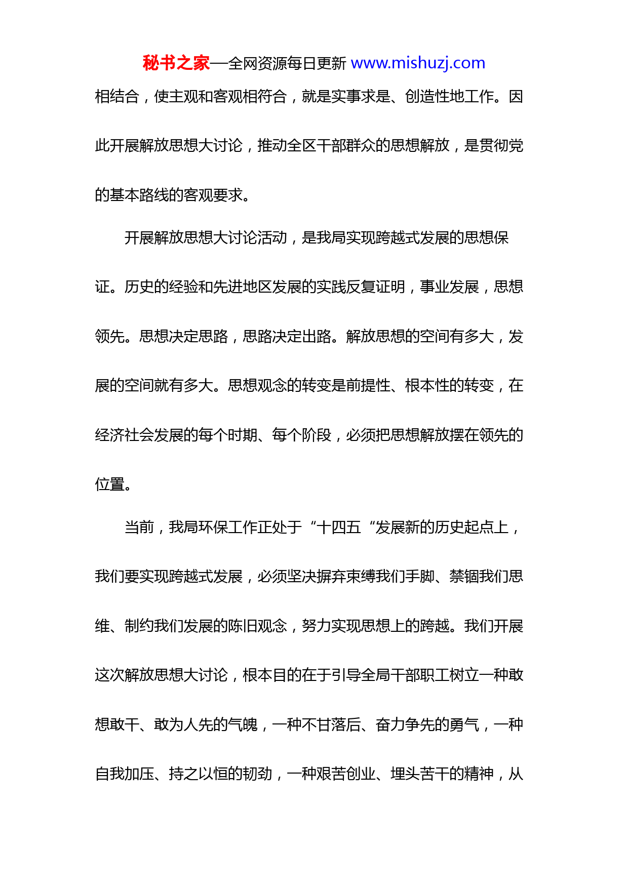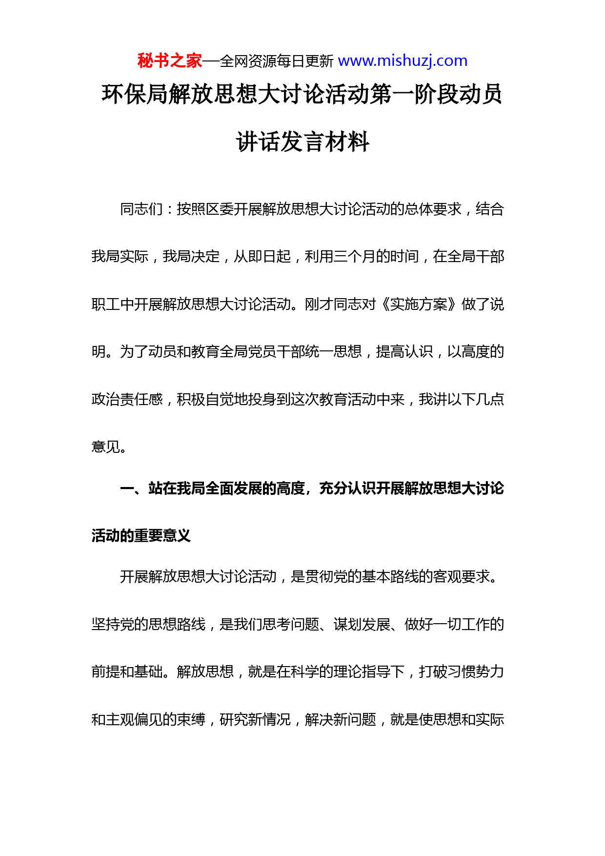 秘书之家—全网资源每日更新www.mishuzj.com环保局解放思想大讨论活动第一阶段动员讲话发言材料同志们:按照区委开展解放思想大讨论活动的总体要求,结合我局实际,我局决定,从即日起,利用三个月的时间,在全局干部职工中开展解放思想大讨论活动。刚才同志对《实施方案》做了说明。为了动员和教育全局党员干部统一思想,提高认识,以高度的政治责任感,积极自觉地投身到这次教育活动中来,我讲以下几点意见。一、站在我局全面发展的高度,充分认识开展解放思想大讨论活动的重要意义开展解放思想大讨论活动,是贯彻党的基本路线的客观要求。坚持党的思想路线,是我们思考问题、谋划发展、做好一切工作的前提和基础。解放思想,就是在科学的理论指导下,打破习惯势力和主观偏见的束缚,研究新情况,解决新问题,就是使思想和实际秘书之家—全网资源每日更新www.mishuzj.com相结合,使主观和客观相符合,就是实事求是、创造性地工作。因此开展解放思想大讨论,推动全区干部群众的思想解放,是贯彻党的基本路线的客观要求。开展解放思想大讨论活动,是我局实现跨越式发展的思想保证。历史的经验和先进地区发展的实践反复证明,事业发展,思想领先。思想决定思路,思路决定出路。解放思想的空间有多大,发展的空间就有多大。思想观念的转变是前提性、根本性的转变,在经济社会发展的每个时期、每个阶段,必须把思想解放摆在领先的位置。当前,我局环保工作正处于“十四五“发展新的历史起点上,我们要实现跨越式发展,必须坚决摒弃束缚我们手脚、禁锢我们思维、制约我们发展的陈旧观念,努力实现思想上的跨越。我们开展这次解放思想大讨论,根本目的在于引导全局干部职工树立一种敢想敢干、敢为人先的气魄,一种不甘落后、奋力争先的勇气,一种自我加压、持之以恒的韧劲,一种艰苦创业、埋头苦干的精神,从秘书之家—全网资源每日更新www.mishuzj.com而在观念的更新中实现突破,以新的思想、新的观念、新的方式、新的方法来谋求跨越发展之策,聚集跨越发展之力,奔向跨越发展之路,以思想的大解放推动我局各项事业发展的大跨越。总之,开展这次解放思想大讨论,不仅十分必要,而且至关重要。全体党员干部一定要充分认识这次思想解放大讨论活动的重要意义,坚决冲破一切妨碍发展的思想观念,坚决改变一切束缚发展的做法和规定,坚决革除一切影响发展的体制弊端,使我们的思想有一个大的解放,作风有一个大的转变,环境有一个大的优化,真正把全校上下的思想和行动统一到科学发展这个第一要务上来,统一到推进我校跨越发展的伟大实践中来,统一到艰苦奋斗、迎难而上、拼搏赶超的精神状态上来。二、着力解决影响我局发展的思想问题思想大讨论的目的是解决问题。我们要紧密联系思想和工作实际,重点解决制约我局环保工作发展的思想观念、工作方式和工作作风等方面存在的问题,着力强化五种意识:1、强化忧患意识。近秘书之家—全网资源每日更新www.mishuzj.com几年来,全局上下团结一心,克服困难,各项工作都取得了长足的进步。值得注意的是,我们必须看到,在很多方面,我们还存在很大的差距,在环保工作面临的新形势下,我们必须增强忧患意识,克服困难,提高工作标准,以几倍于人的努力,把发展的步子迈得更好些、更快些。2、强化创新意识。党的十八大以来,党中央提出了一系列新思想、新观点、新要求,面对新的形势,我们要创新思维方式、创新机制体制、创新工作方法,把新的理念转化为行之有效的工作方法,切实做好辖区的环境保护工作。3、强化实干意识。我们的干部队伍总体上是好的,绝大多数同志都保持了干事创业、真抓实干的良好作风。但也有少数干部受社会不良风气的影响,存在浮躁的心态,工作飘浮,不抓落实,或者抓而不紧、不实。我局领导干部必须树立正确的政绩观,发扬求真务实精神,脚踏实地干事业,真心实意为群众谋利益。要坚持诚心诚意为群众服务的意识,始终保持同群众的密切联系,着力解决群秘书之家—全网资源每日更新www.mishuzj.com众反映强烈的突出环境问题,多办顺应民意、化解民忧、为民谋利的实事。4、强化进取意识。当前,环保工作面临不少困难,面对发展中存在的困难,我们要进一步增强进取意识,以科学发展观为指导,分析困难、寻求办法,以坚定的信心去面对困难,战胜困难。5、强化大局意识。近年来,在我局发展过程中,有一些不尽如人意之处。突出的表现是:有的个人思想狭隘、目光短小,本位主义严重,大局观念不强,一事当前,首先考虑小团体利益和个人利益,影响了大局工作。我们要通过这次大讨论,进一步强化全局意识和服务意识,正确处理部门利益和全局利益的关系,做到个人利益服从于集体利益,部门利益服务于全局利益。三、加强落实,确保解放思想大讨论活动取得扎实成效为了使这次教育思想大讨论活动能够达到预期目的,取得实效,特别强调以下五点:一是认清形势,全员参与。要克服那种认为教育思想大讨论仅仅是一种务虚活动的不正确认识。应该认识秘书之家—全网资源每日更新www.mishuzj.com到,思想观念先行是一切事业发展的前提和保证,面临环保新的发展,全体党员要充分认识开展这次教育思想大讨论的重要意义,以主人翁的态度积极参加这场教育思想大讨论,在