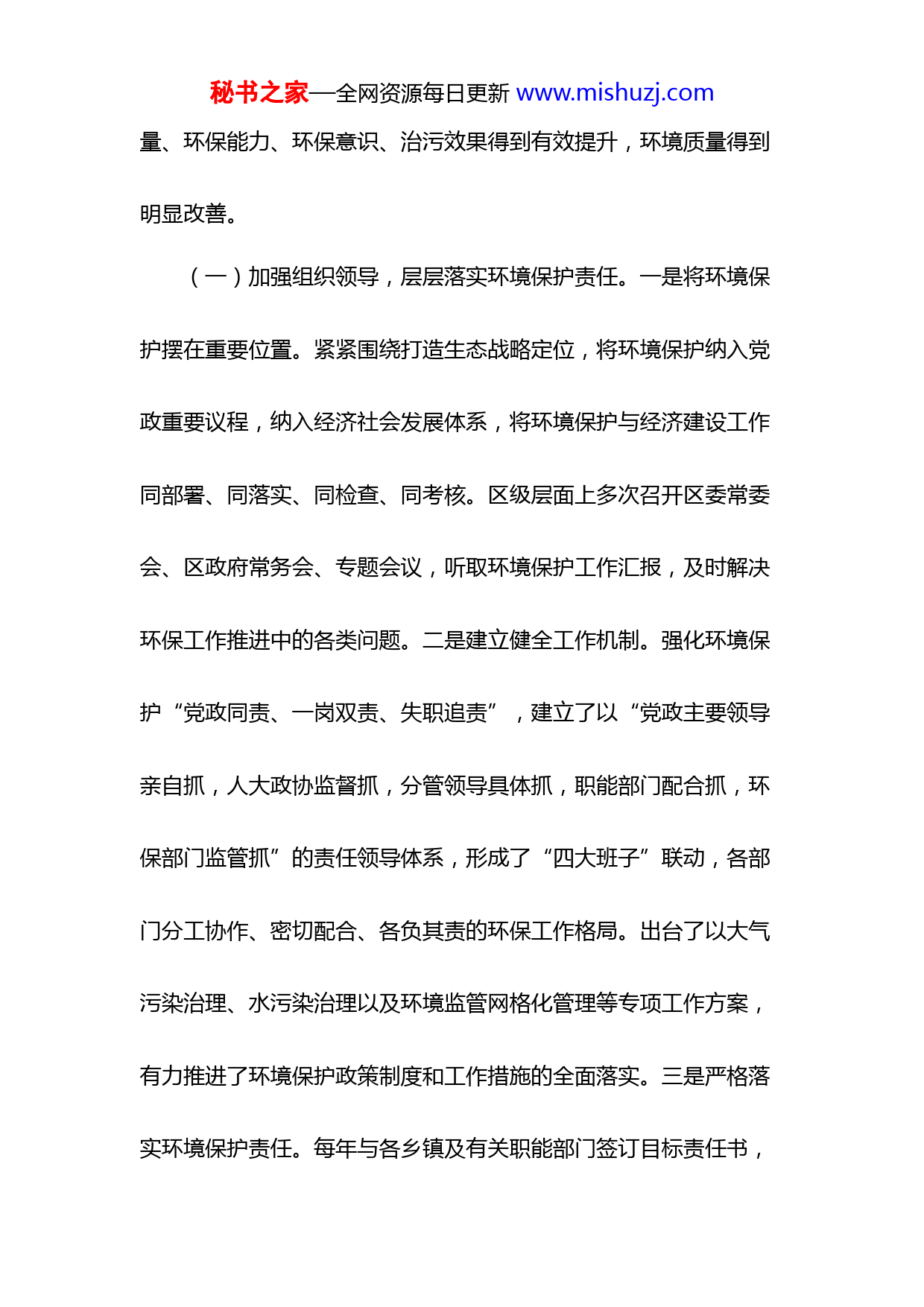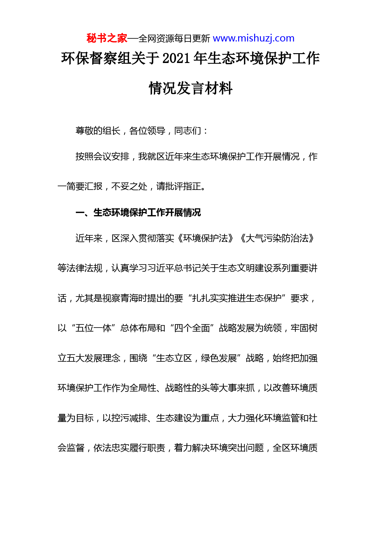 秘书之家—全网资源每日更新www.mishuzj.com环保督察组关于2021年生态环境保护工作情况发言材料尊敬的组长,各位领导,同志们:按照会议安排,我就区近年来生态环境保护工作开展情况,作一简要汇报,不妥之处,请批评指正。一、生态环境保护工作开展情况近年来,区深入贯彻落实《环境保护法》《大气污染防治法》等法律法规,认真学习习近平总书记关于生态文明建设系列重要讲话,尤其是视察青海时提出的要“扎扎实实推进生态保护”要求,以“五位一体”总体布局和“四个全面”战略发展为统领,牢固树立五大发展理念,围绕“生态立区,绿色发展”战略,始终把加强环境保护工作作为全局性、战略性的头等大事来抓,以改善环境质量为目标,以控污减排、生态建设为重点,大力强化环境监管和社会监督,依法忠实履行职责,着力解决环境突出问题,全区环境质秘书之家—全网资源每日更新www.mishuzj.com量、环保能力、环保意识、治污效果得到有效提升,环境质量得到明显改善。(一)加强组织领导,层层落实环境保护责任。一是将环境保护摆在重要位置。紧紧围绕打造生态战略定位,将环境保护纳入党政重要议程,纳入经济社会发展体系,将环境保护与经济建设工作同部署、同落实、同检查、同考核。区级层面上多次召开区委常委会、区政府常务会、专题会议,听取环境保护工作汇报,及时解决环保工作推进中的各类问题。二是建立健全工作机制。强化环境保护“党政同责、一岗双责、失职追责”,建立了以“党政主要领导亲自抓,人大政协监督抓,分管领导具体抓,职能部门配合抓,环保部门监管抓”的责任领导体系,形成了“四大班子”联动,各部门分工协作、密切配合、各负其责的环保工作格局。出台了以大气污染治理、水污染治理以及环境监管网格化管理等专项工作方案,有力推进了环境保护政策制度和工作措施的全面落实。三是严格落实环境保护责任。每年与各乡镇及有关职能部门签订目标责任书,秘书之家—全网资源每日更新www.mishuzj.com将环境保护各项目标任务和污染减排等约束性指标分解落实,细化和明确部门监管责任、乡镇属地责任和企业主体责任,层层传导压力,层层落实责任。(二)全力开展整治,环境综合质量不断提高。一是高度关注大气污染治理。组织专门力量,对全区燃煤锅炉、建筑工地、餐饮业等进行全面摸排,逐一制定整治方案,划定时限,重拳出击。累计完成“煤改气”蒸吨,天然气逐步向乡镇延伸。严格落实建筑工地扬尘控制“六个100%”,建设单位和施工单位扬尘防控取得实效;重拳整治渣土运输乱象,“抛洒滴漏”现象得到有效遏制。新建煤炭交易市场家,完成座油库和家加油站油气回收任务。年全区空气质量优良天数天、优良率%,较年增加天、提升个百分点,环境空气质量进一步改善。二是稳步推进水污染防治。以治污截污为重点,系统实施污水直排整治工程,新建雨水管网公里、污水管网公里;以PPP模式新建污水处理厂座,新增污水处理能力万吨,城区污水收集率达%。全力推进湟水河、引胜河等河道综合治理项目,规范秘书之家—全网资源每日更新www.mishuzj.com整治水电站,湟水河断面水质逐年向好,稳定到达四类。三是全面加强农业面源污染治理。大力推进“化肥农药零增长”行动,大力推广测土配方施肥,化肥、农药使用量逐年下降。积极推进废旧残膜清理回收工作,残膜回收率达%。四是加大城乡环境卫生综合整治。持续实施“家园美化行动”,累计完成个美丽乡村建设和个村的农村环境集中连片整治项目建设,环保基础设施不断完备,农村专职保洁员实现全覆盖,受益人口达万人。纵深推进城市“三乱”综合治理,积极开展“三城同创”工作,加强城区道路清扫保洁力度,保洁面积由万平方米增加至万平方米,机械化清扫率达%,清扫质量达到“六无六净”标准。(三)注重生态建设,持续推动绿色发展。按照“三绿”建设要求,以打造绿色屏障为目标,将山绿化作为切入点,启动实施绿化工程,大力推进河流域生态保护和治理,加快实施中心城区、沿河主要城镇、工业园等重点区域绿化及湿地公园建设。累计完成等人工造林万亩,完成义务植树万株,建设湿地公园(试点)、生态秘书之家—全网资源每日更新www.mishuzj.com公园各一处,森林覆盖率达%,较年提升个百分点;建成区绿化覆盖率达%,人均公园绿地面积达平方米。坚持“高新轻优”的产业发展定位,严把环评审批准入关口,从源头上杜绝了高污染企业落地我区。采取“关、停、并、转”等措施,加快淘汰落后产能,淘汰万重量箱玻璃格法生产线条、窑水泥生产线条、12500KVA碳化硅生产线条,家非法开采粘土砖厂、家非法开采砂石场和家水泥预制板厂已全部取缔。“两高一资”产能逐年下降。(四)强化执法监管,环境违法行为有效遏制。深入开展环境保护大检查,及时查处各类环境违法行为,始终保持违法违纪行为打压高压态势。近年来,共查处企业环境违法案件件,责令限期整改家,督办解决突出环境问题个,清理整顿违法违规建设项目项。及时处置环境信访,四年来共受理环境污染投诉来信来访件,查处率和办结率达%,做到了“事事有回应,件件有着落”。高度重视西北环保督查中心和省、市环保督查以及省环保“回头看”反馈问题整改工作,成立整改领导小组,已对标整改个问题,整改率达%,