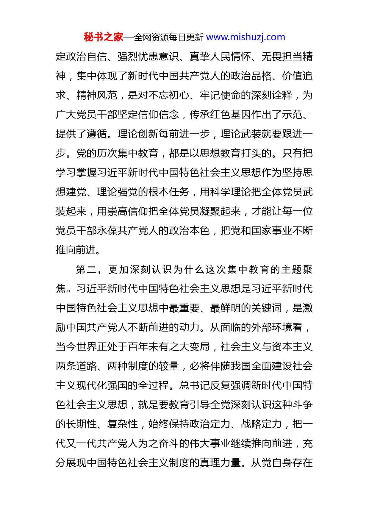 秘书之家—全网资源每日更新www.mishuzj.com主题教育理论学习中心组集中学习研讨发言:推动宣传思想工作守正创新这次集中学习,静下心来读习近平总书记的原文原著,学思悟结合,进一步深化了对习近平新时代中国特色社会主义思想的认识,主要在三个方面有了更深的感悟和体会。第一,更加深刻认识为什么我们党始终强调思想建党、理论强党。习近平总书记深刻指出,我们党之所以能够历经艰难困苦而不断发展壮大,很重要的一个原因就是始终重视思想建党、理论强党,使全党始终保持统一的思想、坚定的意志、协调的行动、强大的战斗力。进入新时代,如何在新的历史条件下坚持和发展中国特色社会主义,如何推动发展理念和发展方式的转变,如何满足人民群众美好生活需要,如何解决党内在理想信念、政治信仰、纪律规矩、思想作风等方面存在的问题,都迫切需要从理论上作出科学回答,从思想上正本清源,从实践上给予科学指引。正是围绕这些重大理论和实践问题,习近平总书记提出了一系列具有开创性意义的新理念新思想新战略,形成了习近平新时代中国特色社会主义思想。这一伟大思想,不仅为党治国理政提供了行动指南,而且解决了党的思想建设中长期存在的一些重大问题。其中蕴含的坚秘书之家—全网资源每日更新www.mishuzj.com定政治自信、强烈忧患意识、真挚人民情怀、无畏担当精神,集中体现了新时代中国共产党人的政治品格、价值追求、精神风范,是对不忘初心、牢记使命的深刻诠释,为广大党员干部坚定信仰信念,传承红色基因作出了示范、提供了遵循。理论创新每前进一步,理论武装就要跟进一步。党的历次集中教育,都是以思想教育打头的。只有把学习掌握习近平新时代中国特色社会主义思想作为坚持思想建党、理论强党的根本任务,用科学理论把全体党员武装起来,用崇高信仰把全体党员凝聚起来,才能让每一位党员干部永葆共产党人的政治本色,把党和国家事业不断推向前进。第二,更加深刻认识为什么这次集中教育的主题聚焦。习近平新时代中国特色社会主义思想是习近平新时代中国特色社会主义思想中最重要、最鲜明的关键词,是激励中国共产党人不断前进的动力。从面临的外部环境看,当今世界正处于百年未有之大变局,社会主义与资本主义两条道路、两种制度的较量,必将伴随我国全面建设社会主义现代化强国的全过程。总书记反复强调新时代中国特色社会主义思想,就是要教育引导全党深刻认识这种斗争的长期性、复杂性,始终保持政治定力、战略定力,把一代又一代共产党人为之奋斗的伟大事业继续推向前进,充分展现中国特色社会主义制度的真理力量。从党自身存在秘书之家—全网资源每日更新www.mishuzj.com的问题看,思想不纯、政治不纯、组织不纯、作风不纯等突出问题还没有从根本上得到解决。这些问题从思想根源上分析,还是群众观点不牢,丢掉了初心,忘记了使命。我们党来自于人民,任何时候都不能忘了根本,必须教育引导党员干部始终牢记宗旨,把群众路线深深植根于思想中、具体落实到行动上。从肩负的历史使命看,“两个一百年”的奋斗目标绝不是轻轻松松、敲锣打鼓就能实现的,实现中原更加出彩还面临不少艰巨的硬任务、难啃的硬骨头,比如推动乡村振兴;比如推动动能转换、结构升级,实现经济高质量发展;比如深化经济领域市场化改革,在社会领域改革中充分体现公平正义,在政府职能转变中更好落实“放管服”要求;比如强化开放思维,在更大范围配置资源,以更高层次开放引领河南高质量发展等等,对我们都是巨大的考验,每一项都需要广大党员干部勇担职责使命,焕发干事创业的精气神。把集中教育主题聚焦到初心使命上来,就是要教育引导广大党员干部从党的光荣历史中获取力量,从革命先辈和先进典型中激发动能,从实践和群众中汲取智慧,发扬敢于斗争的精神,切实把应当担负的责任担当起来。第三,更加深刻认识为什么要推动宣传思想工作守正创新。推动宣传思想工作守正创新,是习近平总书记对宣传思想工作进入新阶段的重大判断、明确要求,体现了总秘书之家—全网资源每日更新www.mishuzj.com书记对形势的深刻洞察。现在,宣传思想工作的环境、对象、范围和方式都发生了根本性变化,给我们带来了全新的挑战,推动工作创新比以往任何时候都更加紧迫。比如,意识形态领域敏感复杂,敌对势力不断调整策略、变化手段,必须进一步建立健全责任落实、风险防控、正面引导工作机制,在统筹建设与管理中实现意识形态工作总体突破。比如宣传思想工作主阵地主战场已经发生根本转移,网络已成为人们获取信息知识、开展理论宣传普及、满足精神文化需求的主渠道,必须深刻把握“网络化生存”这个最大的时代特点,牢固树立互联网思维,加快推动宣传思想工作各领域资源力量进入网络主战场。比如舆论生态深刻变化,一张图、一段视频经由全媒体几个小时就能形成爆发式传播,对舆论场造成很大影响,必须围绕提升发现力、研判力、处置力,加快构建更加科学高效的舆情应对处置机制。比如社会组织结构和群体结构深刻变化,“两新”组织从业人员、自由职业者等群体不断扩大,“90后”“00后”新生代日益成为社会重要力量,必须强化受众意识和效果导向,根据不同人群接受习惯和需