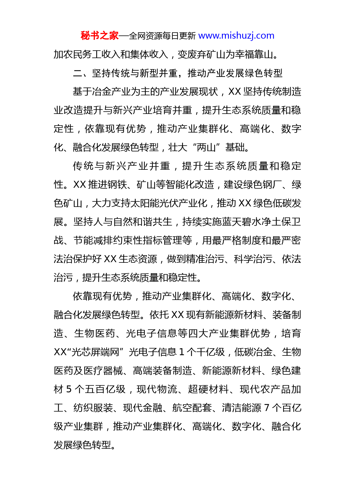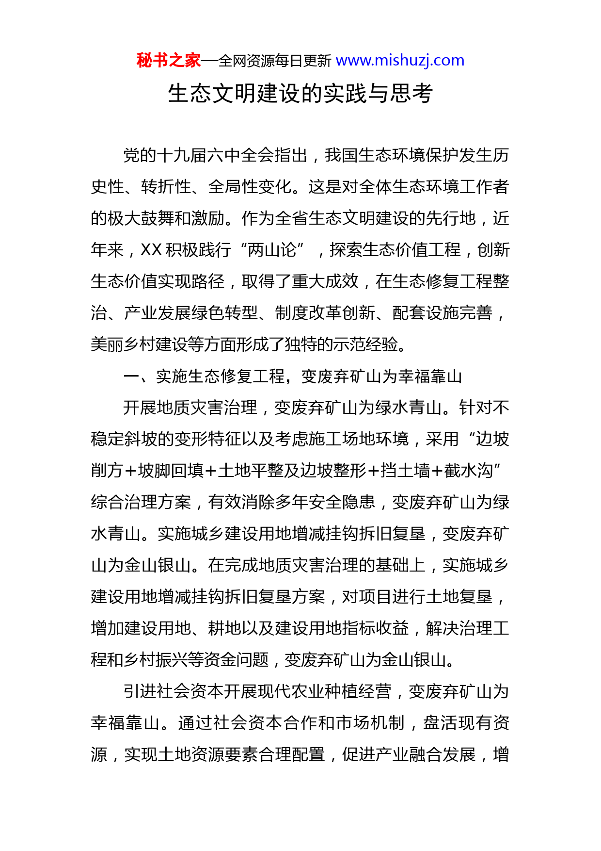 秘书之家—全网资源每日更新www.mishuzj.com生态文明建设的实践与思考党的十九届六中全会指出,我国生态环境保护发生历史性、转折性、全局性变化。这是对全体生态环境工作者的极大鼓舞和激励。作为全省生态文明建设的先行地,近年来,XX积极践行“两山论”,探索生态价值工程,创新生态价值实现路径,取得了重大成效,在生态修复工程整治、产业发展绿色转型、制度改革创新、配套设施完善,美丽乡村建设等方面形成了独特的示范经验。一、实施生态修复工程,变废弃矿山为幸福靠山开展地质灾害治理,变废弃矿山为绿水青山。针对不稳定斜坡的变形特征以及考虑施工场地环境,采用“边坡削方+坡脚回填+土地平整及边坡整形+挡土墙+截水沟”综合治理方案,有效消除多年安全隐患,变废弃矿山为绿水青山。实施城乡建设用地增减挂钩拆旧复垦,变废弃矿山为金山银山。在完成地质灾害治理的基础上,实施城乡建设用地增减挂钩拆旧复垦方案,对项目进行土地复垦,增加建设用地、耕地以及建设用地指标收益,解决治理工程和乡村振兴等资金问题,变废弃矿山为金山银山。引进社会资本开展现代农业种植经营,变废弃矿山为幸福靠山。通过社会资本合作和市场机制,盘活现有资源,实现土地资源要素合理配置,促进产业融合发展,增秘书之家—全网资源每日更新www.mishuzj.com加农民务工收入和集体收入,变废弃矿山为幸福靠山。二、坚持传统与新型并重,推动产业发展绿色转型基于冶金产业为主的产业发展现状,XX坚持传统制造业改造提升与新兴产业培育并重,提升生态系统质量和稳定性,依靠现有优势,推动产业集群化、高端化、数字化、融合化发展绿色转型,壮大“两山”基础。传统与新兴产业并重,提升生态系统质量和稳定性。XX推进钢铁、矿山等智能化改造,建设绿色钢厂、绿色矿山,大力支持太阳能光伏产业化,推动XX绿色低碳发展。坚持人与自然和谐共生,持续实施蓝天碧水净土保卫战、节能减排约束性指标管理等,用最严格制度和最严密法治保护好XX生态资源,做到精准治污、科学治污、依法治污,提升生态系统质量和稳定性。依靠现有优势,推动产业集群化、高端化、数字化、融合化发展绿色转型。依托XX现有新能源新材料、装备制造、生物医药、光电子信息等四大产业集群优势,培育XX“光芯屏端网”光电子信息1个千亿级,低碳冶金、生物医药及医疗器械、高端装备制造、新能源新材料、绿色建材5个五百亿级,现代物流、超硬材料、现代农产品加工、纺织服装、现代金融、航空配套、清洁能源7个百亿级产业集群,推动产业集群化、高端化、数字化、融合化发展绿色转型。秘书之家—全网资源每日更新www.mishuzj.com三、改革创新制度,探索建立生态产品价值实现机制作为承担多项中央级生态文明建设改革制度城市,XX通过横向生态补偿、自然资源资产负债表编制和生态资产融资等制度,创新“绿水青山”转化“金山银山”机制,为生态价值工程实施提供重要保障。开展自然资源资产负债表编制,测算生态服务价值。紧跟国家要求,通过补充调查、变动调查、利用上级数据等多种技术方法,突破数据缺失难题,完成全市土地资源、林木资源、水资源、矿产资源四个账号的汇总、审评及评估工作,形成自然资源资产负债表,摸清区域内生态“家底”,同时与高校合作编制《XX区生态价值与金融问题研究报告》,准确测算全市各区及XX区域生态服务价值。建立横向生态补偿制度,实现资源有偿使用。XX出台《关于建立健全生态保护补偿机制实施意见》等文件,按照谁污染、谁补偿、谁保护、谁受益原则,建立起各区间责权利相一致的横向生态补偿机制。20XX年至20XX年XX区累计获得生态补偿资金XX亿元,绿水青山兑现的“真金白银”,进一步激发了保护生态的积极性。创新生态资产融资模式,促进生态价值实现。以林权质押贷款为切入点,在XX区设立生态金融试点,利用生态风险补偿基金,拓展生态资产质押融资范围,推动生态资产质押融资品种全覆盖,促进生态价值实现。秘书之家—全网资源每日更新www.mishuzj.com四、完善旅游配套设施,推进美丽乡村建设以建设国家水生态文明示范区为契机,XX紧盯江河湖港特色,通过生态治理和旅游导入,增强旅游竞争力,推进美丽乡村建设。完善配套设施,推动旅游转型升级。采用青瓦盖顶、砖瓦正脊等传统民居风格,加上建设田园村道、森林氧道、人文古道等,重构旅游产品结构,推动传统旅游转型升级,完善旅游产业基础设施,提升村庄形象,实现产业旅游化,增强旅游竞争力。顺应自然规律,推进美丽乡村建设。坚持群众主体,准确把握村庄功能定位,科学编制、完善、创新村庄规划,紧扣乡村产业振兴目标,聚焦文创产业,聚焦要素资源,夯实村庄产业基础,激发内生动力,推动村庄多方参与、多元投资,形成多方共赢的可持续发展模式,推进美丽乡村建设。五、塑造XX协同治理示范样板,实现高质量发展进入生态文明新时代,XX要继续巩固生态文明建设成果,立足资源禀赋、发展条件、比较优势等实际,通过实施山水林田湖草系统修复、引导和激励社会资本投入、加强与各市碳交易市场跨区合作、制定处罚与激励相结合的政策机制等措施,增加企业参与积极性,促进市场资源有效配置,塑造XX协同治理示范样板,实现高质量发展。秘书之家—全网