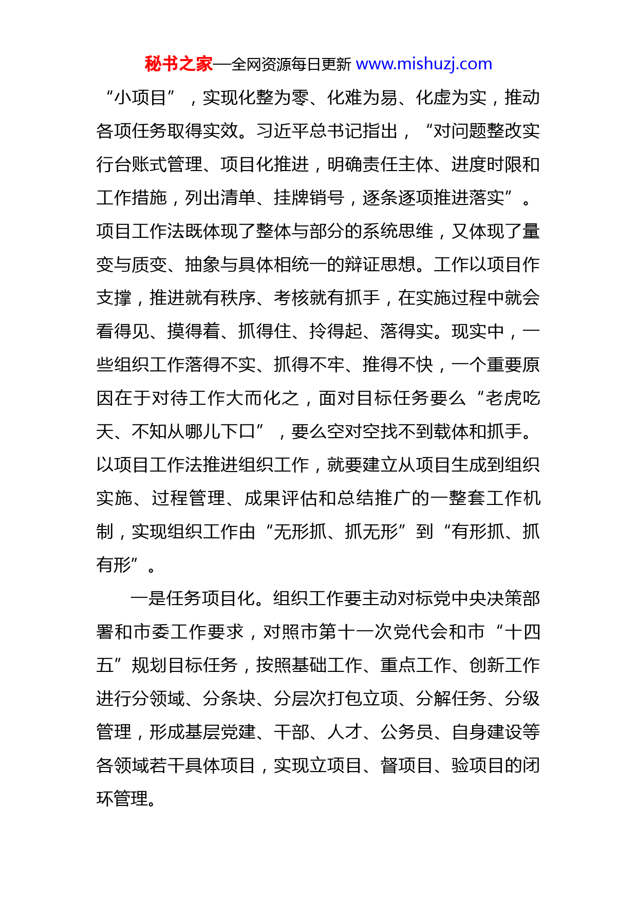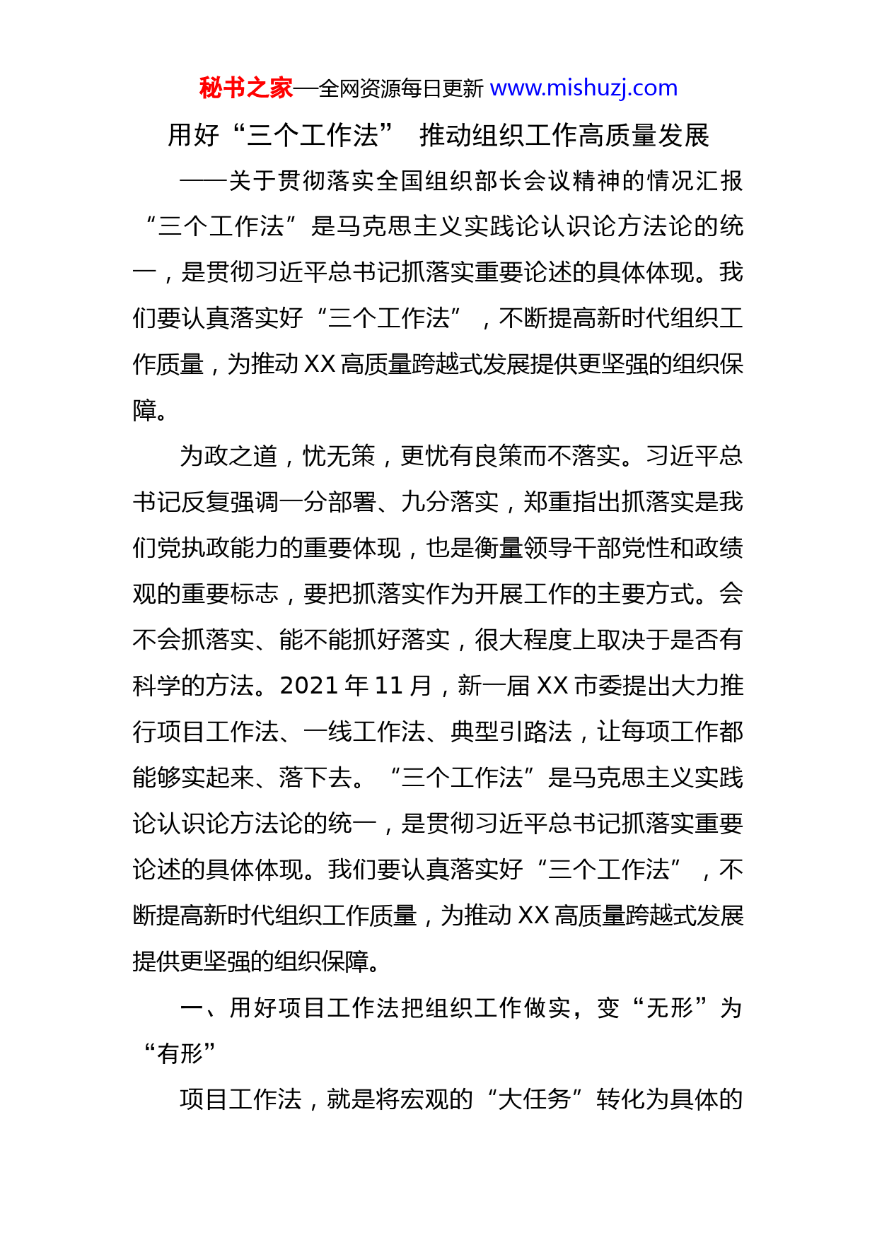 秘书之家—全网资源每日更新www.mishuzj.com用好“三个工作法”推动组织工作高质量发展——关于贯彻落实全国组织部长会议精神的情况汇报“三个工作法”是马克思主义实践论认识论方法论的统一,是贯彻习近平总书记抓落实重要论述的具体体现。我们要认真落实好“三个工作法”,不断提高新时代组织工作质量,为推动XX高质量跨越式发展提供更坚强的组织保障。为政之道,忧无策,更忧有良策而不落实。习近平总书记反复强调一分部署、九分落实,郑重指出抓落实是我们党执政能力的重要体现,也是衡量领导干部党性和政绩观的重要标志,要把抓落实作为开展工作的主要方式。会不会抓落实、能不能抓好落实,很大程度上取决于是否有科学的方法。2021年11月,新一届XX市委提出大力推行项目工作法、一线工作法、典型引路法,让每项工作都能够实起来、落下去。“三个工作法”是马克思主义实践论认识论方法论的统一,是贯彻习近平总书记抓落实重要论述的具体体现。我们要认真落实好“三个工作法”,不断提高新时代组织工作质量,为推动XX高质量跨越式发展提供更坚强的组织保障。一、用好项目工作法把组织工作做实,变“无形”为“有形”项目工作法,就是将宏观的“大任务”转化为具体的秘书之家—全网资源每日更新www.mishuzj.com“小项目”,实现化整为零、化难为易、化虚为实,推动各项任务取得实效。习近平总书记指出,“对问题整改实行台账式管理、项目化推进,明确责任主体、进度时限和工作措施,列出清单、挂牌销号,逐条逐项推进落实”。项目工作法既体现了整体与部分的系统思维,又体现了量变与质变、抽象与具体相统一的辩证思想。工作以项目作支撑,推进就有秩序、考核就有抓手,在实施过程中就会看得见、摸得着、抓得住、拎得起、落得实。现实中,一些组织工作落得不实、抓得不牢、推得不快,一个重要原因在于对待工作大而化之,面对目标任务要么“老虎吃天、不知从哪儿下口”,要么空对空找不到载体和抓手。以项目工作法推进组织工作,就要建立从项目生成到组织实施、过程管理、成果评估和总结推广的一整套工作机制,实现组织工作由“无形抓、抓无形”到“有形抓、抓有形”。一是任务项目化。组织工作要主动对标党中央决策部署和市委工作要求,对照市第十一次党代会和市“十四五”规划目标任务,按照基础工作、重点工作、创新工作进行分领域、分条块、分层次打包立项、分解任务、分级管理,形成基层党建、干部、人才、公务员、自身建设等各领域若干具体项目,实现立项目、督项目、验项目的闭环管理。秘书之家—全网资源每日更新www.mishuzj.com二是项目清单化。要将组织工作项目进一步细化、量化、实化,列出更为明确、更便于落实的清单,对各项工作全程把控、实时把控、质量把控、风险把控,实现“挂图作战”抓进度、“倒排工期”抓推进、“销号管理”抓落实。三是清单具体化。组织工作要精准、精细、精确、精致,就要对所列清单的目标成效、责任主体、时间节点、督查内容、考核奖惩等作出具体明确的要求,搞清楚“谁来做、怎么做、何时做、按什么标准做、做到什么程度、什么时候做完”等,这样才能对照清单督促不落实的事、问责不落实的人。二、用好一线工作法把组织工作做深,变“关门”为“开门”一线工作法,就是带着问题走入基层、带着思考进入实践、带着感情深入群众,摸准一线实情、发现一线问题、解决一线难题。习近平总书记强调,“要眼睛向下、脚步向下,经常扑下身子、沉到一线,近的远的都要去,好的差的都要看,干部群众表扬和批评都要听,真正把情况摸实摸透”。一线工作法是马克思主义实践论在抓落实中的要求,体现了一切从实际出发、实事求是的思想路线,要求我们能在现场就别在会场、能看“直播”就别看“转播”。秘书之家—全网资源每日更新www.mishuzj.com组织工作是服务党的中心工作的,组织部门是党员之家、干部之家、人才之家,不能一味高大上、闭门不出端坐朝堂、遥控指挥,只有身在一线、心到一线,才能真正办实事、解难题。以一线工作法推进组织工作,就是要沉下去调研、静下来思考,在一线作决策、解难题、促发展。一是干部队伍在一线锻造。要在一线考察识别干部,把办公室搬到重大项目建设一线,搬到产业培育、招商引资、乡村振兴、强边固防、营商环境建设的一线,常态化开展蹲点调研,在一线发现好干部、树立好导向、形成好气象。要在一线培养锻炼干部,选派优秀干部到改革开放最前沿、服务群众第一线、经济发展主战场、强边固防最末梢,深化开展优秀年轻干部交流任职、挂职,锻造一大批能领导现代化建设的年轻干部、少数民族干部、专业干部,锻造一大批“拓荒牛”“孺子牛”“老黄牛”式的干部,引导广大干部在一线落实决策部署、解决问题矛盾、锤炼能力作风、检验工作成效。二是组织基础在一线夯实。要深入一线健全组织体系、提升组织力,不断提高基层党组织的政治领导力、思想引领力、群众凝聚力、社会号召力、发展推动力,切实把各领域基层党组织建成服务经济社会发展的一线战斗堡垒,把党的政治优势、组织优势、群众优势转化为推进高秘书之家—全网资源每日更新www.mishuzj.com质量发展的工作优势。要