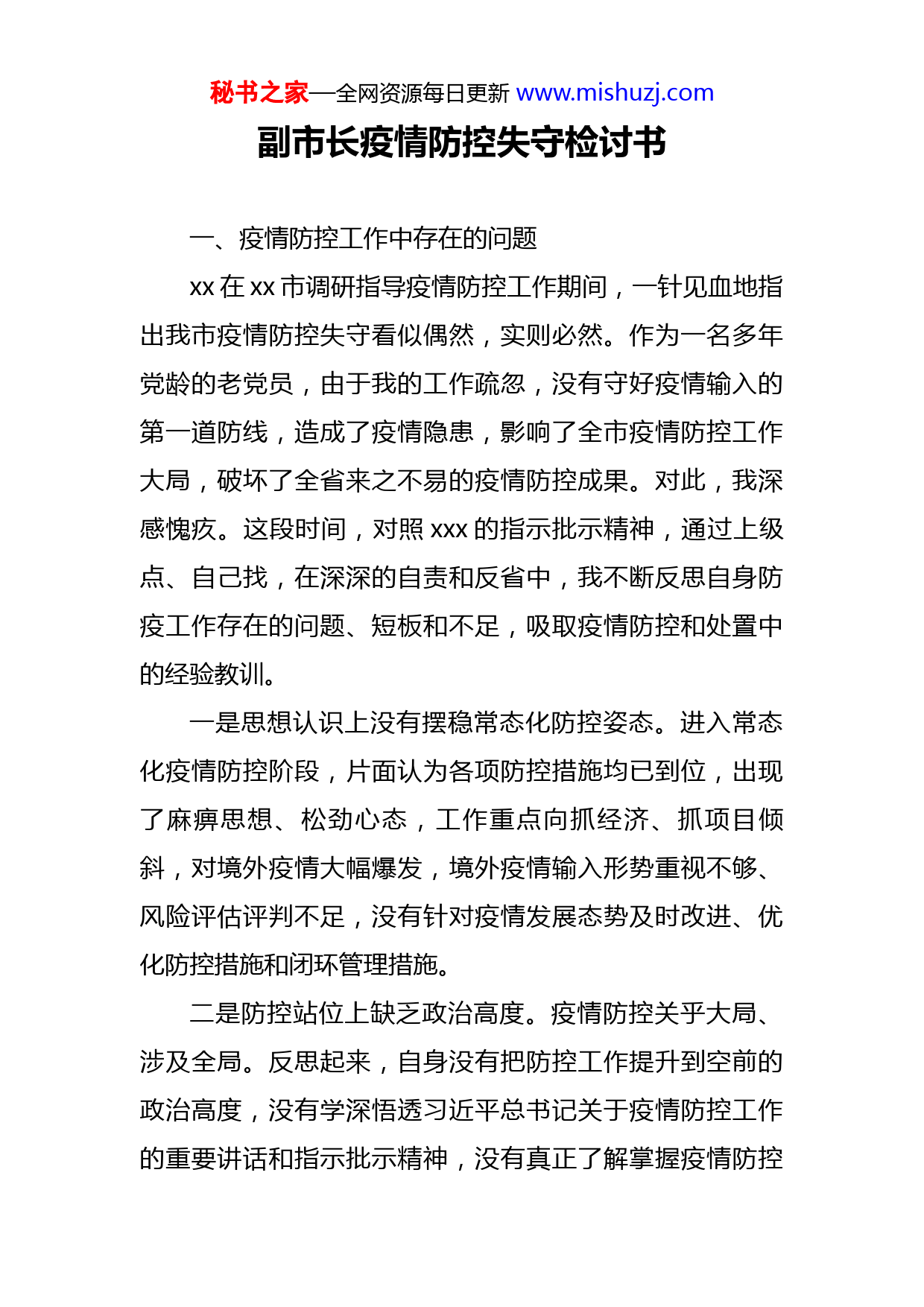 秘书之家—全网资源每日更新www.mishuzj.com副市长疫情防控失守检讨书一、疫情防控工作中存在的问题xx在xx市调研指导疫情防控工作期间,一针见血地指出我市疫情防控失守看似偶然,实则必然。作为一名多年党龄的老党员,由于我的工作疏忽,没有守好疫情输入的第一道防线,造成了疫情隐患,影响了全市疫情防控工作大局,破坏了全省来之不易的疫情防控成果。对此,我深感愧疚。这段时间,对照xxx的指示批示精神,通过上级点、自己找,在深深的自责和反省中,我不断反思自身防疫工作存在的问题、短板和不足,吸取疫情防控和处置中的经验教训。一是思想认识上没有摆稳常态化防控姿态。进入常态化疫情防控阶段,片面认为各项防控措施均已到位,出现了麻痹思想、松劲心态,工作重点向抓经济、抓项目倾斜,对境外疫情大幅爆发,境外疫情输入形势重视不够、风险评估评判不足,没有针对疫情发展态势及时改进、优化防控措施和闭环管理措施。二是防控站位上缺乏政治高度。疫情防控关乎大局、涉及全局。反思起来,自身没有把防控工作提升到空前的政治高度,没有学深悟透习近平总书记关于疫情防控工作的重要讲话和指示批示精神,没有真正了解掌握疫情防控秘书之家—全网资源每日更新www.mishuzj.com工作方案、预案和处置流程,通常是与职责联系紧密的学的多,联系少的学的少,在安排部署疫情防控工作中缺乏理论指导。三是责任压实上传导力度不到位。在压力传导上,责任链条没有形成闭环。对分管部门的宣传教育、引导要求也不到位,疫情暴发前除一线工作人员多数人都已不佩戴口罩,各部门单位、系统内人员日常监测工作也有所弱化。二、对此次疫情的认识及下一步整改方向疫情既是一次“兵临城下”的危机,也是一次压力重重的考验。受疫情的影响和冲击,全市经济一度处于停摆状态,城市对外形象严重受损,“疫区”标签刺激着每一个xxx人的“神经”。深刻反思汲取教训,此次疫情失守归根结底就是我们没能扛起政治责任,工作失职、履职不力,没有守好疫情输入的第一道防线。失守在于我们思想松懈,产生了麻痹思想、侥幸心理和松劲心态;失守在于管控方面存在诸多漏洞,片面注重“人传人”的渠道防控,没有注重和加强“物传人”和“环境传人”的监测管控;失守在于“四方”责任没有压实,缺乏对部门的统筹协调,属地监管。疫情防控工作是一次全方位的检验,让我们看到了通常状态下看不到的一面,各个领域的问题得到了全面的暴秘书之家—全网资源每日更新www.mishuzj.com露,这既是警醒,也是要求。当前,境外新冠肺炎疫情持续攀高,国内多地相继出现本土确诊病例,疫情防控形势依然严竣复杂。下一步,我将在认真检讨、扎实整改的基础上,进一步坚定防疫决心、体现务实作风、抓实抓细各项防控措施,实现精准防控、科学防控。一是切实提高政治站位,深入学习贯彻习近平总书记重要指示精神,全面落实中央、xx省关于疫情防控各项工作部署,加强政策文件精神研究,认真研究学习疫情防控各项工作方案,切实提升疫情防控的针对性,推动疫情防控各项措施落实落细。二是全面压紧压实疫情防控“四方”责任,进一步加大对部门协调力度,保持与驻在部门勤沟通、常联系,奔着一线去、奔着问题去,坚持斗争精神和碰硬态度,切实构筑起阻击疫情输入的“铜墙铁壁”。三是统筹推进经济社会发展。在毫不松懈细化人物环境同防同控各项举措的同时,扎实做好“六稳”工作,落实“六保”任务。总之,这次疫情失守,给全省防控大局带来了十分不利的影响,我将虚心诚恳地接受组织处理。