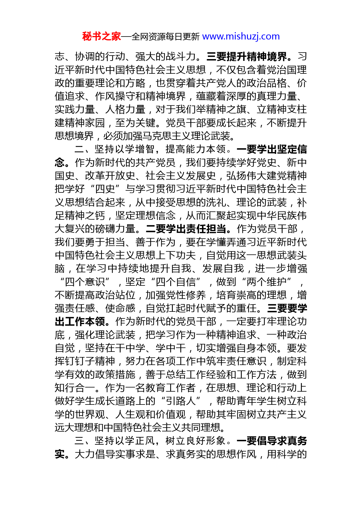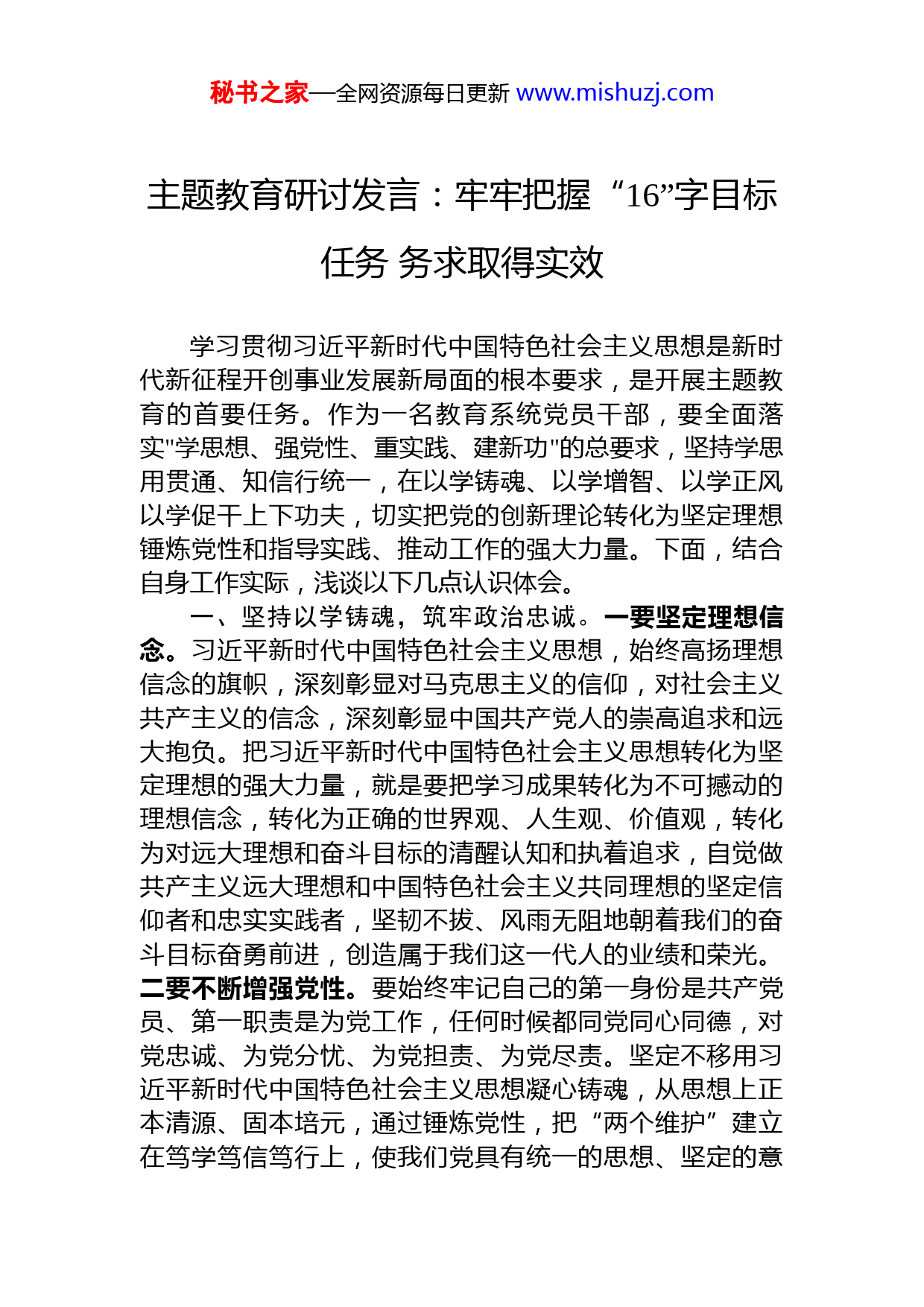 秘书之家—全网资源每日更新www.mishuzj.com主题教育研讨发言:牢牢把握“16”字目标任务务求取得实效学习贯彻习近平新时代中国特色社会主义思想是新时代新征程开创事业发展新局面的根本要求,是开展主题教育的首要任务。作为一名教育系统党员干部,要全面落实"学思想、强党性、重实践、建新功"的总要求,坚持学思用贯通、知信行统一,在以学铸魂、以学增智、以学正风以学促干上下功夫,切实把党的创新理论转化为坚定理想锤炼党性和指导实践、推动工作的强大力量。下面,结合自身工作实际,浅谈以下几点认识体会。一、坚持以学铸魂,筑牢政治忠诚。一要坚定理想信念。习近平新时代中国特色社会主义思想,始终高扬理想信念的旗帜,深刻彰显对马克思主义的信仰,对社会主义共产主义的信念,深刻彰显中国共产党人的崇高追求和远大抱负。把习近平新时代中国特色社会主义思想转化为坚定理想的强大力量,就是要把学习成果转化为不可撼动的理想信念,转化为正确的世界观、人生观、价值观,转化为对远大理想和奋斗目标的清醒认知和执着追求,自觉做共产主义远大理想和中国特色社会主义共同理想的坚定信仰者和忠实实践者,坚韧不拔、风雨无阻地朝着我们的奋斗目标奋勇前进,创造属于我们这一代人的业绩和荣光。二要不断增强党性。要始终牢记自己的第一身份是共产党员、第一职责是为党工作,任何时候都同党同心同德,对党忠诚、为党分忧、为党担责、为党尽责。坚定不移用习近平新时代中国特色社会主义思想凝心铸魂,从思想上正本清源、固本培元,通过锤炼党性,把“两个维护”建立在笃学笃信笃行上,使我们党具有统一的思想、坚定的意秘书之家—全网资源每日更新www.mishuzj.com志、协调的行动、强大的战斗力。三要提升精神境界。习近平新时代中国特色社会主义思想,不仅包含着党治国理政的重要理论和方略,也贯穿着共产党人的政治品格、价值追求、作风操守和精神境界,蕴藏着深厚的真理力量、实践力量、人格力量,对于我们举精神之旗、立精神支柱建精神家园,至为关键。党员干部要成长起来,不断提升思想境界,必须加强马克思主义理论武装。二、坚持以学增智,提高能力本领。一要学出坚定信念。作为新时代的共产党员,我们要持续学好党史、新中国史、改革开放史、社会主义发展史,弘扬伟大建党精神把学好“四史”与学习贯彻习近平新时代中国特色社会主义思想结合起来,从中接受思想的洗礼、理论的武装,补足精神之钙,坚定理想信念,从而汇聚起实现中华民族伟大复兴的磅礴力量。二要学出责任担当。作为党员干部,我们要勇于担当、善于作为,要在学懂弄通习近平新时代中国特色社会主义思想上下功夫,自觉用这一思想武装头脑,在学习中持续地提升自我、发展自我,进一步增强“四个意识”,坚定“四个自信”,做到“两个维护”,不断提高政治站位,加强党性修养,培育崇高的理想,增强责任感、使命感,自觉扛起时代赋予的重任。三要要学出工作本领。作为新时代的党员干部,一定要打牢理论功底,强化理论武装,把学习作为一种精神追求、一种政治自觉,坚持在干中学、学中干,切实增强自身本领。要发挥钉钉子精神,努力在各项工作中筑牢责任意识,制定科学有效的政策措施,善于总结工作经验和工作方法,做到知行合一。作为一名教育工作者,在思想、理论和行动上做好学生成长道路上的“引路人”,帮助青年学生树立科学的世界观、人生观和价值观,帮助其牢固树立共产主义远大理想和中国特色社会主义共同理想。三、坚持以学正风,树立良好形象。一要倡导求真务实。大力倡导实事求是、求真务实的思想作风,用科学的秘书之家—全网资源每日更新www.mishuzj.com精神研究新情况、解决新问题,不断增强“求真”的坚定性和“务实”的自觉性。把理论学习与具体工作相结合,深化学习效果。在学理论、转观念、理思路、抓落实上下功夫,把学习的成果转化为政治素质的提高,坚决贯彻党的各项方针政策,牢牢把握正确发展方向;转化为思想水平的提高,更加准确地理解把握党和国家大政方针、决策部署,进一步增强贯彻执行的自觉性;转化为做好本职工作、提升工作水平的能力,努力成为本领域、本专业的行家里手。二要勇于攻坚克难。大力倡导奋发有为、真抓实干的工作作风,坚持边学习、边调研、边工作、边总结。增强责任意识,勇于改革创新,敢作敢为、善做善成,反对一切推诿扯皮、敷衍塞责、马虎了事等不良行为。要始终保持昂扬向上的精神状态,不断强化担当意识,坚持高标准工作,自觉认领工作重点难点,积极探索解决途径,认真负责地推进工作,通过坚持不懈地努力,克服瓶颈障碍,打通堵点,提升工作质效。三要弘扬优良作风。中国共产党百年来领导全国各族人民取得的辉煌成就,既是物质成就积累的攀升过程,更是坚持共产主义理想、赓续革命精神的闪耀历程。党的光荣传统、优良作风是在百年奋斗历程中积淀的宝贵精神财富,是党百年辉煌成就的红色基因密码。新格局下,我们依然要守好“传家宝”,在时代的风云变幻中,永葆共产党员本色,把党的光荣传统、优良作风代代传承下去。四、坚持以学促干,加快推动发展。一要突出担当作为。要心怀“国之大者”“省之要者”,以政治家和教育家的高标