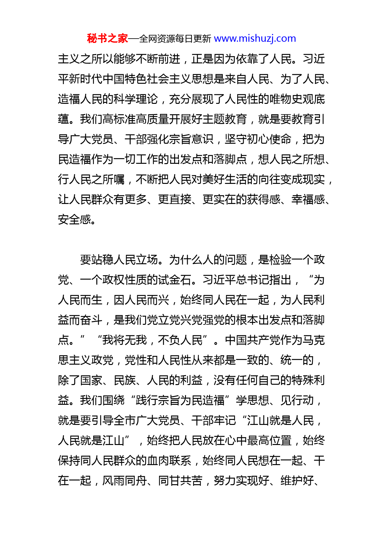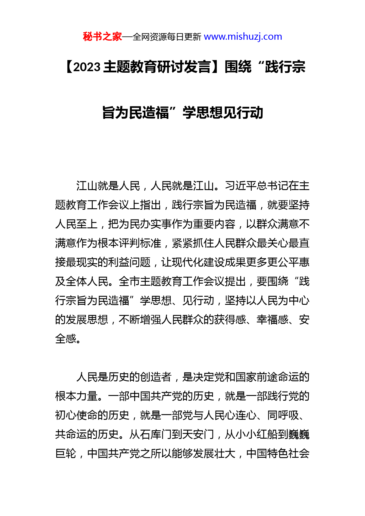 秘书之家—全网资源每日更新www.mishuzj.com【2023主题教育研讨发言】围绕“践行宗旨为民造福”学思想见行动江山就是人民,人民就是江山。习近平总书记在主题教育工作会议上指出,践行宗旨为民造福,就要坚持人民至上,把为民办实事作为重要内容,以群众满意不满意作为根本评判标准,紧紧抓住人民群众最关心最直接最现实的利益问题,让现代化建设成果更多更公平惠及全体人民。全市主题教育工作会议提出,要围绕“践行宗旨为民造福”学思想、见行动,坚持以人民为中心的发展思想,不断增强人民群众的获得感、幸福感、安全感。人民是历史的创造者,是决定党和国家前途命运的根本力量。一部中国共产党的历史,就是一部践行党的初心使命的历史,就是一部党与人民心连心、同呼吸、共命运的历史。从石库门到天安门,从小小红船到巍巍巨轮,中国共产党之所以能够发展壮大,中国特色社会秘书之家—全网资源每日更新www.mishuzj.com主义之所以能够不断前进,正是因为依靠了人民。习近平新时代中国特色社会主义思想是来自人民、为了人民、造福人民的科学理论,充分展现了人民性的唯物史观底蕴。我们高标准高质量开展好主题教育,就是要教育引导广大党员、干部强化宗旨意识,坚守初心使命,把为民造福作为一切工作的出发点和落脚点,想人民之所想、行人民之所嘱,不断把人民对美好生活的向往变成现实,让人民群众有更多、更直接、更实在的获得感、幸福感、安全感。要站稳人民立场。为什么人的问题,是检验一个政党、一个政权性质的试金石。习近平总书记指出,“为人民而生,因人民而兴,始终同人民在一起,为人民利益而奋斗,是我们党立党兴党强党的根本出发点和落脚点。”“我将无我,不负人民”。中国共产党作为马克思主义政党,党性和人民性从来都是一致的、统一的,除了国家、民族、人民的利益,没有任何自己的特殊利益。我们围绕“践行宗旨为民造福”学思想、见行动,就是要引导全市广大党员、干部牢记“江山就是人民,人民就是江山”,始终把人民放在心中最高位置,始终保持同人民群众的血肉联系,始终同人民想在一起、干在一起,风雨同舟、同甘共苦,努力实现好、维护好、秘书之家—全网资源每日更新www.mishuzj.com发展好最广大人民根本利益,以实际行动赢得人民信任、得到人民支持。要自觉站在群众的立场看问题、想事情、作决策,在感情上紧贴群众心,在行动上紧靠群众利,把群众满意不满意作为评判工作的根本标准,“把屁股端端地坐在老百姓的这一面”。要走好群众路线。群众路线是我们党的生命线和根本工作路线,是我们党永葆青春活力和战斗力的重要传家宝。习近平总书记强调,“不论过去、现在和将来,我们都要坚持一切为了群众,一切依靠群众,从群众中来,到群众中去,把党的正确主张变为群众的自觉行动,把群众路线贯彻到治国理政全部活动之中。”“一切为民者,则民向往之”。历史经验反复证明,什么时候党的群众路线贯彻得好、执行得好,党和国家事业就顺利发展;什么时候党的群众路线贯彻不力、执行不力,党和国家的事业就会受到损害。我们围绕“践行宗旨为民造福”学思想、见行动,就是要引导全市广大党员、干部走好新时代党的群众路线,大兴调查研究之风,真诚倾听群众呼声、真实反映群众愿望、真情关心群众疾苦。要充分运用好“XX即办”、12345政务热线等渠道,让群众的意见诉求反映更加便捷、回应更加迅速、解决更加及时有效,引导广大市民群众以主人翁的责任感使秘书之家—全网资源每日更新www.mishuzj.com命感积极投身城市建设、参与城市治理,共建共享美好城市幸福家园。要增进民生福祉。民生无小事,枝叶总关情。习近平总书记强调,“保障和改善民生没有终点,只有连续不断的新起点,要采取针对性更强、覆盖面更大、作用更直接、效果更明显的举措,实实在在帮群众解难题、为群众增福祉、让群众享公平。”“民之所盼,政之所向。”办好人民群众牵肠挂肚的民生大事,做好人民群众天天有感的关键小事,人民群众的日子就会越过越有盼头、越来越有甜头。我们围绕“践行宗旨为民造福”学思想、见行动,就是要引导全市广大党员、干部紧紧抓住人民群众最关心最直接最现实的利益问题,深化“我为群众办实事”实践活动,高质量办好市办民生实事,持续优化教育、医疗、文化、体育、养老等公共服务供给,一步一个脚印把惠民生的事办实、暖民心的事办细、顺民意的事办好。要深入开展城市更新和城市建设行动,加快推进交通基础设施建设、旧城旧村改造、公园城市建设等十大领域攻坚任务,确保各项工程早日建成投入使用,努力让现代化建设成果更多更公平惠及全体市民。没有一种根基,比扎根于人民更坚实;没有一种力秘书之家—全网资源每日更新www.mishuzj.com量,比从群众中汲取更强大。只要我们站稳人民立场,强化宗旨意识,坚守初心使命,永远保持对人民的赤子之心,充分激发蕴藏在人民群众中的创造伟力,始终同人民同呼吸、共命运、心连心,就一定能团结带领人民创造更美好、更幸福的生活,在新的赶考之路上交出一份新的优异答卷!