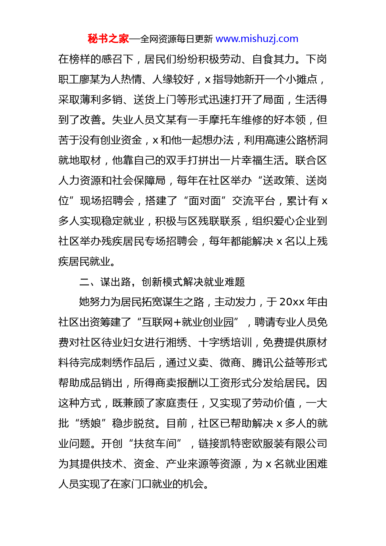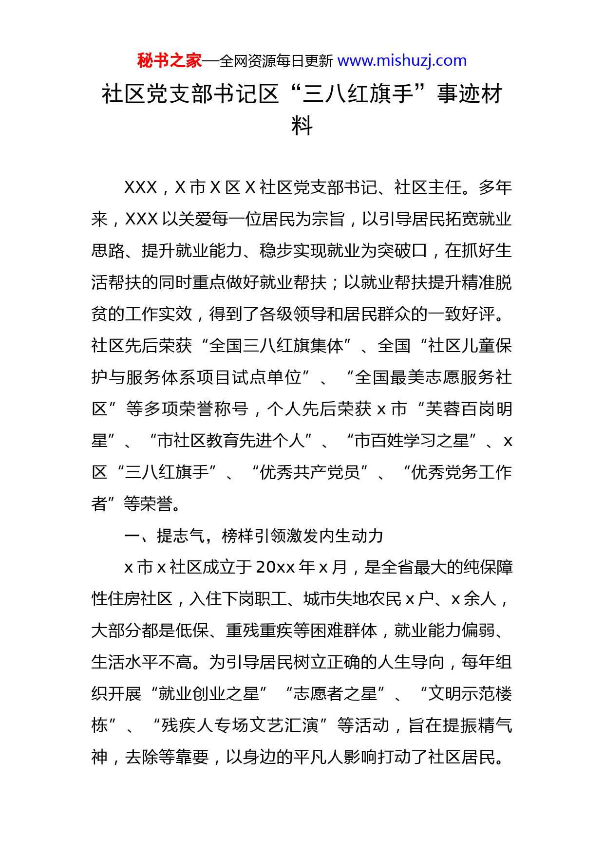 秘书之家—全网资源每日更新www.mishuzj.com社区党支部书记区“三八红旗手”事迹材料XXX,X市X区X社区党支部书记、社区主任。多年来,XXX以关爱每一位居民为宗旨,以引导居民拓宽就业思路、提升就业能力、稳步实现就业为突破口,在抓好生活帮扶的同时重点做好就业帮扶;以就业帮扶提升精准脱贫的工作实效,得到了各级领导和居民群众的一致好评。社区先后荣获“全国三八红旗集体”、全国“社区儿童保护与服务体系项目试点单位”、“全国最美志愿服务社区”等多项荣誉称号,个人先后荣获x市“芙蓉百岗明星”、“市社区教育先进个人”、“市百姓学习之星”、x区“三八红旗手”、“优秀共产党员”、“优秀党务工作者”等荣誉。一、提志气,榜样引领激发内生动力x市x社区成立于20xx年x月,是全省最大的纯保障性住房社区,入住下岗职工、城市失地农民x户、x余人,大部分都是低保、重残重疾等困难群体,就业能力偏弱、生活水平不高。为引导居民树立正确的人生导向,每年组织开展“就业创业之星”“志愿者之星”、“文明示范楼栋”、“残疾人专场文艺汇演”等活动,旨在提振精气神,去除等靠要,以身边的平凡人影响打动了社区居民。秘书之家—全网资源每日更新www.mishuzj.com在榜样的感召下,居民们纷纷积极劳动、自食其力。下岗职工廖某为人热情、人缘较好,x指导她新开一个小摊点,采取薄利多销、送货上门等形式迅速打开了局面,生活得到了改善。失业人员文某有一手摩托车维修的好本领,但苦于没有创业资金,x和他一起想办法,利用高速公路桥洞就地取材,他靠自己的双手打拼出一片幸福生活。联合区人力资源和社会保障局,每年在社区举办“送政策、送岗位”现场招聘会,搭建了“面对面”交流平台,累计有x多人实现稳定就业,积极与区残联联系,组织爱心企业到社区举办残疾居民专场招聘会,每年都能解决x名以上残疾居民就业。二、谋出路,创新模式解决就业难题她努力为居民拓宽谋生之路,主动发力,于20xx年由社区出资筹建了“互联网+就业创业园”,聘请专业人员免费对社区待业妇女进行湘绣、十字绣培训,免费提供原材料待完成刺绣作品后,通过义卖、微商、腾讯公益等形式帮助成品销出,所得商卖报酬以工资形式分发给居民。因这种方式,既兼顾了家庭责任,又实现了劳动价值,一大批“绣娘”稳步脱贫。目前,社区已帮助解决x多人的就业问题。开创“扶贫车间”,链接凯特密欧服装有限公司为其提供技术、资金、产业来源等资源,为x名就业困难人员实现了在家门口就业的机会。秘书之家—全网资源每日更新www.mishuzj.com三、聚合力,贴心服务打造幸福高地为解决社区上班族的后顾之忧,x积极推进社会服务,为居民提供细致入微的人文关怀。为健全老人平常生活,社区开设博爱超市、积极争取临时帮扶资金、建立了完善的健康档案、定期上门体检、建立居家养老服务信息平台、引导老年人邻里互助。为丰富老人业余生活,开展“幸福来敲门”、“喜尝百家宴、细品邻里情”等活动,组建了腰鼓队、戏迷会等自娱自乐组织。为解决上班族子女放学后的管理空档,组建了“四点半”学校,累计无偿服务x多名小孩,真正实现了“家长放心、孩子开心、社区省心”。同时引进专业社工机构开展购买服务,由社会机构、专业社工上门心理疏导、个性化设计活动,并自己考取国家三级心理咨询师、助理社会工作师,鼓励工作人员考证积极打造学习型社区,提供更为专业的服务,得到了居民的一致好评。