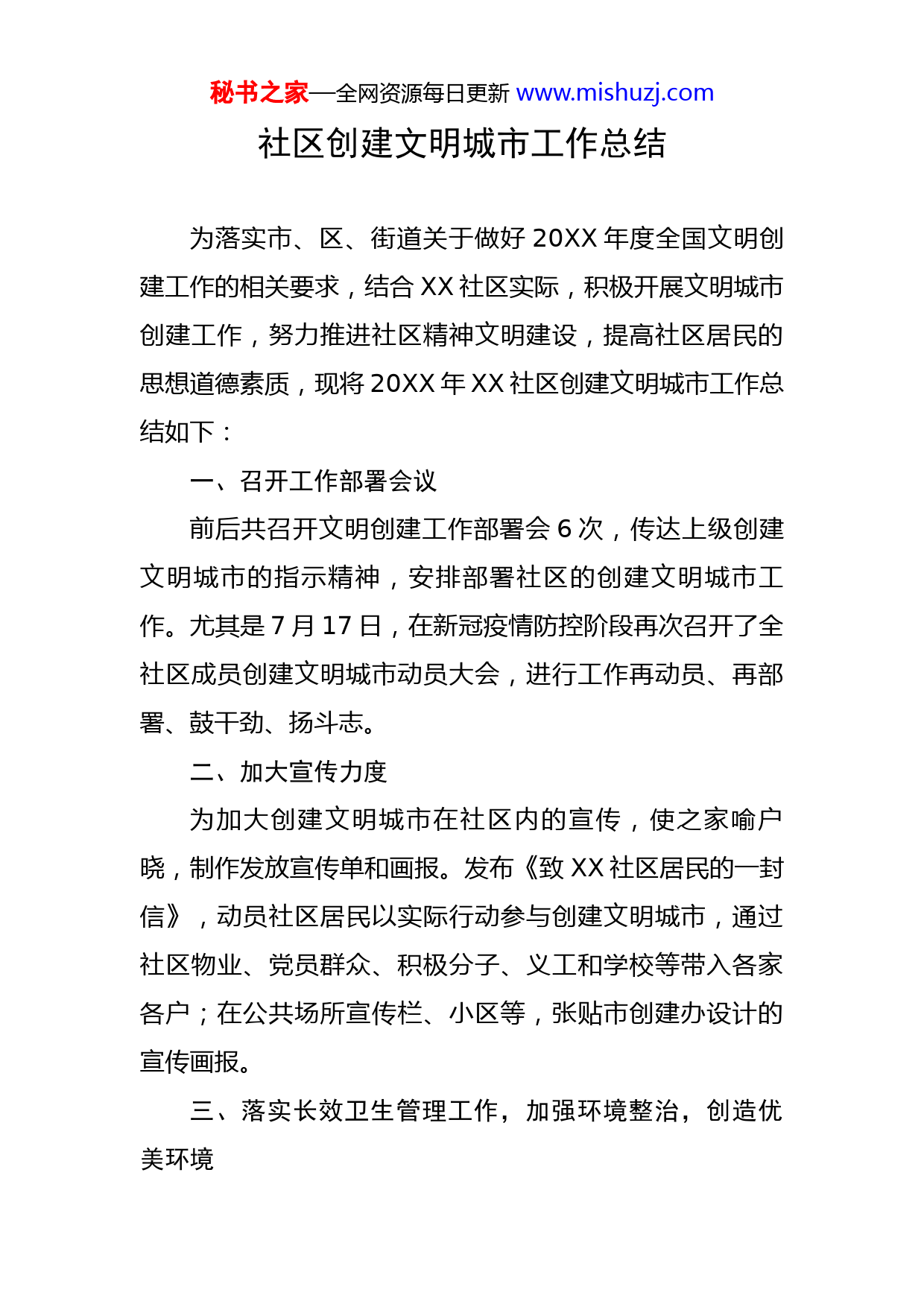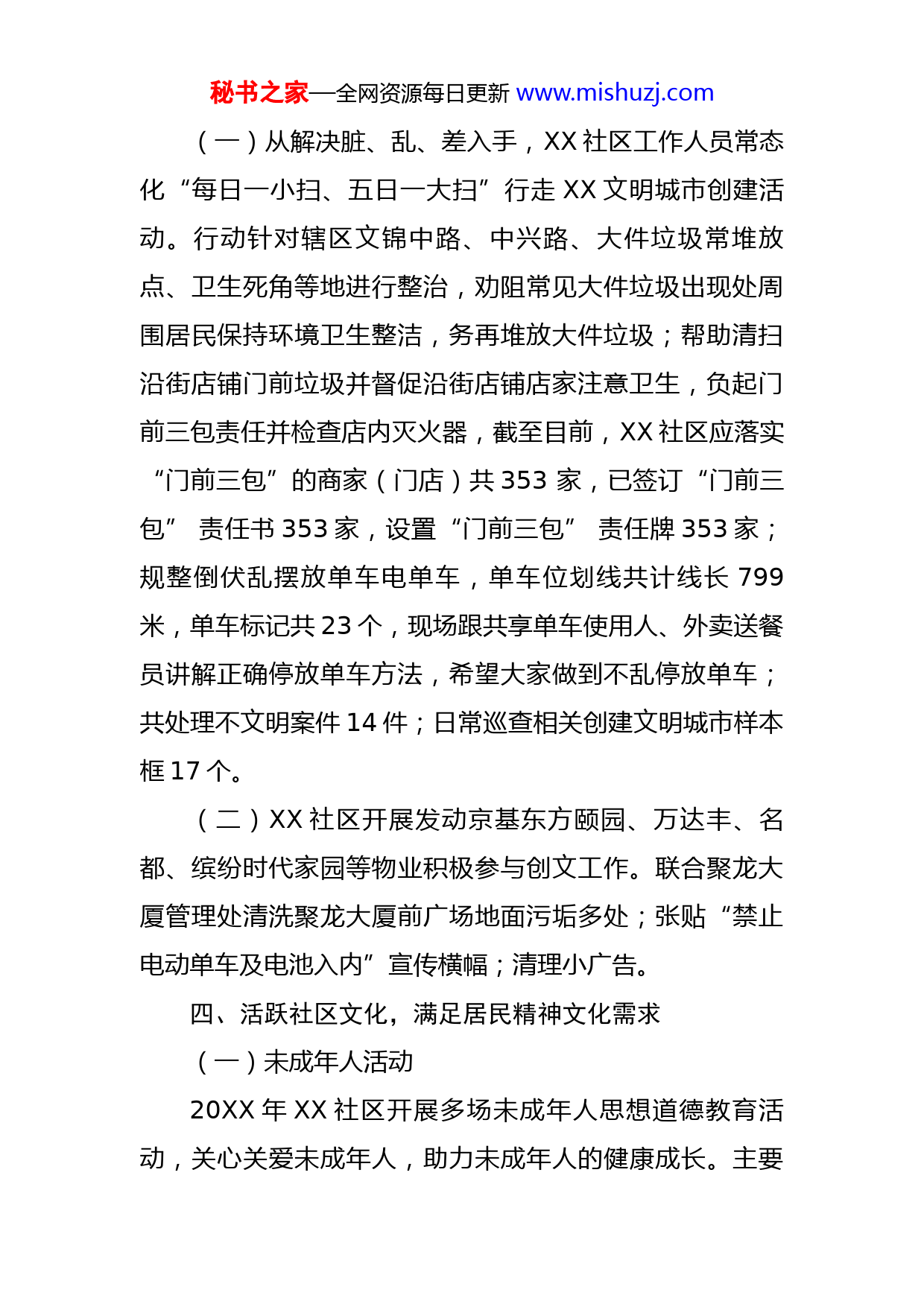 秘书之家—全网资源每日更新www.mishuzj.com社区创建文明城市工作总结为落实市、区、街道关于做好20XX年度全国文明创建工作的相关要求,结合XX社区实际,积极开展文明城市创建工作,努力推进社区精神文明建设,提高社区居民的思想道德素质,现将20XX年XX社区创建文明城市工作总结如下:一、召开工作部署会议前后共召开文明创建工作部署会6次,传达上级创建文明城市的指示精神,安排部署社区的创建文明城市工作。尤其是7月17日,在新冠疫情防控阶段再次召开了全社区成员创建文明城市动员大会,进行工作再动员、再部署、鼓干劲、扬斗志。二、加大宣传力度为加大创建文明城市在社区内的宣传,使之家喻户晓,制作发放宣传单和画报。发布《致XX社区居民的一封信》,动员社区居民以实际行动参与创建文明城市,通过社区物业、党员群众、积极分子、义工和学校等带入各家各户;在公共场所宣传栏、小区等,张贴市创建办设计的宣传画报。三、落实长效卫生管理工作,加强环境整治,创造优美环境秘书之家—全网资源每日更新www.mishuzj.com(一)从解决脏、乱、差入手,XX社区工作人员常态化“每日一小扫、五日一大扫”行走XX文明城市创建活动。行动针对辖区文锦中路、中兴路、大件垃圾常堆放点、卫生死角等地进行整治,劝阻常见大件垃圾出现处周围居民保持环境卫生整洁,务再堆放大件垃圾;帮助清扫沿街店铺门前垃圾并督促沿街店铺店家注意卫生,负起门前三包责任并检查店内灭火器,截至目前,XX社区应落实“门前三包”的商家(门店)共353家,已签订“门前三包”责任书353家,设置“门前三包”责任牌353家;规整倒伏乱摆放单车电单车,单车位划线共计线长799米,单车标记共23个,现场跟共享单车使用人、外卖送餐员讲解正确停放单车方法,希望大家做到不乱停放单车;共处理不文明案件14件;日常巡查相关创建文明城市样本框17个。(二)XX社区开展发动京基东方颐园、万达丰、名都、缤纷时代家园等物业积极参与创文工作。联合聚龙大厦管理处清洗聚龙大厦前广场地面污垢多处;张贴“禁止电动单车及电池入内”宣传横幅;清理小广告。四、活跃社区文化,满足居民精神文化需求(一)未成年人活动20XX年XX社区开展多场未成年人思想道德教育活动,关心关爱未成年人,助力未成年人的健康成长。主要秘书之家—全网资源每日更新www.mishuzj.com包括以下:1.通过开展四点半课堂常规服务促进社区儿童对社区公共空间的认识和融入;2.通过与深圳市守望心智障碍者家长协会开展真人图书馆无障碍倡导活动,促进社区居民对不同群体的了解,营造和谐、平等的社区氛围;3.通过开展“关爱心灵,为梦护航”儿童青少年心理健康服务项目,聚焦疫情下儿童青少年的心理健康;4.联合广州顺德启创多元梦想课堂项目组及深圳市元梦公益基金会开展了XX社区职业探索系列活动,主要服务对象为社区流动儿童,本系列活动以儿童的视角来探索社区,发现社区特色,让儿童在团体合作中更多地表达、沟通、分享,增进儿童对社区人文的了解,增进其社区参与,以实际行动回馈社区,营造良好的社区邻里关系;5.开展了XX社区“学党史·筑梦·成长”儿童青少年暑期夏令营,以多元方式增进儿童对党史的了解及对自我的认识:6.开展了困境儿童政策宣传活动1场,未成年人保护线上系列活动2场,包含《未成年人保护法》知识问答及宣传标语征集,困境儿童咨询性个案1个,特殊儿童咨询性个案2个,辅导性个案1个;7.将儿童青少年志愿者服务与党史学习教育相结合,开秘书之家—全网资源每日更新www.mishuzj.com展包括“传承红色基因,弘扬雷锋精神”学雷锋志愿行动,社区探访行动及“少年心向党,共筑未来梦”XX社区儿童青少年志愿者系列活动。(二)家长学校XX社区以社区家长学校为阵地,开展家庭教育相关的活动,提升家长的亲职教育能力,促进家庭和谐。主要包含以下:1.运用历奇辅导的手法开展亲子历奇小组,增进亲子间的关系;2.面向社区学龄前幼儿及家庭开展了“睦邻同乐”家庭俱乐部系列服务,以党史学习教育为主线,将党史学习教育与幼儿感兴趣的活动形式结合,将红色精神的种子播撒在幼儿的心中,主要包括兴趣活动、传承红色基因及社区参与三大板块;兴趣活动包括蛋挞DIY、植树节手工活动;“传承红色基因”主要结合世界读书日、“五一”劳动节等节日,开展主题活动,包括观看红色电影、经典红色绘本及主题手工的方式,增进幼儿及家长对于党史的了解。社区参与主要动员社区家庭共同参与社区公共事务,目前开展了迷你花架共建小组,社区家庭共建迷你花架,共同讨论如何养护,通过小小的微更新,让社区有不一样的美好,动员更多家庭参与到社区公共事务中;3.由于处于疫情常态化防控期间,个案服务及困难家庭秘书之家—全网资源每日更新www.mishuzj.com关爱也是服务的重点,跟进一对一帮扶家庭3个,咨询及探访30人次,开展了6个困境人群个案,其中1个为危机干预,1个为家暴防护。(三)社区志愿服务XX社区志愿者队在XX社区党委的引领下,围绕“社区防疫”“创文工作”“社区服务协助“三个重点开展志愿服务,新增志愿者90人,义工服务人次为1552人次,服务总时数为3413小时。20XX年3月至今,XX社区志愿者队持续开展疫苗接种志愿服务,5月底开展核酸检测志愿服务,志愿者积极参与社区疫情防控工作,持续开展