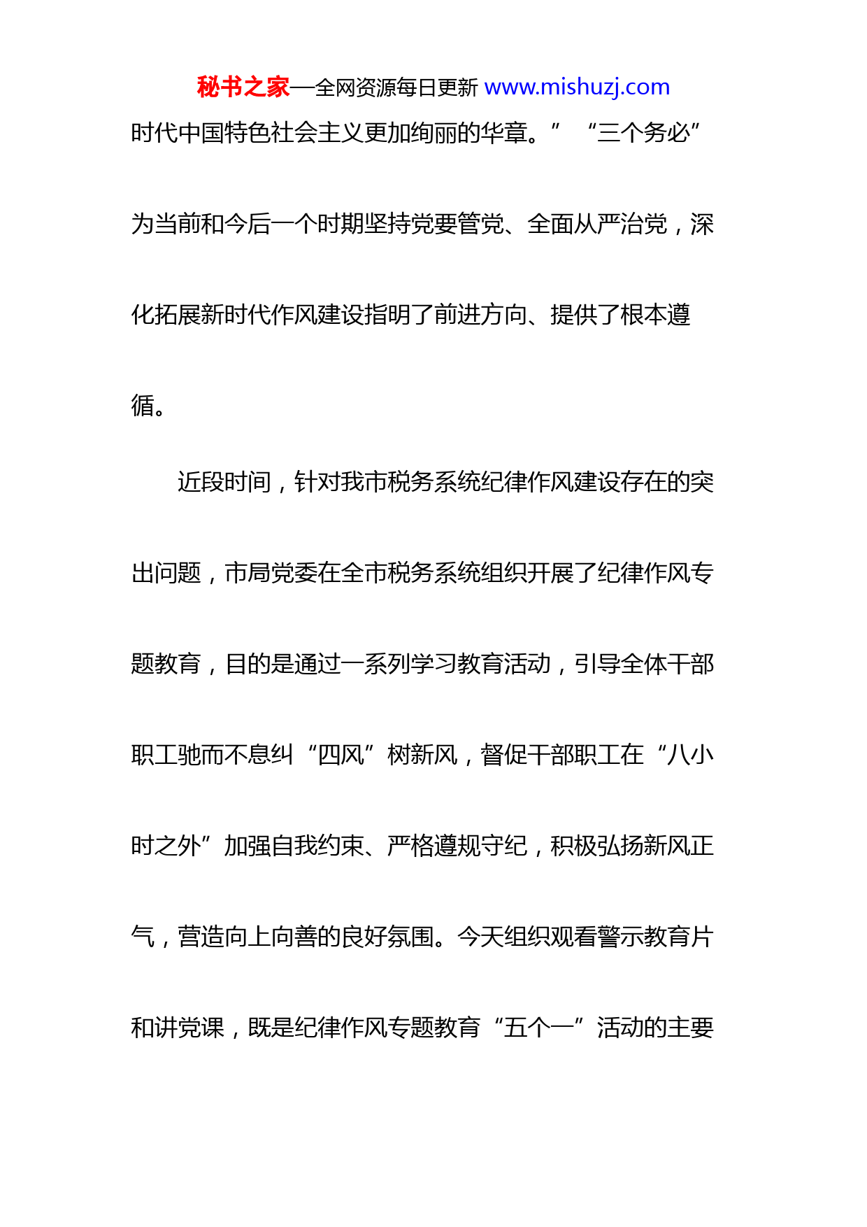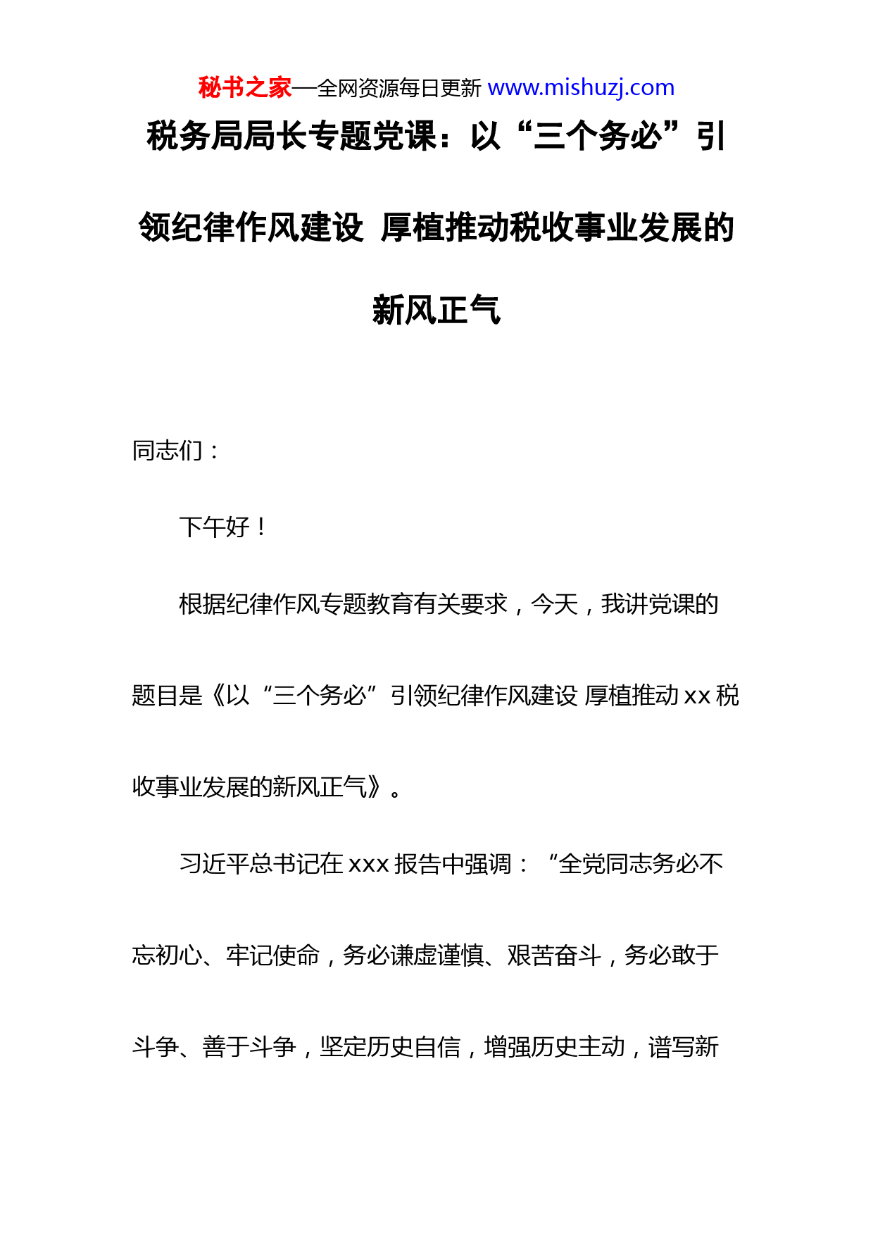 秘书之家—全网资源每日更新www.mishuzj.com税务局局长专题党课:以“三个务必”引领纪律作风建设厚植推动税收事业发展的新风正气同志们:下午好!根据纪律作风专题教育有关要求,今天,我讲党课的题目是《以“三个务必”引领纪律作风建设厚植推动xx税收事业发展的新风正气》。习近平总书记在xxx报告中强调:“全党同志务必不忘初心、牢记使命,务必谦虚谨慎、艰苦奋斗,务必敢于斗争、善于斗争,坚定历史自信,增强历史主动,谱写新秘书之家—全网资源每日更新www.mishuzj.com时代中国特色社会主义更加绚丽的华章。”“三个务必”为当前和今后一个时期坚持党要管党、全面从严治党,深化拓展新时代作风建设指明了前进方向、提供了根本遵循。近段时间,针对我市税务系统纪律作风建设存在的突出问题,市局党委在全市税务系统组织开展了纪律作风专题教育,目的是通过一系列学习教育活动,引导全体干部职工驰而不息纠“四风”树新风,督促干部职工在“八小时之外”加强自我约束、严格遵规守纪,积极弘扬新风正气,营造向上向善的良好氛围。今天组织观看警示教育片和讲党课,既是纪律作风专题教育“五个一”活动的主要秘书之家—全网资源每日更新www.mishuzj.com内容,也是一次深入学习领悟习近平总书记关于“三个务必”重要论述、推动全市税务系统纪律作风建设常态化长效化的生动实践。下面,我讲两方面内容:一、鉴往开来、聚焦关键,深刻领会“三个务必”的丰富内涵“三个务必”是我们党对所处历史方位、面临形势任务、党情国情世情发展变化进行深刻分析后作出的重大论断,我们要深入学习领会其丰富内涵。(一)“三个务必”与“两个务必”一脉相承。1949年3月,在我们党领导人民经过28年浴血奋战,即将完成以农村包围城市、最后夺取全国胜利的重要历史时刻,面秘书之家—全网资源每日更新www.mishuzj.com对掌握全国政权、领导人民建设国家新的历史任务,毛泽东同志在党的七届二中全会上向全党发出“务必使同志们继续地保持谦虚、谨慎、不骄、不躁的作风,务必使同志们继续地保持艰苦奋斗的作风”的号召。我们党执政70多年来,“两个务必”已经成为中国共产党在不同历史时期不断夺取胜利的强大精神力量和重要政治保障,成为中国共产党人代代相传的“传家宝”。在全党全国各族人民意气风发迈上全面建设社会主义现代化国家新征程、向第二个百年奋斗目标进军的关键时刻,以习近平同志为核心的党中央明确提出“三个务必”重要思想,是对全党全国各族人民奋进新征程、建功新时代的新告诫,是谱写新时代秘书之家—全网资源每日更新www.mishuzj.com中国特色社会主义更加绚丽篇章的新要求,是对“两个务必”思想的继承、创新和发展。(二)“三个务必”具有极强的现实针对性。“务必不忘初心、牢记使命”饱含中国共产党始终不变的宗旨意识,充分彰显了共产党人的根本立场。党的根基在人民、血脉在人民、力量在人民,以百姓心为心,与人民同呼吸、共命运、心连心,党的全部奋斗都是为了人民。事业越是伟大、任务越是艰巨,越要不忘初心、牢记使命,始终坚持正确的前进方向。“务必谦虚谨慎、艰苦奋斗”饱含中国共产党始终拥有的忧患意识,充分彰显了共产党人的政治自觉。全面建设社会主义现代化国家、全面推进中秘书之家—全网资源每日更新www.mishuzj.com华民族伟大复兴,关键在党。作为世界上最大的马克思主义执政党,要巩固长期执政地位,必须时刻保持解决大党独有难题的清醒和坚定,谦虚谨慎、艰苦奋斗,确保党永远不变质、不变色、不变味。“务必敢于斗争、善于斗争”饱含中国共产党始终坚持的斗争意识,充分彰显了共产党人的使命担当。世界百年未有之大变局加速演进,各种“黑天鹅”“灰犀牛”事件随时可能发生,必须坚持底线思维,发扬斗争精神,敢于斗争、善于斗争,有效应对前进道路上各种可以预料和难以预料的风险挑战,不断夺取具有许多新的历史特点的伟大斗争新胜利。秘书之家—全网资源每日更新www.mishuzj.com(三)“三个务必”是联系贯通的有机整体。“务必不忘初心、牢记使命”是根本,“务必谦虚谨慎、艰苦奋斗”是保障,“务必敢于斗争、善于斗争”是方法,三者相互作用、相辅相成,必须同向发力、同时发力。“务必不忘初心、牢记使命”,体现着马克思主义唯物史观的根本要求,体现着人民性这个马克思主义的本质属性,是对中国发展与政党建设历史经验的深刻总结,着重解决我们党为什么出发、为谁出发的问题。“务必谦虚谨慎、艰苦奋斗”,体现着马克思主义政党观的内在规律,体现着中国共产党作为马克思主义政党永葆先进性、纯洁性的时代要求,是我们党坚持自我革命、提高执政能力的永恒课秘书之家—全网资源每日更新www.mishuzj.com题。“务必敢于斗争、善于斗争”,体现着社会存在决定社会意识的原理,体现着马克思主义政党历史主动精神,是共产党人坚定斗争意志、强化历史担当,知难而进、迎难而上的必然要求。二、纠建并举、靶向施策,牢牢把握“三个务必”的实践要求习近平总书记强调,要深入开展党的优良传统和作风教育,完善作风建设长效机制,把好传统带进新征程,将好作风弘扬在新时代。要坚持全面从严、一严到底,对群众反映强烈的公款吃喝、餐饮浪