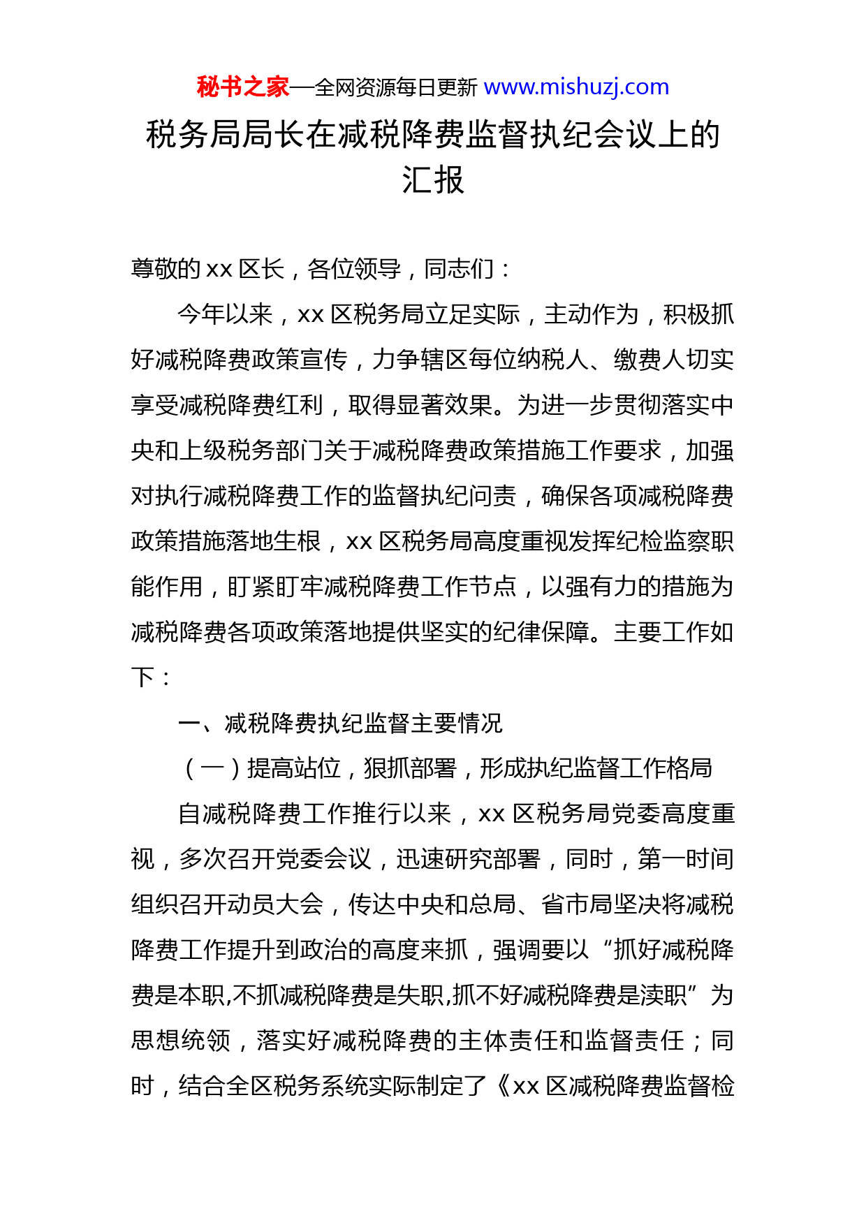 秘书之家—全网资源每日更新www.mishuzj.com税务局局长在减税降费监督执纪会议上的汇报尊敬的xx区长,各位领导,同志们:今年以来,xx区税务局立足实际,主动作为,积极抓好减税降费政策宣传,力争辖区每位纳税人、缴费人切实享受减税降费红利,取得显著效果。为进一步贯彻落实中央和上级税务部门关于减税降费政策措施工作要求,加强对执行减税降费工作的监督执纪问责,确保各项减税降费政策措施落地生根,xx区税务局高度重视发挥纪检监察职能作用,盯紧盯牢减税降费工作节点,以强有力的措施为减税降费各项政策落地提供坚实的纪律保障。主要工作如下:一、减税降费执纪监督主要情况(一)提高站位,狠抓部署,形成执纪监督工作格局自减税降费工作推行以来,xx区税务局党委高度重视,多次召开党委会议,迅速研究部署,同时,第一时间组织召开动员大会,传达中央和总局、省市局坚决将减税降费工作提升到政治的高度来抓,强调要以“抓好减税降费是本职,不抓减税降费是失职,抓不好减税降费是渎职”为思想统领,落实好减税降费的主体责任和监督责任;同时,结合全区税务系统实际制定了《xx区减税降费监督检秘书之家—全网资源每日更新www.mishuzj.com查工作方案》,重点聚焦相关职能部门特别是一线业务部门在推进减税降费过程中的服务和执法行为开展监督检查,期间,多次组织纪检部门监督部门不定期开展双向约谈,切实将监督执纪贯穿于减税降费全过程,确保各项减税降费政策的落地、落细、落实。(二)压实责任,深入走访,发挥内外执纪监督效应x月x日,我局在参加省局关于减税降费执纪监督视频会后,结合省局领导讲话精神和区局实际,迅速建立符合区局实际的督察联席机制,形成由主要领导牵头主体责任,各相关分管领导带头推进,纪检检查部门全面监督的工作格局。连日来,我局纪检组和各业务部门密切配合,将“一案双查”工作制度的优点嵌入执纪监督中,先后组织业务骨干以深入企业一线回访、电话回访、邮箱回访、网络回访相结合的进行了“减税降费”回访,重点检查税务干部在落实“减税降费”政策宣传、工作进度、组织纪律等方面是否存在违纪违规行为;回访期间,我局注重倾听纳税人、缴费人意见和建议,对于能现场解决的第一时间解决到位,无法现场解决的,登记在册并纳入执纪监督台账中,以便后续督察督办,确保减税降费的各项措施落实到位。(三)加强沟通,主动汇报,积极争取各方工作支持为进一步贯彻落实减税降费决策部署,确保“减税降秘书之家—全网资源每日更新www.mishuzj.com费”工作在xx区顺利开展。我局通过在全区各办税服务大厅一楼大厅设置投诉信箱,向纳税人、缴费人公布监督举报电话,做到内部督促与外部监督“双重”管理,做到规定动作到位,同时,创新开发减税降费小游戏,并将执纪监督电话嵌入游戏中,引导广大纳税人缴费人利用好渠道监督减税降费效果,做到自选动作有亮点。除此之外,我局以集中座谈交流、专题汇报和简讯专报等多种形式,定期主动向市局和区纪委监委汇报我局的减税降费政策落实监督检查工作方案以及在落实减税降费工作中组织领导、制度建设、政策宣传、内外培训、工作进度等情况和遇到的困难,争取市局和区纪委监委的指导支持,有效保证了减税降费政策执行不变通、不打折扣。二、存在的问题虽然我局在减税降费工作上取得较好成效,但在相应的执纪监督工作上仍存在个别问题,如减税降费执纪监督队伍专业化水平不高,新形势下减税降费工作要求高、时间紧、任务重,紧靠纪检组的人员力量难以完全监督到位;监督手段还有待进一步丰富,当前我局执纪监督大多停留在查资料和现场检查层面,难以深入发现问题。这些问题,我局将在下一步工作中认真研究,加以解决。三、下一步工作一是强化运用执纪监督“四种形态”。将践行“四种秘书之家—全网资源每日更新www.mishuzj.com形态”的模式运用到减税降费执纪监督中,进一步加强形态间相互转化,切实提高执纪监督的灵活性和有效性。二是完善减税降费执纪监督工作体制机制。探索建立对外协作联动机制,针对减税降费监督工作涉及面广的特点,建立健全政府、企业、社会三者协同监督的联动机制,增强监督合力。三是加强减税降费执纪监督人才队伍建设。定期组织开展纪律教育培训和业务工作培训,强化全体税务人员减税降费纪律意识、大局意识和政治意识,不断提升监督执纪工作水平,为减税降费政策落地保驾护航。
