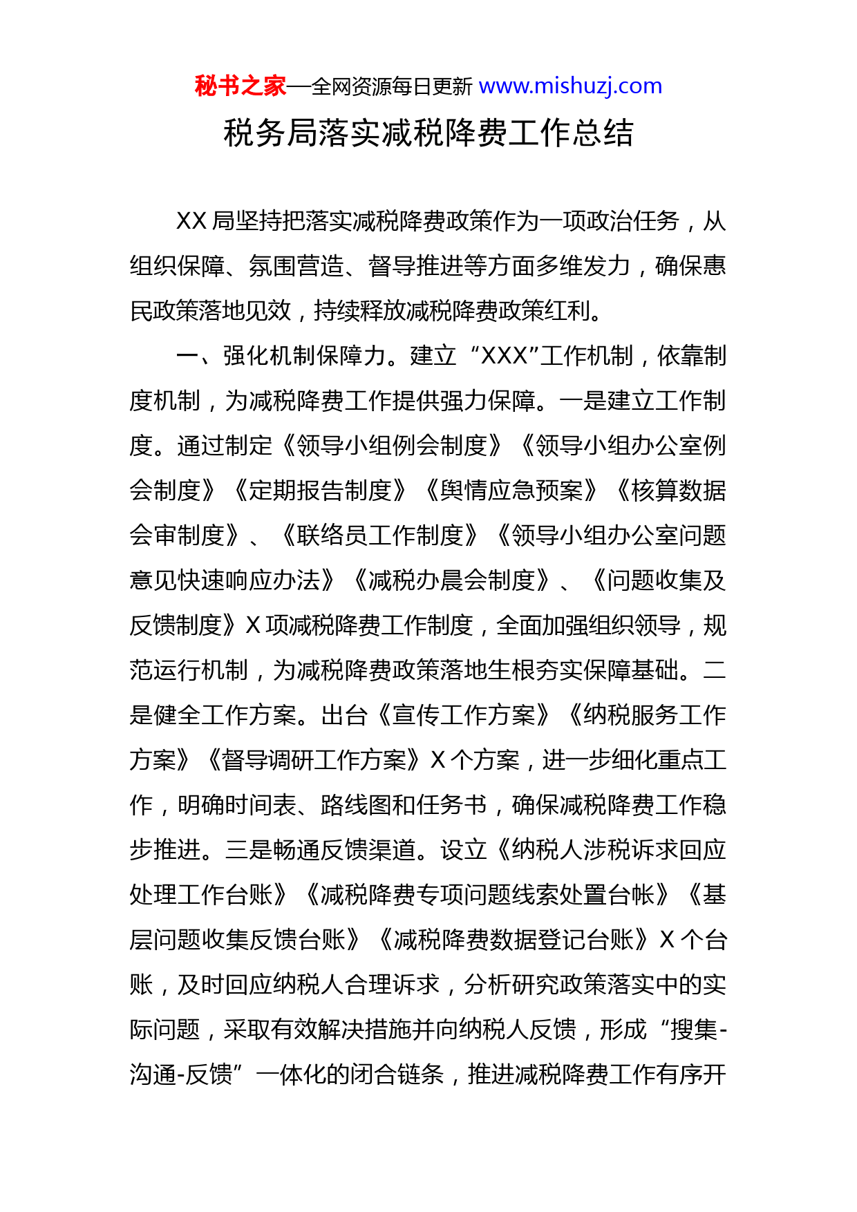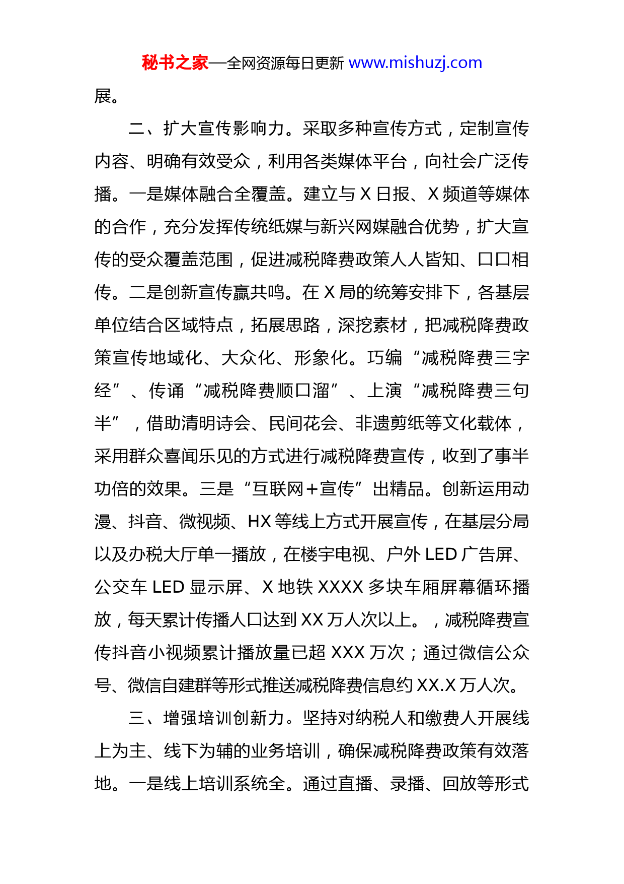秘书之家—全网资源每日更新www.mishuzj.com税务局落实减税降费工作总结XX局坚持把落实减税降费政策作为一项政治任务,从组织保障、氛围营造、督导推进等方面多维发力,确保惠民政策落地见效,持续释放减税降费政策红利。一、强化机制保障力。建立“XXX”工作机制,依靠制度机制,为减税降费工作提供强力保障。一是建立工作制度。通过制定《领导小组例会制度》《领导小组办公室例会制度》《定期报告制度》《舆情应急预案》《核算数据会审制度》、《联络员工作制度》《领导小组办公室问题意见快速响应办法》《减税办晨会制度》、《问题收集及反馈制度》X项减税降费工作制度,全面加强组织领导,规范运行机制,为减税降费政策落地生根夯实保障基础。二是健全工作方案。出台《宣传工作方案》《纳税服务工作方案》《督导调研工作方案》X个方案,进一步细化重点工作,明确时间表、路线图和任务书,确保减税降费工作稳步推进。三是畅通反馈渠道。设立《纳税人涉税诉求回应处理工作台账》《减税降费专项问题线索处置台帐》《基层问题收集反馈台账》《减税降费数据登记台账》X个台账,及时回应纳税人合理诉求,分析研究政策落实中的实际问题,采取有效解决措施并向纳税人反馈,形成“搜集-沟通-反馈”一体化的闭合链条,推进减税降费工作有序开秘书之家—全网资源每日更新www.mishuzj.com展。二、扩大宣传影响力。采取多种宣传方式,定制宣传内容、明确有效受众,利用各类媒体平台,向社会广泛传播。一是媒体融合全覆盖。建立与X日报、X频道等媒体的合作,充分发挥传统纸媒与新兴网媒融合优势,扩大宣传的受众覆盖范围,促进减税降费政策人人皆知、口口相传。二是创新宣传赢共鸣。在X局的统筹安排下,各基层单位结合区域特点,拓展思路,深挖素材,把减税降费政策宣传地域化、大众化、形象化。巧编“减税降费三字经”、传诵“减税降费顺口溜”、上演“减税降费三句半”,借助清明诗会、民间花会、非遗剪纸等文化载体,采用群众喜闻乐见的方式进行减税降费宣传,收到了事半功倍的效果。三是“互联网+宣传”出精品。创新运用动漫、抖音、微视频、HX等线上方式开展宣传,在基层分局以及办税大厅单一播放,在楼宇电视、户外LED广告屏、公交车LED显示屏、X地铁XXXX多块车厢屏幕循环播放,每天累计传播人口达到XX万人次以上。,减税降费宣传抖音小视频累计播放量已超XXX万次;通过微信公众号、微信自建群等形式推送减税降费信息约XX.X万人次。三、增强培训创新力。坚持对纳税人和缴费人开展线上为主、线下为辅的业务培训,确保减税降费政策有效落地。一是线上培训系统全。通过直播、录播、回放等形式秘书之家—全网资源每日更新www.mishuzj.com全面增加纳税人受众范围,并支持自主选择学习时间、地点和内容,有效解决了纳税人和缴费人的工学矛盾。二是线下培训目标准。找准减税降费涉及的重点企业人群,在充分调研基础上,分行业、按需求开展培训,有效提高政策落实的针对性,保证培训效果最大化。,共组织各类培训XXX场,培训纳税人、缴费人XX.X万人次。三是线上线下结合实。充分利用承办X省“减税降费”万人大讲堂暨第XX个全国税收宣传月启动仪式的重大契机,活动当天对XXXX多名纳税人现场培训税收优惠政策,同步网络直播在线观看量超百万,依托信息化技术,消除了空间障碍,帮助纳税人理解好、分享好各项减税政策。四是税企携手互动好。采取“内宣外合”“以赛促学”的税企互动模式,在X广播电视台举办了“减税降费税企同行”知识竞赛,与纳税人共同学习、同台竞技,推进减税降费政策在X落地生根。四、发挥团队战斗力。发挥全系统各类业务骨干的力量,为减税降费政策落实提供人才支持、智力保障。一是打造咨询“专家团队”。组织纳服、税政、征管等部门业务骨干成立专家团队,设立《纳税人涉税诉求回应处理工作台账》《减税降费专项问题线索处置台账》《基层问题收集反馈台账》《减税降费数据登记台账》等X个台账,建立“受理-处理-反馈”工作机制,分析研究政策落实中的秘书之家—全网资源每日更新www.mishuzj.com实际问题,采取积极有效的对策措施,并及时向纳税人反馈问题解决进展情况。二是打造辅导“宣讲团队”。X县协调联动,与劳动就业部门签署长期合作协议,组织X县业务骨干组成纳税辅导宣讲团,深入孵化园、科技园等需求集中地区,突出个性化定向辅导,开展点对点、面对面的纳税辅导。三是打造维权“监督团队”。风控、纪检、巡察等部门协调联动,挑选业务精干、公正热情的税务人员组建督察队,针对基层单位实际,重点从宣传辅导、问题反馈、政策落实、统计核算等方面进行督导检查,确保减税降费政策落实与纳税人权益维护同步推动、双向促进。五、提高督导执行力。制定督导督察工作方案,采取有效手段和方法开展督导,加大减税降费政策的落实力度。一是开展专项督导督察。X局班子成员带队,组成XX个督导组,对XX个区县分组督导,跟踪落实结果,加大问效力度。二是手段措施多样化。采取暗访、座谈和调研等多种形式相结合,深入纳税人中查找问题和原因,多措并举开展督导工作。三是专项检查促落实。纪检组专门制定《减税降费监督检查工作方案》,把各项要求