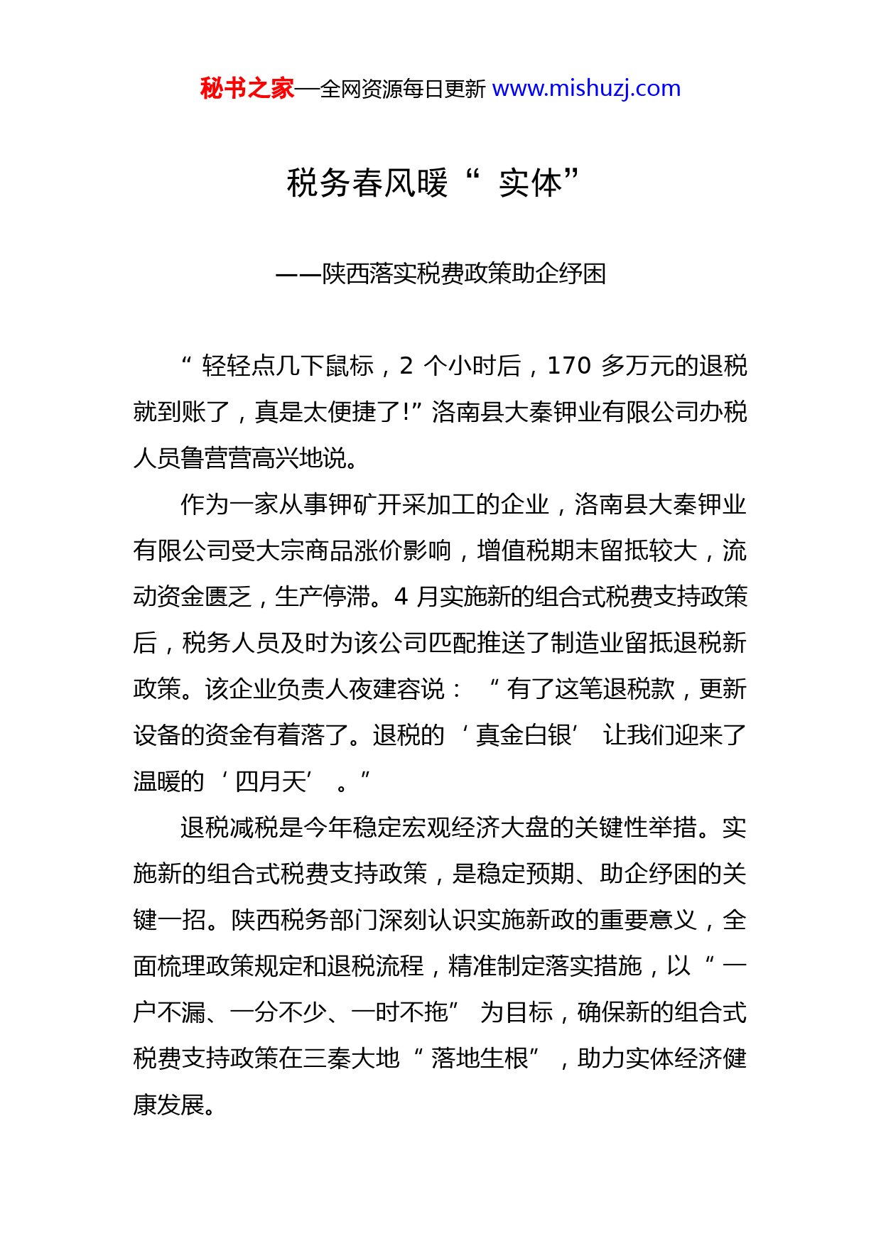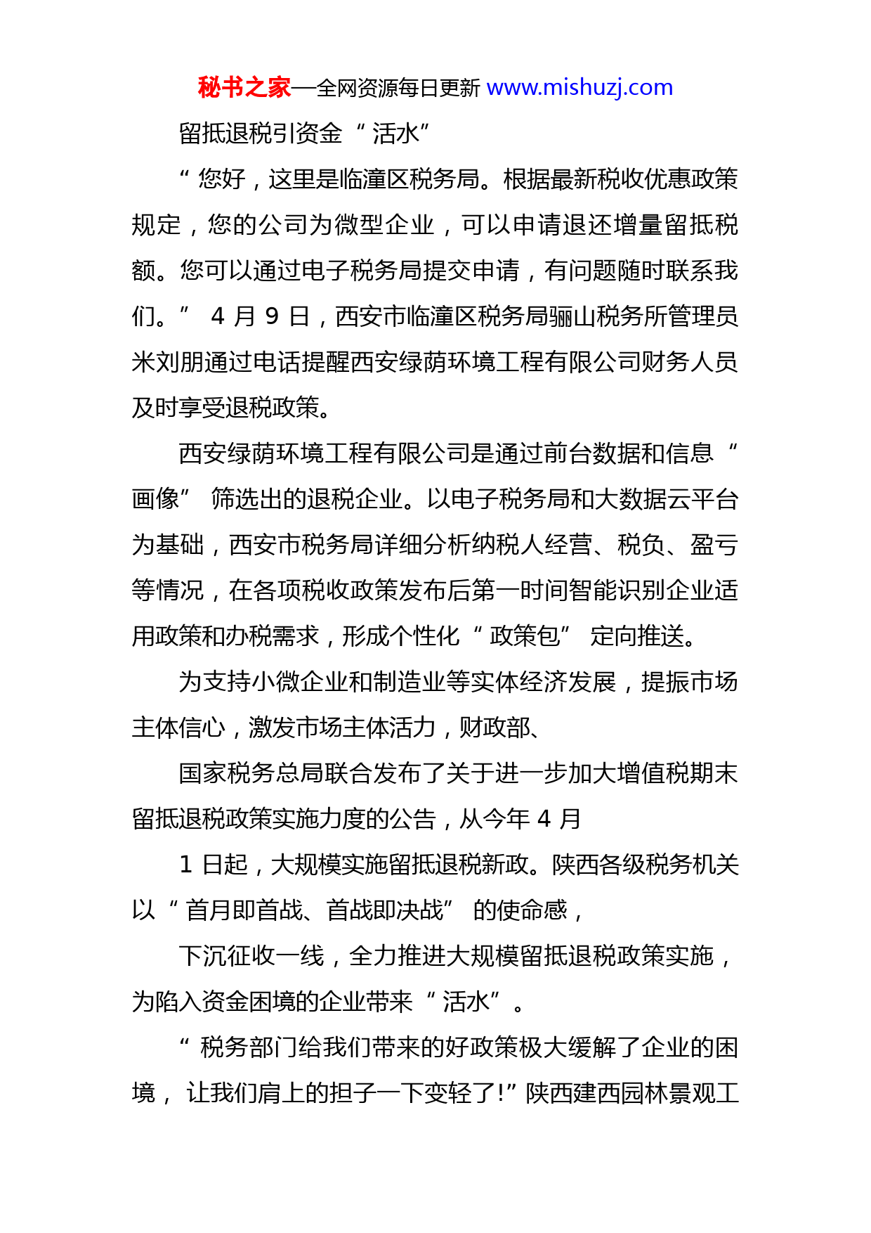 秘书之家—全网资源每日更新www.mishuzj.com税务春风暖“实体”——陕西落实税费政策助企纾困“轻轻点几下鼠标,2个小时后,170多万元的退税就到账了,真是太便捷了!”洛南县大秦钾业有限公司办税人员鲁营营高兴地说。作为一家从事钾矿开采加工的企业,洛南县大秦钾业有限公司受大宗商品涨价影响,增值税期末留抵较大,流动资金匮乏,生产停滞。4月实施新的组合式税费支持政策后,税务人员及时为该公司匹配推送了制造业留抵退税新政策。该企业负责人夜建容说:“有了这笔退税款,更新设备的资金有着落了。退税的‘真金白银’让我们迎来了温暖的‘四月天’。”退税减税是今年稳定宏观经济大盘的关键性举措。实施新的组合式税费支持政策,是稳定预期、助企纾困的关键一招。陕西税务部门深刻认识实施新政的重要意义,全面梳理政策规定和退税流程,精准制定落实措施,以“一户不漏、一分不少、一时不拖”为目标,确保新的组合式税费支持政策在三秦大地“落地生根”,助力实体经济健康发展。秘书之家—全网资源每日更新www.mishuzj.com留抵退税引资金“活水”“您好,这里是临潼区税务局。根据最新税收优惠政策规定,您的公司为微型企业,可以申请退还增量留抵税额。您可以通过电子税务局提交申请,有问题随时联系我们。”4月9日,西安市临潼区税务局骊山税务所管理员米刘朋通过电话提醒西安绿荫环境工程有限公司财务人员及时享受退税政策。西安绿荫环境工程有限公司是通过前台数据和信息“画像”筛选出的退税企业。以电子税务局和大数据云平台为基础,西安市税务局详细分析纳税人经营、税负、盈亏等情况,在各项税收政策发布后第一时间智能识别企业适用政策和办税需求,形成个性化“政策包”定向推送。为支持小微企业和制造业等实体经济发展,提振市场主体信心,激发市场主体活力,财政部、国家税务总局联合发布了关于进一步加大增值税期末留抵退税政策实施力度的公告,从今年4月1日起,大规模实施留抵退税新政。陕西各级税务机关以“首月即首战、首战即决战”的使命感,下沉征收一线,全力推进大规模留抵退税政策实施,为陷入资金困境的企业带来“活水”。“税务部门给我们带来的好政策极大缓解了企业的困境,让我们肩上的担子一下变轻了!”陕西建西园林景观工秘书之家—全网资源每日更新www.mishuzj.com程有限公司财务负责人宫强说,税务人员详细了解企业经营情况及各类涉税问题,细致解读留抵退税新政,及时帮助企业申请退税,是企业的知心人。留抵退税新政涉及企业户数多,时间紧、任务重,对税务部门是一项巨大的考验。在大数据精准定位的基础上,陕西税务系统抽调业务骨干组建留抵退税专项工作组,通过“一把手”负总责、分管领导抓具体、股室分局全流程推进的网格化管理,实现政策宣传、流程辅导、实时审批的“一站式”退税服务。同时,陕西省税务局建立问题直报快速反馈机制,保证纳税人问题诉求及时对接、准确报送、有效解决。创新举措延伸服务触角春季以来,受疫情影响,一些区域实行静态管理,为留抵退税工作增加了不少困难。为确保税费政策尽快落地,陕西税务系统创新举措推出“陕速办”“榆小呼”等“云上办”措施,主动延伸服务触角,打通留抵退税“最后一公里”。受疫情影响,陕西煤业化工集团陕南地产有限公司开发项目的材料、人工等成本上涨,公司经营举步维艰。商洛市商州区税务局第三税务分局主动联系企业,远程指导帮助企业在电子税务局顺利完成了退税。秘书之家—全网资源每日更新www.mishuzj.com该公司财务负责人王晓艳说:“真没想到足不出户就能享受退税。上午通过电子税务局申请留抵退税,下午就收到了700多万元退税到账的信息,真是太快了。有了这笔资金,相信我们很快就能走出困境。”“不来即享”“一键确认”“申报即享”,已经成为陕西纳税人缴费人享受税收优惠的主流方式。陕西税务部门通过优化升级电子税务局,集成多渠道数据,自动计算应缴税费,简化企业享受优惠政策的流程。税务干部通过云端辅导、税收云课堂等途径宣传政策,并针对留抵退税过程中出现的高频问题第一时间为纳税人答疑解惑。“现在退税可以在电子税务局办理,不需要跑分局签字,直接可以退到公户里边。”安康市辉旺实业有限公司财务人员丁俏俏说。安康市辉旺实业有限公司是一家以运输和商贸为主要业务的一般纳税人企业。该企业负责人王益辉表示,税务部门主动上门服务,提高了办税效率,增进了企业对优惠政策的了解,给国家的好政策、税务局的好服务点赞!“真金白银”直达企业提士气陕西邦华新能源动力有限公司以电动汽车动力型高能锂离子电源总成的研发、制造、营销为主业。去年受疫情影响,供应商账期缩短,原材料价格上涨,销售回款时间拉长,企业资金紧张。秘书之家—全网资源每日更新www.mishuzj.com4月7日,该公司在汉中市南郑区税务局梁山税务分局办理了存量留抵退税业务,隔天便收到了退税资金457.73万元。企业负责人魏丽娟为记者算了一笔“收益账”:“这笔退税资金可以降低企业10%的采购成本。购进新设备后,预计全年销售额将有新突破。退税资金可以说是直接为我们‘输血’。”为助企纾困,自3月27日起,陕西各级税务部门退税流程责任人主动