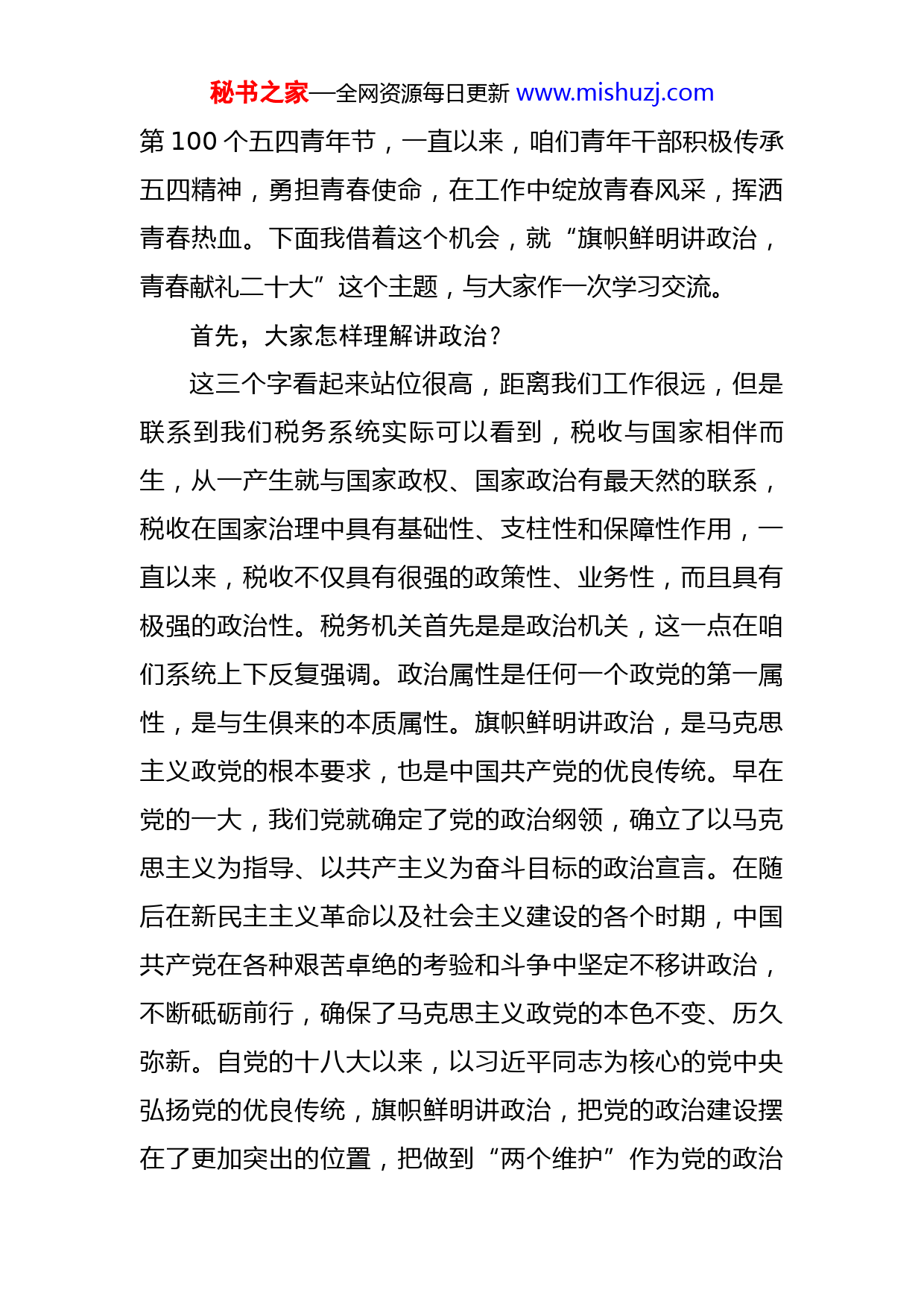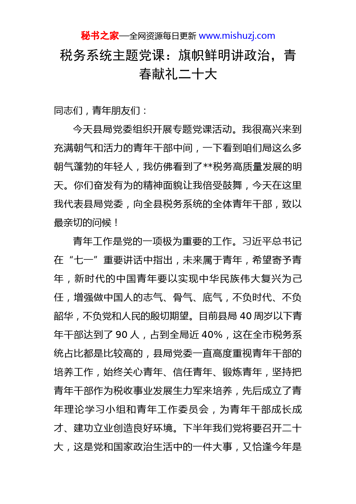 秘书之家—全网资源每日更新www.mishuzj.com税务系统主题党课:旗帜鲜明讲政治,青春献礼二十大同志们,青年朋友们:今天县局党委组织开展专题党课活动。我很高兴来到充满朝气和活力的青年干部中间,一下看到咱们局这么多朝气蓬勃的年轻人,我仿佛看到了税务高质量发展的明天。你们奋发有为的精神面貌让我倍受鼓舞,今天在这里我代表县局党委,向全县税务系统的全体青年干部,致以最亲切的问候!青年工作是党的一项极为重要的工作。习近平总书记在“七一”重要讲话中指出,未来属于青年,希望寄予青年,新时代的中国青年要以实现中华民族伟大复兴为己任,增强做中国人的志气、骨气、底气,不负时代、不负韶华,不负党和人民的殷切期望。目前县局40周岁以下青年干部达到了90人,占到全局近40%,这在全市税务系统占比都是比较高的,县局党委一直高度重视青年干部的培养工作,始终关心青年、信任青年、锻炼青年,坚持把青年干部作为税收事业发展生力军来培养,先后成立了青年理论学习小组和青年工作委员会,为青年干部成长成才、建功立业创造良好环境。下半年我们党将要召开二十大,这是党和国家政治生活中的一件大事,又恰逢今年是秘书之家—全网资源每日更新www.mishuzj.com第100个五四青年节,一直以来,咱们青年干部积极传承五四精神,勇担青春使命,在工作中绽放青春风采,挥洒青春热血。下面我借着这个机会,就“旗帜鲜明讲政治,青春献礼二十大”这个主题,与大家作一次学习交流。首先,大家怎样理解讲政治?这三个字看起来站位很高,距离我们工作很远,但是联系到我们税务系统实际可以看到,税收与国家相伴而生,从一产生就与国家政权、国家政治有最天然的联系,税收在国家治理中具有基础性、支柱性和保障性作用,一直以来,税收不仅具有很强的政策性、业务性,而且具有极强的政治性。税务机关首先是是政治机关,这一点在咱们系统上下反复强调。政治属性是任何一个政党的第一属性,是与生俱来的本质属性。旗帜鲜明讲政治,是马克思主义政党的根本要求,也是中国共产党的优良传统。早在党的一大,我们党就确定了党的政治纲领,确立了以马克思主义为指导、以共产主义为奋斗目标的政治宣言。在随后在新民主主义革命以及社会主义建设的各个时期,中国共产党在各种艰苦卓绝的考验和斗争中坚定不移讲政治,不断砥砺前行,确保了马克思主义政党的本色不变、历久弥新。自党的十八大以来,以习近平同志为核心的党中央弘扬党的优良传统,旗帜鲜明讲政治,把党的政治建设摆在了更加突出的位置,把做到“两个维护”作为党的政治秘书之家—全网资源每日更新www.mishuzj.com建设首要任务,坚持不懈推进全面从严治党,党内政治气象焕然一新,党内政治生态明显好转,党在自我革命的锻造中更加坚强,焕发出新的强大生机活力。我体会,作为一名共产党员,讲政治不是出自口头,而是发自内心,心中至少要随时随地装着三个方面:(一)心要敬党。习近平总书记反复强调“在党爱党、在党为党”。作为一名党员,心中必须要时时有党;心中有党,就要时时听党的话、干党的活、跟着党走。这其中,关键的关键就是要时时保持一颗对党崇敬之心。包括我在内,都没有经历过流血牺牲的战争年代,咱们青年同胞也没有经历过灾难年代,很难切身体会到1921年以来党领导新民主主义革命,抗日战争、解放战争到成立新中国的艰难困苦,从领导社会主义改造和建设、改革开放到继往开来的新时代,走过的百年辉煌历程,取得的改天换地成就,足以让我们每一位党员为之心潮澎湃、为之心生敬仰。特别是党的十八大以来,党带领全国各族人民所取得的历史性伟大成就,更是让我们每一位党员有切身感受、切身认同。三年来,面对突如其来并在全球蔓延的新冠肺炎疫情,我们党更是以无与伦比的领导力,带领全国上下取得了抗击疫情的重大战略成果,充分彰显了无可比拟的政治优势。这样的党怎能不令人神往、令人敬慕、令人尊崇。因此,心中有党必须是敬党之尊油然而生的,必秘书之家—全网资源每日更新www.mishuzj.com须是在自觉增强“四个意识”、坚定“四个自信”、做到“两个维护”中历久弥坚的,必须是在确保以习近平同志为核心的党中央一锤定音的权威中一以贯之的。(二)心要敬民。“民心是最大的政治”。讲政治,就要顺民心、合民意,坚持以人民为中心的发展思想。马克思主义政党与其他政党的根本区别,就在于它广泛的人民性,代表最广大人民的根本利益。作为中国共产党党员,心中有民应该是“至广大而尽精微”的“人民观”,把全心全意为人民服务作为根本宗旨从我党成立之日起,不仅从未动摇过,而且越来越厚植。作为咱们税务系统,心中有民最重要的体现就是坚持以广大纳税人缴费人为中心,把纳税人缴费人所盼作为税务人所向,把纳税人缴费人的满意作为税务人的追求,打通各类税收优惠“最后一公里”,站稳政治立场,把为纳税人缴费人服务理念落实充分、推进到位。作为一名税务干部,心中有民还要求我们要关心关爱身边的同事,帮助解决实际困难。因此,心中有民是多维度、多层次的,是需要结合每一名党员的岗位、职责而深入认识和践行的。(三)心要敬纪。“增强纪律性,革命无不胜”习近平总书记告诫我们要“始终做政治上的明白人”。讲