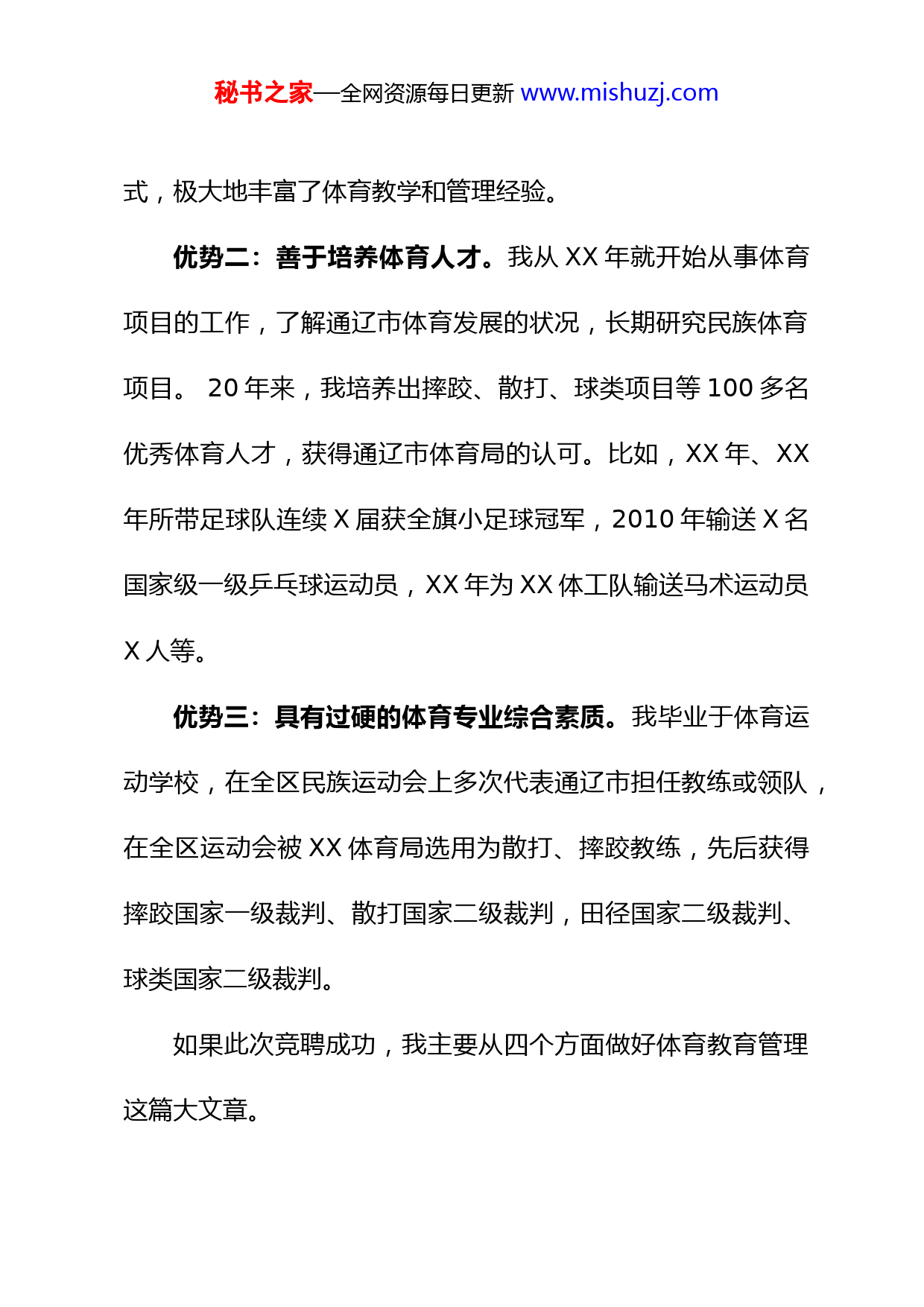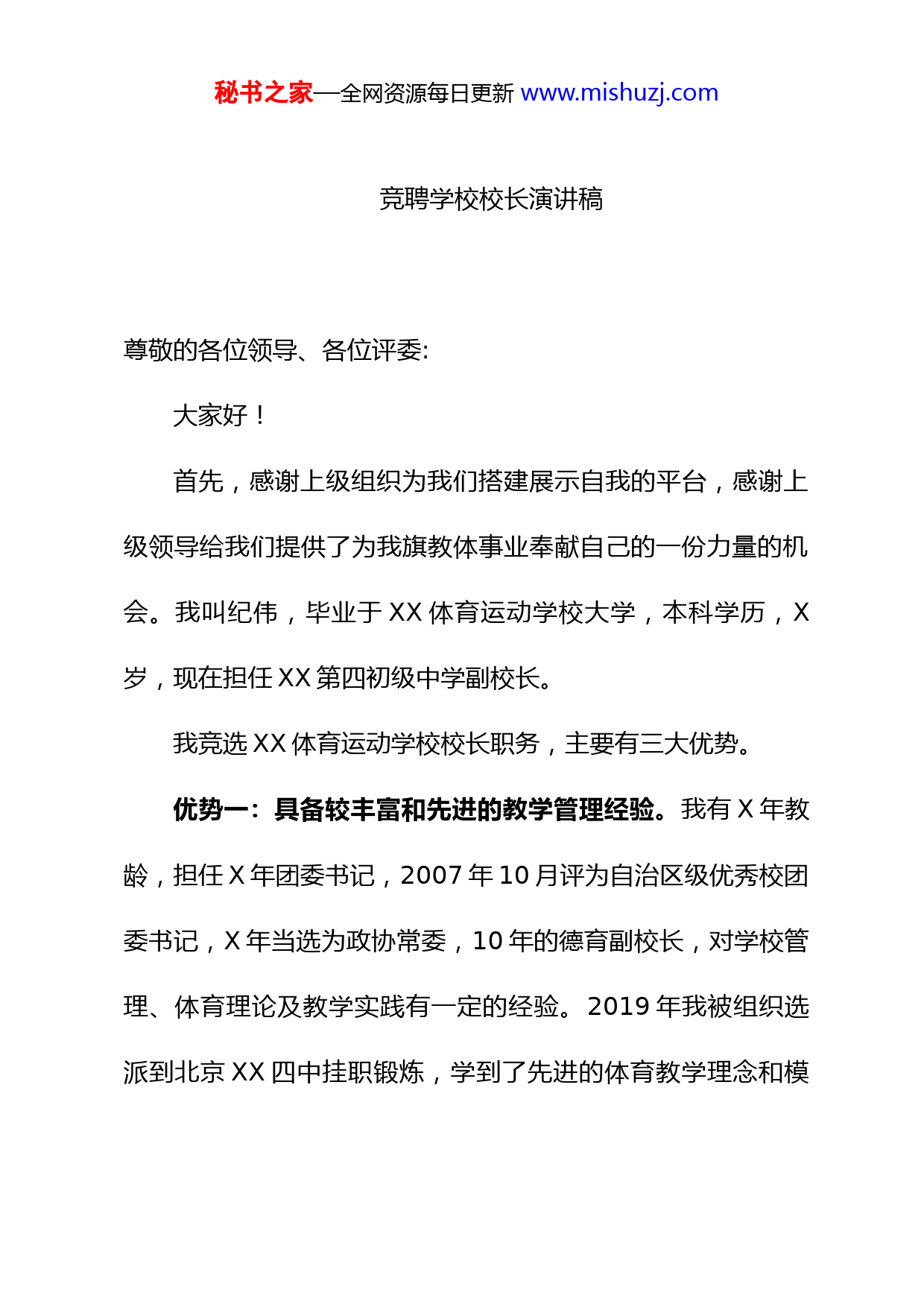 秘书之家—全网资源每日更新www.mishuzj.com竞聘学校校长演讲稿尊敬的各位领导、各位评委:大家好!首先,感谢上级组织为我们搭建展示自我的平台,感谢上级领导给我们提供了为我旗教体事业奉献自己的一份力量的机会。我叫纪伟,毕业于XX体育运动学校大学,本科学历,X岁,现在担任XX第四初级中学副校长。我竞选XX体育运动学校校长职务,主要有三大优势。优势一:具备较丰富和先进的教学管理经验。我有X年教龄,担任X年团委书记,2007年10月评为自治区级优秀校团委书记,X年当选为政协常委,10年的德育副校长,对学校管理、体育理论及教学实践有一定的经验。2019年我被组织选派到北京XX四中挂职锻炼,学到了先进的体育教学理念和模秘书之家—全网资源每日更新www.mishuzj.com式,极大地丰富了体育教学和管理经验。优势二:善于培养体育人才。我从XX年就开始从事体育项目的工作,了解通辽市体育发展的状况,长期研究民族体育项目。20年来,我培养出摔跤、散打、球类项目等100多名优秀体育人才,获得通辽市体育局的认可。比如,XX年、XX年所带足球队连续X届获全旗小足球冠军,2010年输送X名国家级一级乒乓球运动员,XX年为XX体工队输送马术运动员X人等。优势三:具有过硬的体育专业综合素质。我毕业于体育运动学校,在全区民族运动会上多次代表通辽市担任教练或领队,在全区运动会被XX体育局选用为散打、摔跤教练,先后获得摔跤国家一级裁判、散打国家二级裁判,田径国家二级裁判、球类国家二级裁判。如果此次竞聘成功,我主要从四个方面做好体育教育管理这篇大文章。秘书之家—全网资源每日更新www.mishuzj.com第一,树立科学的办学思想。以德育为核心,实施素质教育。全面提高办学质量,突出输送、强化体育训练、努力为上一级体育训练部门输送优秀体育后备人才。实现学生、教师、学校共同和谐发展。第二,树立的科学办学精神。坚持把筑牢中华民族共同体意识与中华民族体育事业有机的结合起来,落实好党和国家的各项教育、体育方针,构建符合现代运动规律和教育规律的学校管理机制,让马王之乡、摔跤基地、民族体育在科尔沁大地上徐徐生辉,办成具有特色品牌的体育学校。第三,树立科学的办学目标和任务。着眼于为国家培养德智体全面发展的优秀体育后备人才这一重要使命,构建体育运动学校的专业体系和教学、训练、科研的办学模式,让学校成为九年义务教育体育人才培养的摇篮、成为通辽市体育强旗。三年之内,申请项目资金选择校址建设新的体校,组建优秀的教练、教师团队,推出合理的管理细则,创办出先进理念建立体秘书之家—全网资源每日更新www.mishuzj.com育后备人才基地。争取五年之内,通过训练管理为国家输送一二线优秀运动员,建设好国家重点项目运动员培养;引进举重、射击、散打、中国跤、自行车、射箭等传统项目。第四,采取科学务实措施。围绕学校的办学目标和任务,主要采取四项措施。一是加强理论学习,提高教练员综合素质。培养教练员良好政治素质及思想、职业道德,提高文化业务知识、训练水平,打造信念坚定、素质过硬的教练员队伍。二是健全竞争机制,实施“人才兴体”战略。推行教练员岗位聘任制,完善“竞争上岗、签订合同、定期考核、优胜劣汰”用人机制。创造条件让教职工参加进修培训,外聘国家级高水平退役运动员以及我旗范围内有体育专长的任教练。三是加强交流秘书之家—全网资源每日更新www.mishuzj.com合作,建立联合办校体系。扩大对外交流合作,与上级教体单位建立联合办校体系,与通辽市各项目管理中心以及体育运动学校,就招生选材、训练竞赛、技能培训等达成深度合作,选择传统优势项目共同组建内蒙专业三线队。四是精准发力,解决学校校址及体校生源等问题。针对我旗体育运动学校无校址无训练场馆这一问题,争取体育基金、体彩基金、国家体育场馆建设资金,申请定址、定项规划建设新学校。针对体校生源不足,深入我旗各中小学选拔,并通过与其他学校联合举办各项体育赛事,挖掘有体育特长和体育天赋的学生。针对体校训练项目单一等问题,把常规训练和特色训练相结合,重点抓好秘书之家—全网资源每日更新www.mishuzj.com一些特色类训练项目。我的演讲完毕,谢谢大家!