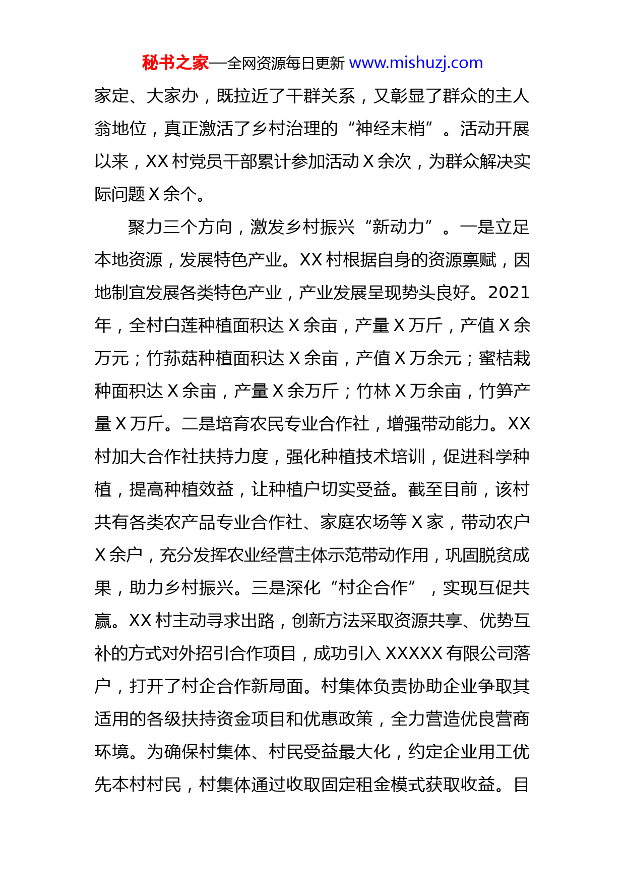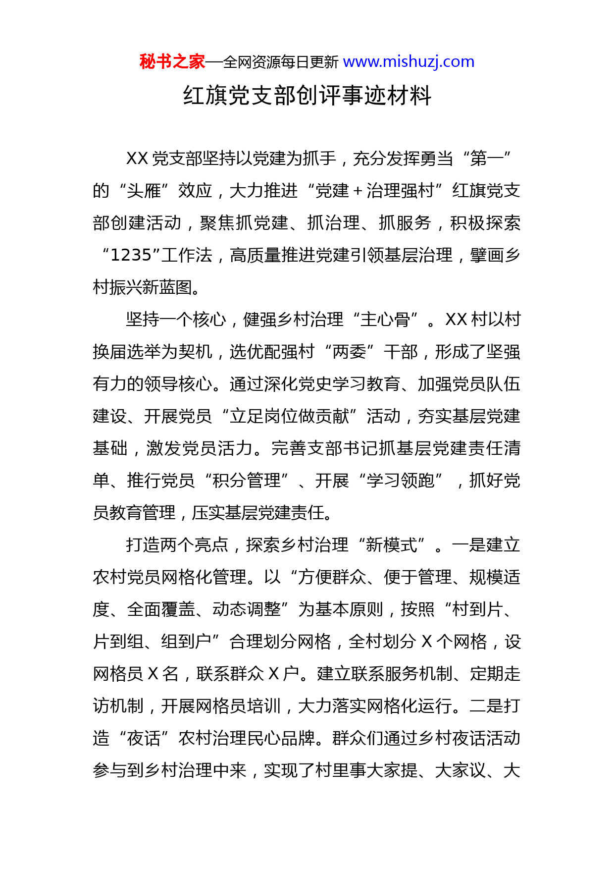 秘书之家—全网资源每日更新www.mishuzj.com红旗党支部创评事迹材料XX党支部坚持以党建为抓手,充分发挥勇当“第一”的“头雁”效应,大力推进“党建+治理强村”红旗党支部创建活动,聚焦抓党建、抓治理、抓服务,积极探索“1235”工作法,高质量推进党建引领基层治理,擘画乡村振兴新蓝图。坚持一个核心,健强乡村治理“主心骨”。XX村以村换届选举为契机,选优配强村“两委”干部,形成了坚强有力的领导核心。通过深化党史学习教育、加强党员队伍建设、开展党员“立足岗位做贡献”活动,夯实基层党建基础,激发党员活力。完善支部书记抓基层党建责任清单、推行党员“积分管理”、开展“学习领跑”,抓好党员教育管理,压实基层党建责任。打造两个亮点,探索乡村治理“新模式”。一是建立农村党员网格化管理。以“方便群众、便于管理、规模适度、全面覆盖、动态调整”为基本原则,按照“村到片、片到组、组到户”合理划分网格,全村划分X个网格,设网格员X名,联系群众X户。建立联系服务机制、定期走访机制,开展网格员培训,大力落实网格化运行。二是打造“夜话”农村治理民心品牌。群众们通过乡村夜话活动参与到乡村治理中来,实现了村里事大家提、大家议、大秘书之家—全网资源每日更新www.mishuzj.com家定、大家办,既拉近了干群关系,又彰显了群众的主人翁地位,真正激活了乡村治理的“神经末梢”。活动开展以来,XX村党员干部累计参加活动X余次,为群众解决实际问题X余个。聚力三个方向,激发乡村振兴“新动力”。一是立足本地资源,发展特色产业。XX村根据自身的资源禀赋,因地制宜发展各类特色产业,产业发展呈现势头良好。2021年,全村白莲种植面积达X余亩,产量X万斤,产值X余万元;竹荪菇种植面积达X余亩,产值X万余元;蜜桔栽种面积达X余亩,产量X余万斤;竹林X万余亩,竹笋产量X万斤。二是培育农民专业合作社,增强带动能力。XX村加大合作社扶持力度,强化种植技术培训,促进科学种植,提高种植效益,让种植户切实受益。截至目前,该村共有各类农产品专业合作社、家庭农场等X家,带动农户X余户,充分发挥农业经营主体示范带动作用,巩固脱贫成果,助力乡村振兴。三是深化“村企合作”,实现互促共赢。XX村主动寻求出路,创新方法采取资源共享、优势互补的方式对外招引合作项目,成功引入XXXXX有限公司落户,打开了村企合作新局面。村集体负责协助企业争取其适用的各级扶持资金项目和优惠政策,全力营造优良营商环境。为确保村集体、村民受益最大化,约定企业用工优先本村村民,村集体通过收取固定租金模式获取收益。目秘书之家—全网资源每日更新www.mishuzj.com前XXX公司现已为本村X余名群众提供长期稳定就业岗位。深化五项融合,构建乡村治理“新格局”。一是推行党员中心户制度,政治引领强保障。为确保党员中心户真正成为反映民声、传达民意、畅通舆论的党群“连心桥”,XX村多措并举压紧压实党员中心户责任,一方面统一制作标牌实行公开挂牌上岗,增强党员中心户的光荣感和使命感。另一方面建立党员中心户评定制度,实行一月一检查、一月一评比,促使党员中心户切实承担起基层一线“六员”重要职责。二是实现普法宣传全覆盖,法治保障提效能。XX村党支部以“七五普法”为契机,注重研究和解决新情况、新问题,结合工作实际,创新工作方法,增强普法效果。积极培养农村“法律明白人”。组织培训“法律明白人”骨干X人,“法律明白人”X余人,全村形成“积极学法,自觉守法”的良好氛围;在村部设置便民服务站,开展“法律进万家”活动,促进了普法宣传教育的不断深入;抓好典型示范,推动普法向纵深发展,通过好的典型示范作用,来带动全村普法和农村依法治理工作的深入开展。三是倡导文明乡风,德治教化扬正气。XX村以文明村镇创建为载体,先后培育出文明家庭、市县级孝心人士XX人次。成立红白理事会,积极倡导移风易俗,制定村规民约,在全村广泛开展节俭评比、文明创评、文秘书之家—全网资源每日更新www.mishuzj.com明餐桌等活动。充分运用好道德红黑榜,发挥正向激励和反向约束作用,助力乡风文明。四是推行“互联网+监督”模式,智治支撑增动力。XX村投入资金在村口、村组干道上安装视频监控摄像头,通过视频监控,可以随时掌握村情;同时在实践中持续运用综治视联网平台,实现村级综治中心规范化信息化建设。此外,还积极利用“智慧党建云”信息平台、微信群等,公开党务、村务、财务等,使村庄治理信息透明化、对称化,提高村民参与村庄治理的积极性。五是改善农村人居环境,美治提升换新貌。为认真贯彻落实中央、省、市、县相关工作要求,XX村持续深入实施农村人居环境整治“三清一改”,有序开展“厕所革命”和拆临拆违;加强基础设施建设,统筹推进污水治理,完善农村生活垃圾收集、转运和处置体系;开展“清洁家庭”评优活动,树立榜样,营造良好氛围,推动人居环境持续改善。2021年以来,XX村开展村庄环境整治X次,户厕改造普及率达到X%,“拆临拆违”面积X余平方米。