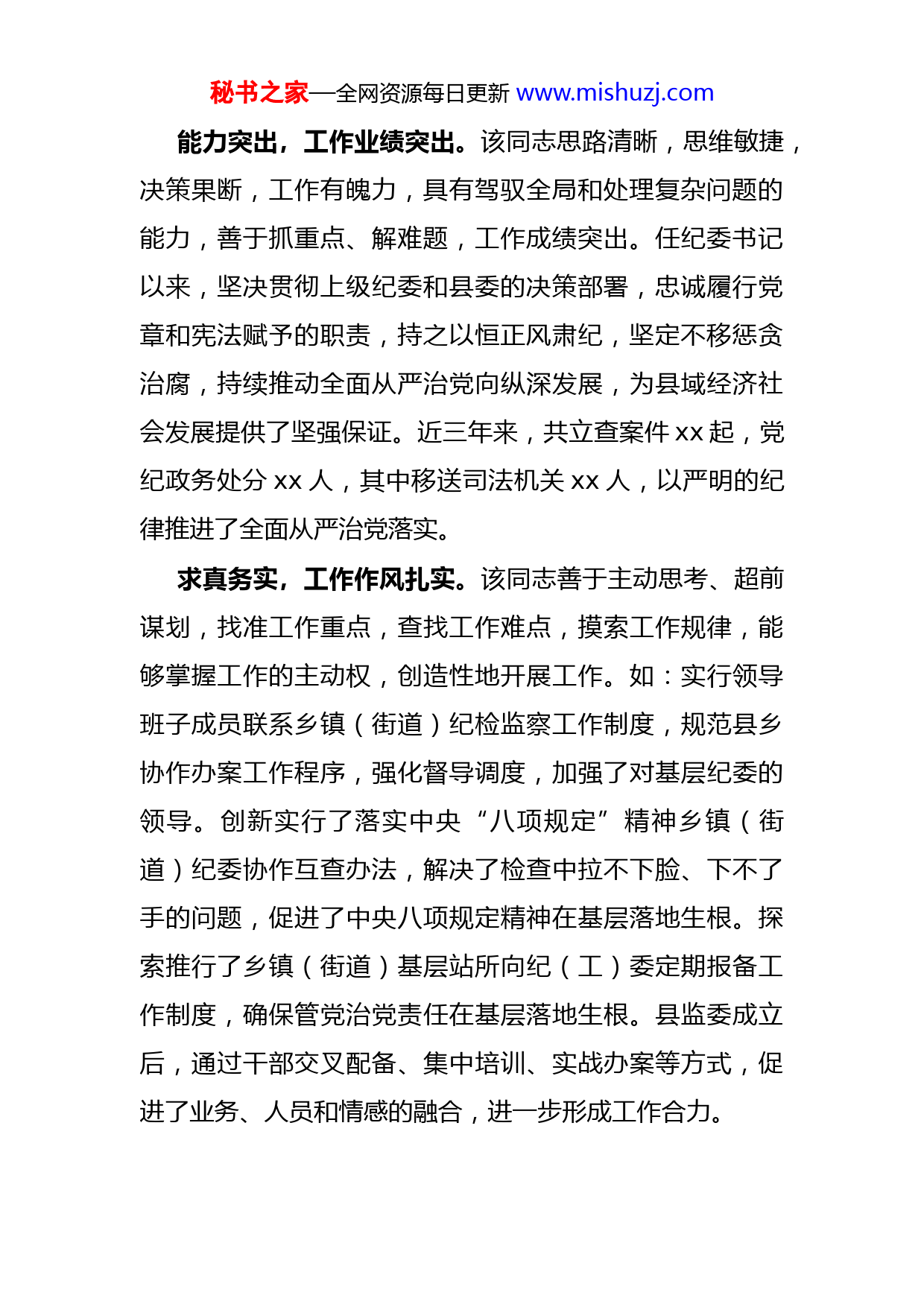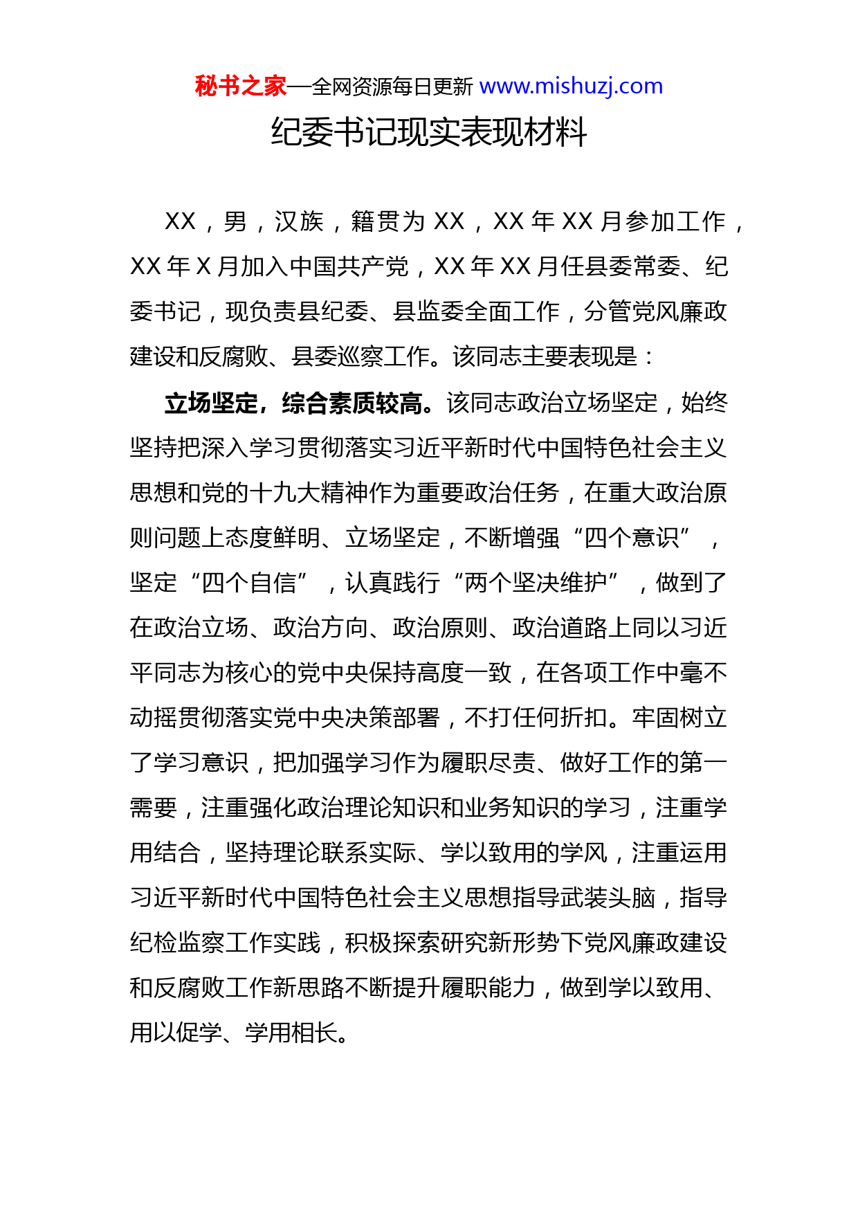 秘书之家—全网资源每日更新www.mishuzj.com纪委书记现实表现材料XX,男,汉族,籍贯为XX,XX年XX月参加工作,XX年X月加入中国共产党,XX年XX月任县委常委、纪委书记,现负责县纪委、县监委全面工作,分管党风廉政建设和反腐败、县委巡察工作。该同志主要表现是:立场坚定,综合素质较高。该同志政治立场坚定,始终坚持把深入学习贯彻落实习近平新时代中国特色社会主义思想和党的十九大精神作为重要政治任务,在重大政治原则问题上态度鲜明、立场坚定,不断增强“四个意识”,坚定“四个自信”,认真践行“两个坚决维护”,做到了在政治立场、政治方向、政治原则、政治道路上同以习近平同志为核心的党中央保持高度一致,在各项工作中毫不动摇贯彻落实党中央决策部署,不打任何折扣。牢固树立了学习意识,把加强学习作为履职尽责、做好工作的第一需要,注重强化政治理论知识和业务知识的学习,注重学用结合,坚持理论联系实际、学以致用的学风,注重运用习近平新时代中国特色社会主义思想指导武装头脑,指导纪检监察工作实践,积极探索研究新形势下党风廉政建设和反腐败工作新思路不断提升履职能力,做到学以致用、用以促学、学用相长。秘书之家—全网资源每日更新www.mishuzj.com能力突出,工作业绩突出。该同志思路清晰,思维敏捷,决策果断,工作有魄力,具有驾驭全局和处理复杂问题的能力,善于抓重点、解难题,工作成绩突出。任纪委书记以来,坚决贯彻上级纪委和县委的决策部署,忠诚履行党章和宪法赋予的职责,持之以恒正风肃纪,坚定不移惩贪治腐,持续推动全面从严治党向纵深发展,为县域经济社会发展提供了坚强保证。近三年来,共立查案件xx起,党纪政务处分xx人,其中移送司法机关xx人,以严明的纪律推进了全面从严治党落实。求真务实,工作作风扎实。该同志善于主动思考、超前谋划,找准工作重点,查找工作难点,摸索工作规律,能够掌握工作的主动权,创造性地开展工作。如:实行领导班子成员联系乡镇(街道)纪检监察工作制度,规范县乡协作办案工作程序,强化督导调度,加强了对基层纪委的领导。创新实行了落实中央“八项规定”精神乡镇(街道)纪委协作互查办法,解决了检查中拉不下脸、下不了手的问题,促进了中央八项规定精神在基层落地生根。探索推行了乡镇(街道)基层站所向纪(工)委定期报备工作制度,确保管党治党责任在基层落地生根。县监委成立后,通过干部交叉配备、集中培训、实战办案等方式,促进了业务、人员和情感的融合,进一步形成工作合力。秘书之家—全网资源每日更新www.mishuzj.com敢于担当,切实履职尽责。该同志敢担当、善作为,牢记宗旨责任、牢记职责使命,坚持秉公执纪,敢抓敢管,敢于碰硬,勇于担当,做到问题不回避,矛盾不上交,责任不推卸,无论任何时候,都坚持组织第一,纪律第一,严格用党章党规党纪去衡量党员干部行为,公平公正执纪监督,着力整治“四风”,强化作风建设,严肃纪律审查切实解决损害群众利益的问题,坚决维护党的纪律的严肃性。能很好地把握党风廉政建设和反腐败工作的整体和全局,既立足当前,遏制不正之风和腐败蔓延势头,严惩腐败不放松;又着眼长远,加强纪律建设,着手构建“不敢腐”、“不能腐”、“不想腐”的有效机制,有效推进了冠县的党风廉政建设和反腐败工作。以身作则,树立良好形象。能认真执行党中央决策部署和上级党委决议决定,带头执行请示报告制度和重大事项报告制度。认真贯彻执行民主集中制原则,严格遵守党的组织纪律、群众纪律、工作纪律,积极参加党内组织生活自觉接受党内监督和群众监督。作为纪委书记,牢固树立了“正人先正己”的意识,带头从严贯彻落实中央八项规定精神和省市实施办法,严格执行公务接待的相关规定。工作上,牢记宗旨责任、牢记职责使命,坚持秉公执纪,勇于担当,坚决维护党的纪律的严肃性。生活上,注重家秘书之家—全网资源每日更新www.mishuzj.com风教育,自觉约束“八小时以外”的言行,净化自己的“三圈”,重操守、重品行,做到了自重、自省、自警、自励,树立了领导干部的良好形象。不足:一是学用结合不够到位。对如何紧密结合纪检监察工作实际,用习近平新时代中国特色社会主义思想武装头脑、指导实践、推动工作思考还不够深、把握还不够准学以致用、推动工作的效果还不够明显,理论指导实践不够;二是开拓创新意识还不够强。面对新形势下的党风廉政建设和反腐败工作,在纪检监察工作思路、履职方式方法上的探索和创新不够,研究新办法、解决新问题,创造性地开展工作还不够多。