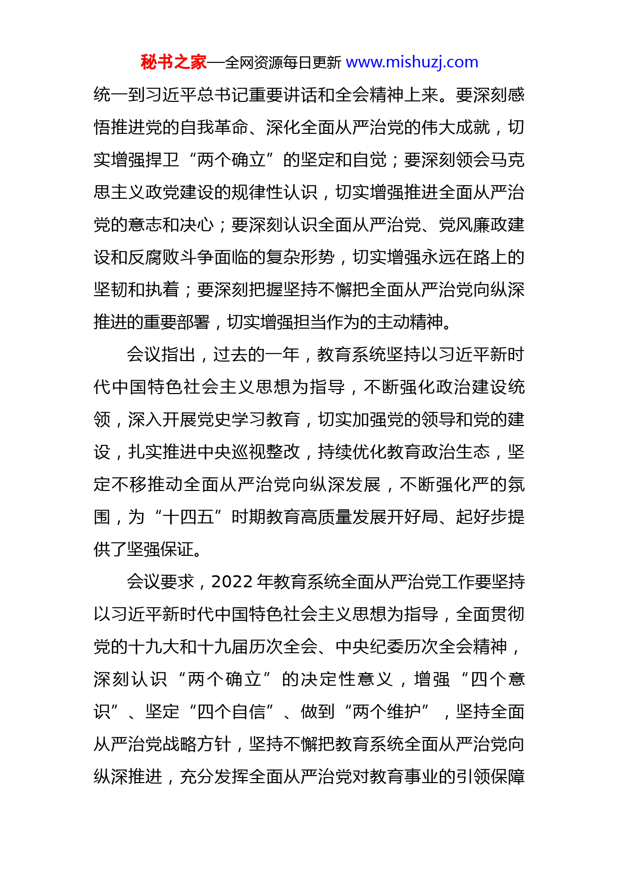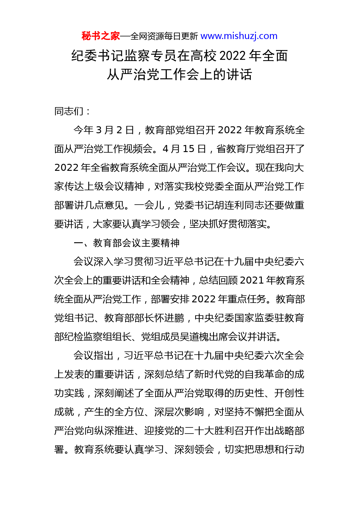 秘书之家—全网资源每日更新www.mishuzj.com纪委书记监察专员在高校2022年全面从严治党工作会上的讲话同志们:今年3月2日,教育部党组召开2022年教育系统全面从严治党工作视频会。4月15日,省教育厅党组召开了2022年全省教育系统全面从严治党工作会议。现在我向大家传达上级会议精神,对落实我校党委全面从严治党工作部署讲几点意见。一会儿,党委书记胡连利同志还要做重要讲话,大家要认真学习领会,坚决抓好贯彻落实。一、教育部会议主要精神会议深入学习贯彻习近平总书记在十九届中央纪委六次全会上的重要讲话和全会精神,总结回顾2021年教育系统全面从严治党工作,部署安排2022年重点任务。教育部党组书记、教育部部长怀进鹏,中央纪委国家监委驻教育部纪检监察组组长、党组成员吴道槐出席会议并讲话。会议指出,习近平总书记在十九届中央纪委六次全会上发表的重要讲话,深刻总结了新时代党的自我革命的成功实践,深刻阐述了全面从严治党取得的历史性、开创性成就,产生的全方位、深层次影响,对坚持不懈把全面从严治党向纵深推进、迎接党的二十大胜利召开作出战略部署。教育系统要认真学习、深刻领会,切实把思想和行动秘书之家—全网资源每日更新www.mishuzj.com统一到习近平总书记重要讲话和全会精神上来。要深刻感悟推进党的自我革命、深化全面从严治党的伟大成就,切实增强捍卫“两个确立”的坚定和自觉;要深刻领会马克思主义政党建设的规律性认识,切实增强推进全面从严治党的意志和决心;要深刻认识全面从严治党、党风廉政建设和反腐败斗争面临的复杂形势,切实增强永远在路上的坚韧和执着;要深刻把握坚持不懈把全面从严治党向纵深推进的重要部署,切实增强担当作为的主动精神。会议指出,过去的一年,教育系统坚持以习近平新时代中国特色社会主义思想为指导,不断强化政治建设统领,深入开展党史学习教育,切实加强党的领导和党的建设,扎实推进中央巡视整改,持续优化教育政治生态,坚定不移推动全面从严治党向纵深发展,不断强化严的氛围,为“十四五”时期教育高质量发展开好局、起好步提供了坚强保证。会议要求,2022年教育系统全面从严治党工作要坚持以习近平新时代中国特色社会主义思想为指导,全面贯彻党的十九大和十九届历次全会、中央纪委历次全会精神,深刻认识“两个确立”的决定性意义,增强“四个意识”、坚定“四个自信”、做到“两个维护”,坚持全面从严治党战略方针,坚持不懈把教育系统全面从严治党向纵深推进,充分发挥全面从严治党对教育事业的引领保障秘书之家—全网资源每日更新www.mishuzj.com作用,在迎接和开好党的二十大中作出应有的贡献。一要聚焦强化政治引领,把迎接学习贯彻党的二十大作为全年工作主线,把坚决做到“两个维护”作为党的最高政治原则和根本政治规矩,坚定不移用党的创新理论铸魂育人。二要聚焦夯实基层基础,进一步健全党对教育工作全面领导体制机制,提升基层党建工作质量,抓好干部人才队伍建设。三要聚焦严守安全底线,守好意识形态前沿阵地,做好思想政治工作,提高风险防范化解能力。四要聚焦“三不”一体推进,纠树并举深化作风建设,严格精准监督执纪问责,压实压紧管党治党责任。五要聚焦健全监督体系,切实加强干部教育管理监督,强化权力运行监督制约,推动各类监督贯通融合。二、河北省教育系统全面从严治党会议主要精神会议学习贯彻习近平总书记重要讲话精神、十九届中央纪委六次全会、十届省纪委二次全会精神和教育部全面从严治党工作视频会议精神。厅党组书记、厅长董兆伟,对2021年全省教育系统全面从严治党工作进行了回顾总结,对做好2022年工作进行了安排部署。省纪委监委驻厅纪检监察组组长张庆文,就学习中央纪委国家监委驻教育部纪检监察组组长吴道槐在全国会议上的讲话精神,做好当前全省教育系统纪检监察工作提出工作要求:一是坚持问题导向,精准发力。全省教育系统还存在秘书之家—全网资源每日更新www.mishuzj.com以下问题和不足:有的单位贯彻落实党的理论和路线方针政策以及党中央决策部署不到位,存在定位不清晰、发展方向不明确等问题;有的单位落实立德树人根本任务不足,思想教育缺乏针对性,落实意识形态工作责任制不到位,校风学风、师德师风建设有待加强;有的单位贯彻落实全面从严治党战略部署有差距,遵守政治纪律政治规矩不够严格,主动担当作为意识不足,化解风险隐患不力,历史遗留问题久拖不决,房屋出租出借、合同承包等重点领域存在廉洁风险,内控制度建设、责任传导、监督力度等方面有待加强;有的单位领导班子自身建设有差距,未形成“头雁效应”,贯彻落实新时代党的组织路线不到位,执行干部选拔任用和监督管理制度不严格;有的单位落实巡视、审计、主题教育等发现问题整改不彻底,常态化长效机制尚未形成,甚至对2015年省委巡视组指出的问题,至今整改不到位、不彻底,存在久拖不决情形等;有的单位在基建后勤、招生考试、科研经费、附属医院、校办企业管理、外联合作办学、职称评聘、费用收取和违规发放津补贴等问题比较突出,工作缺乏主动和深入而引发舆情,产生不良影响。二是坚持系统全面,统筹推进。全省教育系统纪检监察机构要按照省纪委监委《