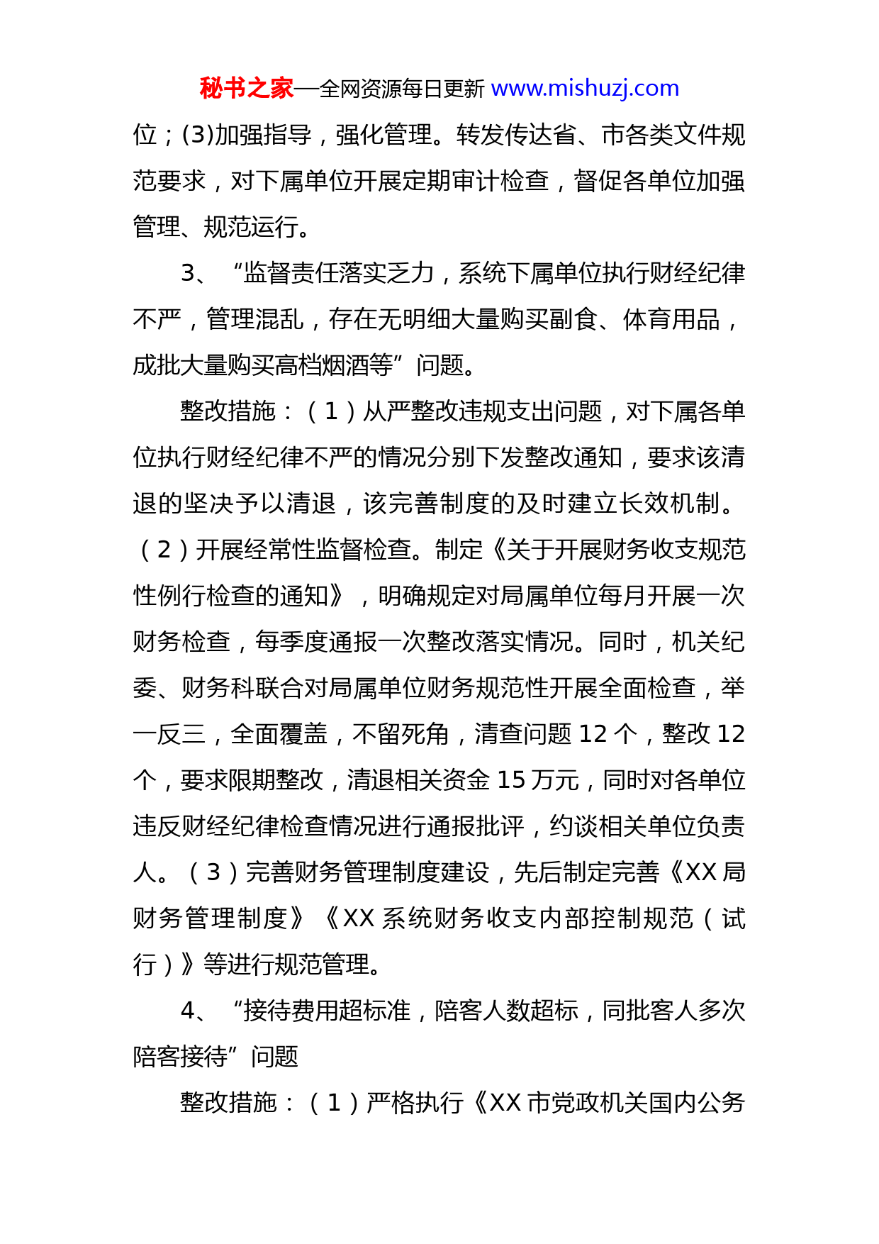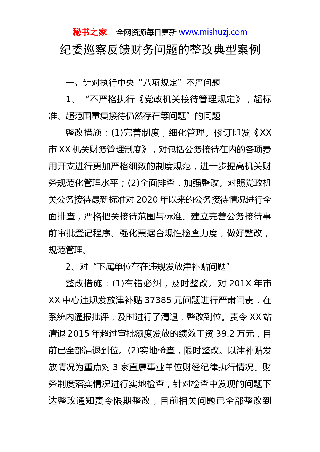 秘书之家—全网资源每日更新www.mishuzj.com纪委巡察反馈财务问题的整改典型案例一、针对执行中央“八项规定”不严问题1、“不严格执行《党政机关接待管理规定》,超标准、超范围重复接待仍然存在等问题”的问题整改措施:(1)完善制度,细化管理。修订印发《XX市XX机关财务管理制度》,对包括公务接待在内的各项费用开支进行更加严格细致的制度规范,进一步提高机关财务规范化管理水平;(2)全面排查,加强整改。对照党政机关公务接待最新标准对2020年以来的公务接待情况进行全面排查,严格把关接待范围与标准、建立完善公务接待事前审批登记程序、强化票据合规性检查力度,做好整改,规范管理。2、对“下属单位存在违规发放津补贴问题”整改措施:(1)有错必纠,及时整改。对201X年市XX中心违规发放津补贴37385元问题进行严肃问责,在系统内通报批评,及时进行了清退,整改到位。责令XX站清退2015年超过审批额度发放的绩效工资39.2万元,目前已全部清退到位。(2)实地检查,限时整改。以津补贴发放情况为重点对3家直属事业单位财经纪律执行情况、财务制度落实情况进行实地检查,针对检查中发现的问题下达整改通知责令限期整改,目前相关问题已全部整改到秘书之家—全网资源每日更新www.mishuzj.com位;(3)加强指导,强化管理。转发传达省、市各类文件规范要求,对下属单位开展定期审计检查,督促各单位加强管理、规范运行。3、“监督责任落实乏力,系统下属单位执行财经纪律不严,管理混乱,存在无明细大量购买副食、体育用品,成批大量购买高档烟酒等”问题。整改措施:(1)从严整改违规支出问题,对下属各单位执行财经纪律不严的情况分别下发整改通知,要求该清退的坚决予以清退,该完善制度的及时建立长效机制。(2)开展经常性监督检查。制定《关于开展财务收支规范性例行检查的通知》,明确规定对局属单位每月开展一次财务检查,每季度通报一次整改落实情况。同时,机关纪委、财务科联合对局属单位财务规范性开展全面检查,举一反三,全面覆盖,不留死角,清查问题12个,整改12个,要求限期整改,清退相关资金15万元,同时对各单位违反财经纪律检查情况进行通报批评,约谈相关单位负责人。(3)完善财务管理制度建设,先后制定完善《XX局财务管理制度》《XX系统财务收支内部控制规范(试行)》等进行规范管理。4、“接待费用超标准,陪客人数超标,同批客人多次陪客接待”问题整改措施:(1)严格执行《XX市党政机关国内公务秘书之家—全网资源每日更新www.mishuzj.com接待管理办法》,强化公务接待清单管理和审批制度,严禁超标准公务接待。(2)制定完善《XX市XX局公务接待管理办法》,完善机关管理制度,坚决执行工作餐接待标准,严格按照财务规定实行接待。(3)局机关纪委、财务科每月对局属单位落实中央“八项规定”和省委六条意见情况开展监督检查,从严处理违规行为,杜绝此类现象再次发生。5、对“违规公款旅游”、“违规私车公用”问题整改措施:(1)责令市XX所清退2014年违规报销的赴XX旅游费用4.23万元,责令市XX站清退2015年4月用公款购买旅游年卡的费用6000元,对市XX中心XX公车私用问题进行诫勉谈话,责令由其个人退缴燃料油费1000元,现已全部清退到位。(2)将上述公款旅游、私车公用问题作为典型案例在系统内通报,进一步加强机关及局属各单位纪律意识教育。(3)局机关纪委、规财科每月开展监督检查,局党组成员每季度到分管单位进行专项检查,发现问题,及时纠偏纠错。(4)加大问责力度,对于今后市直XX系统顶风违纪公款旅游、私车公用的单位和个人予以严肃处理。6、对“无依据发放奖励、违规发放津贴”问题。整改措施:(1)责令相关单位主要负责人作出书面检查,认真开展财务管理问题专项整治,建立了清单台帐,秘书之家—全网资源每日更新www.mishuzj.com逐一查证,对涉及个人违规发放的津贴补贴和差旅补助对照财务报销凭据,按时逐人逐项进行清退,对局机关和所属单位2014年4月违规发放的优秀卷宗奖4300元,优秀调研报告11000元、2015年-2019年以来违规发放春节、清明节、端午节、劳动节值班补助60788元、违规发放新闻宣传奖励5000元、交通补助、加班费7238元予以清退,清退款项全额上缴同级财政国库。(2)组织局机关和各下属单位财务人员加强对党纪党规和财务制度的学习,严格执行有关奖励性工资及津补贴发放规定,从严把关,严格监督,坚决防止类似问题再次发生。7、“违规公务接待,未严格执行“一函三单”制度,无公函或涂改公函”问题。整改措施:(1)严格贯彻落实中央八项规定精神,制定了《市X局贯彻落实中央八项规定实施细则的实施要点》,修订完善公务接待制度,细化公务接待、公务报销、到基层检查调研用餐等各项规定,进一步规范和改进公务接待管理。(2)严格落实“一函三单”规定,公务接待实行“一事一结”,规范公务接待审批报销程序。明确市县相关部门到单位公干需安排接待的,事前要提供公函原件,公函须说明内容、时间、行程、人数和人员身份等事项。今后坚决做到不见公函不接待、公函不规范不接待。(3)公务接待活动禁止提供烟、酒。对于提供香烟款秘书之家—全网资源每日更新www.mishuzj.com项,责成经办人全部清退。(4)对局机关和各下属单位公务接待公函使用情况进行全面检查,对索要公函、涂改公函、
