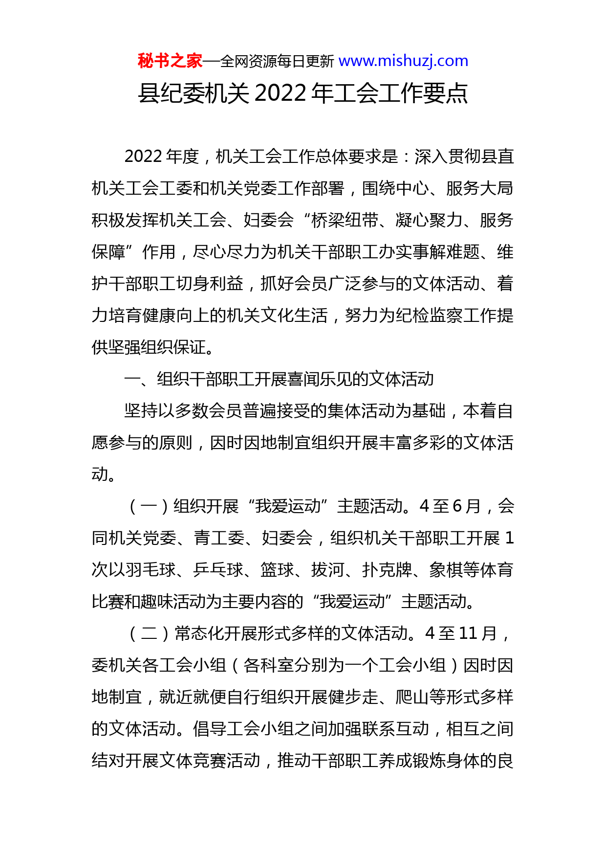 秘书之家—全网资源每日更新www.mishuzj.com县纪委机关2022年工会工作要点2022年度,机关工会工作总体要求是:深入贯彻县直机关工会工委和机关党委工作部署,围绕中心、服务大局积极发挥机关工会、妇委会“桥梁纽带、凝心聚力、服务保障”作用,尽心尽力为机关干部职工办实事解难题、维护干部职工切身利益,抓好会员广泛参与的文体活动、着力培育健康向上的机关文化生活,努力为纪检监察工作提供坚强组织保证。一、组织干部职工开展喜闻乐见的文体活动坚持以多数会员普遍接受的集体活动为基础,本着自愿参与的原则,因时因地制宜组织开展丰富多彩的文体活动。(一)组织开展“我爱运动”主题活动。4至6月,会同机关党委、青工委、妇委会,组织机关干部职工开展1次以羽毛球、乒乓球、篮球、拔河、扑克牌、象棋等体育比赛和趣味活动为主要内容的“我爱运动”主题活动。(二)常态化开展形式多样的文体活动。4至11月,委机关各工会小组(各科室分别为一个工会小组)因时因地制宜,就近就便自行组织开展健步走、爬山等形式多样的文体活动。倡导工会小组之间加强联系互动,相互之间结对开展文体竞赛活动,推动干部职工养成锻炼身体的良秘书之家—全网资源每日更新www.mishuzj.com好习惯。(三)积极培育干部职工文体兴趣爱好。委机关成立羽毛球、乒乓球、书法绘画、摄影、瑜珈、舞蹈、声乐等文体活动兴趣小组,因时因地制宜自发组织开展灵活自便的文化体育活动,培育干部职工文化体育项目兴趣爱好。(四)积极组织参加县直机关活动。根据县直机关工委统一部署,积极组织参加县直机关文化、体育、竞赛活动。通过开展以上活动,丰富机关工会文体活动,展示机关干部职工风采,积极培育劳模精神、劳动精神、工匠精神。重点打造群众参与度高、喜闻乐见的精品活动,推动会员集体活动常态化。二、积极关心促进干部职工身心健康积极开展形式多样的促进干部职工身心健康系列活动。(一)关爱女干部职工。机关妇委会以关心关爱为主题开展活动。一是庆祝妇女节。“三八”妇女节,组织开展女干部职工春季健步走活动。二是集体观看演出。协调联系县文旅局,组织女干部职工观看文艺演出或高雅音乐会。三是做好看望慰问。适时看望孕产期和患病女干部职工,体现组织关怀。(二)关注身心健康。针对办公室职业病、中年人常见病的医疗保健和纪检监察干部心理健康问题,适时邀请秘书之家—全网资源每日更新www.mishuzj.com有关专家辅导讲座,邀请有关专业人员教授“八段锦”健身操。三、维护机关干部职工切身利益坚持科学计划、精打细算、开源节流,把有限的工会经费统筹用于开展集体活动、服务干部职工。(一)精心编制预算。一是依据机关工会2022年度工作计划,编制机关工会2021年度经费预算,依法按程序研究后报县直机关工会工委批准。二是机关工会收支全部纳入预算管理,准确办理经费收支核算。(二)严格执行预算。一是年度预算内组织各项收入,合理安排支出。二是年终向工会委员会和经费审查委员会报告预算执行情况。三是机关工会经费年度决算报县直机关工会工委审批。(三)收缴争取经费。一是落实依法向工会拨缴经费收入的返还部分。二是按时依法足额收缴会员会费。三是尽最大努力协调争取县工会补助款项。四是统筹争取行政补助收入,差额补助工会经费。(四)勤俭节流节约。一是按照中央八项规定精神和过紧日子要求加强工会经费管理使用。二是所有奖品都从正规商场以团购价格购进。三是物资采购和经费支出接受会员监督。(五)有效使用经费。一是严格按照工会经费使用范秘书之家—全网资源每日更新www.mishuzj.com围和标准开支,将工党务精品QQ群824703735为党务工作者提供大量资料,每天更新30多篇,请加QQ:962665491进行咨询!会经费花在点子上、花到心坎上。二是以发放生活必需品(提货凭证或实物)的形式,力争在元旦和春节、五一和端午、十一和中秋发放3次节日慰问品(部分用于消费扶贫)。三是为机关干部职工每人发放1次蛋糕券。四是按标准做好会员婚丧嫁娶、生病住院、生育、退休等慰问工作。(六)规范财务管理。一是按照工会经费收支管理规定和机关工会经费独立核算原则,加强会计核算管理。二是举办各类文体活动、比赛竞赛支出的配套材料须齐全完整。三是按规定发放支出的各类经费须审批、签字手续齐全。四是购物发票须规范完整填写并附清单。五是组织活动等工作餐须提供详细完整的清单。六是不得超范围超标准支出工会经费。(七)加强监督检查。一是机关工会经费审查委员会加强对工会经费使用情况的内部会计监督和工会预算执行情况的审查审计监督。二是接受县直机关工会工委的监督。四、健全完善困难会员帮扶机制重视关心困难干部职工,想方设法排忧解难。(一)掌握困难干部职工情况。一是深入了解干部职工困难情况,及时掌握动态信息,完善困难会员基础数据秘书之家—全网资源每日更新www.mishuzj.com二是各党支部、工会委员会成员履行第一知情人、第一帮助人和第一报告人的责任,在日常工作中及时发现、了解本部门同志困难情况,并向机关工会报告。(二)加大困难会员帮扶力度。一是制定困难干部职工帮扶慰问管理办法,建立工会干部联系困难会员制度。二是根据会