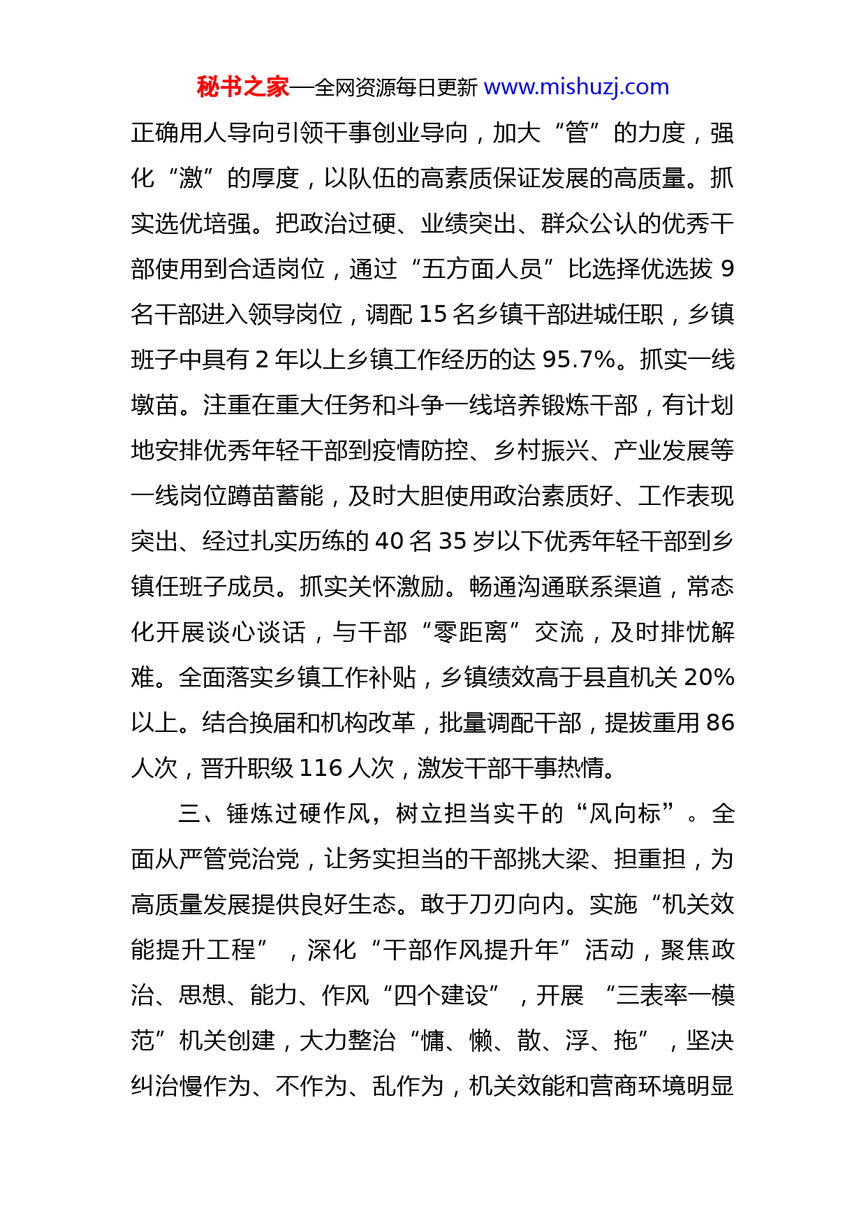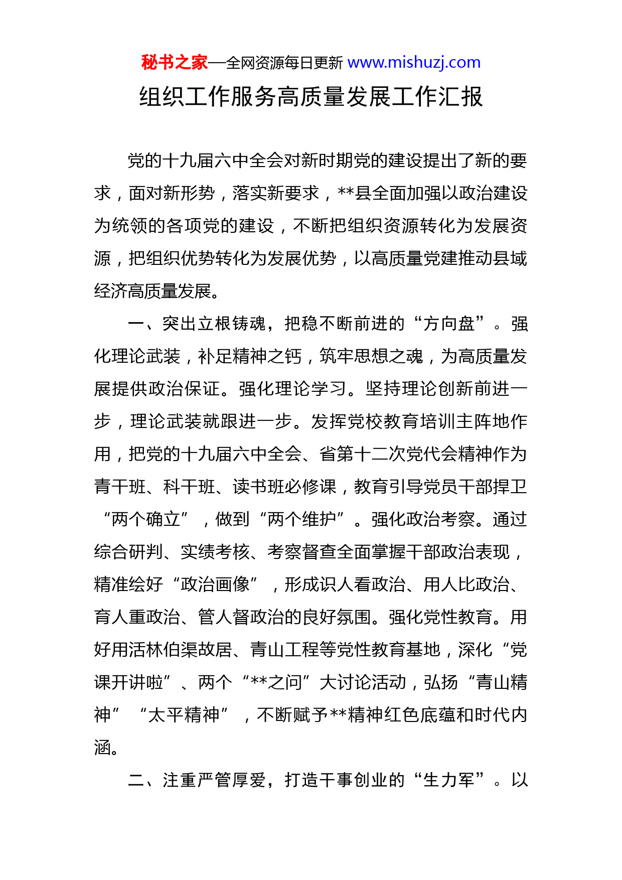 秘书之家—全网资源每日更新www.mishuzj.com组织工作服务高质量发展工作汇报党的十九届六中全会对新时期党的建设提出了新的要求,面对新形势,落实新要求,县全面加强以政治建设为统领的各项党的建设,不断把组织资源转化为发展资源,把组织优势转化为发展优势,以高质量党建推动县域经济高质量发展。一、突出立根铸魂,把稳不断前进的“方向盘”。强化理论武装,补足精神之钙,筑牢思想之魂,为高质量发展提供政治保证。强化理论学习。坚持理论创新前进一步,理论武装就跟进一步。发挥党校教育培训主阵地作用,把党的十九届六中全会、省第十二次党代会精神作为青干班、科干班、读书班必修课,教育引导党员干部捍卫“两个确立”,做到“两个维护”。强化政治考察。通过综合研判、实绩考核、考察督查全面掌握干部政治表现,精准绘好“政治画像”,形成识人看政治、用人比政治、育人重政治、管人督政治的良好氛围。强化党性教育。用好用活林伯渠故居、青山工程等党性教育基地,深化“党课开讲啦”、两个“之问”大讨论活动,弘扬“青山精神”“太平精神”,不断赋予精神红色底蕴和时代内涵。二、注重严管厚爱,打造干事创业的“生力军”。以秘书之家—全网资源每日更新www.mishuzj.com正确用人导向引领干事创业导向,加大“管”的力度,强化“激”的厚度,以队伍的高素质保证发展的高质量。抓实选优培强。把政治过硬、业绩突出、群众公认的优秀干部使用到合适岗位,通过“五方面人员”比选择优选拔9名干部进入领导岗位,调配15名乡镇干部进城任职,乡镇班子中具有2年以上乡镇工作经历的达95.7%。抓实一线墩苗。注重在重大任务和斗争一线培养锻炼干部,有计划地安排优秀年轻干部到疫情防控、乡村振兴、产业发展等一线岗位蹲苗蓄能,及时大胆使用政治素质好、工作表现突出、经过扎实历练的40名35岁以下优秀年轻干部到乡镇任班子成员。抓实关怀激励。畅通沟通联系渠道,常态化开展谈心谈话,与干部“零距离”交流,及时排忧解难。全面落实乡镇工作补贴,乡镇绩效高于县直机关20%以上。结合换届和机构改革,批量调配干部,提拔重用86人次,晋升职级116人次,激发干部干事热情。三、锤炼过硬作风,树立担当实干的“风向标”。全面从严管党治党,让务实担当的干部挑大梁、担重担,为高质量发展提供良好生态。敢于刀刃向内。实施“机关效能提升工程”,深化“干部作风提升年”活动,聚焦政治、思想、能力、作风“四个建设”,开展“三表率一模范”机关创建,大力整治“慵、懒、散、浮、拖”,坚决纠治慢作为、不作为、乱作为,机关效能和营商环境明显秘书之家—全网资源每日更新www.mishuzj.com提升。坚持真抓实干。树立目标导向、问题导向和结果导向,把主要精力放在抓落实上。成立“兴产业、连红线、建新区”三大指挥部,深入推进产业建设、园区攻坚、乡村振兴、城市提质、民生改善“五大行动”,做到“说了就算、定了就干、干就干好”。保持清廉作风。坚持把作风建设引向深入,落实中央八项规定,聚焦“四风”新动向新表现,集中整治不敬畏、不在乎、喊口号、装样子等顽瘴固疾。在全县开展以争创“五强班子”、争当“五好干部”为主要内容的“双争”活动,推动作风建设常态长效。四、坚持人才强县,汇聚创新驱动的“活力源”。树牢人才引领发展的战略地位,全方位培养引进用好人才,为高质量发展提供智力支撑。精准引才汇智。坚持以爱才的诚意、识才的慧眼和聚才的良方广纳天下英才,做大人才总量。紧盯制约产业发展的关键领域、引领未来走向的核心技术,靶向引进高水平人才。以乡村人才“一库一群”为抓手,深挖本土人才2030名并因岗因需使用。创新育才模式。采取本土培训、校企培养、揭榜挂帅模式,选派科技特派员和企业特派员98名助力本土人才培养。与湖南文理学院、湖南财经学院签订校地合作协议,定向培养人才60名。在县工业园区设立人才工作联系点,鼓励企业发布人才需求清单,对紧缺人才择优选送培训。优化留才秘书之家—全网资源每日更新www.mishuzj.com机制。完善人才保障措施,提供全方位优质服务。落实优秀人才奖励办法,为30名人才发放奖励资金76万元,新建人才公寓204套,帮助解决住房、子女入学、配偶就业等实际问题。广泛宣传推介人才典型,认定表彰“工匠”40名。五、优化考核机制,用好绩效评估的“指挥棒”。坚持把绩效评估作为推动工作落实的主抓手,以考核抓落实、以绩效促实效,为高质量发展提供制度性保障。完善考核体系。围绕县委工作主线科学设置考核指标,促进考核体系科学化、规范化。本着“踮起脚摘桃子”的原则,对各项考核指标的设置严格把关,杜绝避实就虚、避重就轻、避高就低。严格考核标准。建立月动态考核、年度定期考核、重点工作专项考核、滞后工作跟踪考核机制,做到制度面前一视同仁。坚持平时考核与年终考核相结合,考人与考事相结合,强化考核的日常动态管理,有效推进工作落实。用好考核结果。将考核结果与奖优罚劣、选拔任用干部结合起来,做到“以实绩论英雄、凭实绩用干部、用实绩兑奖惩”,激励广大干部履职尽责,推动县域经济高质量发展,以实干实绩迎接党的二十大胜利召开。