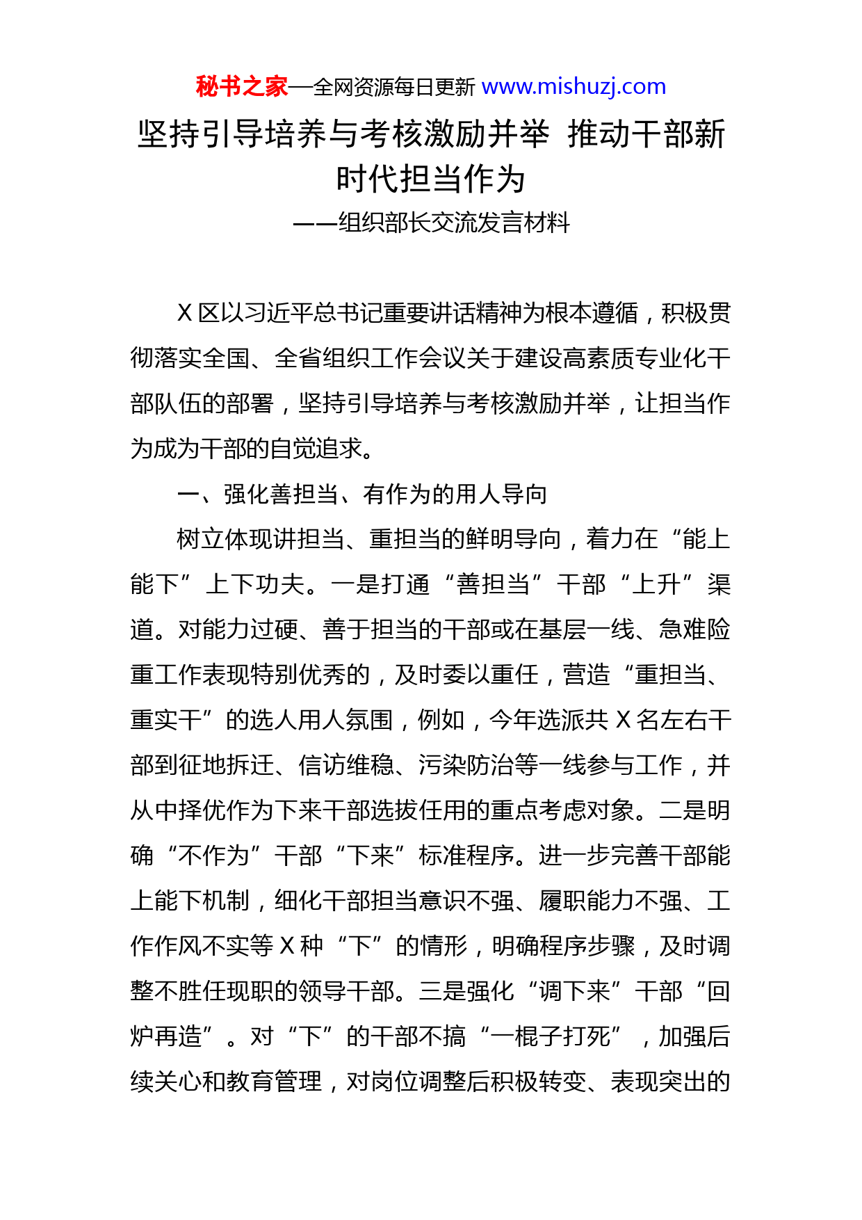 秘书之家—全网资源每日更新www.mishuzj.com坚持引导培养与考核激励并举推动干部新时代担当作为——组织部长交流发言材料X区以习近平总书记重要讲话精神为根本遵循,积极贯彻落实全国、全省组织工作会议关于建设高素质专业化干部队伍的部署,坚持引导培养与考核激励并举,让担当作为成为干部的自觉追求。一、强化善担当、有作为的用人导向树立体现讲担当、重担当的鲜明导向,着力在“能上能下”上下功夫。一是打通“善担当”干部“上升”渠道。对能力过硬、善于担当的干部或在基层一线、急难险重工作表现特别优秀的,及时委以重任,营造“重担当、重实干”的选人用人氛围,例如,今年选派共X名左右干部到征地拆迁、信访维稳、污染防治等一线参与工作,并从中择优作为下来干部选拔任用的重点考虑对象。二是明确“不作为”干部“下来”标准程序。进一步完善干部能上能下机制,细化干部担当意识不强、履职能力不强、工作作风不实等X种“下”的情形,明确程序步骤,及时调整不胜任现职的领导干部。三是强化“调下来”干部“回炉再造”。对“下”的干部不搞“一棍子打死”,加强后续关心和教育管理,对岗位调整后积极转变、表现突出的秘书之家—全网资源每日更新www.mishuzj.com予以进一步使用。二、提升干部队伍素质专业化水平聚焦源头培养、跟踪培养、全程培养的素质培养体系建设,突出抓好选拔培养一批高素质专业化干部。一是抓准专业化招录。统筹谋划全区公务员招录工作,根据紧缺专业情况,重点招录城市规划、X、金融、现代产业等领域专业型干部,缩减基础专业、通用型岗位的招录,提高干部专业化水平;建立股级干部任用预审制度,提升各单位中层干部素质。二是抓实能力培训。围绕新时代、新目标、新部署对专业化的新要求,突出培训的精准化和实效性,有针对性地帮助干部进行知识更新和能力拓展,开展全员“强学习提素能促发展”活动,打造个性化学习模式。三是抓好实践锻炼。有计划安排干部到专业部门跟班学习,到重点岗位、重点工作任务和一线开展实践式学习,选派镇街、区直部门干部交叉挂职和到深圳等先进地区挂职锻炼,给年轻干部压担子、磨意志。三、实施立体化干部考察机制围绕以德为先、任人唯贤、人事相宜的选拔任用体系,强化“立体看人、精准识人”。一是坚持日常了解。把功夫下在平时,开展常态化谈心谈话,坚持每月走访X个单位,不定期开展“一对一”“一对多”“多对一”等方式谈心谈话;联合所在社区党组织,将了解考察干部延秘书之家—全网资源每日更新www.mishuzj.com伸至八小时以外的“生活圈”“朋友圈”,全面了解干部的日常情况。二是坚持盯紧重点。将一线作为检验识别干部的“大赛场”,关注重点领域、重点岗位干部表现,注重在信访维稳、征地拆迁、污染防治等一线考准考实干部,特别是将关键时刻能站出来、危急时刻能冲上去的干部纳入组织视野。三是坚持常态跟踪。完善干部考察长期、动态跟踪机制,既看重要工作和关键时刻表现,又看全部工作和一贯表现,建立全方位反映干部干事创业的电子档案,定期分析研判干部队伍状况,多维度、立体式地给干部“精准画像”。四、推行精准化干部考核评价制度按照建立日常考核、分类考核、近距离考核的知事识人体系部署,强化分类考核,切实解决干与不干、干多干少、干好干坏一个样的问题。一是注重主责主业,考准考实。重点考核干部履职情况,不搞泛滥式考核,逐步清理不科学的政绩“挂钩”、“嫁接”,真正引导干部树立正确政绩观,抓重点、抓主业。二是注重全覆盖个性化考核。根据不同类型考核对象的特点分类实施两种考核模式,一类是以表格化捆绑式绩效考核模式考核X个镇街和X、X等X个区直重点职能部门,另一类是以清单式精准化模式考核其余X个区直单位,实现全区X个单位绩效考核任务全覆盖。三是注重深化结果运用。主要负责人考核结秘书之家—全网资源每日更新www.mishuzj.com果、干部个人绩效奖励与单位差异化考核结果相挂钩,考核结果并作为干部选拔任用、评先奖优、问责追责的重要依据。五、完善干部容错纠错和激励机制把建立崇尚实干、带动担当、加油鼓劲的正向激励体系纳入党建规划,坚持公道公正对待干部,加强干部激励,营造干事创业的良好氛围。一是开展常态化干部谈心谈话。坚持“五必谈”,即岗位调整必谈、状态不佳必谈、情绪波动必谈、家有情况必谈、听到反映必谈;加强纪委与组织部门的工作联动,对苗头性倾向性问题,及时“咬耳扯袖”、批评教育。二是建立容错纠错机制。按“三个区分开来”的要求,细化可容可纠错误的情形,分别建立可容的“免责清单”和不可容的“负面清单”,明确认定程序步骤,旗帜鲜明为敢于担当者撑腰鼓劲,对出现错误的,做好提醒批评。三是加强正面宣传激励。坚持典型引路,让担当者受到关爱、有为者受到褒奖,引导更多干部担当实干、奋发作为,例如结合“七一”表彰、“两代表一委员”推选和评优评先活动,大力选树担当作为的先进典型,激励干部见贤思齐。
