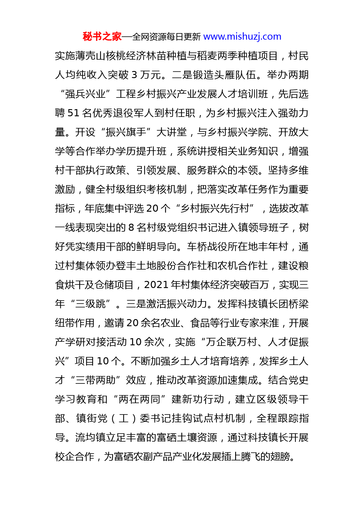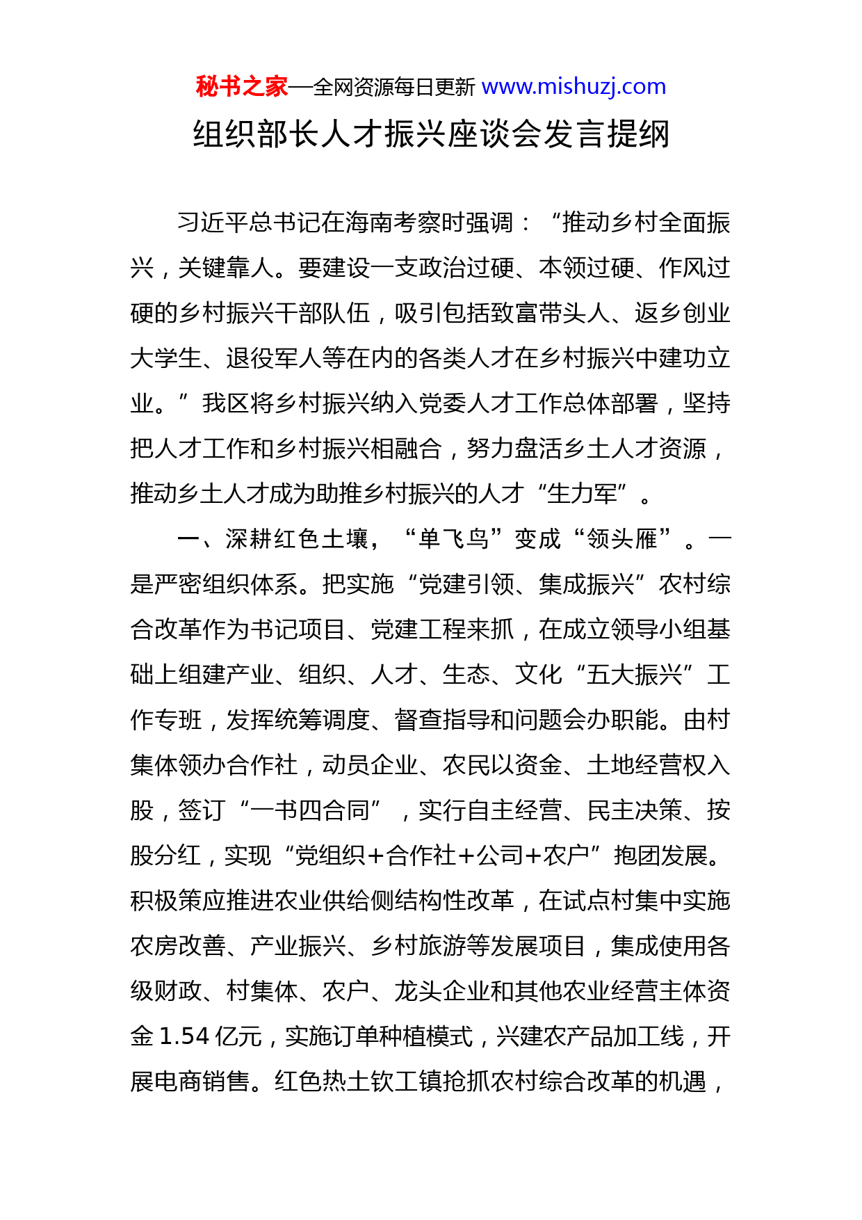 秘书之家—全网资源每日更新www.mishuzj.com组织部长人才振兴座谈会发言提纲习近平总书记在海南考察时强调:“推动乡村全面振兴,关键靠人。要建设一支政治过硬、本领过硬、作风过硬的乡村振兴干部队伍,吸引包括致富带头人、返乡创业大学生、退役军人等在内的各类人才在乡村振兴中建功立业。”我区将乡村振兴纳入党委人才工作总体部署,坚持把人才工作和乡村振兴相融合,努力盘活乡土人才资源,推动乡土人才成为助推乡村振兴的人才“生力军”。一、深耕红色土壤,“单飞鸟”变成“领头雁”。一是严密组织体系。把实施“党建引领、集成振兴”农村综合改革作为书记项目、党建工程来抓,在成立领导小组基础上组建产业、组织、人才、生态、文化“五大振兴”工作专班,发挥统筹调度、督查指导和问题会办职能。由村集体领办合作社,动员企业、农民以资金、土地经营权入股,签订“一书四合同”,实行自主经营、民主决策、按股分红,实现“党组织+合作社+公司+农户”抱团发展。积极策应推进农业供给侧结构性改革,在试点村集中实施农房改善、产业振兴、乡村旅游等发展项目,集成使用各级财政、村集体、农户、龙头企业和其他农业经营主体资金1.54亿元,实施订单种植模式,兴建农产品加工线,开展电商销售。红色热土钦工镇抢抓农村综合改革的机遇,秘书之家—全网资源每日更新www.mishuzj.com实施薄壳山核桃经济林苗种植与稻麦两季种植项目,村民人均纯收入突破3万元。二是锻造头雁队伍。举办两期“强兵兴业”工程乡村振兴产业发展人才培训班,先后选聘51名优秀退役军人到村任职,为乡村振兴注入强劲力量。开设“振兴旗手”大讲堂,与乡村振兴学院、开放大学等合作举办学历提升班,系统讲授相关业务知识,增强村干部执行政策、引领发展、服务群众的本领。坚持多维激励,健全村级组织考核机制,把落实改革任务作为重要指标,年底集中评选20个“乡村振兴先行村”,选拔改革一线表现突出的8名村级党组织书记进入镇领导班子,树好凭实绩用干部的鲜明导向。车桥战役所在地丰年村,通过村集体领办登丰土地股份合作社和农机合作社,建设粮食烘干及仓储项目,2021年村集体经济突破百万,实现三年“三级跳”。三是激活振兴动力。发挥科技镇长团桥梁纽带作用,邀请20余名农业、食品等行业专家来淮,开展产学研对接活动10余次,实施“万企联万村、人才促振兴”项目10个。不断加强乡土人才培育培养,发挥乡土人才“三带两助”效应,推动改革资源加速集成。结合党史学习教育和“两在两同”建新功行动,建立区级领导干部、镇街党(工)委书记挂钩试点村机制,全程跟踪指导。流均镇立足丰富的富硒土壤资源,通过科技镇长开展校企合作,为富硒农副产品产业化发展插上腾飞的翅膀。秘书之家—全网资源每日更新www.mishuzj.com二、创新评价机制,“土专家”变成“真秀才”。一是完善评价体系强保障。建立乡土人才技能等级评价制度,组织开展乡土人才专项能力认定,制定乡土技能人才技师和高级技师直接认定办法、职业农民职称和职业资格衔接办法。放宽对乡村发展急需紧缺人才的岗位总量、职称最高等级和结构比例等方面的限制,采取“四个一批”的方式吸纳优秀乡土人才,即“评审一批”“破格一批”“转评一批”“确认一批”。明确乡土人才评价要素,坚持共通性与特殊性、水平业绩与发展潜力、定性与定量评价相结合,把品德作为乡土人才评价的重要内容,针对不同类别乡土人才明确能力评价的核心指标,重点评价在区域范围内的影响力以及培养传承人等方面实绩。首次开评的乡土人才一步到位设置到正高级,具体分为初级、中级、副高级、正高级四级。在博里镇试点乡土人才专业技术资格申报评审和技能鉴定工作,农民画家潘宇定级为正研究员级馆员(教授),农民画刺绣传承人徐玉兄定级为高级工艺美术师(副教授)。二是突出业绩贡献明导向。突破“学历、论文、身份、年龄”等评审门槛,以实际能力和所作贡献为评价标准,直接认定相应技能等级。探索“以赛代评”“以项目代评”“以贡献定级”,支持各镇街各系统开展乡土人才创新创业大赛和传统技艺技能大赛,获得优异成绩的选手可直接认定技师、高级技师。参秘书之家—全网资源每日更新www.mishuzj.com加职称评审不受学历、专业等限制,不将论文作为必要条件,评价标准设置重点围绕技术水平、群众认可、带动能力、经济社会效益等维度,以在乡村范围作出贡献、发挥示范来衡量。三是鼓励获评人员勇作为。给乡土人才评职称只是手段,目的是鼓励其持续进步提升。对获评职称的人员纳入“科技特派员”管理,在项目资金投入、职业技能培训补贴、土地流转承包经营等方面优先享受政策支持。依托他们组成“农村实用人才讲师团”,就近为当地群众提供技术指导和服务,积极履行乡土人才“传帮带”、建言献策助发展、钻研业务提技能等职责义务。获评职称后的农民、乡土人才,通过“公司+农户”的模式,成立养殖种植一体化合作社、手艺人工作坊等,为乡村振兴贡献力量。三、科技扶持发展,“小产业”书写“大文章”。一是把握科技引领这个“关键”。加强科技扶持、创新经营模式,把科技创新理念融入产业发展的全过程。建立起种植养殖完整质量控制