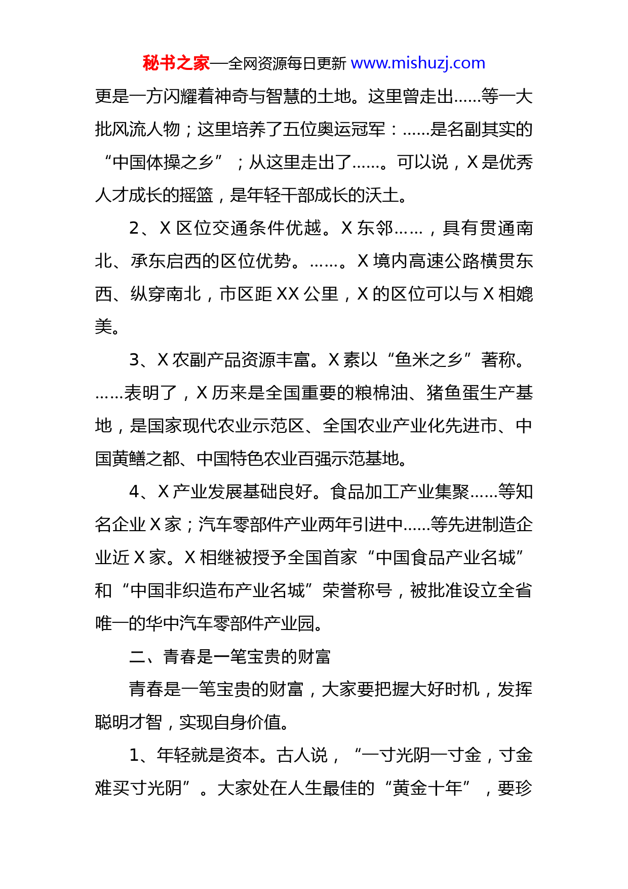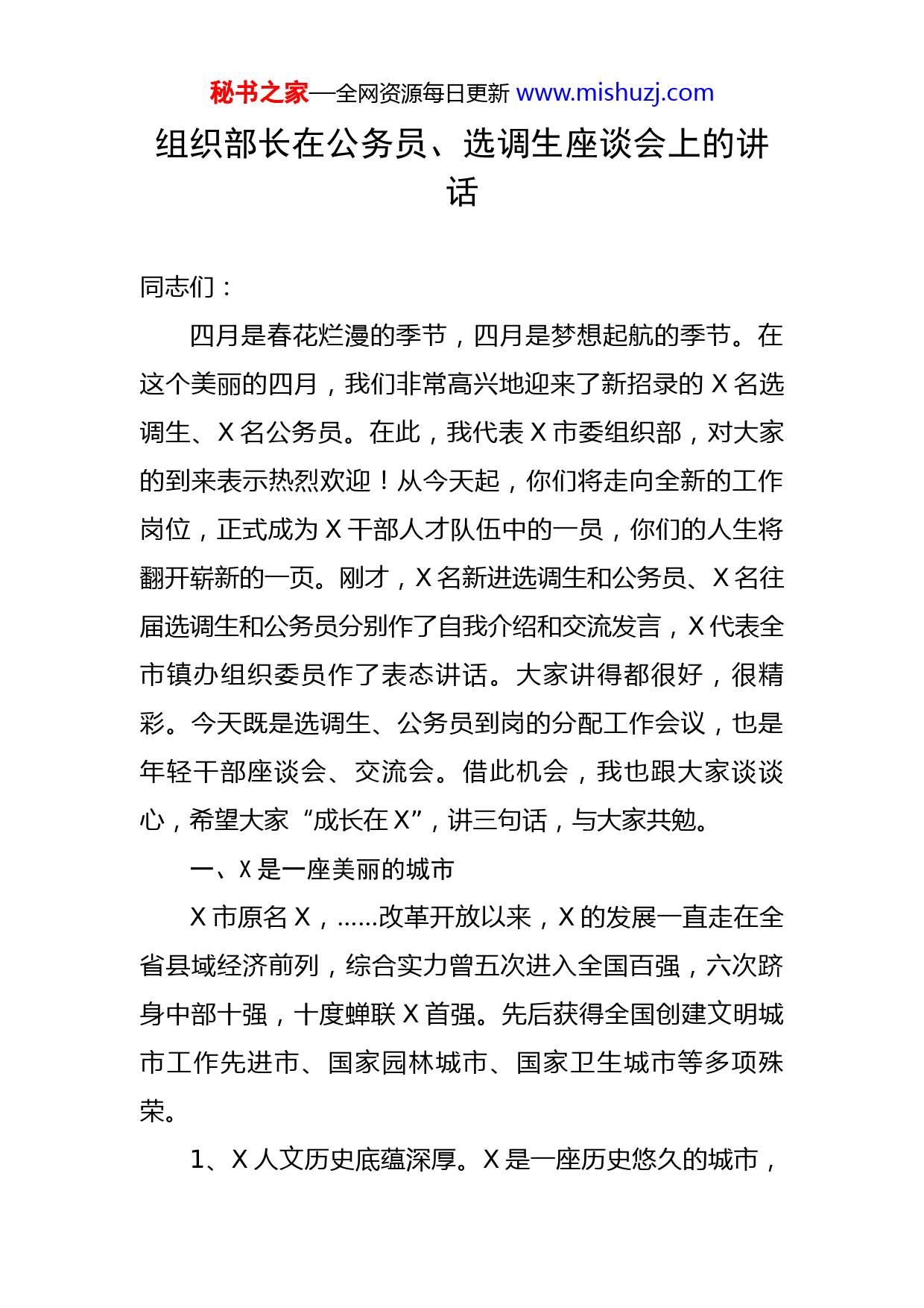 秘书之家—全网资源每日更新www.mishuzj.com组织部长在公务员、选调生座谈会上的讲话同志们:四月是春花烂漫的季节,四月是梦想起航的季节。在这个美丽的四月,我们非常高兴地迎来了新招录的X名选调生、X名公务员。在此,我代表X市委组织部,对大家的到来表示热烈欢迎!从今天起,你们将走向全新的工作岗位,正式成为X干部人才队伍中的一员,你们的人生将翻开崭新的一页。刚才,X名新进选调生和公务员、X名往届选调生和公务员分别作了自我介绍和交流发言,X代表全市镇办组织委员作了表态讲话。大家讲得都很好,很精彩。今天既是选调生、公务员到岗的分配工作会议,也是年轻干部座谈会、交流会。借此机会,我也跟大家谈谈心,希望大家“成长在X”,讲三句话,与大家共勉。一、X是一座美丽的城市X市原名X,……改革开放以来,X的发展一直走在全省县域经济前列,综合实力曾五次进入全国百强,六次跻身中部十强,十度蝉联X首强。先后获得全国创建文明城市工作先进市、国家园林城市、国家卫生城市等多项殊荣。1、X人文历史底蕴深厚。X是一座历史悠久的城市,秘书之家—全网资源每日更新www.mishuzj.com更是一方闪耀着神奇与智慧的土地。这里曾走出……等一大批风流人物;这里培养了五位奥运冠军:……是名副其实的“中国体操之乡”;从这里走出了……。可以说,X是优秀人才成长的摇篮,是年轻干部成长的沃土。2、X区位交通条件优越。X东邻……,具有贯通南北、承东启西的区位优势。……。X境内高速公路横贯东西、纵穿南北,市区距XX公里,X的区位可以与X相媲美。3、X农副产品资源丰富。X素以“鱼米之乡”著称。……表明了,X历来是全国重要的粮棉油、猪鱼蛋生产基地,是国家现代农业示范区、全国农业产业化先进市、中国黄鳝之都、中国特色农业百强示范基地。4、X产业发展基础良好。食品加工产业集聚……等知名企业X家;汽车零部件产业两年引进中……等先进制造企业近X家。X相继被授予全国首家“中国食品产业名城”和“中国非织造布产业名城”荣誉称号,被批准设立全省唯一的华中汽车零部件产业园。二、青春是一笔宝贵的财富青春是一笔宝贵的财富,大家要把握大好时机,发挥聪明才智,实现自身价值。1、年轻就是资本。古人说,“一寸光阴一寸金,寸金难买寸光阴”。大家处在人生最佳的“黄金十年”,要珍秘书之家—全网资源每日更新www.mishuzj.com惜年轻时光,发挥年轻优势。具体而言,就是工作要做到高效,能够迅速处理问题,快速完成任务;生活要做到惜时,能够合理安排、有效利用业余时间,正确处理好工作时间和个人时间的关系,特别是要抓好个人学习,参与社会实践,开阔视野、拓宽思路,竭力完善自我、提升自我。2、青春就是活力。青春是一种朝气,活力是一种激情。是青春就要有朝气,就要有活力。作为年轻人,要有“初生牛犊不怕虎”的精神,有一股顶得上去的冲劲、接得上手的干劲,始终保持一种昂扬向上的工作激情。要常怀明白心。要正确看待自己从事的工作,看待事业的发展,看待社会的进步;我们很年轻,我们有知识,但知识要与实践相结合,青春年华要在实践中积极锻炼,要一分为二看待新情况、分析新问题,不要以偏概全,不要片面看待事物,更不要走马观花、要下马观花,要深入基层、深入实践,正确对待前途和命运,对工作才不会产生厌倦、对事业才不感到迷茫。要常怀进取心。要勇于进取、不甘平庸,面对挫折要振奋精神、迎难而上,始终把追求融入到一件件具体工作中去、融入到我们的生命和血液中去。要常怀纯朴心。只有保持纯朴心,思想才不会滑坡,世界观、人生观、价值观才不会偏向,奋斗目标才不会偏离,才不会迷失自我。秘书之家—全网资源每日更新www.mishuzj.com3、知识就是力量。知识就是力量,知识改变命运。当前,我们正处在一个知识膨胀的时代,知识更新的周期愈来愈短。大家都是青年才俊,有文化、有知识、有学历,是X事业的“好苗子”。但知识也有保质期,不学就会折旧,不用也会过期。比如,过去是用文字发短信,现在是用语音聊微信;过去是到商场买东西,现在是上淘宝去团购;过去刷信用卡很时髦,现在用支付宝是潮流等。这些变化,都是在十年内发生的。所以大家要做有心人,不断“输氧”、“充电”,不断更新丰富知识,既要学习更新课堂上、书本上的知识,更要丰富完善实践中、生活中的知识,努力熟悉政策,精通业务,涵养特长,成为一专多能的复合型人才,为施展才华奠定坚实基础。三、基层是一个广阔的天地基层天地广阔,青年大有可为。只要肯在基层砥砺品行、挥洒汗水,就一定能成就事业、实现梦想。1、基层是实践锻炼的课堂。基层是最大的课堂,实践是最好的老师。我们要以最大的热情投身基层,用火热实践体现自我价值。一要在经济建设主战场建功立业。要充分发挥青年人思维活跃、头脑灵活的优势,主动到招商引资主战场,培养锻炼引资能力、谈判技巧,为项目引进建设服务。二要在新农村建设第一线大显身手。要善于把知识转化为生产技能,积极引导农民发展特色养殖,调整农秘书之家—全网资源每日更新www.mishuzj.com业结构,推进农业规模生产和集约化经营。三要在和谐社会建设最前沿施展才华。要积极参与村民自治、社区建设、企业管理等基层实践活动,自觉同各种影响社会稳