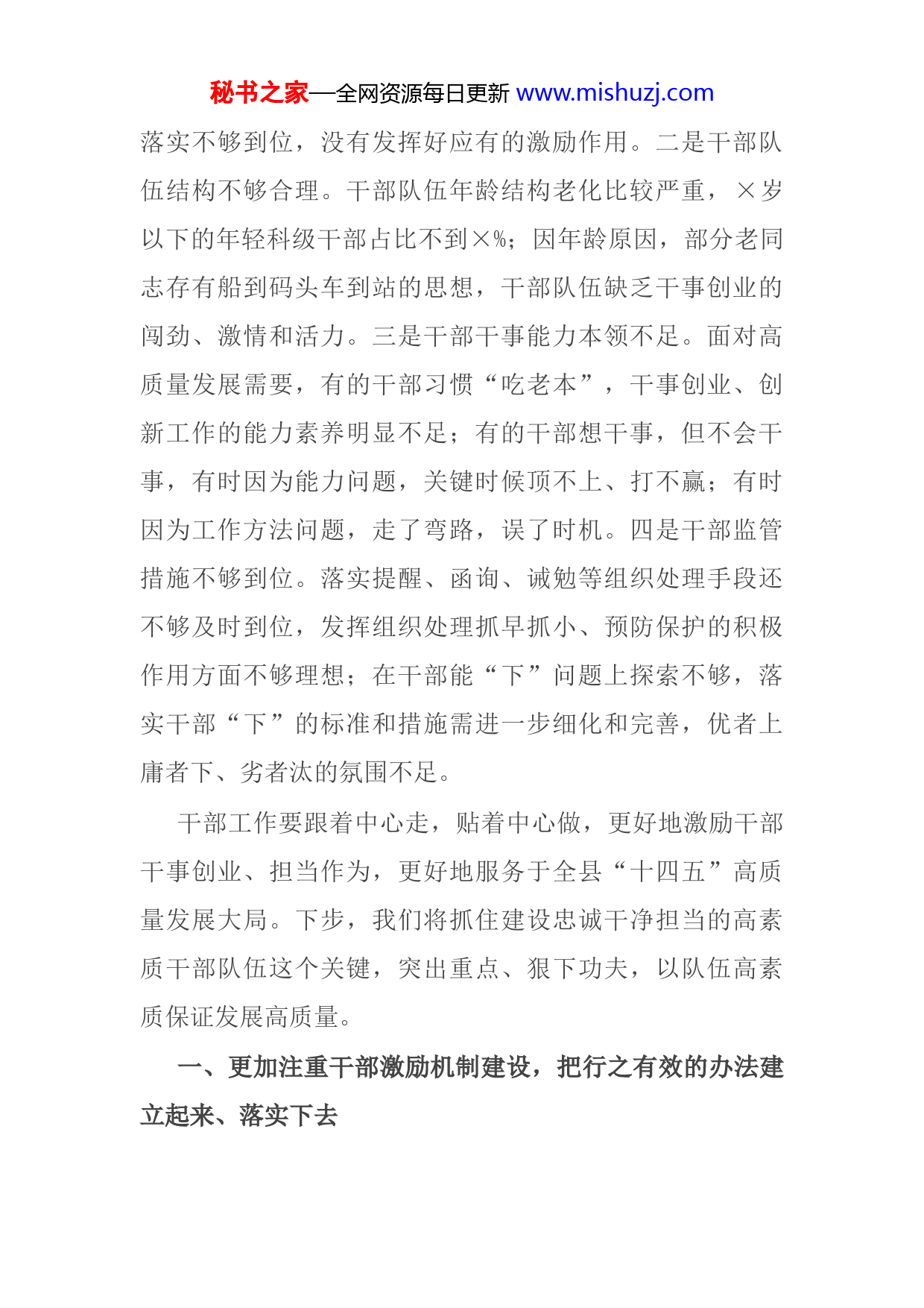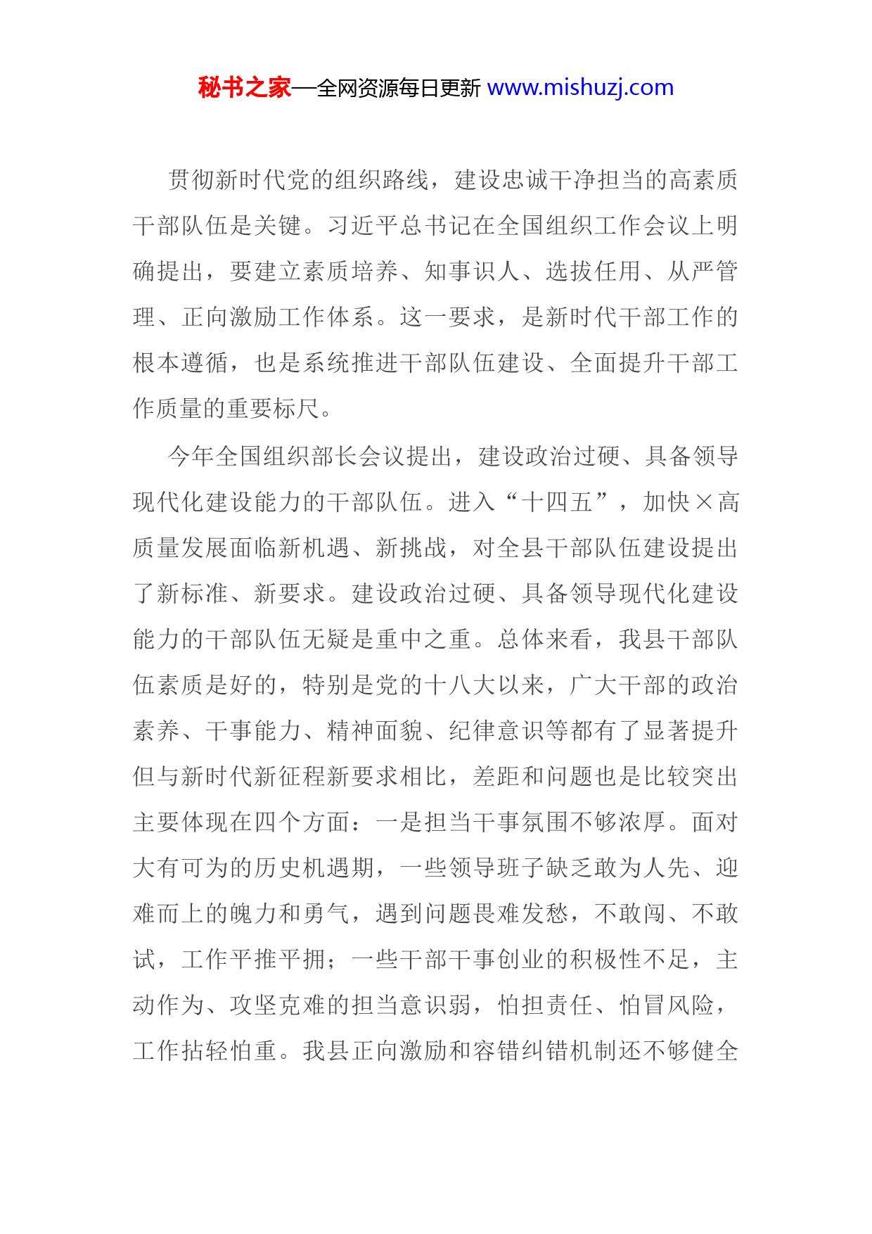 秘书之家—全网资源每日更新www.mishuzj.com贯彻新时代党的组织路线,建设忠诚干净担当的高素质干部队伍是关键。习近平总书记在全国组织工作会议上明确提出,要建立素质培养、知事识人、选拔任用、从严管理、正向激励工作体系。这一要求,是新时代干部工作的根本遵循,也是系统推进干部队伍建设、全面提升干部工作质量的重要标尺。今年全国组织部长会议提出,建设政治过硬、具备领导现代化建设能力的干部队伍。进入“十四五”,加快×高质量发展面临新机遇、新挑战,对全县干部队伍建设提出了新标准、新要求。建设政治过硬、具备领导现代化建设能力的干部队伍无疑是重中之重。总体来看,我县干部队伍素质是好的,特别是党的十八大以来,广大干部的政治素养、干事能力、精神面貌、纪律意识等都有了显著提升但与新时代新征程新要求相比,差距和问题也是比较突出主要体现在四个方面:一是担当干事氛围不够浓厚。面对大有可为的历史机遇期,一些领导班子缺乏敢为人先、迎难而上的魄力和勇气,遇到问题畏难发愁,不敢闯、不敢试,工作平推平拥;一些干部干事创业的积极性不足,主动作为、攻坚克难的担当意识弱,怕担责任、怕冒风险,工作拈轻怕重。我县正向激励和容错纠错机制还不够健全秘书之家—全网资源每日更新www.mishuzj.com落实不够到位,没有发挥好应有的激励作用。二是干部队伍结构不够合理。干部队伍年龄结构老化比较严重,×岁以下的年轻科级干部占比不到×%;因年龄原因,部分老同志存有船到码头车到站的思想,干部队伍缺乏干事创业的闯劲、激情和活力。三是干部干事能力本领不足。面对高质量发展需要,有的干部习惯“吃老本”,干事创业、创新工作的能力素养明显不足;有的干部想干事,但不会干事,有时因为能力问题,关键时候顶不上、打不赢;有时因为工作方法问题,走了弯路,误了时机。四是干部监管措施不够到位。落实提醒、函询、诫勉等组织处理手段还不够及时到位,发挥组织处理抓早抓小、预防保护的积极作用方面不够理想;在干部能“下”问题上探索不够,落实干部“下”的标准和措施需进一步细化和完善,优者上庸者下、劣者汰的氛围不足。干部工作要跟着中心走,贴着中心做,更好地激励干部干事创业、担当作为,更好地服务于全县“十四五”高质量发展大局。下步,我们将抓住建设忠诚干净担当的高素质干部队伍这个关键,突出重点、狠下功夫,以队伍高素质保证发展高质量。一、更加注重干部激励机制建设,把行之有效的办法建立起来、落实下去秘书之家—全网资源每日更新www.mishuzj.com激发干事创业动力,关键是要建立科学合理的激励机制。中央、省、市出台的激励干部担当作为干事创业政策文件为激励广大干部在新时代更好地担当作为、改革创新提供了制度保障。当前,我县深化供给侧结构性改革、全面推进乡村振兴、统筹发展和安全等工作任务繁重,矛盾风险挑战增多,迫切需要进一步解放思想,拿出更加务实管用的办法来激励干部干事创业、担当作为。一是突出正向激励,激发干事创业的强大动力。根据省委《关于进一步激励干部新时代新担当新作为的实施意见》及后续各级的配套措施,结合我县实际,在去年出台的正向激励办法基础上,细化激励措施,实施精准奖励,制定《×县干部担当作为奖励办法》,设置争先进位、重点工作推进、突出贡献、创新创优等奖项,体现工作实绩与物质奖励关联度,根据岗位职责、责任大小、贡献多少,实行差异化分配,通过实实在在的物质奖励、经济奖励,激发干部干事创业热情。二是列出负面清单,让干部远离雷区、不越红线。制定《干部不得提拔重用的情形》,明确包括工作“挑肥拣瘦”、不敢触碰矛盾等×种不得提拔重用的情形,让干部可对照、组织好判断、普遍能执行,真正使广大干部心有所畏、行有所止。三是加强关心关爱,切实为担当干事的干部鼓劲撑腰。激励干部必须把关心关爱的各项措施落到实处。要工作上支持,切实履行好组织部门职责,为担秘书之家—全网资源每日更新www.mishuzj.com当者担当,为负责者负责,对符合容错免责情形的干部,确定“不作负面评价、不影响考核成绩、不影响评先树优不影响提拔使用”的“四不”底线。及时为受不实反映和诬告的干部澄清正名,坚决查处恶意诬告陷害行为;要待遇上保障,执行好公务员职务与职级并行、机关事业单位基本工资标准调整机制,落实好体检、休假、调休等制度保证正常福利,保障合法权益,让每一名干部工作生活更有尊严、更有保障、更有盼头;要心理上关怀,开展经常性谈心谈话,及时为干部解疑释惑、加油鼓劲,让广大干部心无旁骛,轻松上阵。二、更加注重实干实绩的用人导向,把忠诚干净担当的好干部选出来、用起来选人用人的本质,是围绕事业发展把干部选准用好,把班子调优配强。面对新时代新征程,必须坚持从事业出发进一步倡树导向,坚持标准,更加扎实有效地做好干部选任各项工作。一是树立鲜明的选人用人导向。在评价干部选任干部上,县委一直“五个大力选用,五个坚决不用”具体操作中,需要既看干部在日常工作中的担当,又看干部在大事要事难事中的表现,下步,我们将突出提拔重用那些在重大任务中敢于担当、锐意改革的干部,在改革发展一线埋头苦干、真抓实干的干