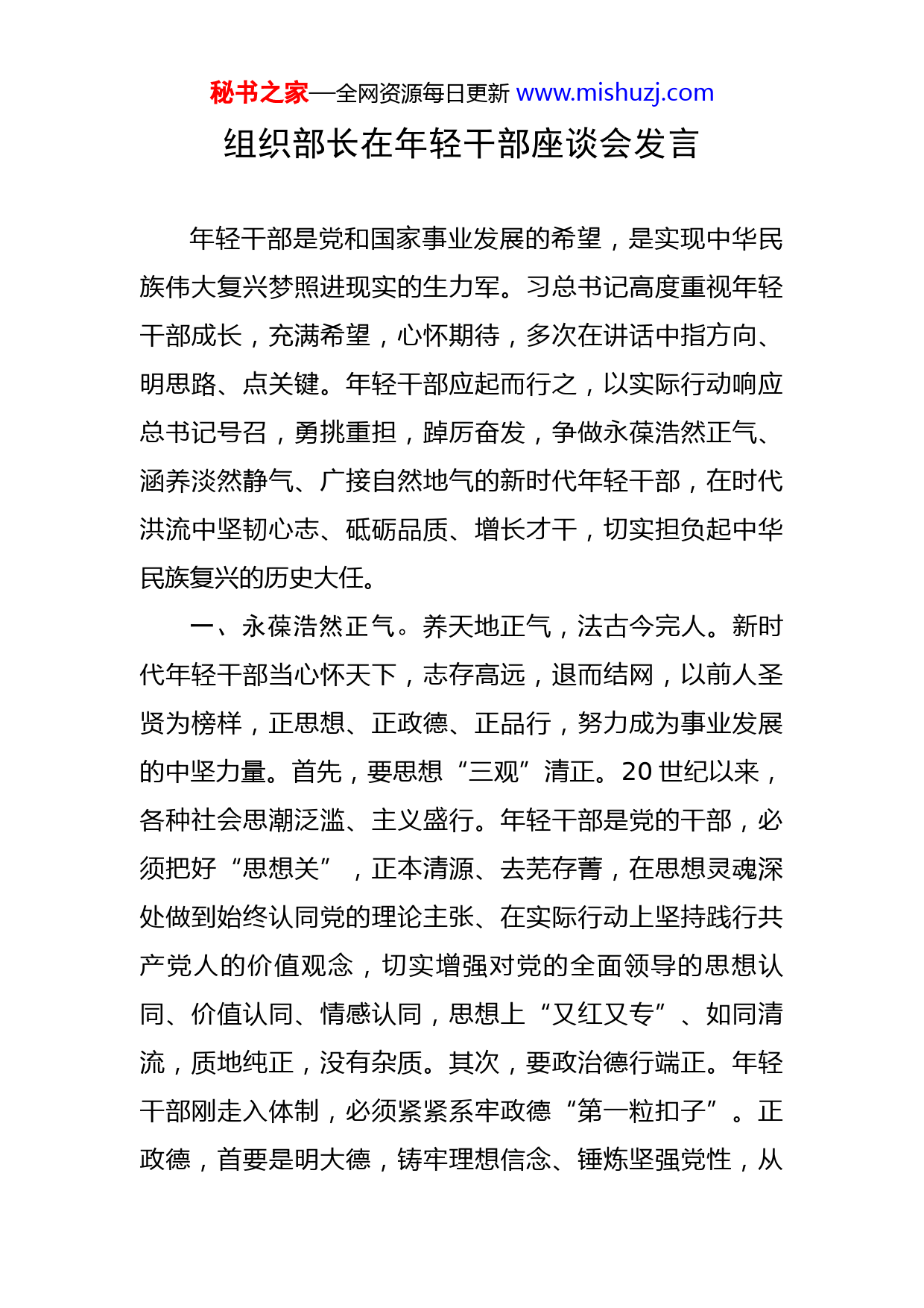 秘书之家—全网资源每日更新www.mishuzj.com组织部长在年轻干部座谈会发言年轻干部是党和国家事业发展的希望,是实现中华民族伟大复兴梦照进现实的生力军。习总书记高度重视年轻干部成长,充满希望,心怀期待,多次在讲话中指方向、明思路、点关键。年轻干部应起而行之,以实际行动响应总书记号召,勇挑重担,踔厉奋发,争做永葆浩然正气、涵养淡然静气、广接自然地气的新时代年轻干部,在时代洪流中坚韧心志、砥砺品质、增长才干,切实担负起中华民族复兴的历史大任。一、永葆浩然正气。养天地正气,法古今完人。新时代年轻干部当心怀天下,志存高远,退而结网,以前人圣贤为榜样,正思想、正政德、正品行,努力成为事业发展的中坚力量。首先,要思想“三观”清正。20世纪以来,各种社会思潮泛滥、主义盛行。年轻干部是党的干部,必须把好“思想关”,正本清源、去芜存菁,在思想灵魂深处做到始终认同党的理论主张、在实际行动上坚持践行共产党人的价值观念,切实增强对党的全面领导的思想认同、价值认同、情感认同,思想上“又红又专”、如同清流,质地纯正,没有杂质。其次,要政治德行端正。年轻干部刚走入体制,必须紧紧系牢政德“第一粒扣子”。正政德,首要是明大德,铸牢理想信念、锤炼坚强党性,从秘书之家—全网资源每日更新www.mishuzj.com灵魂深处捍卫“两个确立”,做到“两个维护”;重要是讲公德,牢固树立群众观念,践行群众路线,全心全意为人民服务,着力为人民群众解决烦心事、揪心事、操心事;至要是严私德,常鸣法纪警钟,心存言行敬畏,不越底线、不触红线、不碰高压线。再者,要为人处世方正。年轻干部刚拉开人生大幕,不是要去高谈阔论远大人生理想,而是要知道今天要干什么事,干的是不是有益的事,时时处处都要明白个人“有所爱、有所恶、有所为、有所不为”,不管走多远,都能做到本性不变、初心不改,做正派之人、传递正能量。二、涵养淡然静气。非淡泊无以明志,非宁静无以致远。静气是一种大修养、大胸怀、大智慧、大境界。在这个崇尚自由个性、虚无主义盛行、思想浮躁不安的年代,年轻干部特别要下足“养静”功夫,不为声色犬马所动、不为功名利禄所累,掌握好“方寸胸怀”,涵养淡然静气,修好立德立业“主功课”。一是要静得下心学习思考。“静而后能安,安而后能虑,虑而后能得”。年轻干部要像毛主席一样于车水马龙的闹市读书,学会屏蔽外界种种诱惑干扰,专心致志地把更多地时间和精力用于学习新思想、新技能、主业务,以辩证的眼光和正确的视角思考国家政策、社会现象和个人问题,不断修正“三观”,调整状态再出发。二是要沉得住气不浮不躁。面对别人晋秘书之家—全网资源每日更新www.mishuzj.com级升迁,作为年轻干部要做到不浮不躁,不埋不怨,要时刻想想,别人为什么能升迁,工作有什么成效,与之相比自己有什么差距。还要沉下心来,专注于自我的逐步强大,把手上的工作做好,把个人的升迁交给组织,尊重组织的认同,服从组织的安排、感恩组织的培养。三是要安得住神稳重踏实。年轻干部入职不久,想的更多的应该是如何在职场中迅速进入角色,如何拥有抓好落实、做好工作的技能,不受外界负面信息干扰、不被种种诱惑享乐所奴役,既不能躺平内卷,自甘堕落,也不能两眼看天,好高骛远,一步一个脚印踏实工作,稳扎稳打做好手上事、当前事、琐事小事。三、广接自然地气。脚踏实地,才能更好仰望星空。年轻干部理想抱负远大,但须牢记树高千尺不离其根,江逐万里不舍其源,接好“地气”才能更有成长“底气”。一要先当学生,再当先生。年轻干部学历高、见识多、业务能力强,但“一定要有眼睛向下的决心和甘当小学生的精神”,克服心高气傲、自恃无物、颐指气使的不良心态,放下高高在上的架子,稳住漂浮躁动的性子,拉下虚无缥缈的面子,以“人人可为我师”逐步转变到“可为多数人师”。二要汲取基层智慧、广交群众朋友。基层工作包罗万象,基层问题形形色色,不是靠校园里读那几本书本就能完全解决、一劳永逸的。而经验在基层、智慧在基秘书之家—全网资源每日更新www.mishuzj.com层、创新在基层,广交群众朋友,向他们学习工作“套路”、基层“真金”、人生“智慧”,为开启干部“职业路”,当好人民“勤务员”打下坚实基础。三是历练强大内心,接受风雨历练。有风有雨是常态。人生也好,工作也罢,不可能一马平川、顺风顺水,总要转几道弯、爬几道岗、翻几道梁,青年干部要正确认识工作生活中的坎坷、困难,始终保持正常健康心态,不灰心、不丧气、不放弃。风雨兼程是状态。既然有风有雨,那就备好雨衣、雨伞,迎接一切困难和问题,接受检验和洗礼,以随时准备着的状态面对工作生活。风雨无阻是心态。年轻干部的路还很长,还有很多人生美好的事物在未来,那么就要以“不破楼兰终不还”的坚定决心,以“功成不必在我,功成必定有我”的信念担当,不断增强斗争本领,不断提高斗争艺术,在斗争中淬炼成钢,做好中华民族伟大复兴事业的“一块砖”。