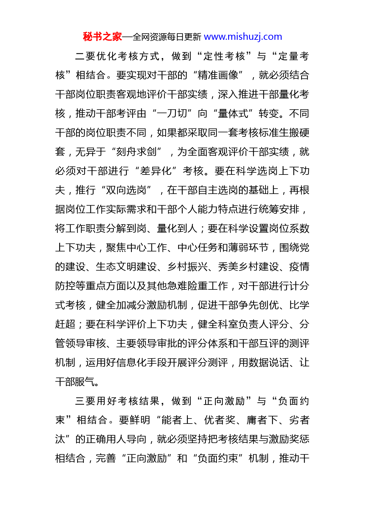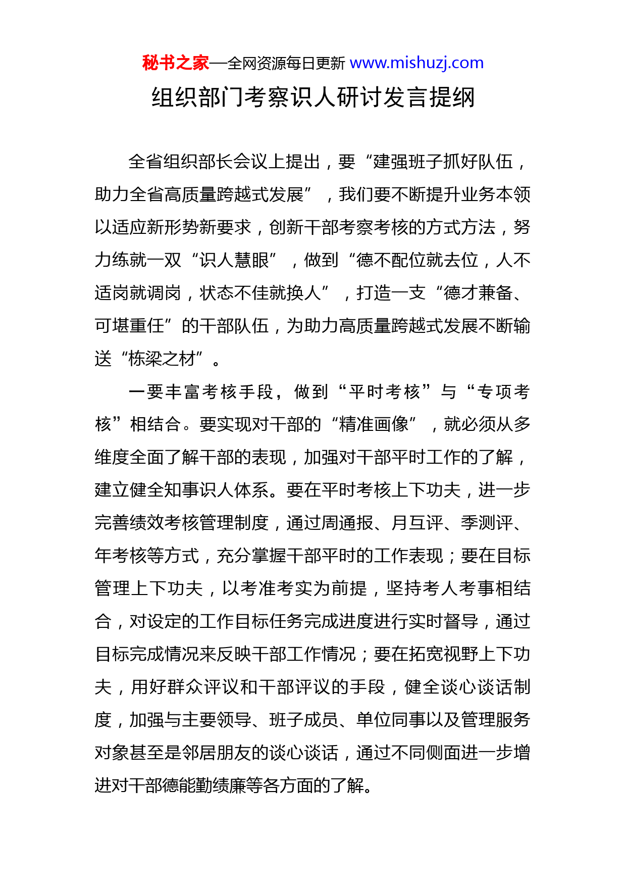 秘书之家—全网资源每日更新www.mishuzj.com组织部门考察识人研讨发言提纲全省组织部长会议上提出,要“建强班子抓好队伍,助力全省高质量跨越式发展”,我们要不断提升业务本领以适应新形势新要求,创新干部考察考核的方式方法,努力练就一双“识人慧眼”,做到“德不配位就去位,人不适岗就调岗,状态不佳就换人”,打造一支“德才兼备、可堪重任”的干部队伍,为助力高质量跨越式发展不断输送“栋梁之材”。一要丰富考核手段,做到“平时考核”与“专项考核”相结合。要实现对干部的“精准画像”,就必须从多维度全面了解干部的表现,加强对干部平时工作的了解,建立健全知事识人体系。要在平时考核上下功夫,进一步完善绩效考核管理制度,通过周通报、月互评、季测评、年考核等方式,充分掌握干部平时的工作表现;要在目标管理上下功夫,以考准考实为前提,坚持考人考事相结合,对设定的工作目标任务完成进度进行实时督导,通过目标完成情况来反映干部工作情况;要在拓宽视野上下功夫,用好群众评议和干部评议的手段,健全谈心谈话制度,加强与主要领导、班子成员、单位同事以及管理服务对象甚至是邻居朋友的谈心谈话,通过不同侧面进一步增进对干部德能勤绩廉等各方面的了解。秘书之家—全网资源每日更新www.mishuzj.com二要优化考核方式,做到“定性考核”与“定量考核”相结合。要实现对干部的“精准画像”,就必须结合干部岗位职责客观地评价干部实绩,深入推进干部量化考核,推动干部考评由“一刀切”向“量体式”转变。不同干部的岗位职责不同,如果都采取同一套考核标准生搬硬套,无异于“刻舟求剑”,为全面客观评价干部实绩,就必须对干部进行“差异化”考核。要在科学选岗上下功夫,推行“双向选岗”,在干部自主选岗的基础上,再根据岗位工作实际需求和干部个人能力特点进行统筹安排,将工作职责分解到岗、量化到人;要在科学设置岗位系数上下功夫,聚焦中心工作、中心任务和薄弱环节,围绕党的建设、生态文明建设、乡村振兴、秀美乡村建设、疫情防控等重点方面以及其他急难险重工作,对干部进行计分式考核,健全加减分激励机制,促进干部争先创优、比学赶超;要在科学评价上下功夫,健全科室负责人评分、分管领导审核、主要领导审批的评分体系和干部互评的测评机制,运用好信息化手段开展评分测评,用数据说话、让干部服气。三要用好考核结果,做到“正向激励”与“负面约束”相结合。要鲜明“能者上、优者奖、庸者下、劣者汰”的正确用人导向,就必须坚持把考核结果与激励奖惩相结合,完善“正向激励”和“负面约束”机制,推动干秘书之家—全网资源每日更新www.mishuzj.com部能上能下。要在科学选人用人上下功夫,将考核结果与干部提拔重用、职级晋升相结合,将那些平时考核看得出来、关键时刻站的出来、危急关头豁得出来的干部用起来,让有为者有位;要在激励担当作为上下功夫,对考核中排名靠前的干部要予以褒奖,在年度考核评定为优秀等次时应予以倾斜,落实好绩效奖金的发放,切实让实干者得实惠,激发干部干事热情;要在问责追责上下功夫,对考核中排名靠后的干部要进行批评教育,开展政治谈话,对确实德不配位的要敢于去其位,确实人不适岗的要根据干部特点和岗位需求进行调整换岗,确实状态不佳的,要果断予以组织调整,在干部能上能下中鲜明导向,打造“信念坚定、为民服务、勤政务实、敢于担当、清正廉洁”的干部队伍。