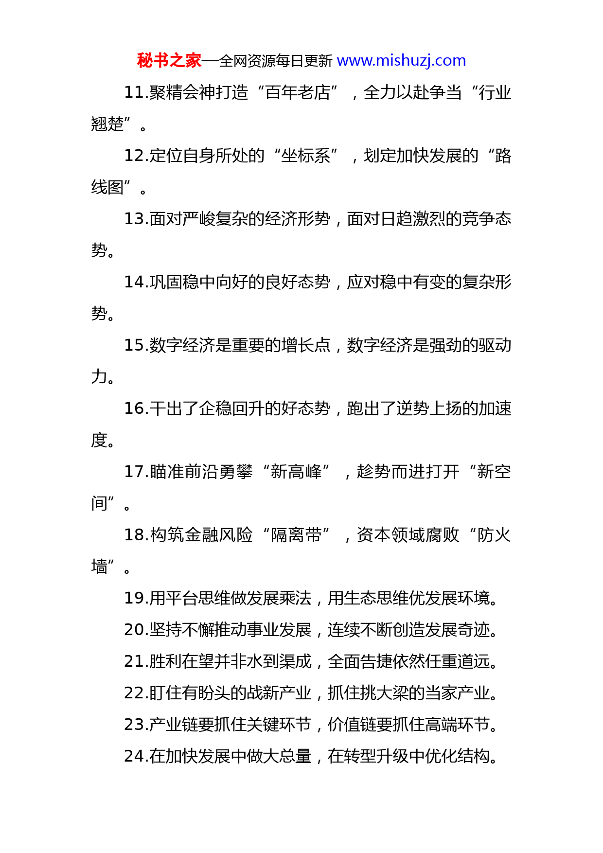 秘书之家—全网资源每日更新www.mishuzj.com经济发展类过渡句50例1.体现的是稳中求进、稳进并举的工作基调,彰显的是危中取机、化危为机的进取姿态,2.用“眼球效应”构筑“投资效应”,以“注意指数”拉动“发展指数”。3.核心是要突出特色、闯出新路,关键是要统筹谋划、高效推进。4.盘活存量土地,才能打开空间;释放亩产潜能,才能激发活力。5.经济发展面临的新机遇新挑战,基层治理面临的新特点新变化。6.担当“走在前”的关键变量,扛牢“开新局”的重要责任。7.激荡出生机勃勃的发展气象,传递出凿凿可据的强劲信号。8.把发展信心转化为实际行动,把良好机遇转化为竞争优势。9.不找“减”和“降”的理由,要找“加”和“快”的条件。10.以“稳”的定力实现“保”,以“进”的作为实现“稳”。秘书之家—全网资源每日更新www.mishuzj.com11.聚精会神打造“百年老店”,全力以赴争当“行业翘楚”。12.定位自身所处的“坐标系”,划定加快发展的“路线图”。13.面对严峻复杂的经济形势,面对日趋激烈的竞争态势。14.巩固稳中向好的良好态势,应对稳中有变的复杂形势。15.数字经济是重要的增长点,数字经济是强劲的驱动力。16.干出了企稳回升的好态势,跑出了逆势上扬的加速度。17.瞄准前沿勇攀“新高峰”,趁势而进打开“新空间”。18.构筑金融风险“隔离带”,资本领域腐败“防火墙”。19.用平台思维做发展乘法,用生态思维优发展环境。20.坚持不懈推动事业发展,连续不断创造发展奇迹。21.胜利在望并非水到渠成,全面告捷依然任重道远。22.盯住有盼头的战新产业,抓住挑大梁的当家产业。23.产业链要抓住关键环节,价值链要抓住高端环节。24.在加快发展中做大总量,在转型升级中优化结构。秘书之家—全网资源每日更新www.mishuzj.com25.新要素新动能难以聚集,新业态新产业难以催生。26.目标任务面临提档升级,战术打法更需与时俱进。27.用好财政的“真金白银”,引入金融的“源头活水”。28.速度上不去就会撂后面,高度上不去就会栽跟头。29.以新思路寻找新出路,以新理念引领新发展。30.快速发展的坚固基石,登高腾跃的强劲动力。31.当好发展“桥头堡”,打造品质“样板区”。32.闯出发展“新路径”,跑出发展“加速度”。33.立足新的历史方位,厚载新的发展势能。34.吃干榨尽上级政策,迭代升级自身政策。35.标注着发展的高度,丈量着发展的幅度。36.抓实“稳”的举措,保持“进”的步伐37.压实“稳”的底盘,扩大“进”的成效。38.着力提升城市能级,加快产业裂变升级。39.处处有蓬勃朝气,业业有生机活力。40.目标增速不变,工作干劲不松。41.集中优势资源,集聚各方力量。42.以安全促发展,以发展保安全。43.抓好重点任务,打好重要战役。44.集聚规模最大,虹吸力量最强。45.释放协同效应,集聚发展优势。秘书之家—全网资源每日更新www.mishuzj.com46.增速换挡之变,结构调整之痛。47.在发展中调整,在调整中优化。48.蹚出新的路子,找到最佳路径。49.稳住支撑点,抓住增长点。50.减速不减势,质优量也增。