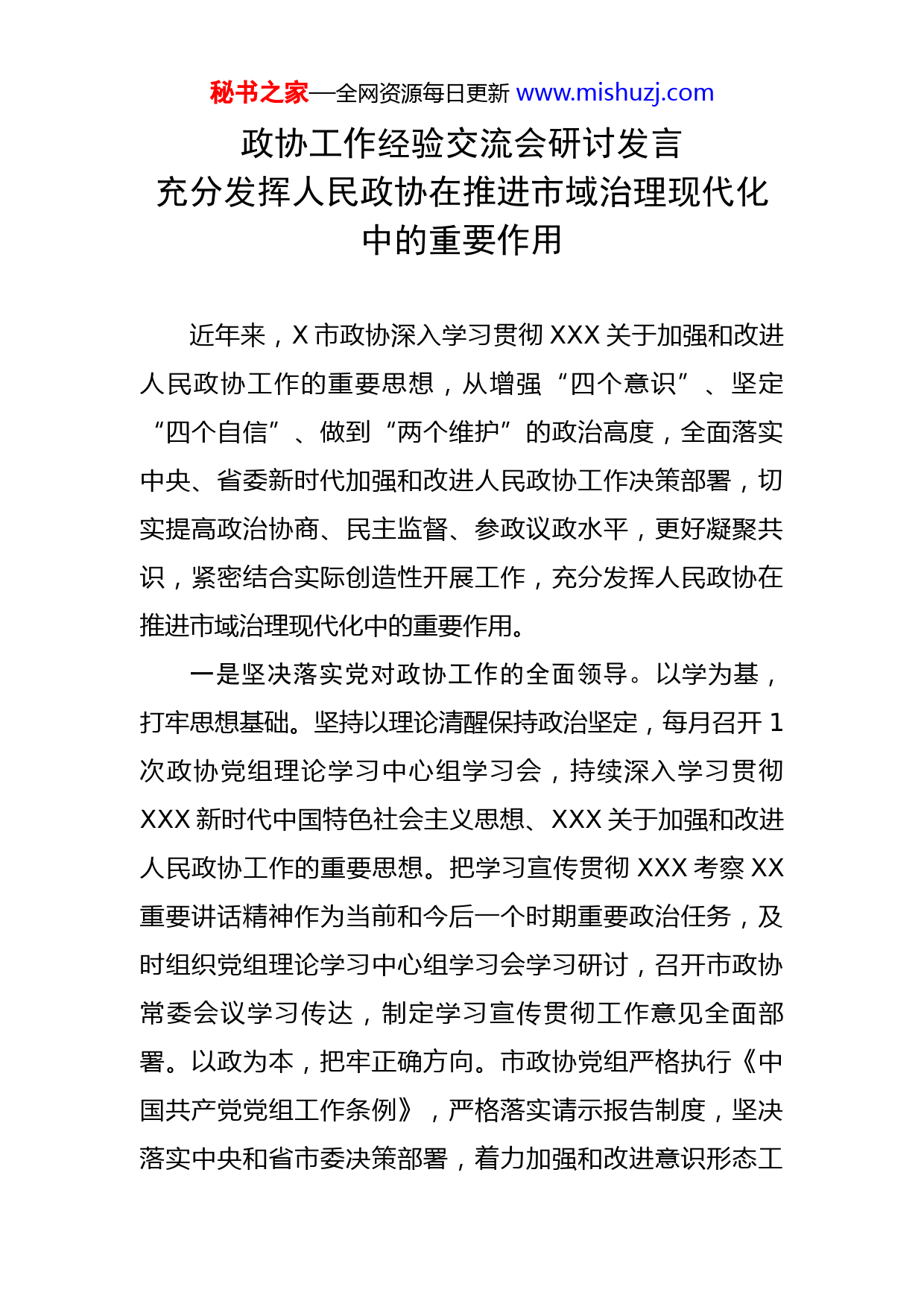 秘书之家—全网资源每日更新www.mishuzj.com政协工作经验交流会研讨发言充分发挥人民政协在推进市域治理现代化中的重要作用近年来,X市政协深入学习贯彻XXX关于加强和改进人民政协工作的重要思想,从增强“四个意识”、坚定“四个自信”、做到“两个维护”的政治高度,全面落实中央、省委新时代加强和改进人民政协工作决策部署,切实提高政治协商、民主监督、参政议政水平,更好凝聚共识,紧密结合实际创造性开展工作,充分发挥人民政协在推进市域治理现代化中的重要作用。一是坚决落实党对政协工作的全面领导。以学为基,打牢思想基础。坚持以理论清醒保持政治坚定,每月召开1次政协党组理论学习中心组学习会,持续深入学习贯彻XXX新时代中国特色社会主义思想、XXX关于加强和改进人民政协工作的重要思想。把学习宣传贯彻XXX考察XX重要讲话精神作为当前和今后一个时期重要政治任务,及时组织党组理论学习中心组学习会学习研讨,召开市政协常委会议学习传达,制定学习宣传贯彻工作意见全面部署。以政为本,把牢正确方向。市政协党组严格执行《中国共产党党组工作条例》,严格落实请示报告制度,坚决落实中央和省市委决策部署,着力加强和改进意识形态工秘书之家—全网资源每日更新www.mishuzj.com作,充分发挥把方向、管大局、保落实的重要作用。全面贯彻落实中央和省委、市委政协工作会议精神,协助市委出台《关于新时代加强和改进人民政协工作的实施意见》,以迎接省委专项督查为契机,深入区县就有关会议和文件精神贯彻落实情况开展专题调研,总结经验、查找不足、推动落实。以建为要,筑牢组织基石。协助市委出台《关于加强新时代人民政协党的建设工作的实施意见》,去年全面完成“全员入委”,今年X月在8个专委会成立了功能型党支部,党员委员全部编入党支部,创立“党建引领、委员说是”大讲堂,搭建各功能型党支部加强思想政治引领和发挥党员委员先锋模范作用新平台,推动“两个全覆盖”更好落地落实。二是充分发挥专门协商机构作用。提高协商质量。两年多来,围绕乡村振兴、融杭接沪、民营经济、茶业振兴等主题,开展专题协商、对口协商、界别协商、提案办理协商等重点协商活动XX次,市委、市政府负责同志批示建议案和建议XX次。制定出台《X市政协加强和改进调研工作实施办法》,加强调研谋划、方案制定、过程管控,改进调研队伍构成、方式方法、组织实施,切实提高建言质量。推动成果转化。构建党委出题、政协调研、政府采纳、部门落实的协商成果转化模式。如,本届市政协首次资政会聚焦乡村振兴战略实施,市委、市政府认真听取关秘书之家—全网资源每日更新www.mishuzj.com于争创国家生态文明建设示范市、打造践行“两山”理论样板区的建议,去年X月正式启动示范市争创工作;采纳关于谋划建设山水生态旅游走廊的建议,共建杭黄世界级自然生态和文化旅游廊道写入今年X月签订的XX两省战略合作框架协议。营造良好氛围。政协重要会议和重大活动,都及时邀请市委、市政府负责同志到会听取建议、通报情况、商讨问题,推动形成既畅所欲言、各抒己见,又理性有度、合法依章的良好协商氛围。推动“人民政协理论进党校”,政协理论成为党校(行政学院)培训必修课,促使各级党政领导干部更加重视政协工作,为政协开展工作创造良好环境。三是紧扣推动高质量发展献计出力。助力深化拓展新安江流域生态补偿机制试点。对内深入调研、建言献策,市委主要负责同志对调研报告充分肯定,很多建议意见被直接吸收纳入工作部署;对外加强交流、寻求合作,与XX市政协就新安江——千岛湖生态补偿试验区建设开展联动调研;对上积极争取、多方呼吁,使之成为省政协年度重点协商议题和全国政协双周协商议题,为深化试点改革发挥了政协作用。助力夺取疫情防控和经济社会发展“双胜利”。新冠肺炎疫情防控期间,第一时间印发《致广大政协委员的一封信》,第一时间组织全市政协系统和委员开展募捐活动,第一时间下发《关于深入贯彻中央和省市委秘书之家—全网资源每日更新www.mishuzj.com决策部署共同打赢疫情防控人民战争总体战阻击战的通知》,全市政协组织和政协委员捐款捐物共计XXX多万元,《中国政协杂志》以《XX省X市政协:汇聚起抗击疫情的磅礴力量》为题给予重点报道。助力编制“十四五”规划。发放“畅想X未来五年,听你说”专项调查问卷XXX多份,收集创新开放、融杭接沪、产业升级、城乡统筹、社会民生等方面调研报告近XX篇、建议XXX条,上报《市政协助力“十四五”、共绘新蓝图建言献策XX条》,为编制体现时代要求、契合X实际的“十四五”规划提供了政协智慧。四是更好履行凝聚共识重要职能。教育引领增信心。开展庆祝人民政协成立XX周年征文活动、编印《我与人民政协》文集,举办“庆祝新中国成立XX周年暨人民政协成立XX周年”书画作品展,XX位X政协人、XX多位政协书画院艺术家,通过笔墨和文字,讴歌人民政协历史贡献,增强人民政协制度自信。实践履职谋共识。坚持建言资政和凝聚共识双向发力,发挥人民政协在关键时刻的主动引领作用,在今年X月历史罕见洪涝灾害中,市政协及时向全市各级政协组织、政协各参加单位和广大政协委员发出倡议书,要求迅速把行动