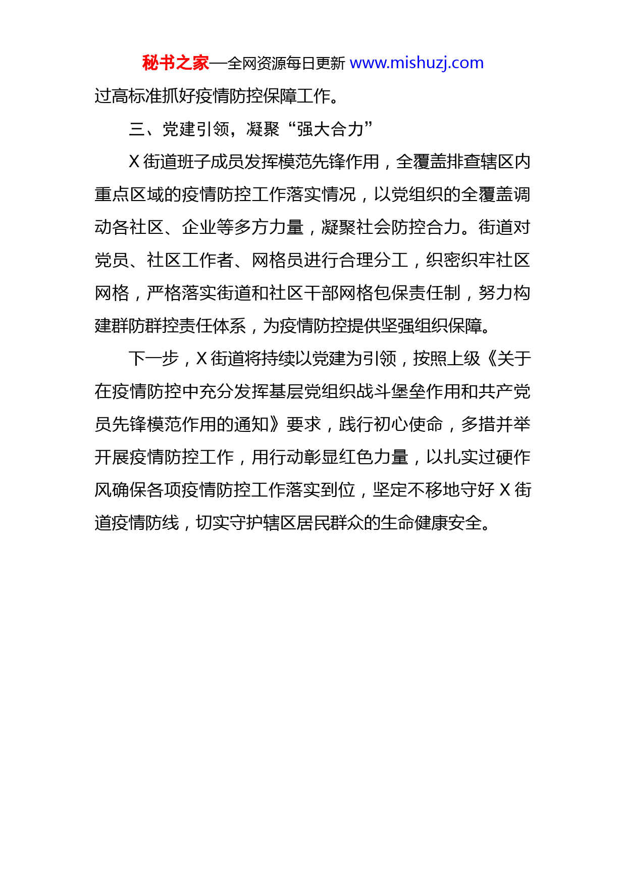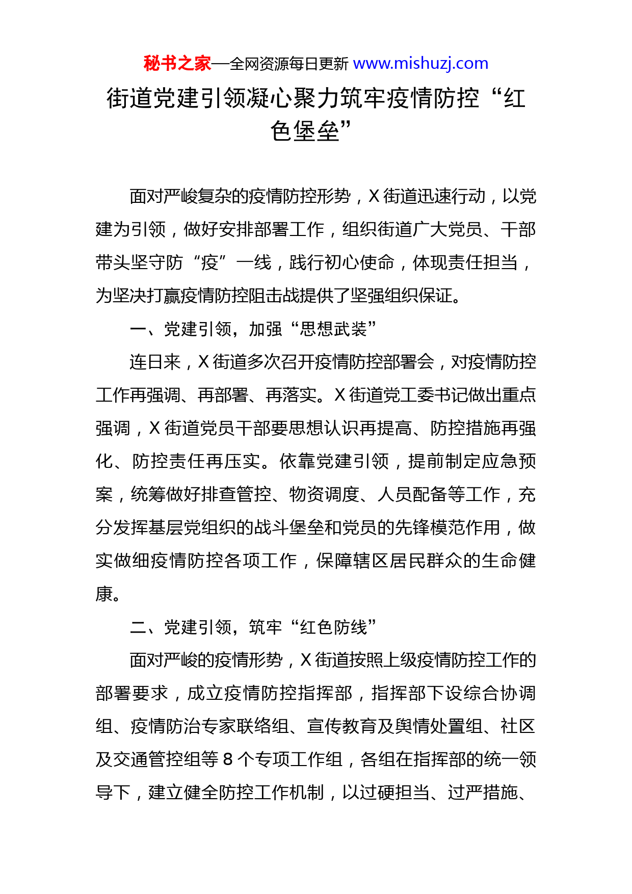 秘书之家—全网资源每日更新www.mishuzj.com街道党建引领凝心聚力筑牢疫情防控“红色堡垒”面对严峻复杂的疫情防控形势,X街道迅速行动,以党建为引领,做好安排部署工作,组织街道广大党员、干部带头坚守防“疫”一线,践行初心使命,体现责任担当,为坚决打赢疫情防控阻击战提供了坚强组织保证。一、党建引领,加强“思想武装”连日来,X街道多次召开疫情防控部署会,对疫情防控工作再强调、再部署、再落实。X街道党工委书记做出重点强调,X街道党员干部要思想认识再提高、防控措施再强化、防控责任再压实。依靠党建引领,提前制定应急预案,统筹做好排查管控、物资调度、人员配备等工作,充分发挥基层党组织的战斗堡垒和党员的先锋模范作用,做实做细疫情防控各项工作,保障辖区居民群众的生命健康。二、党建引领,筑牢“红色防线”面对严峻的疫情形势,X街道按照上级疫情防控工作的部署要求,成立疫情防控指挥部,指挥部下设综合协调组、疫情防治专家联络组、宣传教育及舆情处置组、社区及交通管控组等8个专项工作组,各组在指挥部的统一领导下,建立健全防控工作机制,以过硬担当、过严措施、秘书之家—全网资源每日更新www.mishuzj.com过高标准抓好疫情防控保障工作。三、党建引领,凝聚“强大合力”X街道班子成员发挥模范先锋作用,全覆盖排查辖区内重点区域的疫情防控工作落实情况,以党组织的全覆盖调动各社区、企业等多方力量,凝聚社会防控合力。街道对党员、社区工作者、网格员进行合理分工,织密织牢社区网格,严格落实街道和社区干部网格包保责任制,努力构建群防群控责任体系,为疫情防控提供坚强组织保障。下一步,X街道将持续以党建为引领,按照上级《关于在疫情防控中充分发挥基层党组织战斗堡垒作用和共产党员先锋模范作用的通知》要求,践行初心使命,多措并举开展疫情防控工作,用行动彰显红色力量,以扎实过硬作风确保各项疫情防控工作落实到位,坚定不移地守好X街道疫情防线,切实守护辖区居民群众的生命健康安全。