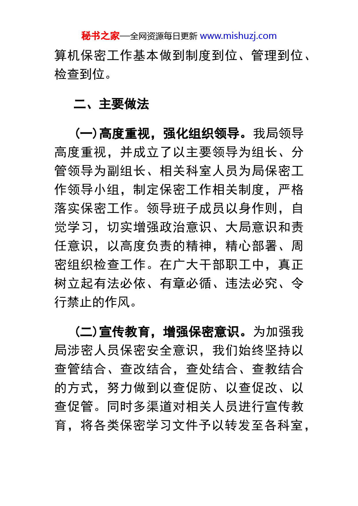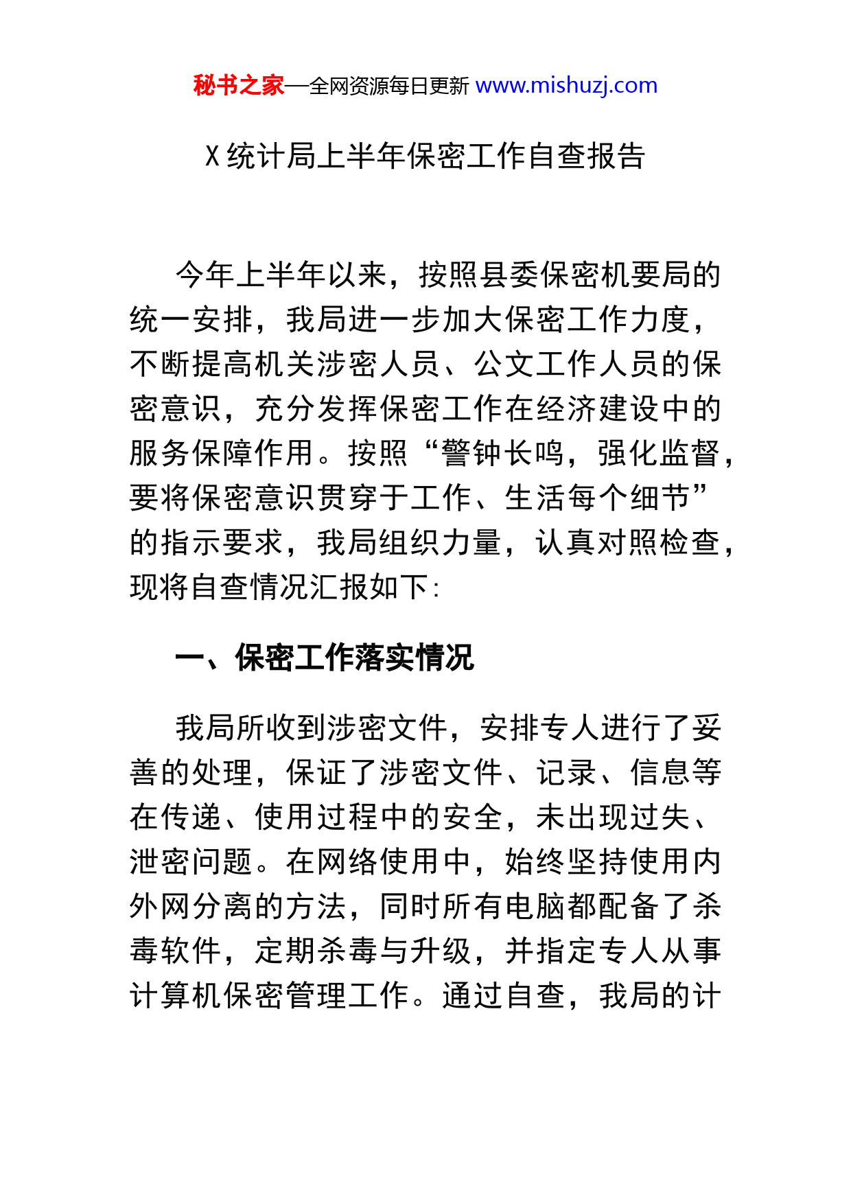 秘书之家—全网资源每日更新www.mishuzj.comX统计局上半年保密工作自查报告今年上半年以来,按照县委保密机要局的统一安排,我局进一步加大保密工作力度,不断提高机关涉密人员、公文工作人员的保密意识,充分发挥保密工作在经济建设中的服务保障作用。按照“警钟长鸣,强化监督,要将保密意识贯穿于工作、生活每个细节”的指示要求,我局组织力量,认真对照检查,现将自查情况汇报如下:一、保密工作落实情况我局所收到涉密文件,安排专人进行了妥善的处理,保证了涉密文件、记录、信息等在传递、使用过程中的安全,未出现过失、泄密问题。在网络使用中,始终坚持使用内外网分离的方法,同时所有电脑都配备了杀毒软件,定期杀毒与升级,并指定专人从事计算机保密管理工作。通过自查,我局的计秘书之家—全网资源每日更新www.mishuzj.com算机保密工作基本做到制度到位、管理到位、检查到位。二、主要做法(一)高度重视,强化组织领导。我局领导高度重视,并成立了以主要领导为组长、分管领导为副组长、相关科室人员为局保密工作领导小组,制定保密工作相关制度,严格落实保密工作。领导班子成员以身作则,自觉学习,切实增强政治意识、大局意识和责任意识,以高度负责的精神,精心部署、周密组织检查工作。在广大干部职工中,真正树立起有法必依、有章必循、违法必究、令行禁止的作风。(二)宣传教育,增强保密意识。为加强我局涉密人员保密安全意识,我们始终坚持以查管结合、查改结合,查处结合、查教结合的方式,努力做到以查促防、以查促改、以查促管。同时多渠道对相关人员进行宣传教育,将各类保密学习文件予以转发至各科室,秘书之家—全网资源每日更新www.mishuzj.com要求结合实际,认真组织学习,并抓好贯彻落实,确保安全。(三)健全制度,强化管理,确保保密工作落到实处。近年来,我局根据上级保密工作有关要求,结合实际,进一步修订完善了《保密工作管理办法》、《信息发布保密工作制度》等保密工作规章制度,做到以制度管人、按程序办事,在日常工作中,按规定范围和程序传阅涉密文件;认真落实文件管理制度,坚持双向登记,加强送阅、传阅文件保密工作,传阅文件采取直传方式,对呈送的文件进行登记,负责传阅文件人员逐件签字阅办,阅后退回,并清点份数,退还交回办公室。凡上报的文件、网站发布的信息等均由分管副局长审核签字后办公室上报。对内部材料形成过程产生的废件、重复件,以及需销毁的,统一进行销毁。(四)加强防范,狠抓检查,堵塞失密泄密的漏洞。在进一步制订和完善各类保密制度的同时,单位计算机实行专人管理,加强计秘书之家—全网资源每日更新www.mishuzj.com算机信息网络保密管理,指定懂业务、会管理的工作人员专门负责加密计算机的管理工作,坚持谁上网谁负责的原则有效地加强了涉密载体的保密管理工作。三、存在问题及改进意见今年以来,我局虽未发布涉密的公开信息,但也存在个别人对涉密信息的认识不够清晰、保密意识仍不够强;对信息公开审核不够规范等问题,必须引起我们的高度重视。下一步,我们将着力从以下两个方面努力:一是继续加大保密工作的宣教力度。以宣传教育为主导,强化各有关责任人的保密意识,进而增强他们做好保密工作的主动性和自觉性。二是继续加强保密工作的督促检查。为了确保保密审查管理工作各项规章制度的落实,及时发现保密工作中存在的泄密隐患,堵塞管理漏洞。秘书之家—全网资源每日更新www.mishuzj.com今后的工作中,我局在县委县政府的正确领导下,在相关业务部门的指导下,重点学习《保密法实施条例》《保密知识读本》等,结合实际,强化措施,加大对涉密内容的管理,力争保密工作取得新成绩,确保保密工作的顺利开展。