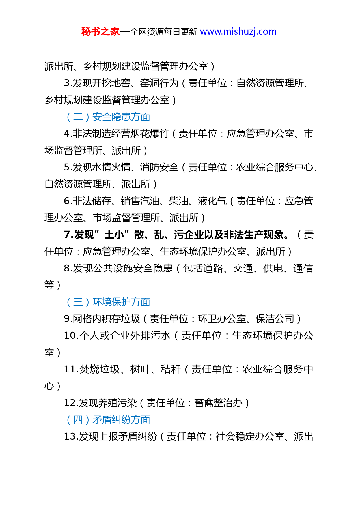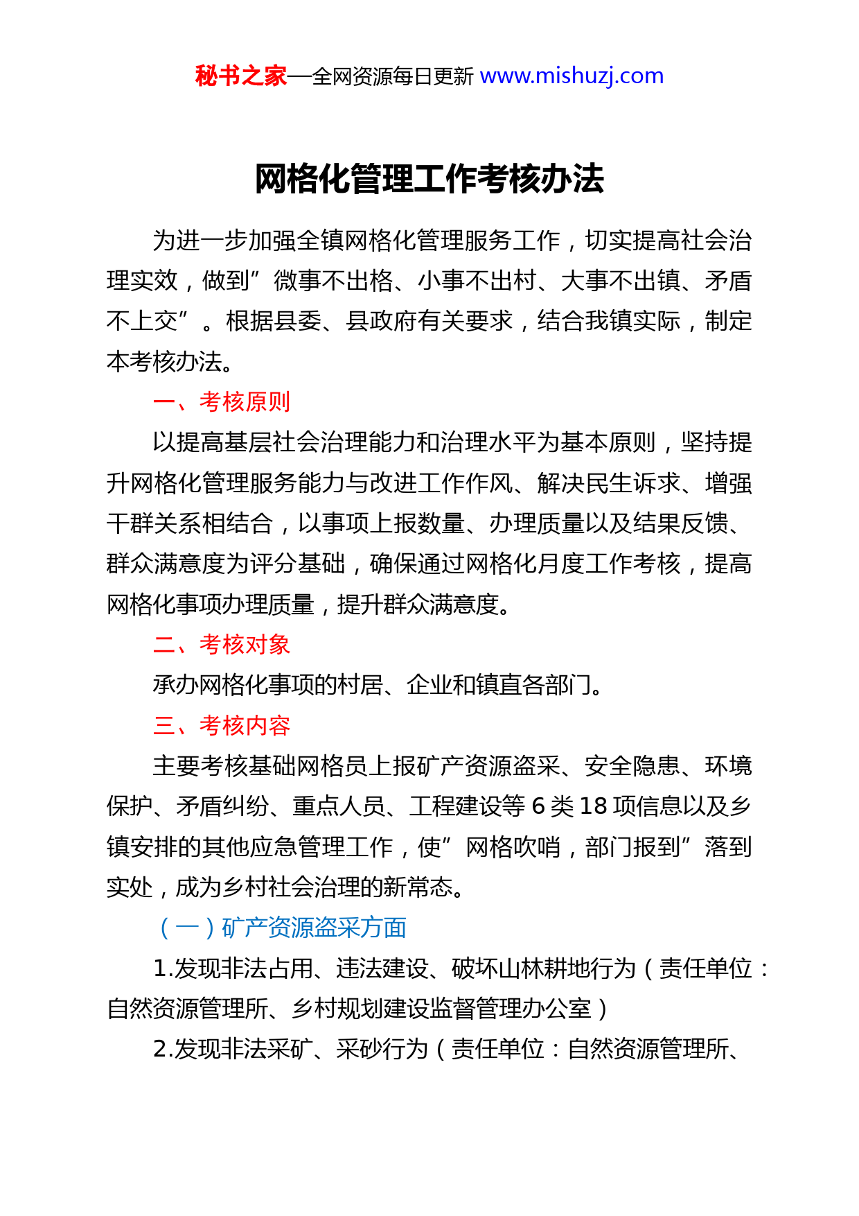 秘书之家—全网资源每日更新www.mishuzj.com网格化管理工作考核办法为进一步加强全镇网格化管理服务工作,切实提高社会治理实效,做到”微事不出格、小事不出村、大事不出镇、矛盾不上交”。根据县委、县政府有关要求,结合我镇实际,制定本考核办法。一、考核原则以提高基层社会治理能力和治理水平为基本原则,坚持提升网格化管理服务能力与改进工作作风、解决民生诉求、增强干群关系相结合,以事项上报数量、办理质量以及结果反馈、群众满意度为评分基础,确保通过网格化月度工作考核,提高网格化事项办理质量,提升群众满意度。二、考核对象承办网格化事项的村居、企业和镇直各部门。三、考核内容主要考核基础网格员上报矿产资源盗采、安全隐患、环境保护、矛盾纠纷、重点人员、工程建设等6类18项信息以及乡镇安排的其他应急管理工作,使”网格吹哨,部门报到”落到实处,成为乡村社会治理的新常态。(一)矿产资源盗采方面1.发现非法占用、违法建设、破坏山林耕地行为(责任单位:自然资源管理所、乡村规划建设监督管理办公室)2.发现非法采矿、采砂行为(责任单位:自然资源管理所、秘书之家—全网资源每日更新www.mishuzj.com派出所、乡村规划建设监督管理办公室)3.发现开挖地窖、窑洞行为(责任单位:自然资源管理所、乡村规划建设监督管理办公室)(二)安全隐患方面4.非法制造经营烟花爆竹(责任单位:应急管理办公室、市场监督管理所、派出所)5.发现水情火情、消防安全(责任单位:农业综合服务中心、自然资源管理所、派出所)6.非法储存、销售汽油、柴油、液化气(责任单位:应急管理办公室、市场监督管理所、派出所)7.发现”土小”散、乱、污企业以及非法生产现象。(责任单位:应急管理办公室、生态环境保护办公室、派出所)8.发现公共设施安全隐患(包括道路、交通、供电、通信等)(三)环境保护方面9.网格内积存垃圾(责任单位:环卫办公室、保洁公司)10.个人或企业外排污水(责任单位:生态环境保护办公室)11.焚烧垃圾、树叶、秸秆(责任单位:农业综合服务中心)12.发现养殖污染(责任单位:畜禽整治办)(四)矛盾纠纷方面13.发现上报矛盾纠纷(责任单位:社会稳定办公室、派出秘书之家—全网资源每日更新www.mishuzj.com所)14.信访隐患排查上报(责任单位:社会稳定办公室、派出所)15.排查、上报治安安全隐患(责任单位:社会稳定办公室、派出所)(五)重点人员方面16.关注邪教、信访重点人员动态,清理邪教标语(责任单位:社会稳定办公室、派出所)17.发现可疑人员、车辆(责任单位:社会稳定办公室、派出所)(六)工程建设方面18.发现新建种植养殖棚、房屋建设等行为(责任单位:乡村规划建设监督管理办公室、自然资源管理所)四、考核指标和计分办法考核指标:36个村居211个基层基础网格,采取月度考核和村居常规指标考核相结合。(一)业务指标考核(70分)1.上报率(30分):指网格员上报网格事项除以当天全镇网格上报事项乘以100%。村居各基层网格采取信息直报机制,网格员每天在所辖区域进行网格巡查,发现问题及时处理,不能处理的及时上报村级网格长和镇网格化服务中心。2.办结率(20分):指承办单位在规定时限内落实处理的网格化事项数量占总承办量的比例。网格事项及时办结,秘书之家—全网资源每日更新www.mishuzj.com办结率以90%为基础,每上升一个百分点加1分,下降一个百分点扣1分,直至扣完为止,加分可以上不封顶。3.满意度(20分):指网格化事项提出方对事项办理满意和基本满意的数量占总承办量的比例。对所有网格上报事项办结回复,要求满意度100%,每有一项不满意扣1分,直至扣完为止。(二)常规指标考核(30分)1.制度建设(10分)主要考核制度健全、职责明晰、流程规范、档案齐全等方面的情况。2.阵地建设(10分)主要考核场所配套、设施整合、平台维护、部件应用等方面的情况。3.队伍建设(10分)主要考核人员配备、责任落实、队伍管理、服务保障等方面的情况。五、加减分(一)加分项目1.本月无12345热线、无群众举报以及无上级各部门反馈线索的月考核得满分。2.在排查中发现涉及安保维稳类、违法建设类、安全生产类、环境保护类等底线工作和重大负面舆情及时上报并能处理化解的每有一件加5分。秘书之家—全网资源每日更新www.mishuzj.com(二)减分项目对存在漏报、瞒报、错报、迟报等重要信息,而被群众举报、12345政务服务热线举报及上级部门反馈线索的,每有一件次减10分,如造成严重后果的,免除现有职务,并依法依纪追究相关人员责任。六、组织实施网格化管理服务工作考核由镇网格化管理服务中心组织实施。七、结果运用网格化管理服务工作考核情况纳入全镇村级月度工作考核和年度综合考核,与工资待遇、评先树优、职称评聘等相挂钩。