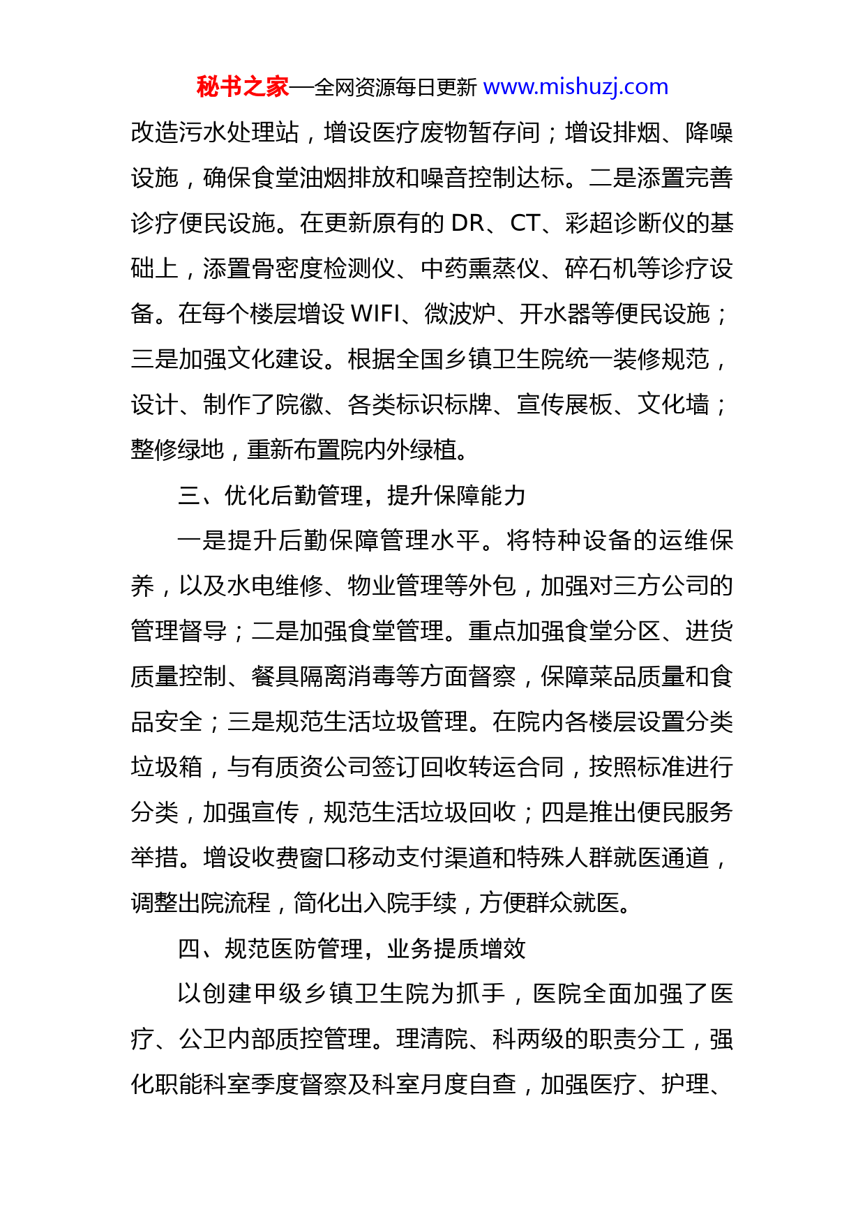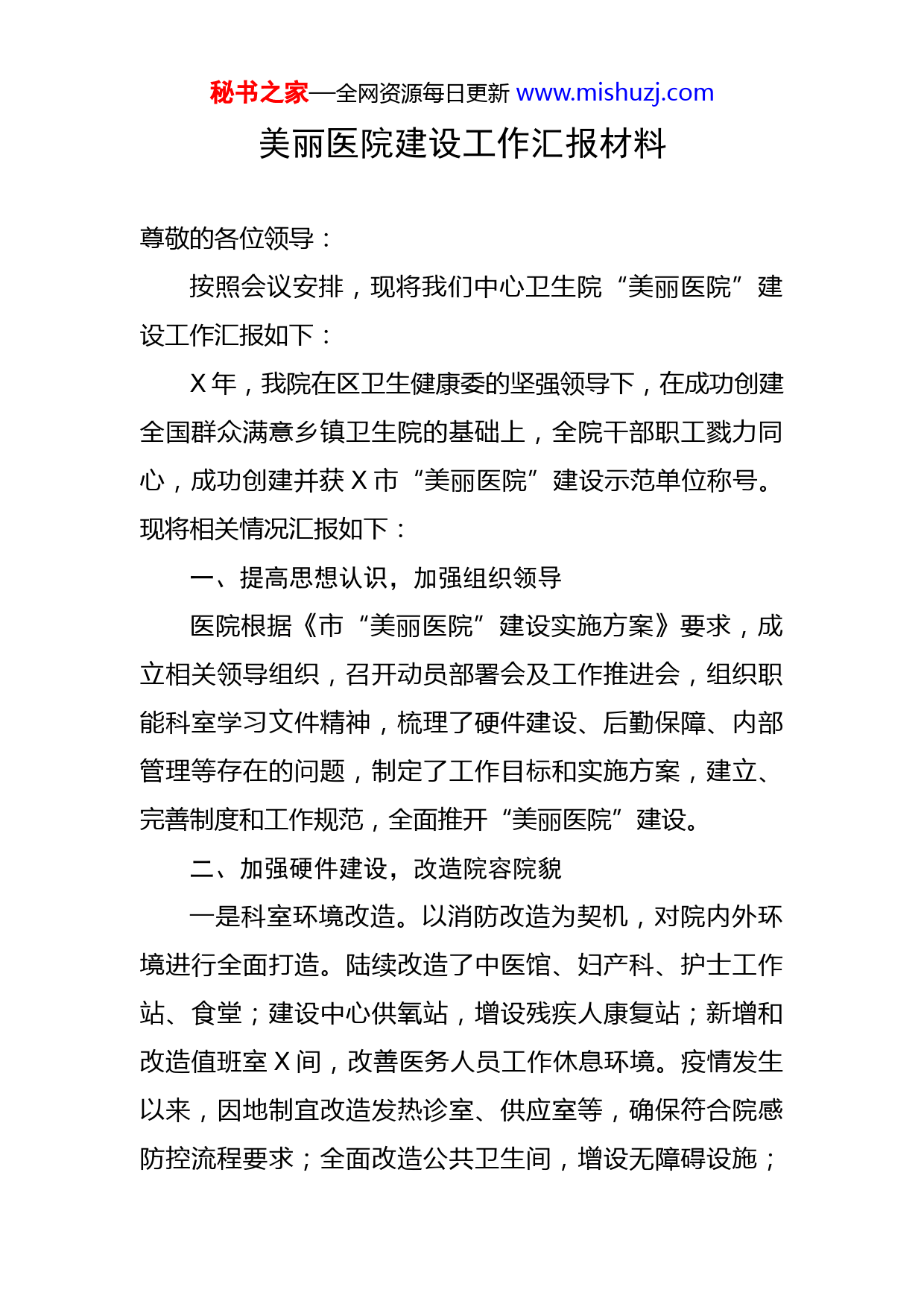秘书之家—全网资源每日更新www.mishuzj.com美丽医院建设工作汇报材料尊敬的各位领导:按照会议安排,现将我们中心卫生院“美丽医院”建设工作汇报如下:X年,我院在区卫生健康委的坚强领导下,在成功创建全国群众满意乡镇卫生院的基础上,全院干部职工戮力同心,成功创建并获X市“美丽医院”建设示范单位称号。现将相关情况汇报如下:一、提高思想认识,加强组织领导医院根据《市“美丽医院”建设实施方案》要求,成立相关领导组织,召开动员部署会及工作推进会,组织职能科室学习文件精神,梳理了硬件建设、后勤保障、内部管理等存在的问题,制定了工作目标和实施方案,建立、完善制度和工作规范,全面推开“美丽医院”建设。二、加强硬件建设,改造院容院貌一是科室环境改造。以消防改造为契机,对院内外环境进行全面打造。陆续改造了中医馆、妇产科、护士工作站、食堂;建设中心供氧站,增设残疾人康复站;新增和改造值班室X间,改善医务人员工作休息环境。疫情发生以来,因地制宜改造发热诊室、供应室等,确保符合院感防控流程要求;全面改造公共卫生间,增设无障碍设施;秘书之家—全网资源每日更新www.mishuzj.com改造污水处理站,增设医疗废物暂存间;增设排烟、降噪设施,确保食堂油烟排放和噪音控制达标。二是添置完善诊疗便民设施。在更新原有的DR、CT、彩超诊断仪的基础上,添置骨密度检测仪、中药熏蒸仪、碎石机等诊疗设备。在每个楼层增设WIFI、微波炉、开水器等便民设施;三是加强文化建设。根据全国乡镇卫生院统一装修规范,设计、制作了院徽、各类标识标牌、宣传展板、文化墙;整修绿地,重新布置院内外绿植。三、优化后勤管理,提升保障能力一是提升后勤保障管理水平。将特种设备的运维保养,以及水电维修、物业管理等外包,加强对三方公司的管理督导;二是加强食堂管理。重点加强食堂分区、进货质量控制、餐具隔离消毒等方面督察,保障菜品质量和食品安全;三是规范生活垃圾管理。在院内各楼层设置分类垃圾箱,与有质资公司签订回收转运合同,按照标准进行分类,加强宣传,规范生活垃圾回收;四是推出便民服务举措。增设收费窗口移动支付渠道和特殊人群就医通道,调整出院流程,简化出入院手续,方便群众就医。四、规范医防管理,业务提质增效以创建甲级乡镇卫生院为抓手,医院全面加强了医疗、公卫内部质控管理。理清院、科两级的职责分工,强化职能科室季度督察及科室月度自查,加强医疗、护理、秘书之家—全网资源每日更新www.mishuzj.com医技等质控管理,不断提升医疗质量水平,保障医疗安全。同时,按照国家公卫第三版,常态化规范开展各项公共卫生服务和两级质控,并开展部分项目的医防融合试点,增强了群众的获得感和服务依从性。通过持续提升内部管理,病人及居民满意度持续提升达X%,公卫工作综合考核连续四年获全系统X年获评市“最美基层医疗机构”。下一步,我们将坚持以患者为中心,进一步巩固“美丽医院”建设成果,不断改善医院工作条件、就医环境和常态化工作机制,真正将我院建设成为标准的甲级乡镇卫生院,为辖区群众提供更优质的医疗服务,为卫生健康事业作出更大贡献。谢谢大家!