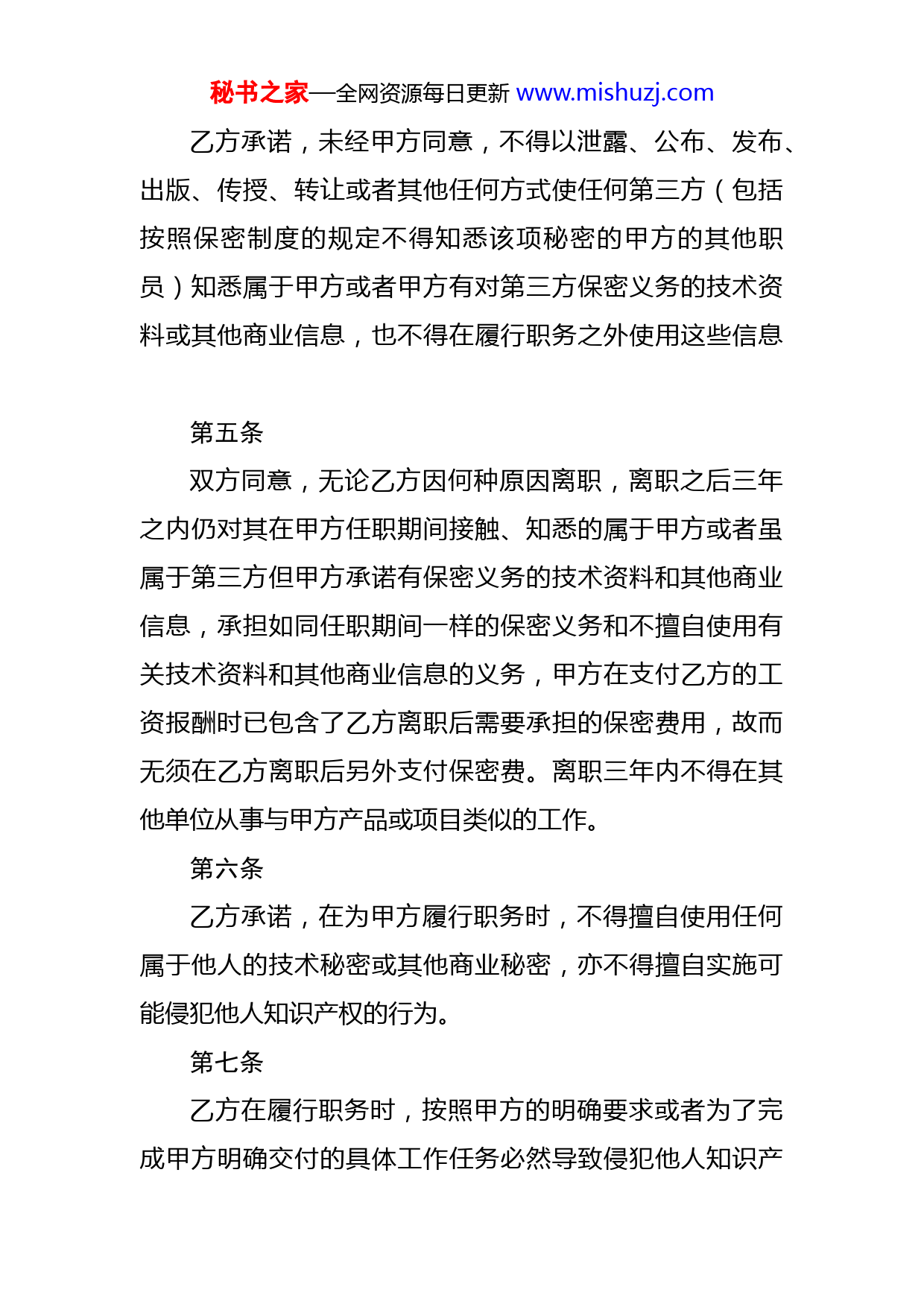 秘书之家—全网资源每日更新www.mishuzj.com职员保密协议书乙方:甲方:鉴于乙方在甲方任职,并获得甲方支付的相应报酬,双方当事人就乙方在任职期间及离职以后保守甲方技术、商业秘密的有关事项,制定下列条款共同遵守:第一条乙方在甲方任职期间,因履行职务或者利用甲方的物质技术条件、业务信息等产生的发明创造、产品或其他技术成果,相关的技术及知识产权均属于甲方享有。第二条乙方在甲方任职期间所完成的、与甲方业务不相关的发明创造、技术产品或其他技术成果,乙方主张由其本人享有知识产权的,应当及时向甲方申明。经甲方核实,认为确属于非职务成果的,由乙方享有知识产权。第三条乙方在甲方任职期间,必须遵守甲方规定的任何书面或口头嘱咐的保密规章制度,履行与其工作岗位相应的保密职责。第四条秘书之家—全网资源每日更新www.mishuzj.com乙方承诺,未经甲方同意,不得以泄露、公布、发布、出版、传授、转让或者其他任何方式使任何第三方(包括按照保密制度的规定不得知悉该项秘密的甲方的其他职员)知悉属于甲方或者甲方有对第三方保密义务的技术资料或其他商业信息,也不得在履行职务之外使用这些信息第五条双方同意,无论乙方因何种原因离职,离职之后三年之内仍对其在甲方任职期间接触、知悉的属于甲方或者虽属于第三方但甲方承诺有保密义务的技术资料和其他商业信息,承担如同任职期间一样的保密义务和不擅自使用有关技术资料和其他商业信息的义务,甲方在支付乙方的工资报酬时已包含了乙方离职后需要承担的保密费用,故而无须在乙方离职后另外支付保密费。离职三年内不得在其他单位从事与甲方产品或项目类似的工作。第六条乙方承诺,在为甲方履行职务时,不得擅自使用任何属于他人的技术秘密或其他商业秘密,亦不得擅自实施可能侵犯他人知识产权的行为。第七条乙方在履行职务时,按照甲方的明确要求或者为了完成甲方明确交付的具体工作任务必然导致侵犯他人知识产秘书之家—全网资源每日更新www.mishuzj.com权的,若甲方遭受第三方的侵权指控,应诉费用和侵权赔偿不得由乙方承担或部分承担。第八条乙方承诺,其在甲方任职期间,非经甲方事先同意,不在与甲方生产、经营同类产品或提供同类服务的其他企业、事业单位、社会团体内担任任何职务。第九条乙方因工作需要所持有或保管的一切记录着甲方技术信息的文件、资料、图表、工作笔记、工作报告、信件(含电子邮件)、传真、移动磁盘、电脑、仪器以及其他任何形式的载体,均归甲方所有,未经甲方许可不得将以上所属资料、信息载体带出工作单位,而无论这些信息有无商业上的价值,不得将属于乙方的任何信息载体带入工作环境之内。否者按泄密论处。第十条乙方应当于离职时,或者于甲方提出辞退时,返还全部属于甲方的财物,包括记载着甲方秘密信息的一切载体第十一条本合同提及的涉密范围包括:技术发明、设计思想、科研成果、技术方案、工程设计、XX,等等。本合同提及的其他商业秘密包括:客户名单、行销计划、供货合同秘书之家—全网资源每日更新www.mishuzj.comXX,等其他商业秘密。第十二条本合同中所称的任职期间,以乙方从甲方领取第一次工资为标志,并以该项工资所代表的工作时间为任职时间本合同中所称的离职,以任何一方明确表示解除或辞去聘用关系的时间为准。乙方拒绝领取工资且停止履行职务的行为,视为自动辞职。第十三条因本合同而引起的纠纷,如果协商解决不成,任何一方均有权提交甲方所在辖区劳动仲裁委员会仲裁或依法律程序解决。第十四条乙方如违反本合同任一条款,应当一次性向甲方支付其年收入10倍的违约金;无论违约金给付与否,甲方均有权不经预告立即解除与乙方的聘用关系。乙方的违约行为给甲方造成严重损失的乙方应当赔偿甲方的损失或追究刑事责任。第十五条本合同自双方签字或盖章完成之日起生效。第十六条本合同与劳务合同具有同等法律效率秘书之家—全网资源每日更新www.mishuzj.com乙方签字:甲方印章:身份证号:负责人签字:家庭地址:单位地址:联系电话:联系电话:年月日年月日