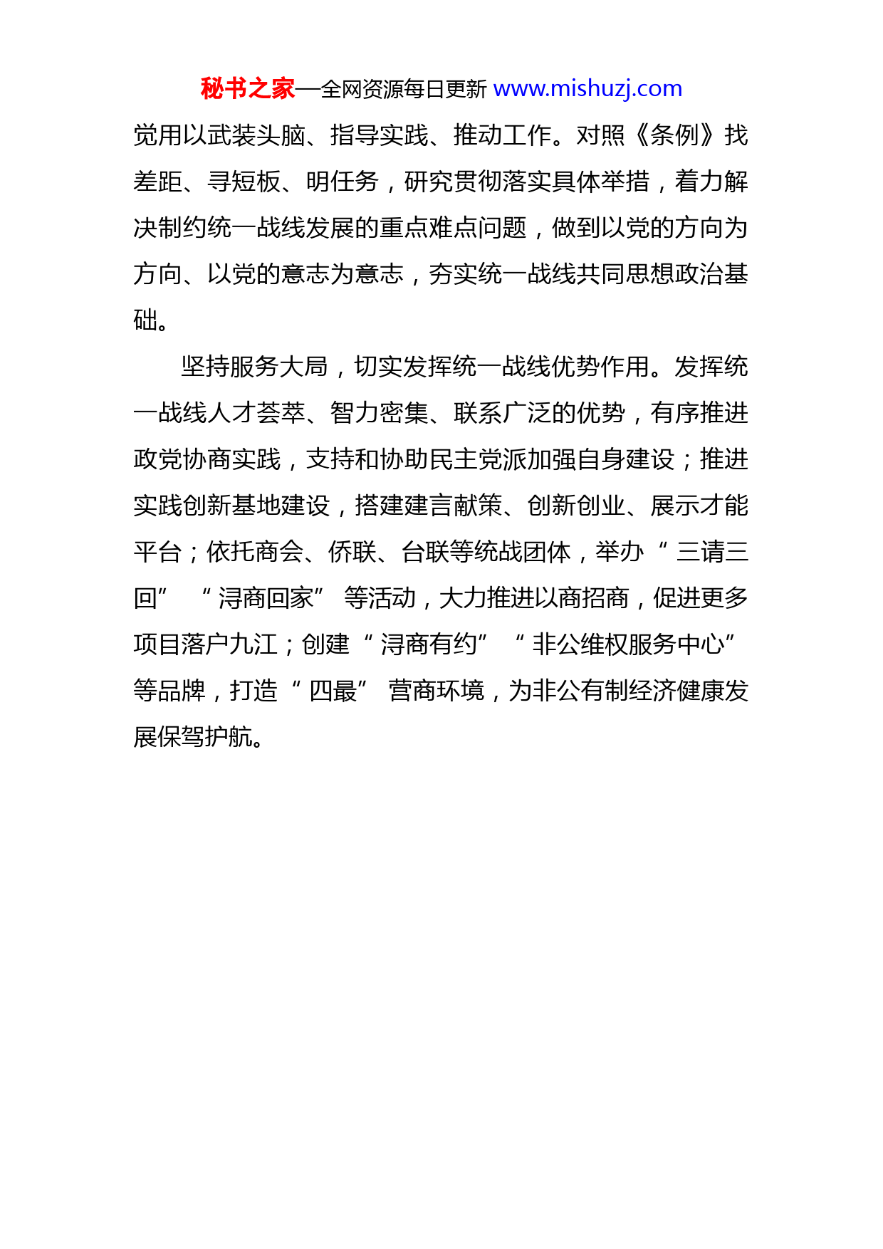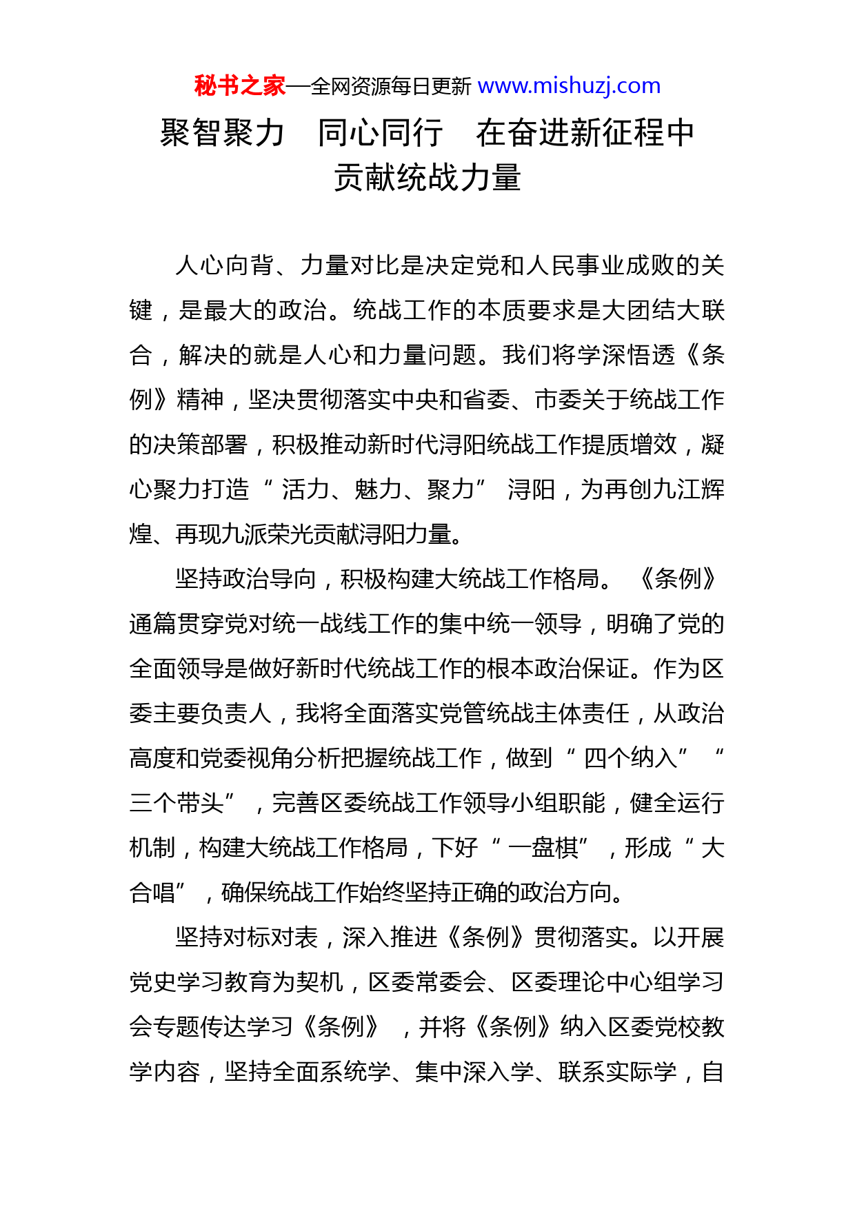 秘书之家—全网资源每日更新www.mishuzj.com聚智聚力同心同行在奋进新征程中贡献统战力量人心向背、力量对比是决定党和人民事业成败的关键,是最大的政治。统战工作的本质要求是大团结大联合,解决的就是人心和力量问题。我们将学深悟透《条例》精神,坚决贯彻落实中央和省委、市委关于统战工作的决策部署,积极推动新时代浔阳统战工作提质增效,凝心聚力打造“活力、魅力、聚力”浔阳,为再创九江辉煌、再现九派荣光贡献浔阳力量。坚持政治导向,积极构建大统战工作格局。《条例》通篇贯穿党对统一战线工作的集中统一领导,明确了党的全面领导是做好新时代统战工作的根本政治保证。作为区委主要负责人,我将全面落实党管统战主体责任,从政治高度和党委视角分析把握统战工作,做到“四个纳入”“三个带头”,完善区委统战工作领导小组职能,健全运行机制,构建大统战工作格局,下好“一盘棋”,形成“大合唱”,确保统战工作始终坚持正确的政治方向。坚持对标对表,深入推进《条例》贯彻落实。以开展党史学习教育为契机,区委常委会、区委理论中心组学习会专题传达学习《条例》,并将《条例》纳入区委党校教学内容,坚持全面系统学、集中深入学、联系实际学,自秘书之家—全网资源每日更新www.mishuzj.com觉用以武装头脑、指导实践、推动工作。对照《条例》找差距、寻短板、明任务,研究贯彻落实具体举措,着力解决制约统一战线发展的重点难点问题,做到以党的方向为方向、以党的意志为意志,夯实统一战线共同思想政治基础。坚持服务大局,切实发挥统一战线优势作用。发挥统一战线人才荟萃、智力密集、联系广泛的优势,有序推进政党协商实践,支持和协助民主党派加强自身建设;推进实践创新基地建设,搭建建言献策、创新创业、展示才能平台;依托商会、侨联、台联等统战团体,举办“三请三回”“浔商回家”等活动,大力推进以商招商,促进更多项目落户九江;创建“浔商有约”“非公维权服务中心”等品牌,打造“四最”营商环境,为非公有制经济健康发展保驾护航。