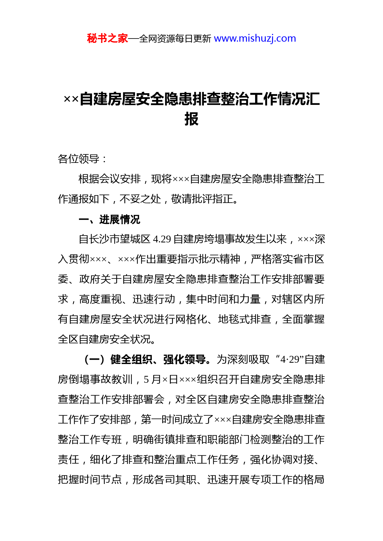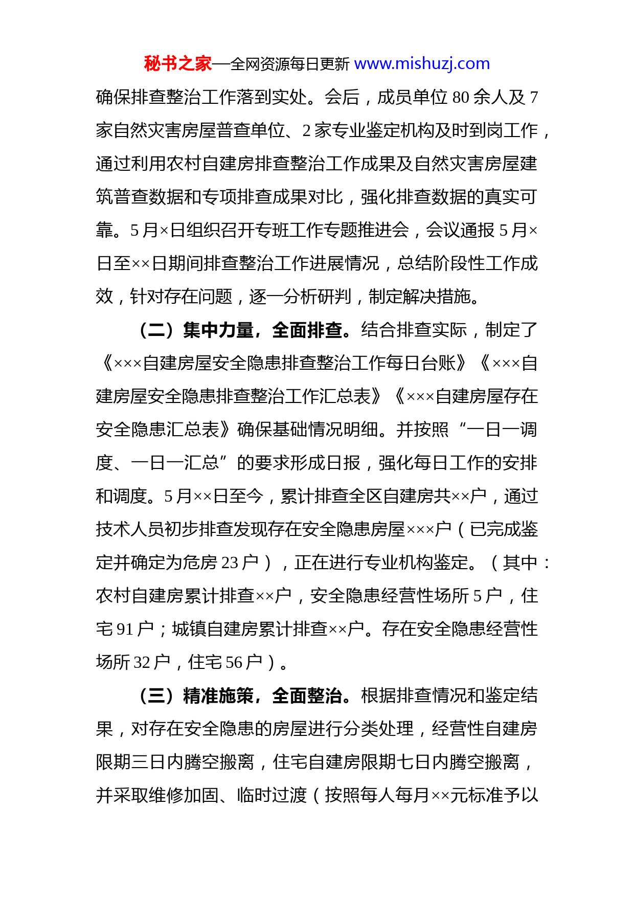 秘书之家—全网资源每日更新www.mishuzj.com××自建房屋安全隐患排查整治工作情况汇报各位领导:根据会议安排,现将×××自建房屋安全隐患排查整治工作通报如下,不妥之处,敬请批评指正。一、进展情况自长沙市望城区4.29自建房垮塌事故发生以来,×××深入贯彻×××、×××作出重要指示批示精神,严格落实省市区委、政府关于自建房屋安全隐患排查整治工作安排部署要求,高度重视、迅速行动,集中时间和力量,对辖区内所有自建房屋安全状况进行网格化、地毯式排查,全面掌握全区自建房安全状况。(一)健全组织、强化领导。为深刻吸取“4·29”自建房倒塌事故教训,5月×日×××组织召开自建房安全隐患排查整治工作安排部署会,对全区自建房安全隐患排查整治工作作了安排部,第一时间成立了×××自建房安全隐患排查整治工作专班,明确街镇排查和职能部门检测整治的工作责任,细化了排查和整治重点工作任务,强化协调对接、把握时间节点,形成各司其职、迅速开展专项工作的格局秘书之家—全网资源每日更新www.mishuzj.com确保排查整治工作落到实处。会后,成员单位80余人及7家自然灾害房屋普查单位、2家专业鉴定机构及时到岗工作,通过利用农村自建房排查整治工作成果及自然灾害房屋建筑普查数据和专项排查成果对比,强化排查数据的真实可靠。5月×日组织召开专班工作专题推进会,会议通报5月×日至××日期间排查整治工作进展情况,总结阶段性工作成效,针对存在问题,逐一分析研判,制定解决措施。(二)集中力量,全面排查。结合排查实际,制定了《×××自建房屋安全隐患排查整治工作每日台账》《×××自建房屋安全隐患排查整治工作汇总表》《×××自建房屋存在安全隐患汇总表》确保基础情况明细。并按照“一日一调度、一日一汇总”的要求形成日报,强化每日工作的安排和调度。5月××日至今,累计排查全区自建房共××户,通过技术人员初步排查发现存在安全隐患房屋×××户(已完成鉴定并确定为危房23户),正在进行专业机构鉴定。(其中:农村自建房累计排查××户,安全隐患经营性场所5户,住宅91户;城镇自建房累计排查××户。存在安全隐患经营性场所32户,住宅56户)。(三)精准施策,全面整治。根据排查情况和鉴定结果,对存在安全隐患的房屋进行分类处理,经营性自建房限期三日内腾空搬离,住宅自建房限期七日内腾空搬离,并采取维修加固、临时过渡(按照每人每月××元标准予以秘书之家—全网资源每日更新www.mishuzj.com临时过渡,每户不足×人的按照×人执行)等措施,最大程度减少安全风险隐患。对初步排查发现的农村及城镇存在隐患经营性自建房×处,通过下达《整改通知》,督促产权人(即自建房房主)于3日内提供专业鉴定机构出具的房屋安全鉴定报告,随后将根据鉴定结果进行分类处置。对前期农村自建房排查整治工作中已鉴定为C、D级的农村住宅自建房×户。D级×户(×户已搬离,并完成硬隔离封闭,×户的租赁户已清退,限定房主5月×日前搬离腾空房屋);C级×户,正在按户籍人口协商办理并支付过渡费,限5月×日前搬离。对本次初步排查认为存在隐患的×户住宅、×户农村经营和住宅混用的自建房,已对接专业机构分批分次开展鉴定工作。截止5月×日鉴定机构已对阴山堂、西山小区住宅进行了初步鉴定,待出具鉴定报告后按鉴定结果分类整治。同时,加大宣传力度,通过微信群、公众号等宣传形式,张贴和发放《致全区居民朋友的“一封信”》,调动群众主动落实整改的积极性。二、存在的问题一是城乡结合地带部分房屋缺失建设资料或无规划审批手续,开展排查中无法确定为城镇或农村性质,排查数据不准确,逻辑不清楚,台账及一户一策档案建立工作存在困难。二是部分集中连片区域房屋,如杨家寨片区存在房屋背靠背、墙连墙的情况,危房腾空后无法拆除,将持秘书之家—全网资源每日更新www.mishuzj.com续对临近房屋造成隐患。三是我区剩余南华尖等“城中村”房屋在房屋安全等级较低、基础配套设施缺失等突出问题,且个别加固投入大,效益差,整体征收拆迁资金压力大。三、下一步工作一是尽快完成排查,严格执行日报制度,通过“一日一调度、一日一汇总”形式,压实工作责任,形成工作合力。结合现有工作资料,通过“建立工作台账,汇总各类数据,完善一户一策”等措施,从严从细抓好排查工作,并对排查情况进行复核,做到不漏一房、不漏一户,确保数据清、情况明、措施准,从根本上清除隐患、堵塞漏洞防化风险。二是全面整治到位,根据排查情况,合理保障排查、鉴定等各要素,尽快完成排查工作,迅速转入整治阶段。按照安全隐患类别,通过及时分析研判,依照加固改造、临时过渡和个别征收补偿(安置)相结合的方式,研究制定整治方案。对能整治的及时整治到位,对无法消除隐患的,制定一户一策、一楼一策整改方案,保证人员搬空,房屋硬隔离封闭到位,设立安全警示标识,结合“城市更新”房屋征收等工作长期坚持推进。三是强化违法违规查处,根据排查情况和现场调查,对未按规定审批未经验收、破坏主体、违法占地改建加层等违法建筑,依据相关法律法规进行依法强制拆除,并对违法责任人从严秘书之家—全网资源每日更新www.mishuzj.com从重从快处理,坚决落实“危房不住人”。四是加大政策宣传引导,全面深入开展自建房屋安全科普