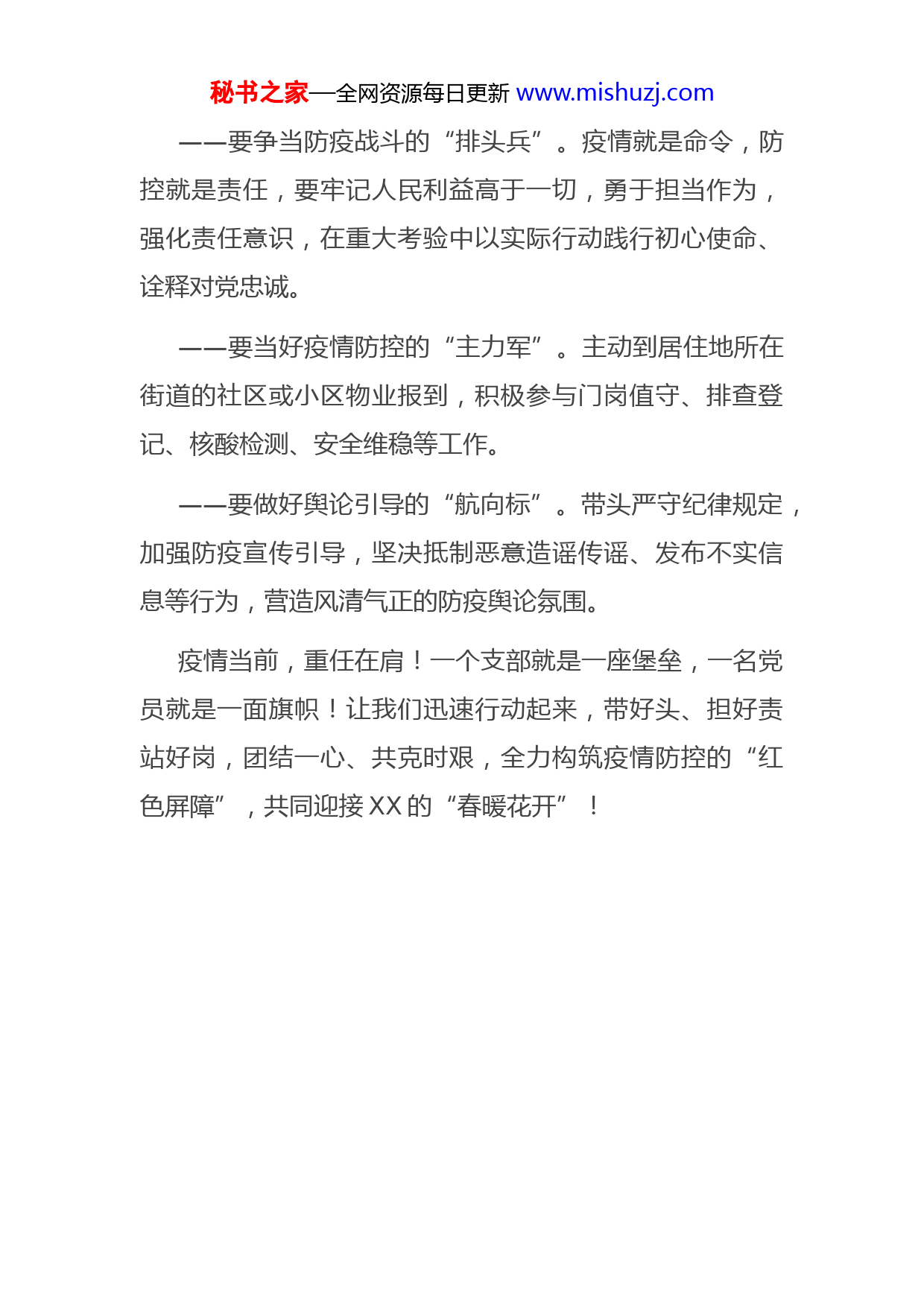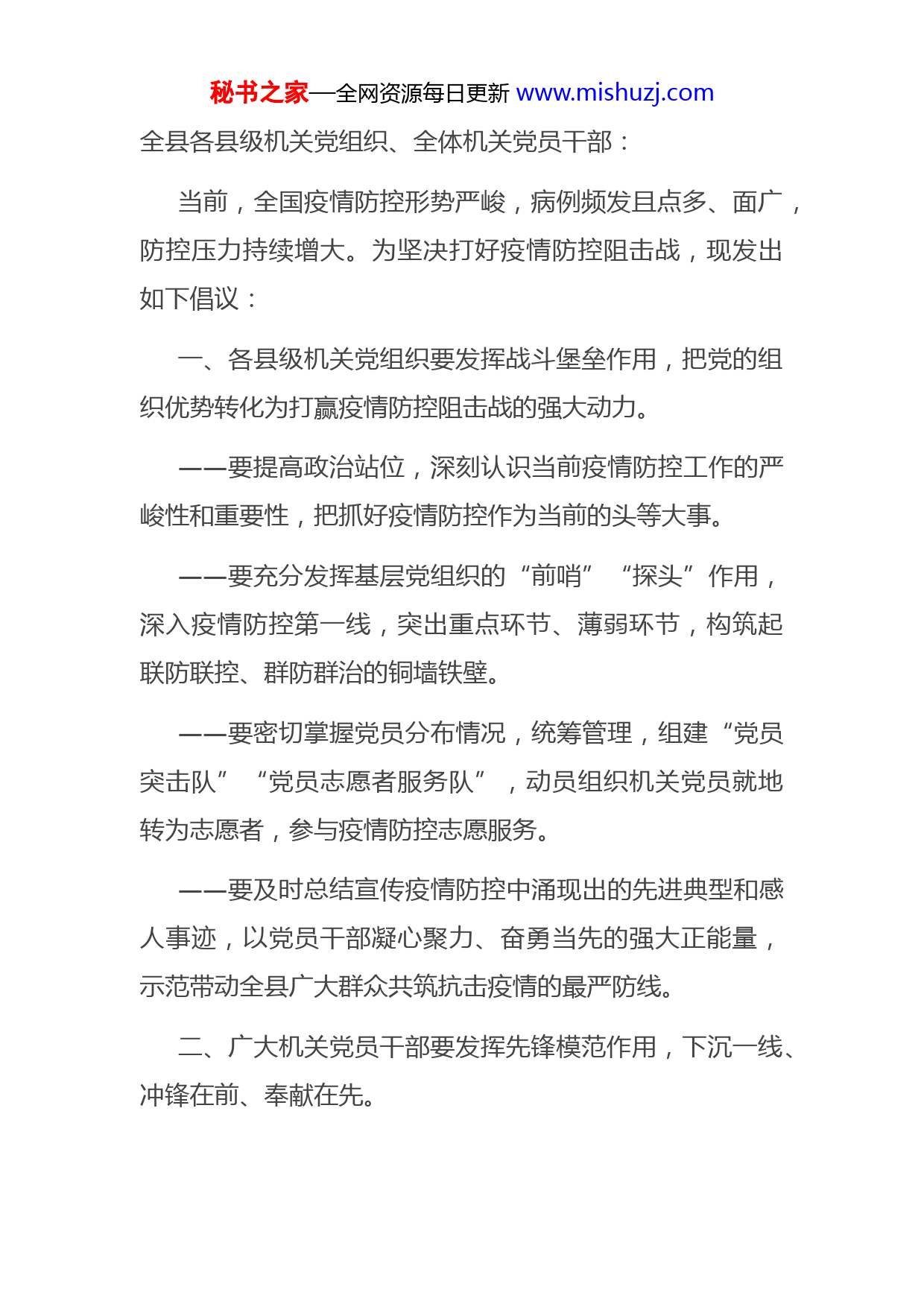 秘书之家—全网资源每日更新www.mishuzj.com全县各县级机关党组织、全体机关党员干部:当前,全国疫情防控形势严峻,病例频发且点多、面广,防控压力持续增大。为坚决打好疫情防控阻击战,现发出如下倡议:一、各县级机关党组织要发挥战斗堡垒作用,把党的组织优势转化为打赢疫情防控阻击战的强大动力。——要提高政治站位,深刻认识当前疫情防控工作的严峻性和重要性,把抓好疫情防控作为当前的头等大事。——要充分发挥基层党组织的“前哨”“探头”作用,深入疫情防控第一线,突出重点环节、薄弱环节,构筑起联防联控、群防群治的铜墙铁壁。——要密切掌握党员分布情况,统筹管理,组建“党员突击队”“党员志愿者服务队”,动员组织机关党员就地转为志愿者,参与疫情防控志愿服务。——要及时总结宣传疫情防控中涌现出的先进典型和感人事迹,以党员干部凝心聚力、奋勇当先的强大正能量,示范带动全县广大群众共筑抗击疫情的最严防线。二、广大机关党员干部要发挥先锋模范作用,下沉一线、冲锋在前、奉献在先。秘书之家—全网资源每日更新www.mishuzj.com——要争当防疫战斗的“排头兵”。疫情就是命令,防控就是责任,要牢记人民利益高于一切,勇于担当作为,强化责任意识,在重大考验中以实际行动践行初心使命、诠释对党忠诚。——要当好疫情防控的“主力军”。主动到居住地所在街道的社区或小区物业报到,积极参与门岗值守、排查登记、核酸检测、安全维稳等工作。——要做好舆论引导的“航向标”。带头严守纪律规定,加强防疫宣传引导,坚决抵制恶意造谣传谣、发布不实信息等行为,营造风清气正的防疫舆论氛围。疫情当前,重任在肩!一个支部就是一座堡垒,一名党员就是一面旗帜!让我们迅速行动起来,带好头、担好责站好岗,团结一心、共克时艰,全力构筑疫情防控的“红色屏障”,共同迎接XX的“春暖花开”!