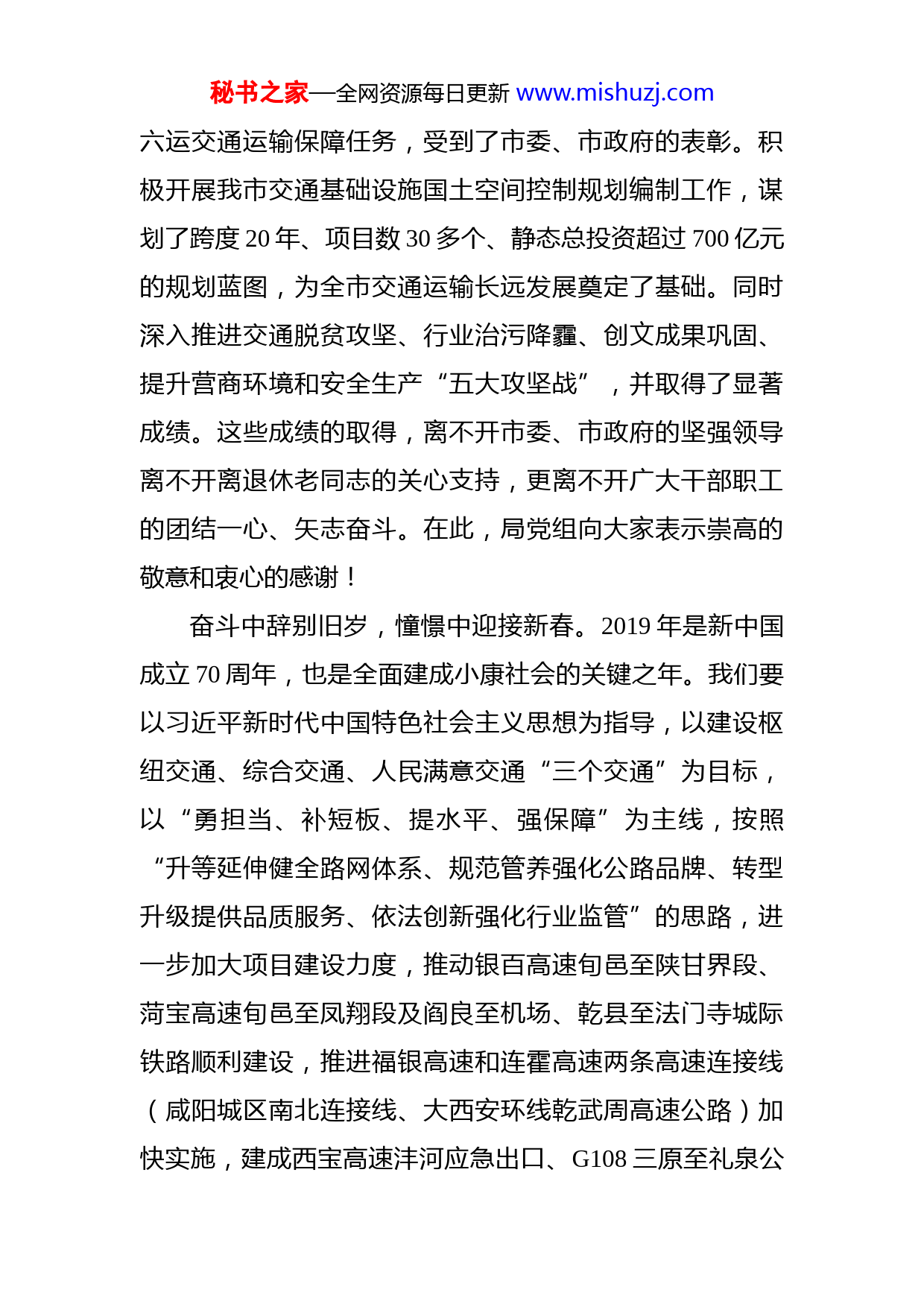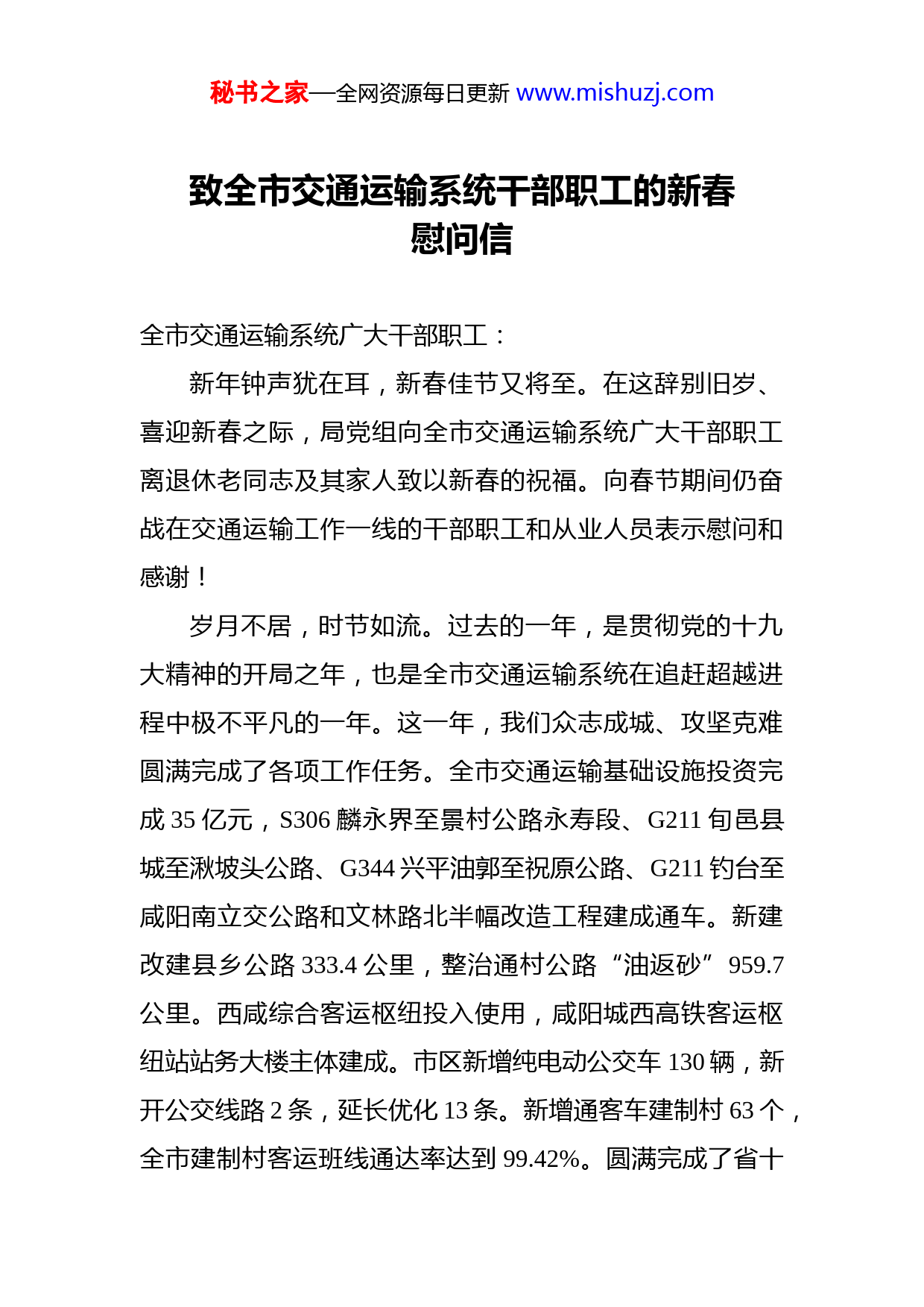 秘书之家—全网资源每日更新www.mishuzj.com致全市交通运输系统干部职工的新春慰问信全市交通运输系统广大干部职工:新年钟声犹在耳,新春佳节又将至。在这辞别旧岁、喜迎新春之际,局党组向全市交通运输系统广大干部职工离退休老同志及其家人致以新春的祝福。向春节期间仍奋战在交通运输工作一线的干部职工和从业人员表示慰问和感谢!岁月不居,时节如流。过去的一年,是贯彻党的十九大精神的开局之年,也是全市交通运输系统在追赶超越进程中极不平凡的一年。这一年,我们众志成城、攻坚克难圆满完成了各项工作任务。全市交通运输基础设施投资完成35亿元,S306麟永界至景村公路永寿段、G211旬邑县城至湫坡头公路、G344兴平油郭至祝原公路、G211钓台至咸阳南立交公路和文林路北半幅改造工程建成通车。新建改建县乡公路333.4公里,整治通村公路“油返砂”959.7公里。西咸综合客运枢纽投入使用,咸阳城西高铁客运枢纽站站务大楼主体建成。市区新增纯电动公交车130辆,新开公交线路2条,延长优化13条。新增通客车建制村63个,全市建制村客运班线通达率达到99.42%。圆满完成了省十秘书之家—全网资源每日更新www.mishuzj.com六运交通运输保障任务,受到了市委、市政府的表彰。积极开展我市交通基础设施国土空间控制规划编制工作,谋划了跨度20年、项目数30多个、静态总投资超过700亿元的规划蓝图,为全市交通运输长远发展奠定了基础。同时深入推进交通脱贫攻坚、行业治污降霾、创文成果巩固、提升营商环境和安全生产“五大攻坚战”,并取得了显著成绩。这些成绩的取得,离不开市委、市政府的坚强领导离不开离退休老同志的关心支持,更离不开广大干部职工的团结一心、矢志奋斗。在此,局党组向大家表示崇高的敬意和衷心的感谢!奋斗中辞别旧岁,憧憬中迎接新春。2019年是新中国成立70周年,也是全面建成小康社会的关键之年。我们要以习近平新时代中国特色社会主义思想为指导,以建设枢纽交通、综合交通、人民满意交通“三个交通”为目标,以“勇担当、补短板、提水平、强保障”为主线,按照“升等延伸健全路网体系、规范管养强化公路品牌、转型升级提供品质服务、依法创新强化行业监管”的思路,进一步加大项目建设力度,推动银百高速旬邑至陕甘界段、菏宝高速旬邑至凤翔段及阎良至机场、乾县至法门寺城际铁路顺利建设,推进福银高速和连霍高速两条高速连接线(咸阳城区南北连接线、大西安环线乾武周高速公路)加快实施,建成西宝高速沣河应急出口、G108三原至礼泉公秘书之家—全网资源每日更新www.mishuzj.com路、G211泾阳县城过境公路、S306麟永界至景村公路彬县段、G312礼泉县城过境公路和雅店煤矿专用公路,新建改建农村公路300公里;进一步提升公路路况水平,大力推进“美丽干线公路”和“四好农村路”建设,巩固“畅、安舒、美”的咸阳公路品牌;进一步优化运输服务质量,以建设枢纽交通和“公交都市”创建为抓手,建成城西高铁客运枢纽、彬县一级客运站,推进六个通用机场规划建设在市区投放新能源公交车300辆,着力打造“人民满意交通”;进一步强化行业自身建设,加强党建工作,推进机构改革,提升服务效能,优化行业形象,着力推动交通运输事业实现高质量发展,为全市经济社会发展提供强有力的交通运输保障。机遇蕴含精彩,创新成就未来,新的一年开启新的希望,新的历程承载新的梦想。2019年在市委、市政府的坚强领导下,有全系统干部职工的凝心聚力、奋勇拼搏,我们必将再次战胜重重困难,圆满完成各项工作任务,以优异的成绩为中华人民共和国成立70周年献礼!最后,祝大家新春愉快、万事如意、身体健康、阖家幸福!中共咸阳市交通运输局党组2019年2月2日