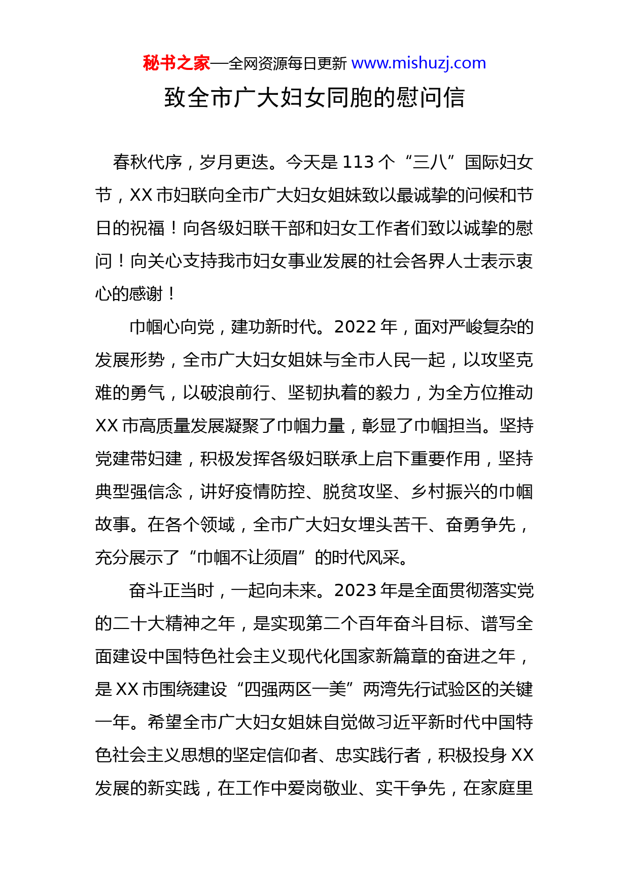 秘书之家—全网资源每日更新www.mishuzj.com致全市广大妇女同胞的慰问信春秋代序,岁月更迭。今天是113个“三八”国际妇女节,XX市妇联向全市广大妇女姐妹致以最诚挚的问候和节日的祝福!向各级妇联干部和妇女工作者们致以诚挚的慰问!向关心支持我市妇女事业发展的社会各界人士表示衷心的感谢!巾帼心向党,建功新时代。2022年,面对严峻复杂的发展形势,全市广大妇女姐妹与全市人民一起,以攻坚克难的勇气,以破浪前行、坚韧执着的毅力,为全方位推动XX市高质量发展凝聚了巾帼力量,彰显了巾帼担当。坚持党建带妇建,积极发挥各级妇联承上启下重要作用,坚持典型强信念,讲好疫情防控、脱贫攻坚、乡村振兴的巾帼故事。在各个领域,全市广大妇女埋头苦干、奋勇争先,充分展示了“巾帼不让须眉”的时代风采。奋斗正当时,一起向未来。2023年是全面贯彻落实党的二十大精神之年,是实现第二个百年奋斗目标、谱写全面建设中国特色社会主义现代化国家新篇章的奋进之年,是XX市围绕建设“四强两区一美”两湾先行试验区的关键一年。希望全市广大妇女姐妹自觉做习近平新时代中国特色社会主义思想的坚定信仰者、忠实践行者,积极投身XX发展的新实践,在工作中爱岗敬业、实干争先,在家庭里秘书之家—全网资源每日更新www.mishuzj.com崇德向善、涵养家风,在社会上倡扬文明、引领风尚,在与时代同行中实现人生价值、书写精彩篇章。人间最美三月天,巾帼携手绽芳华。让我们在引领文明新风中继续彰显巾帼之美,乘风破浪、一路向前!最后,祝愿全市广大妇女同胞们节日快乐、身体健康、工作顺利、阖家幸福!XX市妇女联合会XX年3月8日