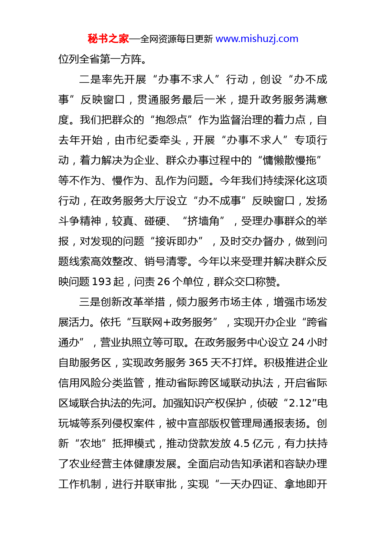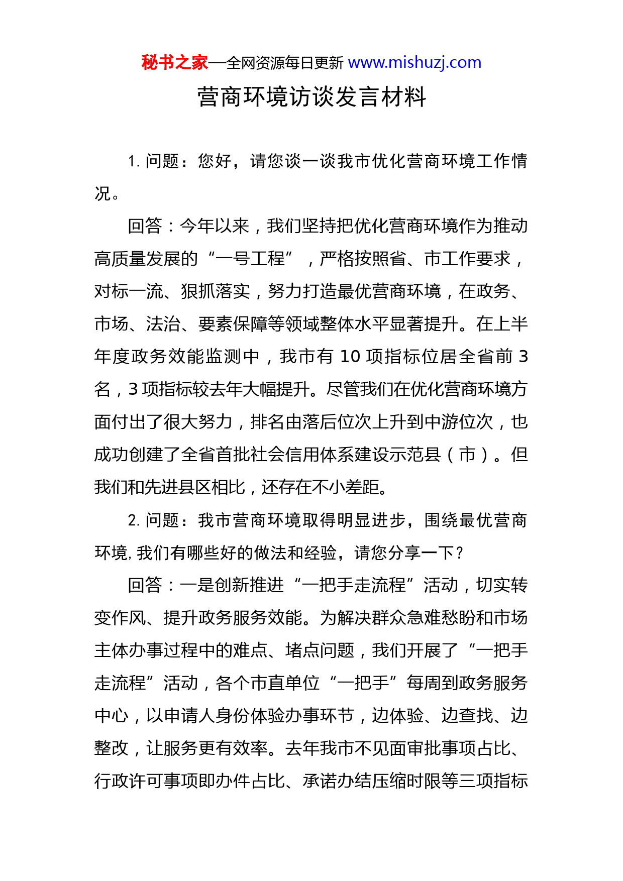 秘书之家—全网资源每日更新www.mishuzj.com营商环境访谈发言材料1.问题:您好,请您谈一谈我市优化营商环境工作情况。回答:今年以来,我们坚持把优化营商环境作为推动高质量发展的“一号工程”,严格按照省、市工作要求,对标一流、狠抓落实,努力打造最优营商环境,在政务、市场、法治、要素保障等领域整体水平显著提升。在上半年度政务效能监测中,我市有10项指标位居全省前3名,3项指标较去年大幅提升。尽管我们在优化营商环境方面付出了很大努力,排名由落后位次上升到中游位次,也成功创建了全省首批社会信用体系建设示范县(市)。但我们和先进县区相比,还存在不小差距。2.问题:我市营商环境取得明显进步,围绕最优营商环境,我们有哪些好的做法和经验,请您分享一下?回答:一是创新推进“一把手走流程”活动,切实转变作风、提升政务服务效能。为解决群众急难愁盼和市场主体办事过程中的难点、堵点问题,我们开展了“一把手走流程”活动,各个市直单位“一把手”每周到政务服务中心,以申请人身份体验办事环节,边体验、边查找、边整改,让服务更有效率。去年我市不见面审批事项占比、行政许可事项即办件占比、承诺办结压缩时限等三项指标秘书之家—全网资源每日更新www.mishuzj.com位列全省第一方阵。二是率先开展“办事不求人”行动,创设“办不成事”反映窗口,贯通服务最后一米,提升政务服务满意度。我们把群众的“抱怨点”作为监督治理的着力点,自去年开始,由市纪委牵头,开展“办事不求人”专项行动,着力解决为企业、群众办事过程中的“慵懒散慢拖”等不作为、慢作为、乱作为问题。今年我们持续深化这项行动,在政务服务大厅设立“办不成事”反映窗口,发扬斗争精神,较真、碰硬、“挤墙角”,受理办事群众的举报,对发现的问题“接诉即办”,及时交办督办,做到问题线索高效整改、销号清零。今年以来受理并解决群众反映问题193起,问责26个单位,群众交口称赞。三是创新改革举措,倾力服务市场主体,增强市场发展活力。依托“互联网+政务服务”,实现开办企业“跨省通办”,营业执照立等可取。在政务服务中心设立24小时自助服务区,实现政务服务365天不打烊。积极推进企业信用风险分类监管,推动省际跨区域联动执法,开启省际区域联合执法的先河。加强知识产权保护,侦破“2.12”电玩城等系列侵权案件,被中宣部版权管理局通报表扬。创新“农地”抵押模式,推动贷款发放4.5亿元,有力扶持了农业经营主体健康发展。全面启动告知承诺和容缺办理工作机制,进行并联审批,实现“一天办四证、拿地即开秘书之家—全网资源每日更新www.mishuzj.com工”。四是实行一线工作法,大员上前、主动服务,为市场主体纾困解难。深入开展“万人助万企”活动,建立市长每周二现场办公、分管市领导全天候服务制度,推动处级领导一线服务。去年累计召开市长现场办公会31次,联席办协调会39次,解决问题642个。比如大疆项目、BYD项目等重大项目,我们主动协调、积极服务,及时解决了厂房、用工、资金等问题,项目从洽谈到落地投产仅用了三个月时间。3.问题:接下来,我市优化营商环境工作有什么打算?回答:我们将继续贯彻落实省委省政府优化营商环境工作要求,以跃升到全省、全市第一方阵为目标,重点做好“三大提升”,争创省级优化营商环境创新示范县(市)。在服务效能上大提升。开展“极简办理行动”,对涉企服务事项全面梳理,推行1%工作法,抓好“一件事一次办”“有诉即办”“一窗通办”等重点事项,打造极简高效项目品牌。在满意度上大提升。强化“答卷”意识,把企业诉求放在第一位,畅通政企沟通渠道,有求必应。强化“换位”意识,当好“金牌店小二”,通过领导干部体验一线秘书之家—全网资源每日更新www.mishuzj.com办事流程,改进工作作风。强化“考评”意识,定期开展评议活动,把市场主体满意度作为检验工作成效的重要指标,树立结果导向,纠正工作偏差。在当先锋上大提升。对执行合同、市场开放度等劣势指标,坚持刀刃向内、刮骨疗毒、自我革命,尽快补齐营商环境指标短板。在优势指标上深化改革,挖掘典型,在全国、全省打造典型,形成我市经验。总之,我们将以“永远在路上”的姿态,奋力实现优化营商环境大突破,为全省经济社会高质量发展做出突出贡献!