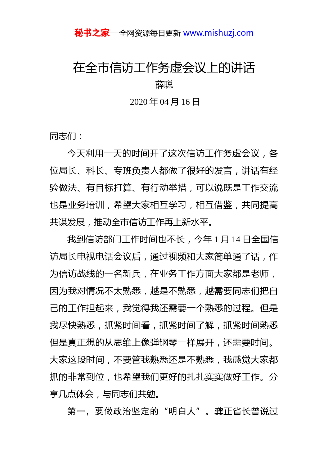 秘书之家—全网资源每日更新www.mishuzj.com在全市信访工作务虚会议上的讲话薛聪2020年04月16日同志们:今天利用一天的时间开了这次信访工作务虚会议,各位局长、科长、专班负责人都做了很好的发言,讲话有经验做法、有目标打算、有行动举措,可以说既是工作交流也是业务培训,希望大家相互学习,相互借鉴,共同提高共谋发展,推动全市信访工作再上新水平。我到信访部门工作时间也不长,今年1月14日全国信访局长电视电话会议后,通过视频和大家简单通了话,作为信访战线的一名新兵,在业务工作方面大家都是老师,因为我对情况不太熟悉,越是不熟悉,越需要同志们把自己的工作担起来,我觉得我还需要一个熟悉的过程。但是我尽快熟悉,抓紧时间看,抓紧时间了解,抓紧时间熟悉但是真正想的从思维上像弹钢琴一样展开,还需要时间。大家这段时间,不要管我熟悉还是不熟悉,我感觉大家都抓的非常到位,也希望我们更好的扎扎实实做好工作。分享几点体会,与同志们共勉。第一,要做政治坚定的“明白人”。龚正省长曾说过秘书之家—全网资源每日更新www.mishuzj.com“信访工作不是全局,但影响全局,信访工作不是中心,但反映中心。”从经济社会发展方面看,信访工作可以清晰地衡量一个地方、一个部门的工作标准和干部作风。我们都知道,信访部门不是产生信访问题的部门,也不是解决信访问题的主体,我们最重要的工作就是汇报好、沟通好、协调好、督导好。有些上访问题,本来不是你的事,但是你捂着、拖着、盖着,万一造成麻烦,你就有很大的责任,值不值?(要切实增强政治敏感性,像我调研中了解的微山退养还湖问题,就是个信访问题“火药桶”,如果不未雨绸缪,提前应对,极有可能出大问题)我认为,信访工作就是服务的工作,既要真心真诚地为老百姓服务也要用心细心的为党委政府服务。经常向党委、政府汇报工作,做好沟通协调,搞好服务保障。要聚焦经济社会发展中的热点难点问题和民生领域的新情况,加强综合分析研判、信访舆情监测和风险预警,当好参谋助手,推动群众反映问题及时妥善解决。对重大紧急问题,县市区在向当地党委政府汇报的同时,还要第一时间向市信访局预警共同做好工作,防范风险。同时,我们的局长和科长们绝不能高高在上,一定要给县市区和基层的同志们搞好服务,齐心协力干好工作。第二,要做熟悉业务的“内行人”。今年是“重点工作攻坚年”,市局着眼战术和打法的调整,大力实施信访秘书之家—全网资源每日更新www.mishuzj.com“12345”工程,建立专班作战体系,成立积案化解、“零上访”镇村创建、信息调研、创新创优四大专班,重点打好疫情防控服务保障、进京访降量退位、信访积案清仓见底“零上访”镇村创建、夯实信访基层基础、重大活动维稳创新创优六大攻坚战。这是今年市局信访工作的战术和打法,各县市区也要结合实际认真钻研,悉心研究,多问问群众期盼什么?信访工作难点堵点在哪里?我们应该怎么干?像今年的进京访治理工作,实行计分制度,加强了预警约谈,如何加大依法打击力度,如何更好的吸附群众,都要认真思考。像积案化解、“零上访”创建、“群众满意窗口”创建等都有具体的任务目标,大家必须要做到心中有数、手中有策、肩上有责,创造性地把工作完成好,确保各项指标保持全省前列。(工作要有艺术,怎么统筹,如何协调,怎么落实都有很大的学问,否则你工作打不到点子上,自己就把自己干死了。像今年的脱贫攻坚工作……全省垫底)第三,要做创新创优的“领路人”。从年前到现在,市委、市政府多次要求部门单位上报,可以走在全省全国前列的“亮点工作”“品牌工作”。前段时间通过到部分县市区调研,发现嘉祥的“平安周例会”、曲阜“和为贵”调解室等做法非常成熟,如果在原有的基础上进行深化、拓展和包装,完全可以领跑全省、打造品牌。(包括秘书之家—全网资源每日更新www.mishuzj.com整合网格员、村警、五老、乡贤、村民代表、法律顾问、红白理事会等力量,多元调处化解矛盾纠纷的思路)今年市里着力聚焦联动体系建设和“最多访一次”两项创新,力争全省现场会在济宁召开。各县市区要自觉把承担的工作放到全市、全省乃至全国的高度去审视、去谋划、去对比,着力补短板、拉长板、做样板。特别是在创新创优上要“八仙过海、各显神通”,围绕“上台阶、争先进、创品牌”,高点定位、加压奋进,力争在全省乃至全国信访系统叫响“济宁经验”。思路从创新中出,办法于创新中来,难题在创新中破,只要大家肯钻研、善动脑、勇创新就一定能够干出成绩、创出精彩。第四,要做信访干部的“娘家人”。我常说“进了信访门,就是一家人”,我们信访系统就是一个集体,一荣俱荣、一损俱损。既要有声有色的工作,还要有滋有味的生活。县市区包括局里的同志们有好的想法、好的思路都可以提出来,可以给分管领导提、也可以直接给我提,只要对工作有利、只要是有利于团结的就去落实。出了成绩局班子绝对不会与大家争功、争面子,有责任都是党组的成绩都是大家的。有什么困难和需求需要市局协调解决的及时提出来,市局定当全力以赴帮助协调推动。同时,各位局长也要关心、关爱我们的信访干部,给他们提供良好的环境和平台,特别对那些有作为、敢担当、敢碰硬的干秘