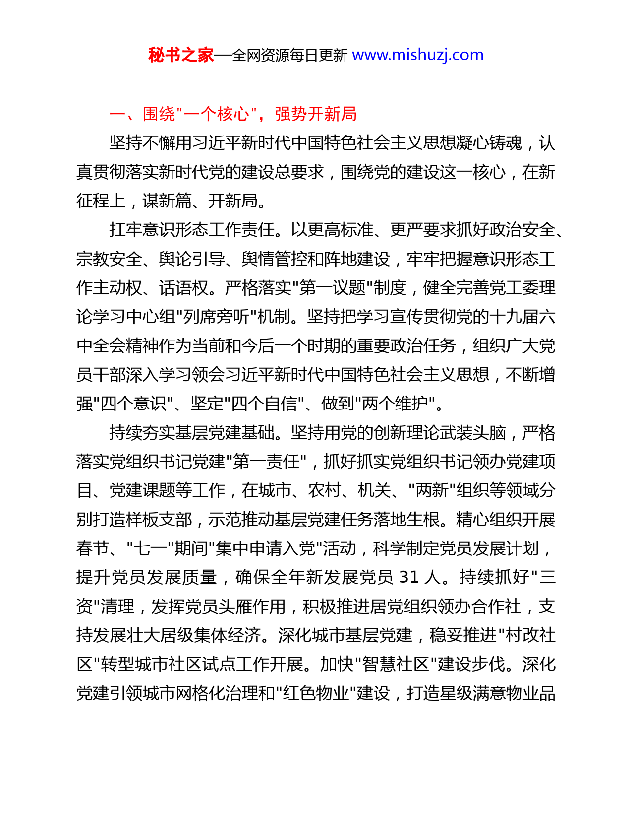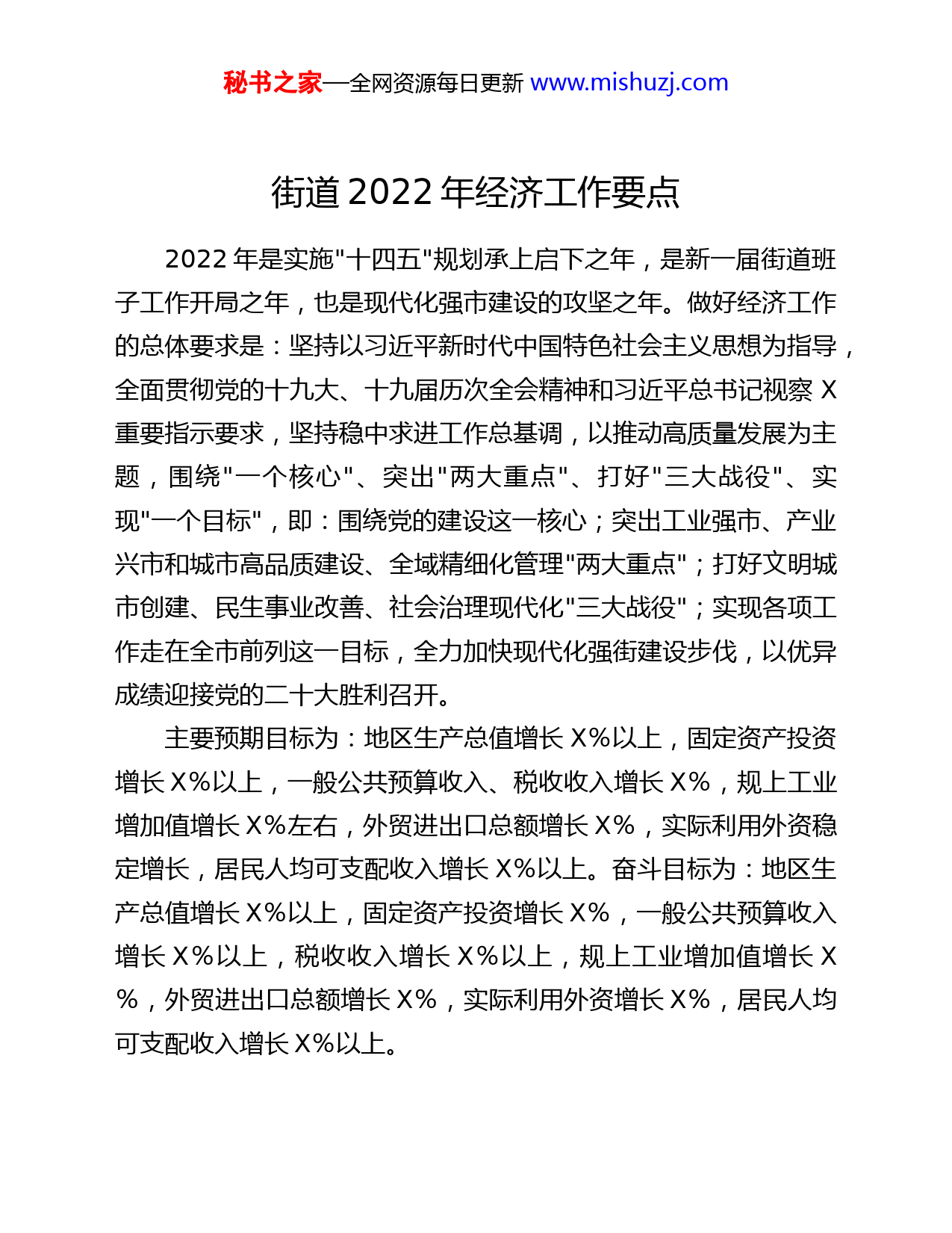 秘书之家—全网资源每日更新www.mishuzj.com街道2022年经济工作要点2022年是实施"十四五"规划承上启下之年,是新一届街道班子工作开局之年,也是现代化强市建设的攻坚之年。做好经济工作的总体要求是:坚持以习近平新时代中国特色社会主义思想为指导,全面贯彻党的十九大、十九届历次全会精神和习近平总书记视察X重要指示要求,坚持稳中求进工作总基调,以推动高质量发展为主题,围绕"一个核心"、突出"两大重点"、打好"三大战役"、实现"一个目标",即:围绕党的建设这一核心;突出工业强市、产业兴市和城市高品质建设、全域精细化管理"两大重点";打好文明城市创建、民生事业改善、社会治理现代化"三大战役";实现各项工作走在全市前列这一目标,全力加快现代化强街建设步伐,以优异成绩迎接党的二十大胜利召开。主要预期目标为:地区生产总值增长X%以上,固定资产投资增长X%以上,一般公共预算收入、税收收入增长X%,规上工业增加值增长X%左右,外贸进出口总额增长X%,实际利用外资稳定增长,居民人均可支配收入增长X%以上。奋斗目标为:地区生产总值增长X%以上,固定资产投资增长X%,一般公共预算收入增长X%以上,税收收入增长X%以上,规上工业增加值增长X%,外贸进出口总额增长X%,实际利用外资增长X%,居民人均可支配收入增长X%以上。秘书之家—全网资源每日更新www.mishuzj.com一、围绕"一个核心",强势开新局坚持不懈用习近平新时代中国特色社会主义思想凝心铸魂,认真贯彻落实新时代党的建设总要求,围绕党的建设这一核心,在新征程上,谋新篇、开新局。扛牢意识形态工作责任。以更高标准、更严要求抓好政治安全、宗教安全、舆论引导、舆情管控和阵地建设,牢牢把握意识形态工作主动权、话语权。严格落实"第一议题"制度,健全完善党工委理论学习中心组"列席旁听"机制。坚持把学习宣传贯彻党的十九届六中全会精神作为当前和今后一个时期的重要政治任务,组织广大党员干部深入学习领会习近平新时代中国特色社会主义思想,不断增强"四个意识"、坚定"四个自信"、做到"两个维护"。持续夯实基层党建基础。坚持用党的创新理论武装头脑,严格落实党组织书记党建"第一责任",抓好抓实党组织书记领办党建项目、党建课题等工作,在城市、农村、机关、"两新"组织等领域分别打造样板支部,示范推动基层党建任务落地生根。精心组织开展春节、"七一"期间"集中申请入党"活动,科学制定党员发展计划,提升党员发展质量,确保全年新发展党员31人。持续抓好"三资"清理,发挥党员头雁作用,积极推进居党组织领办合作社,支持发展壮大居级集体经济。深化城市基层党建,稳妥推进"村改社区"转型城市社区试点工作开展。加快"智慧社区"建设步伐。深化党建引领城市网格化治理和"红色物业"建设,打造星级满意物业品秘书之家—全网资源每日更新www.mishuzj.com牌,分类推进老旧小区物业服务全覆盖,新建红色驿站55处,进一步提升党群服务能力。加快振兴路两侧党建服务设施建设,擦亮党建服务品牌;完善提升鲁南智能制造产业园党组织功能,创新打造学习贯彻习近平新时代中国特色社会主义思想现场教学点,积极推动真爱商城、枣矿智慧物流产业园等商圈、物流业"两新领域"党建破题落地,努力实现党建工作效能最大化和党的建设、党的事业相互促进。不断加强干部队伍建设。立足新班子、新气象、新作为,充分利用集中学习、名师送教、干部上党课、灯塔干部教育学院等手段,组织开展干部培训,强化干部队伍作风建设,推动党员干部行为规范和作风养成,不断提高干部贯彻落实新发展理念的能力。健全完善"一肩挑"条件下的社区、居"两委"运行机制,实施"头雁"培育计划,各社区、居党组织年内至少承诺办成3件惠民实事,抓好村"两委"成员特别是村书记党校集中轮训,不断提升履职能力。常态化开展农村在外人才"回引"活动,加大从致富能手、返乡大学生和在外务工经商能人等群体中培养后备人才力度。强化对社区、居干部管理考核,实行社区、居干部动态调整,不断优化强化社区、居干部队伍建设,进一步激发社区、居级干事创业积极性。二、突出"两大重点",激发新活力(一)把工业强市、产业兴市作为工作的重心紧紧围绕全市"633"现代产业体系,全力培育壮大高端装备、秘书之家—全网资源每日更新www.mishuzj.com新一代信息技术、新型商贸物流和现代服务业等优势主导产业,加快产业向高端迈进,形成集聚效应,全力打造经济强街。巩固提升优势主导产业。①高端装备。以X中小数控机床特色产业集群为依托,巩固发展数控机床、金属制品、专用装备、矿山机械、精密铸造五类产品,发挥威达、普鲁特、腾达等行业链主优势,重点抓好墨子科创园、腾龙不锈钢产业园、鲁南智能制造产业园三大高端装备产业园建设,力争年内主营业务收入实现58亿元。②新一代信息技术。以鲁南智能制造产业园、枣矿智慧物流产业园等基地为依托,培育发展直播电商等数字产业,突出抓好翰林经纬二期扩建等项目建设,力争年内主营业务收入实现3亿元。③新型商贸物流。注重发挥"实体平台+互联网"优势,做大鲁华农副城、真爱商城两个百亿级专业化市场集群,打造全国知名的商贸物流集散地。④现代服务业。在相对成熟的商贸物流商圈基础上,进一步整合各类资源要素,打造在